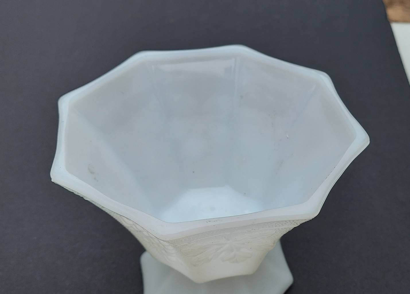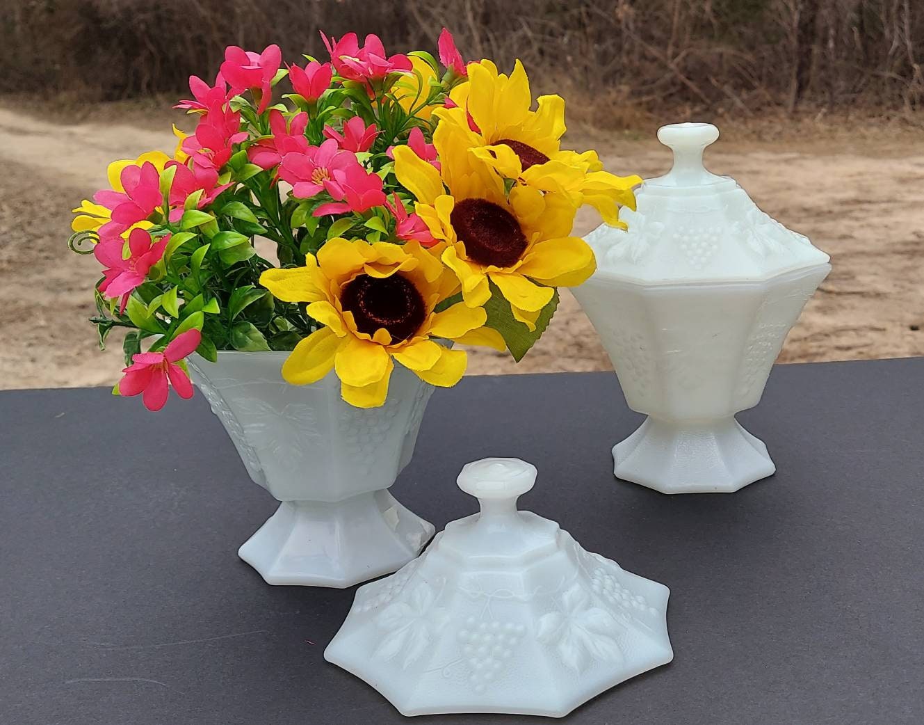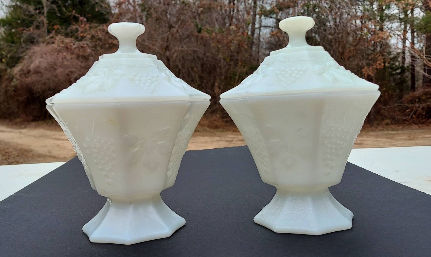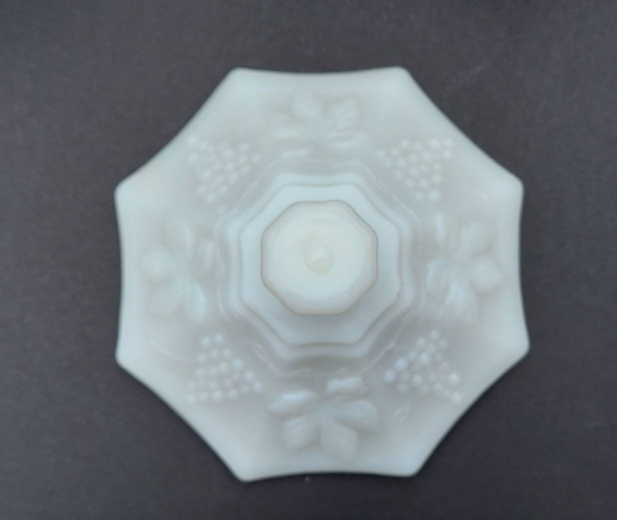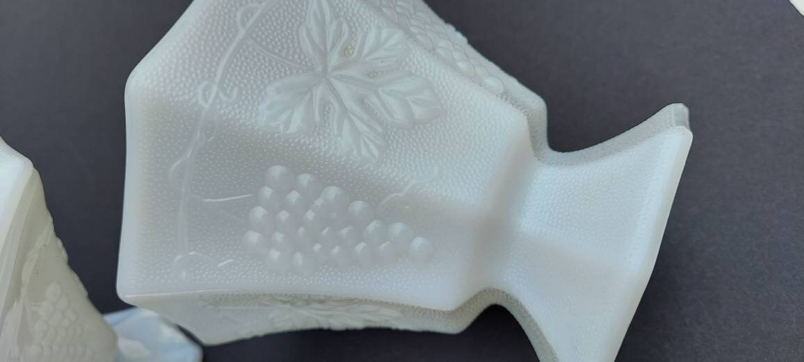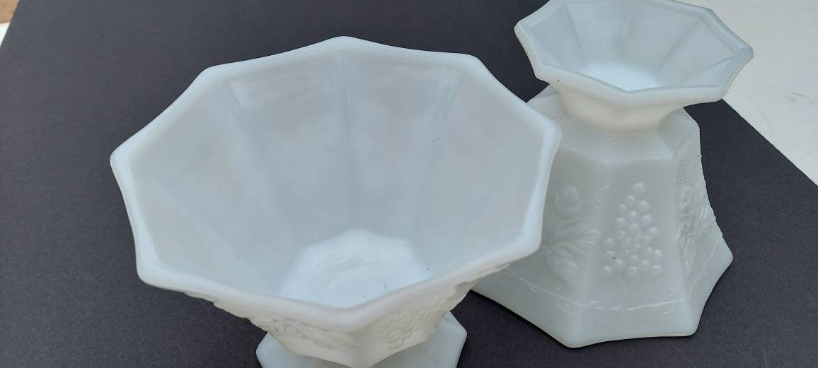 As I was searching for items for vintage- themed wedding decor, I found this lovely pair of milkglass dishes featuring pebbled glass and grapevine motif. Mission accomplished! I just love the way the translucent glass coordinates instantly with any colors around it.