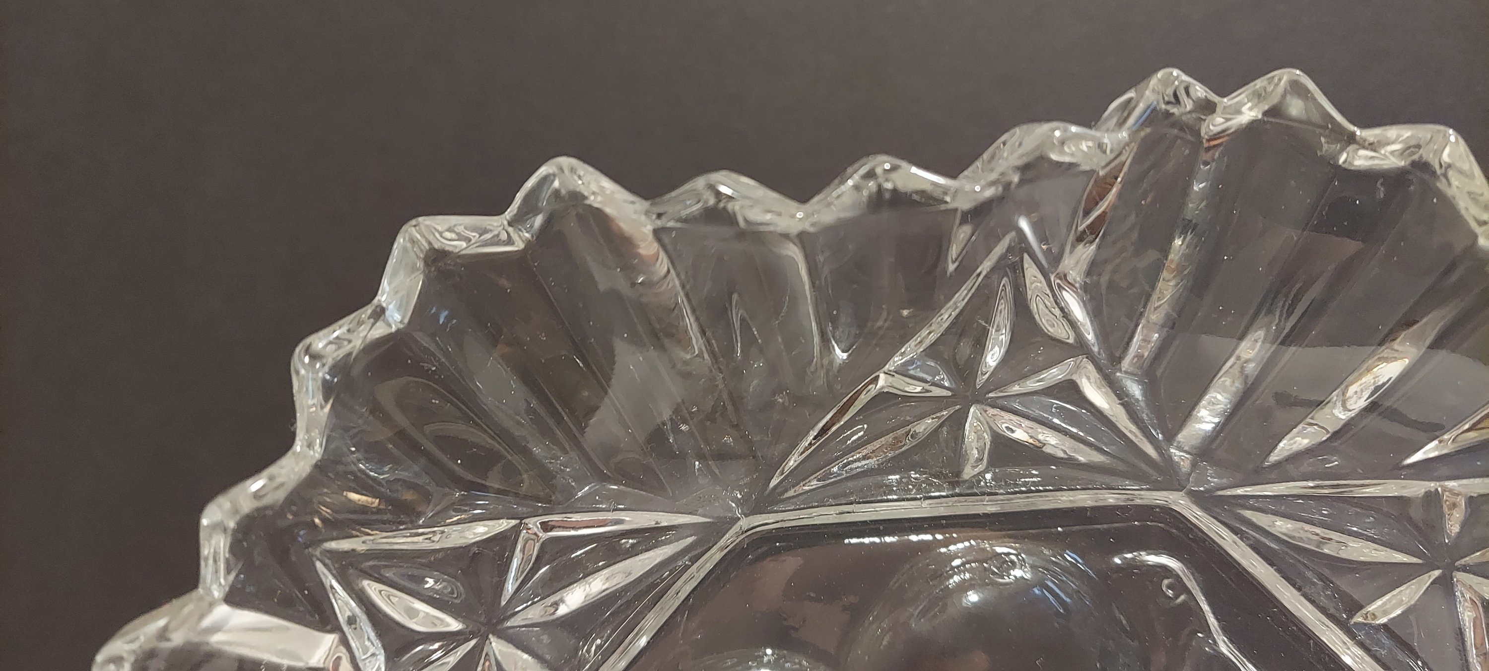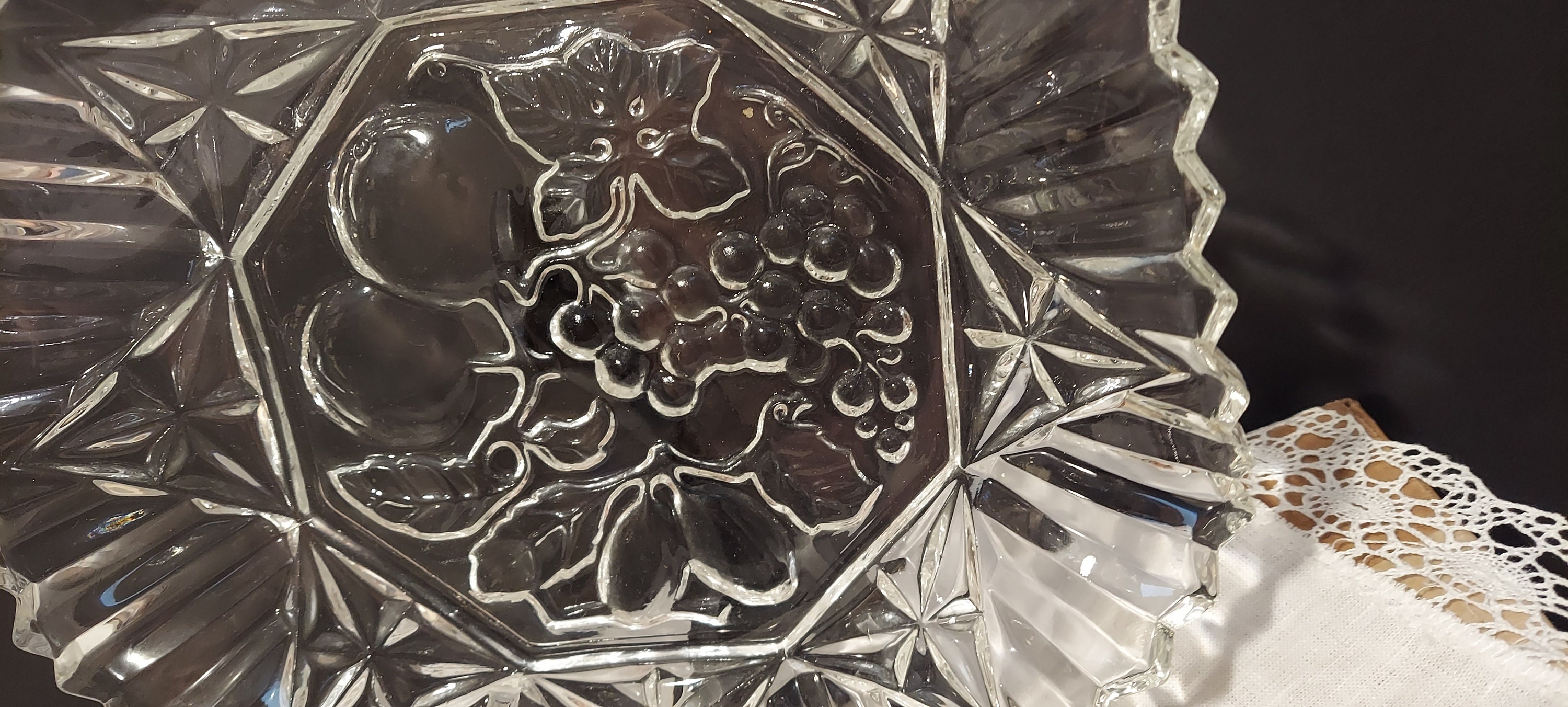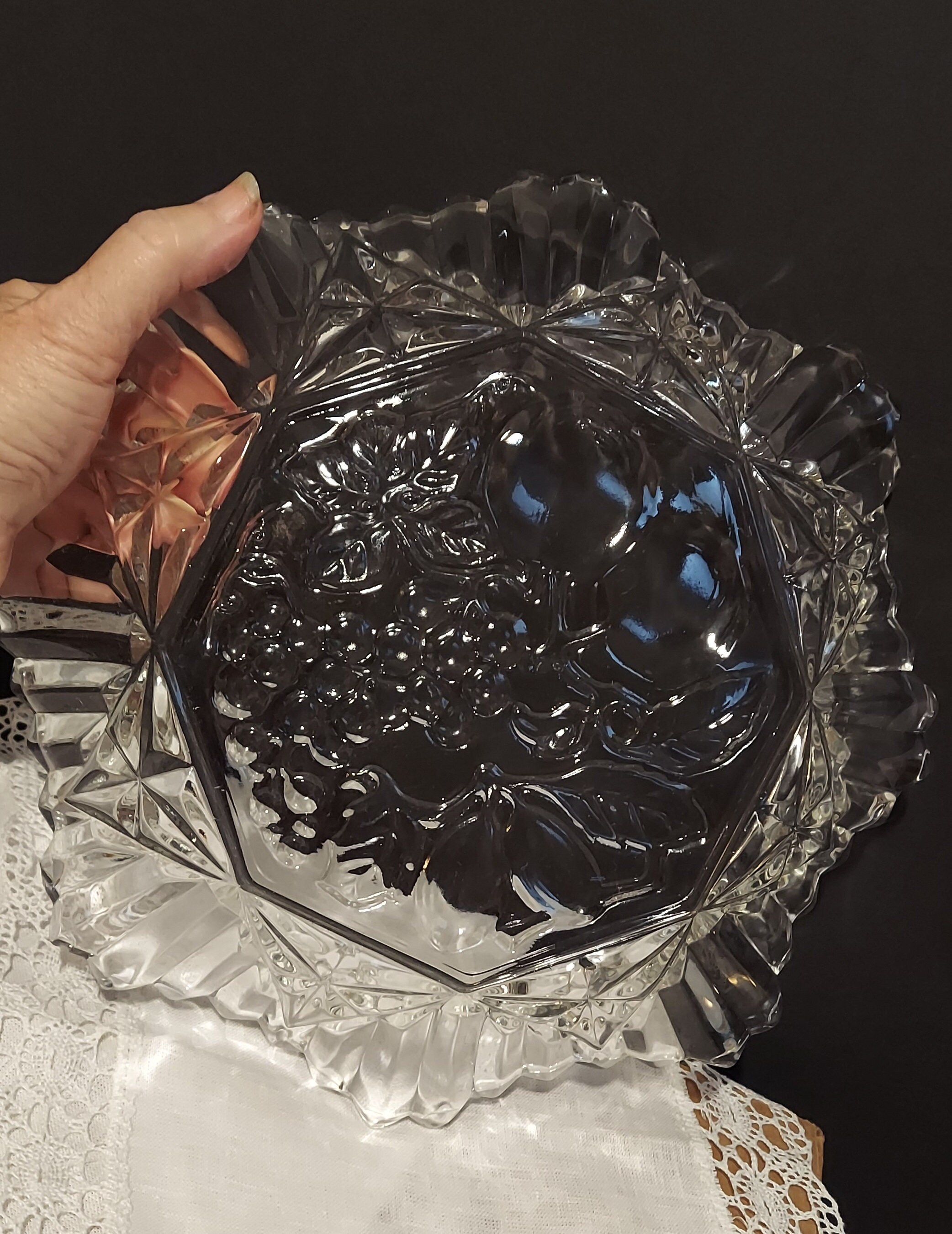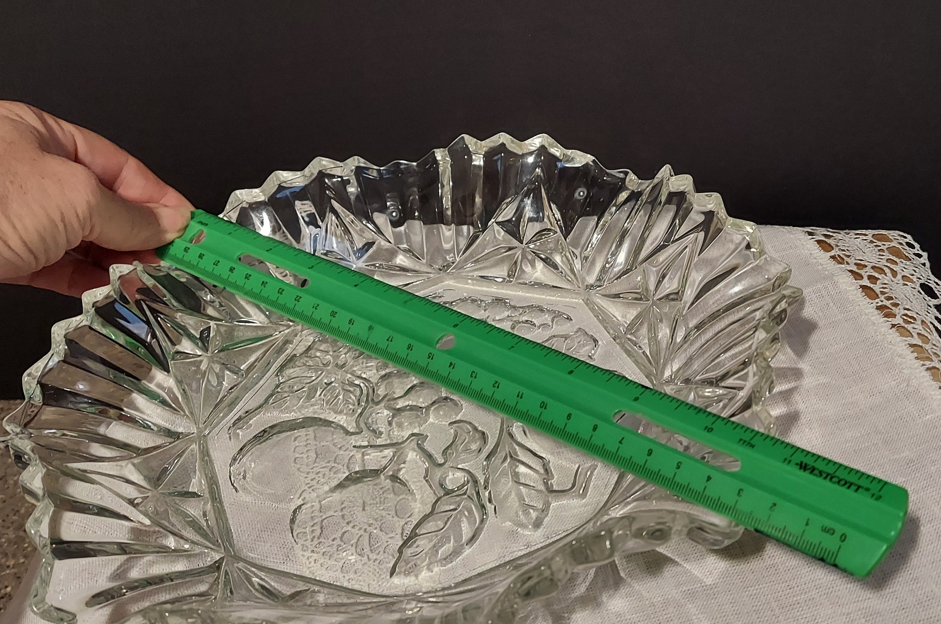 This is a collectible vintage glass bowl by the Federal Glass Company that features a lovely fluted edge and fruit shapes molded into the bottom of the bowl. These can be found in a variety of colors, including clear like this one. It measures 10-1/2 inches in diameter.
