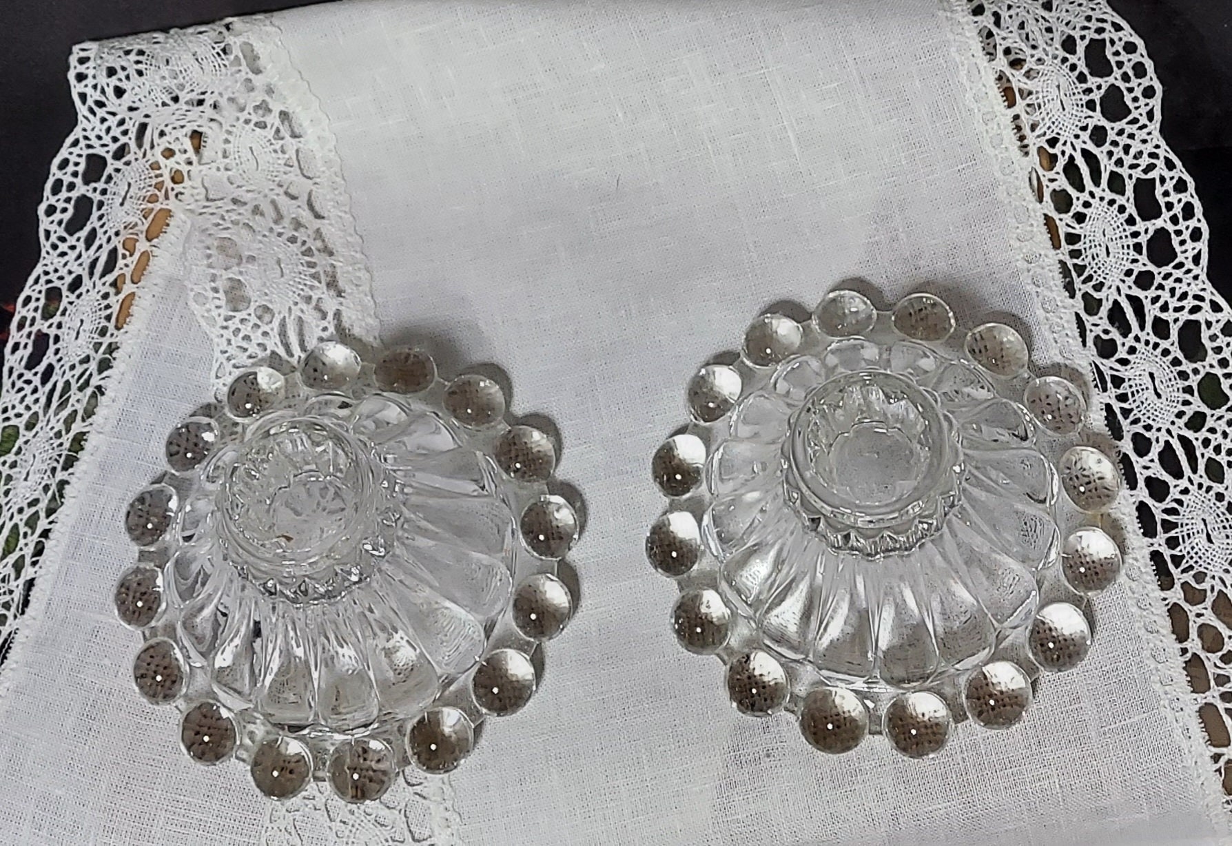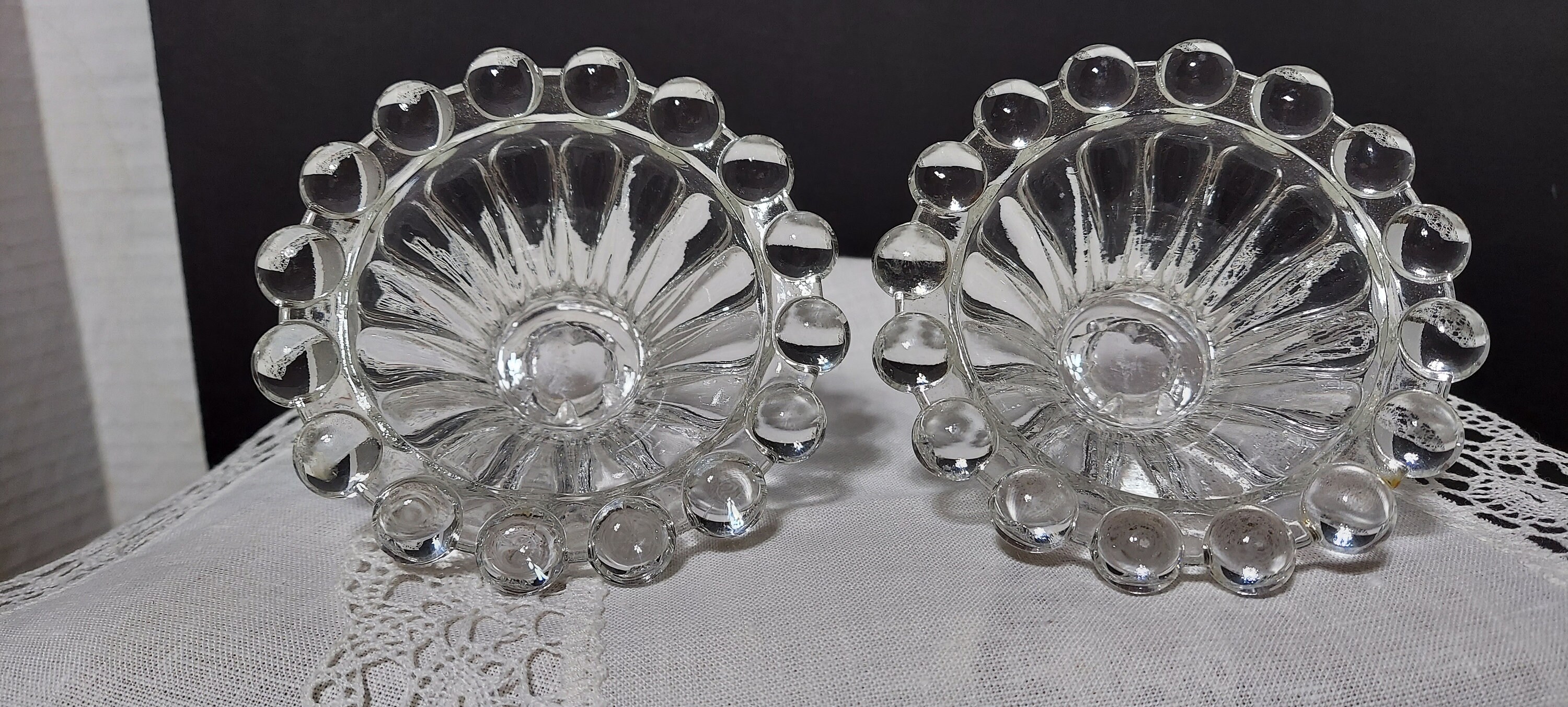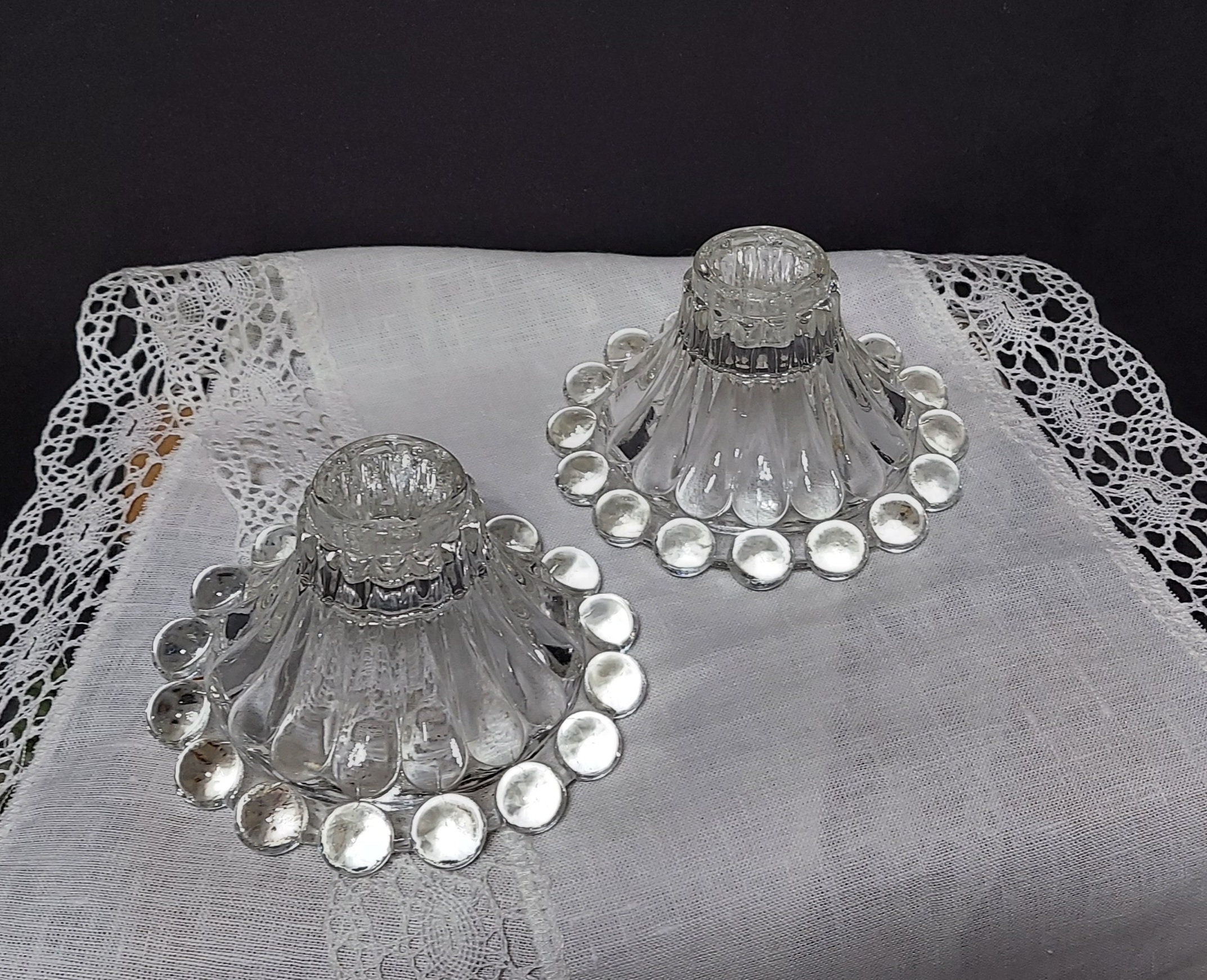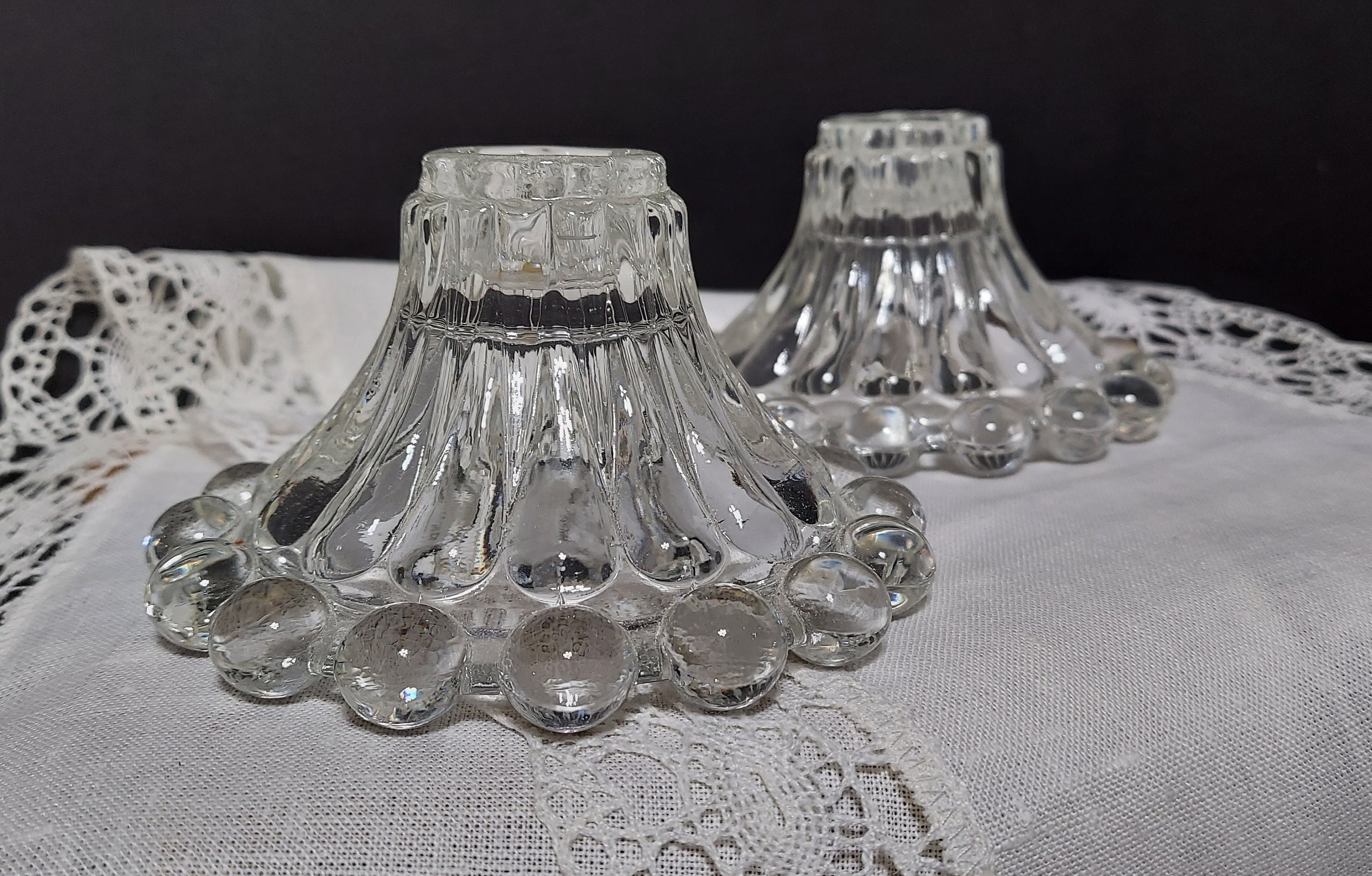 Goes-with-anything clear glass candleholders in the Boopie pattern by Anchor Hocking. Clear glass - like any neutral - is so versatile! Pick your candle color and you have an instantly coordinated start to your tablescape. And the huge glass beads really catch light. They seem to glow!