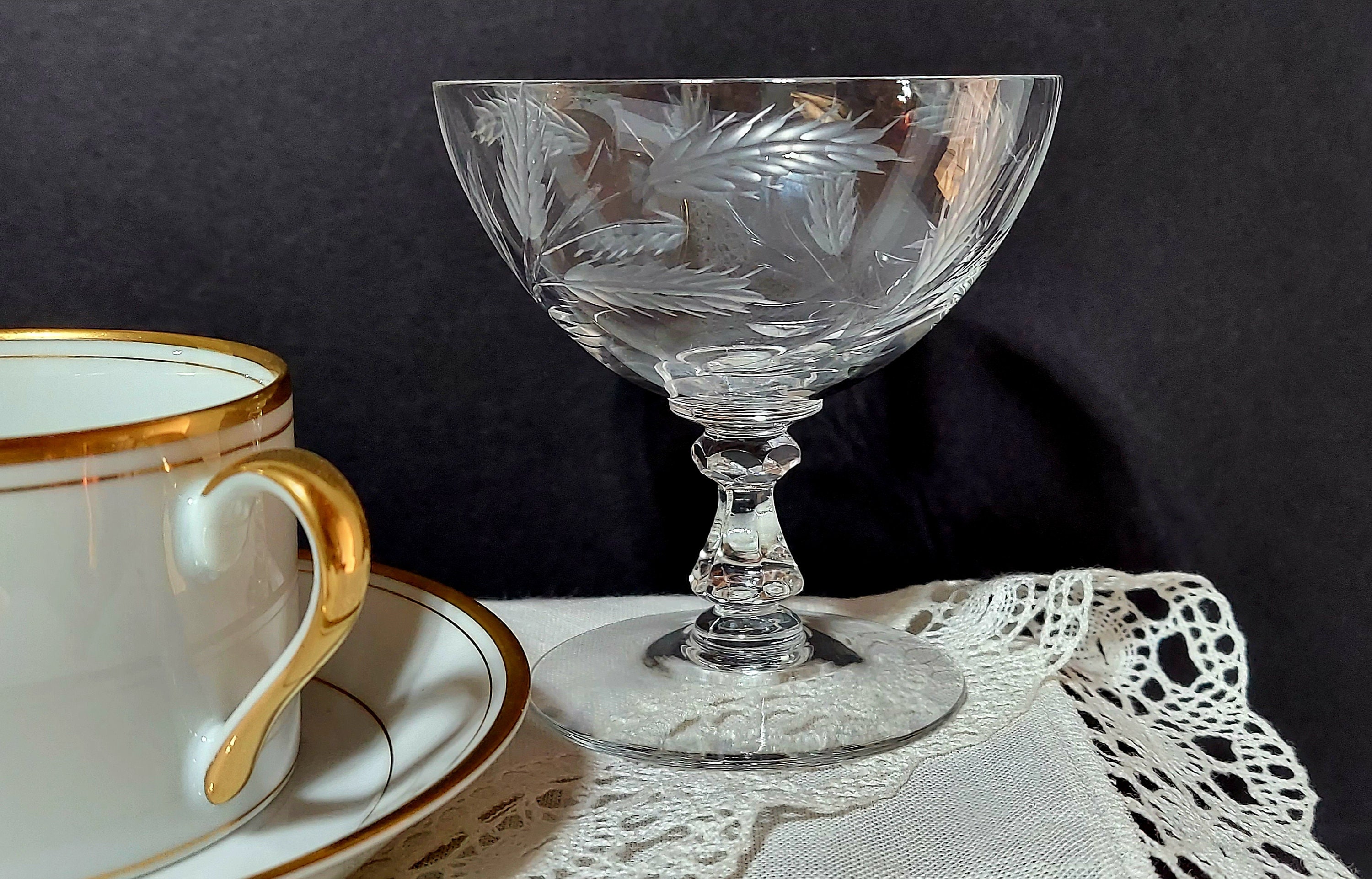 1950s classic cut crystal by Cambridge Glass Company. Pattern was active between 1945 and 1958 (thank you, Replacements, Ltd.). The gray-cut design is wheat stalks that flow around the bowl. They are 4 inches tall. Shown next to the water goblet in the same pattern for scale. Excellent condition. Please feel free to message me if you have any questions.