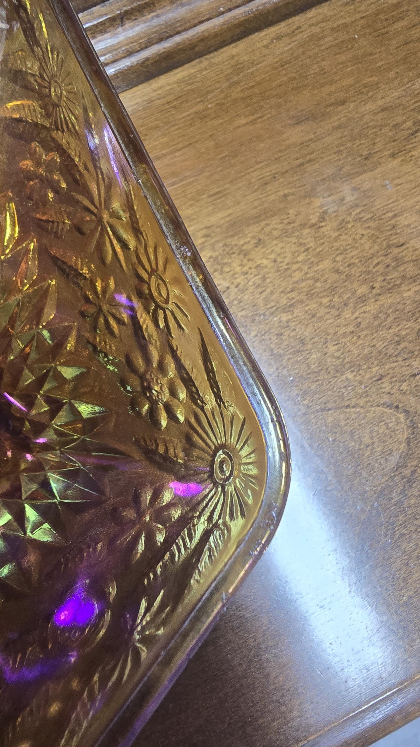 Here are four warm, honey- colored carnival glass bowls from Indiana Glass. They're in a pattern called "Pineapple;" the color, "Marigold." These bowls are a must for your grandmacore maximalist decor. They're in excellent condition, without cracks or scratches. All of the iridescent finish is completely intact. One of the bowls shows flea bites on the rim (See photo). They're diamond shaped, and measure six inches long by three inches tall. Please feel free to message me if you have any questions. Thanks for visiting Redux Vintage Boutique.