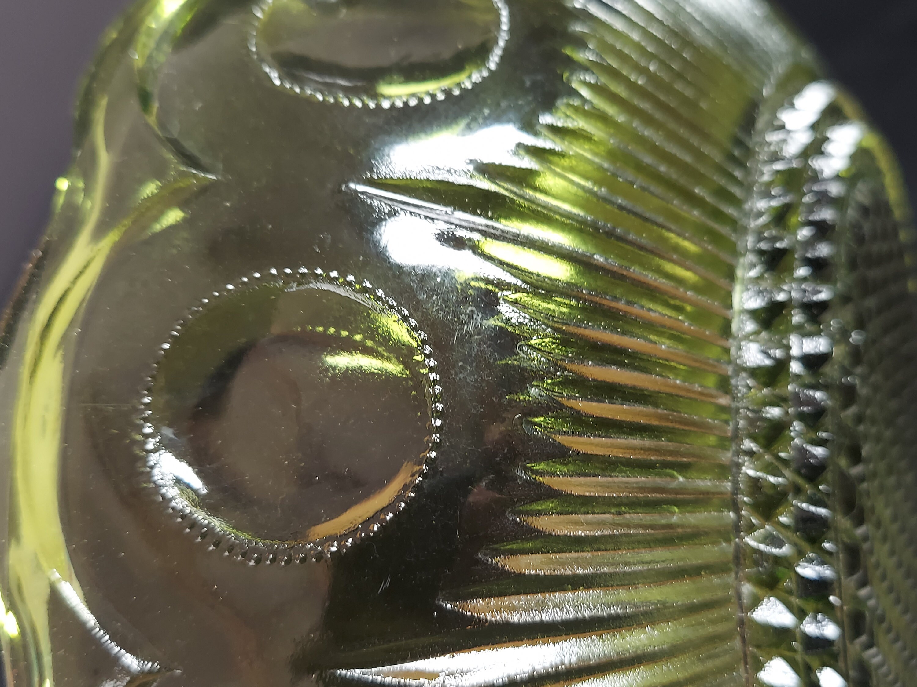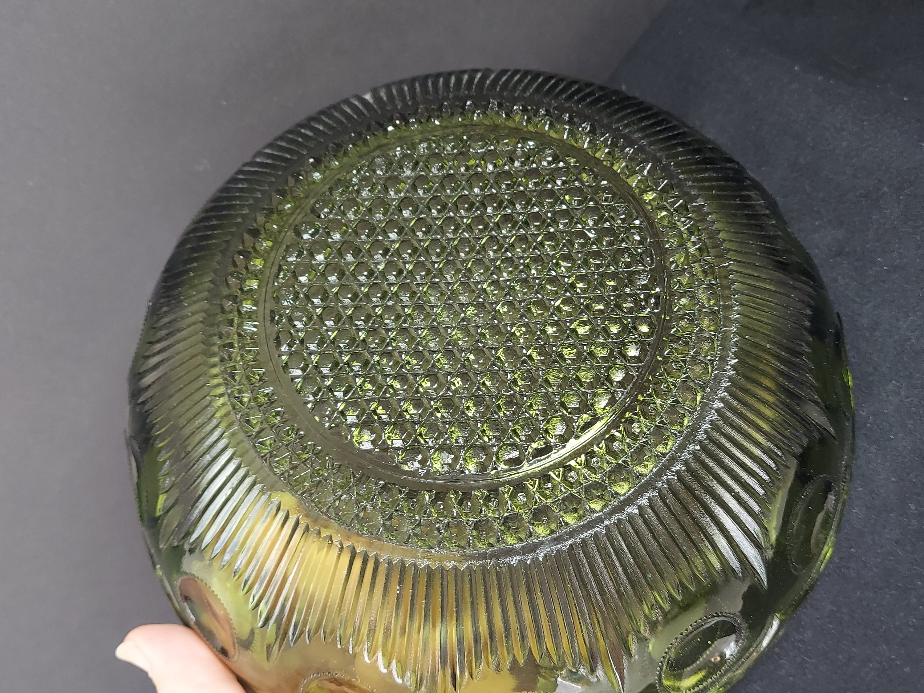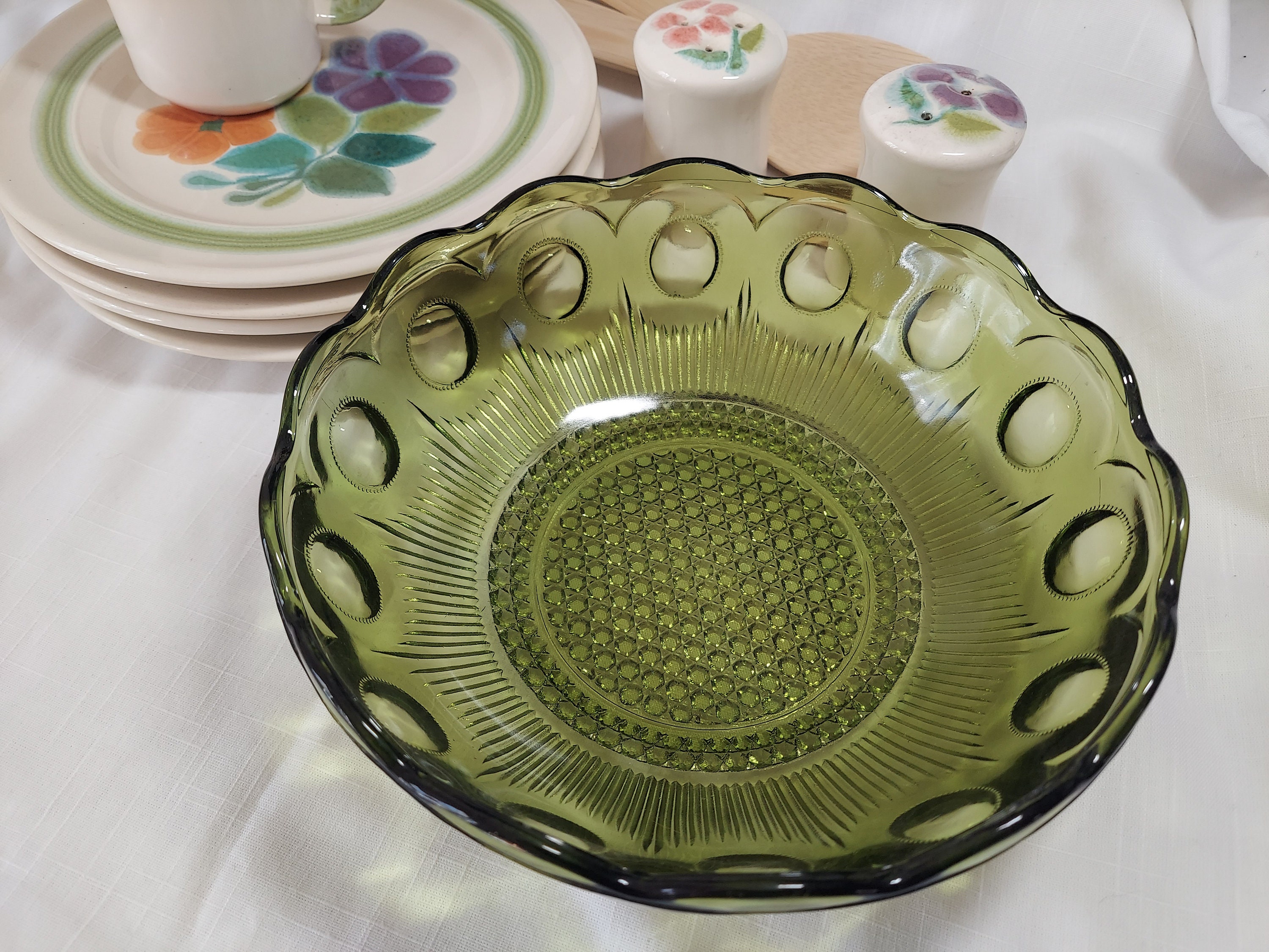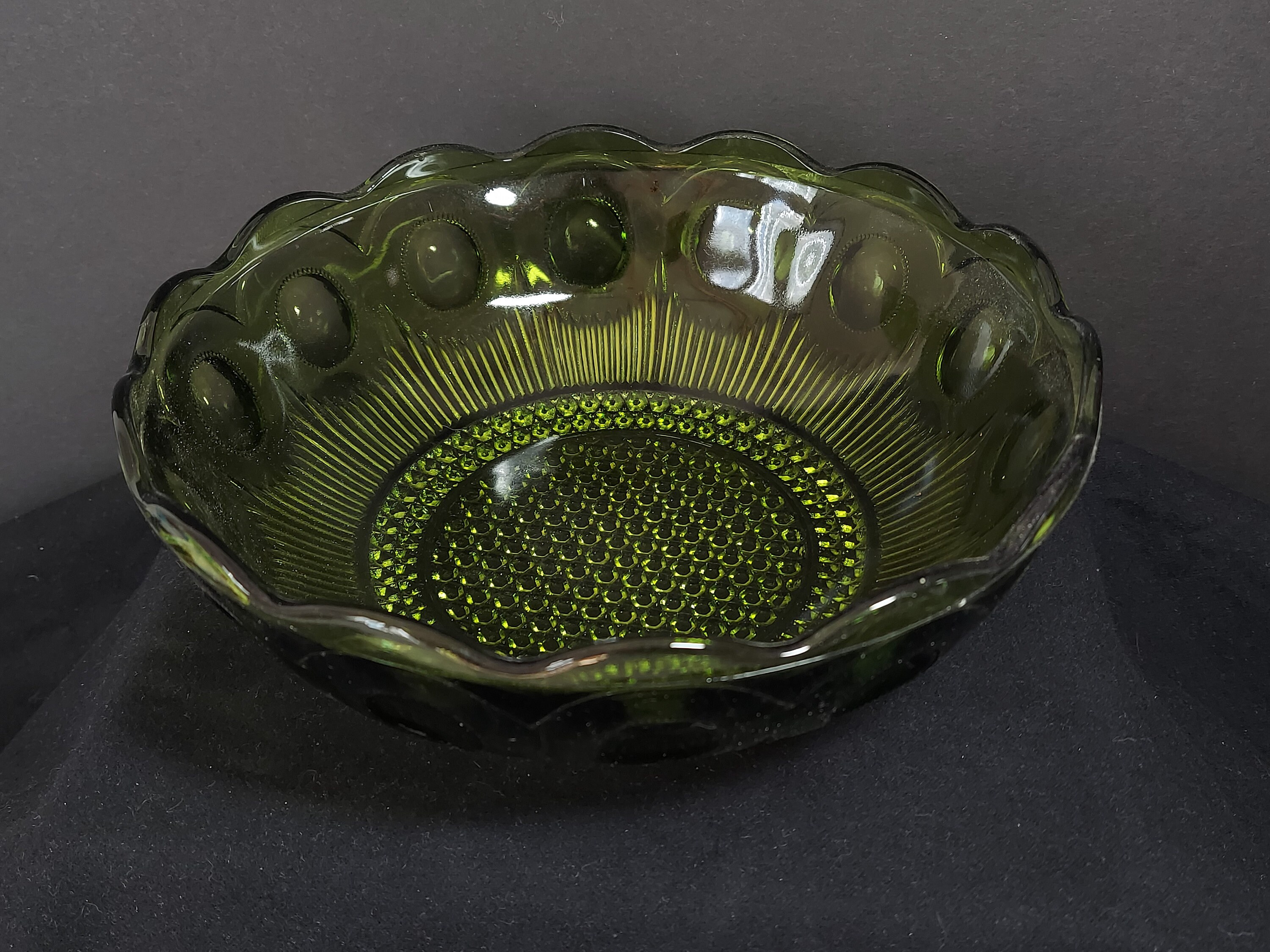 Here is a cool, retro avocado green Indiana Glass Co. bowl in excellent vintage condition. Great for serving salads or game-night snacks. (Pretzels, anyone?) Completely free of chips, cracks or haze.