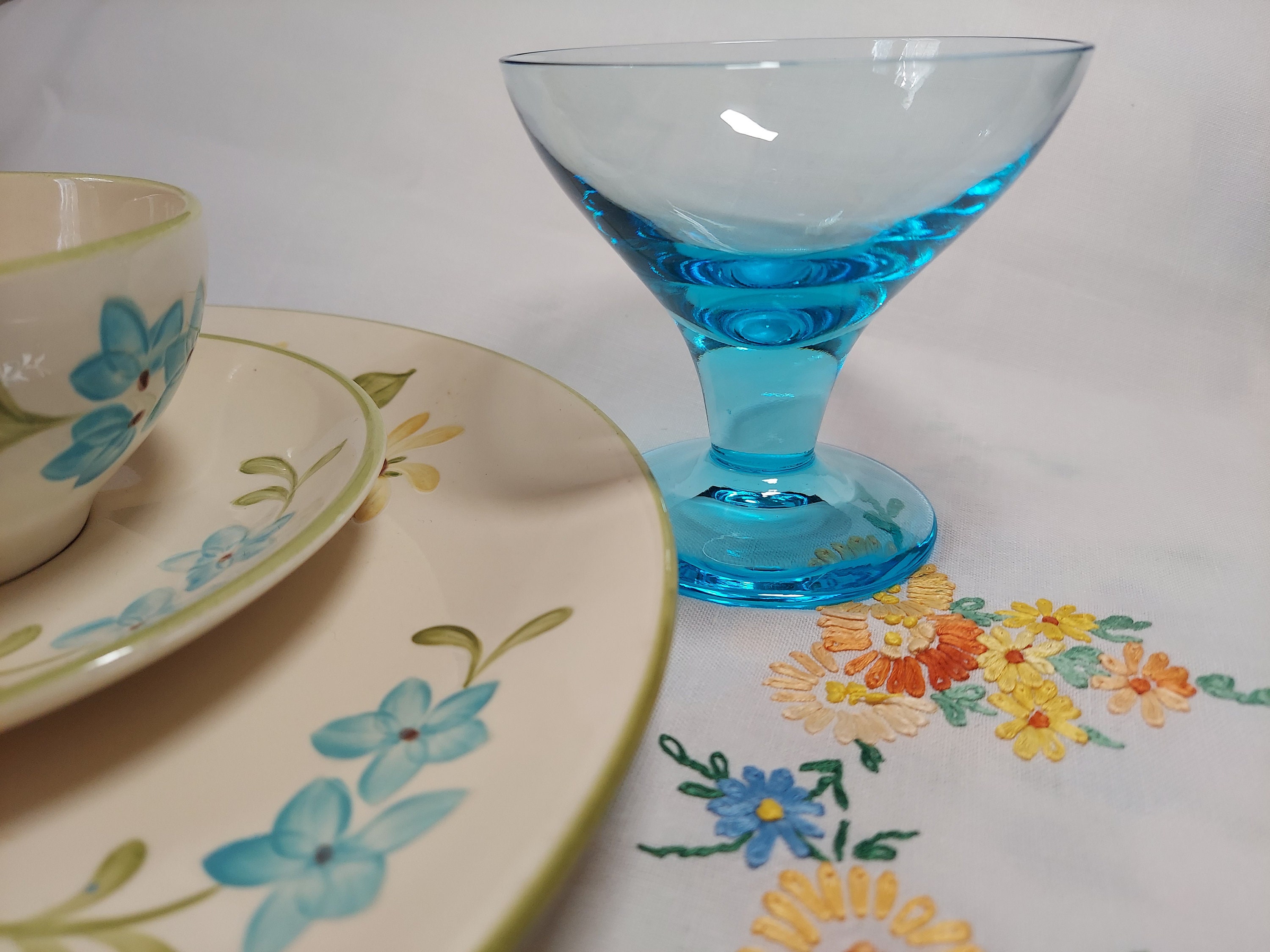 What can be said about this gorgeous blue!?! Here are eight, blown glass goblets perfect for wine, margaritas, or whatever you choose. Pictured here with Franciscan's "Daisy" stoneware, c.1970s.