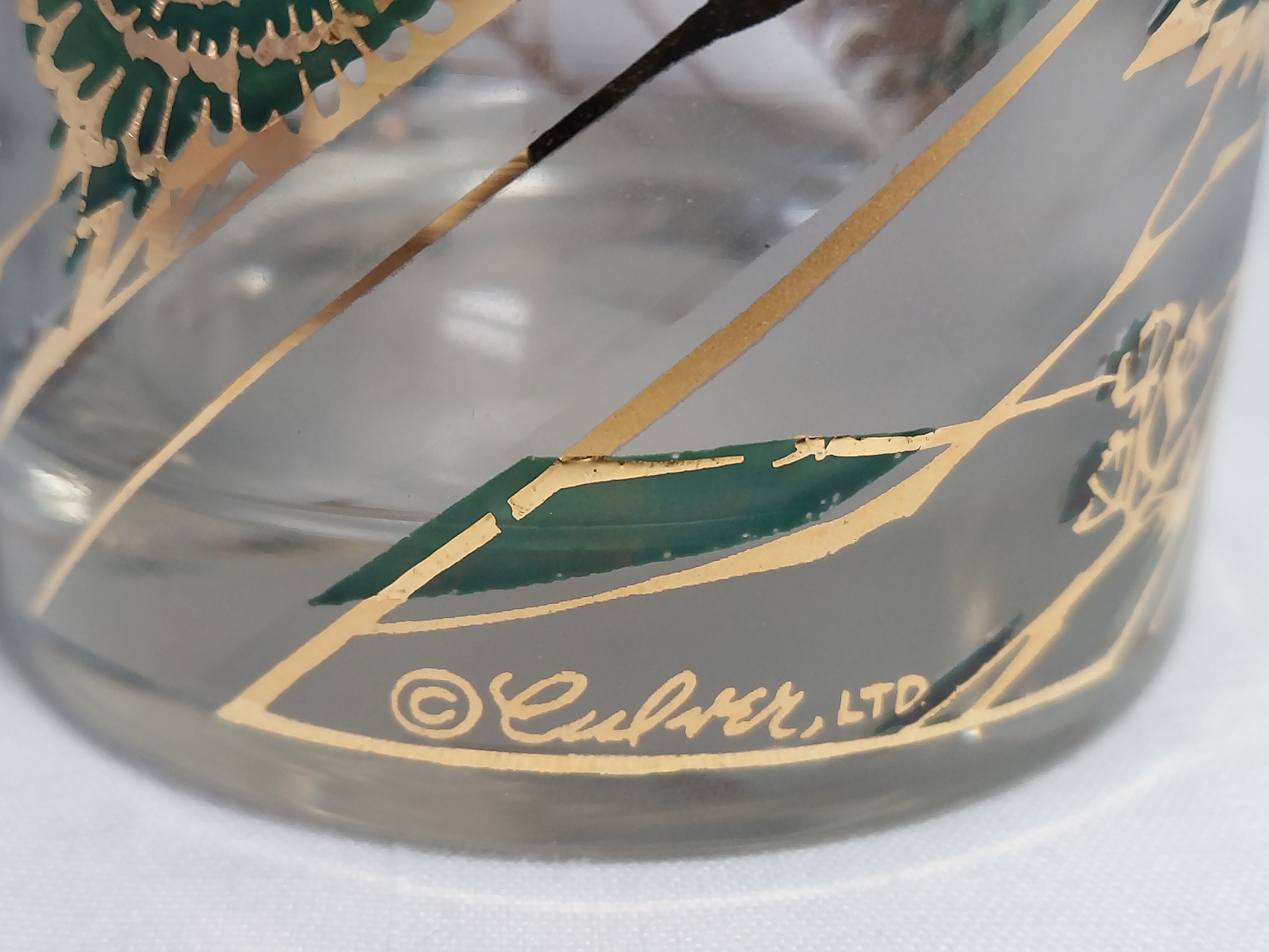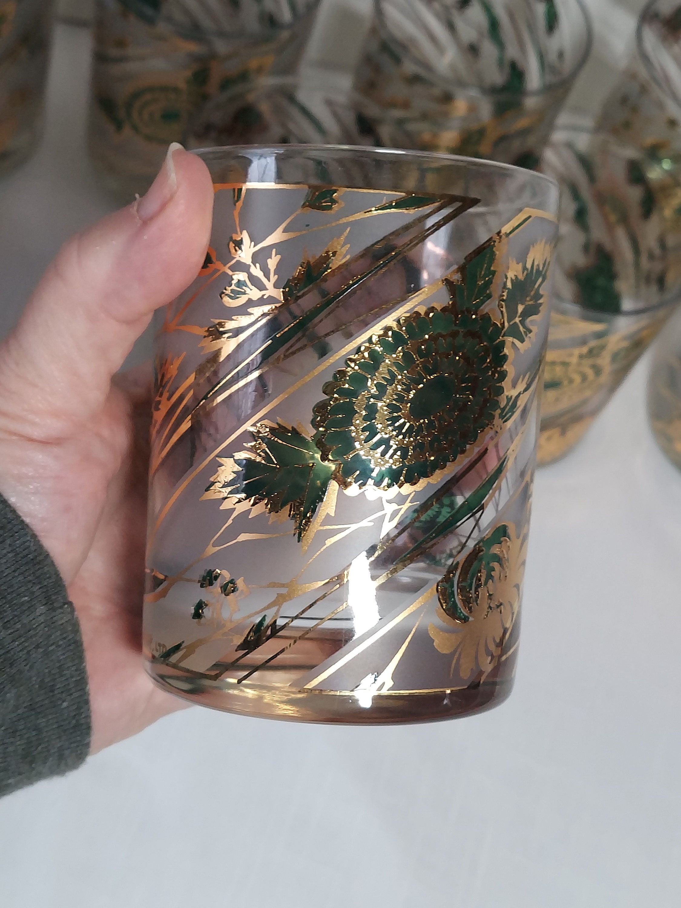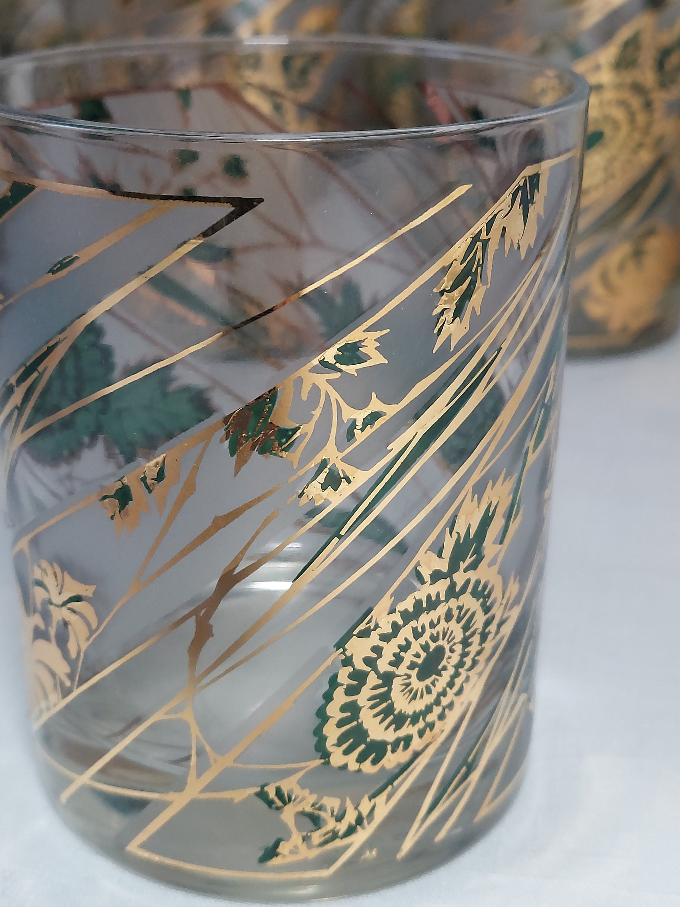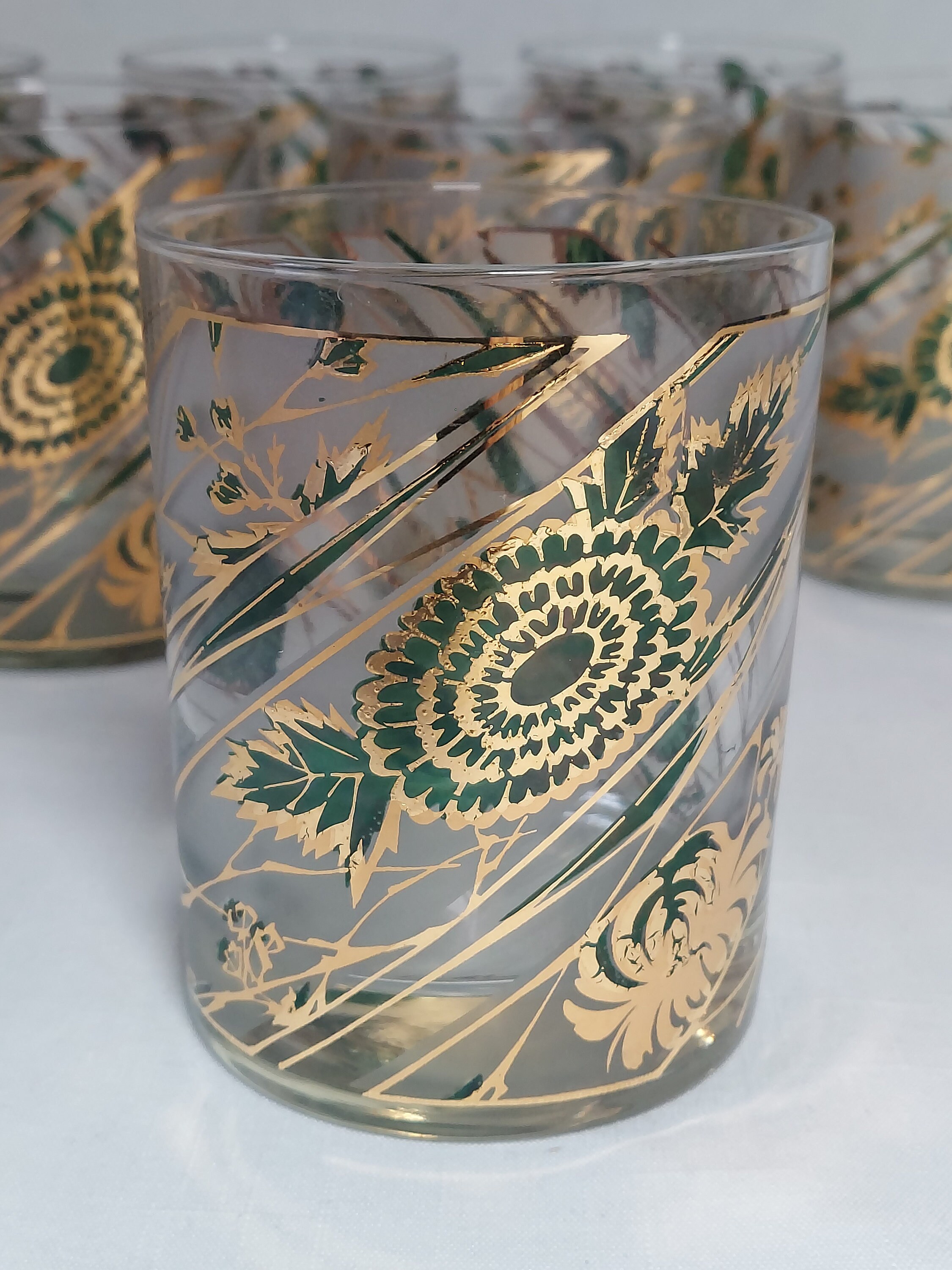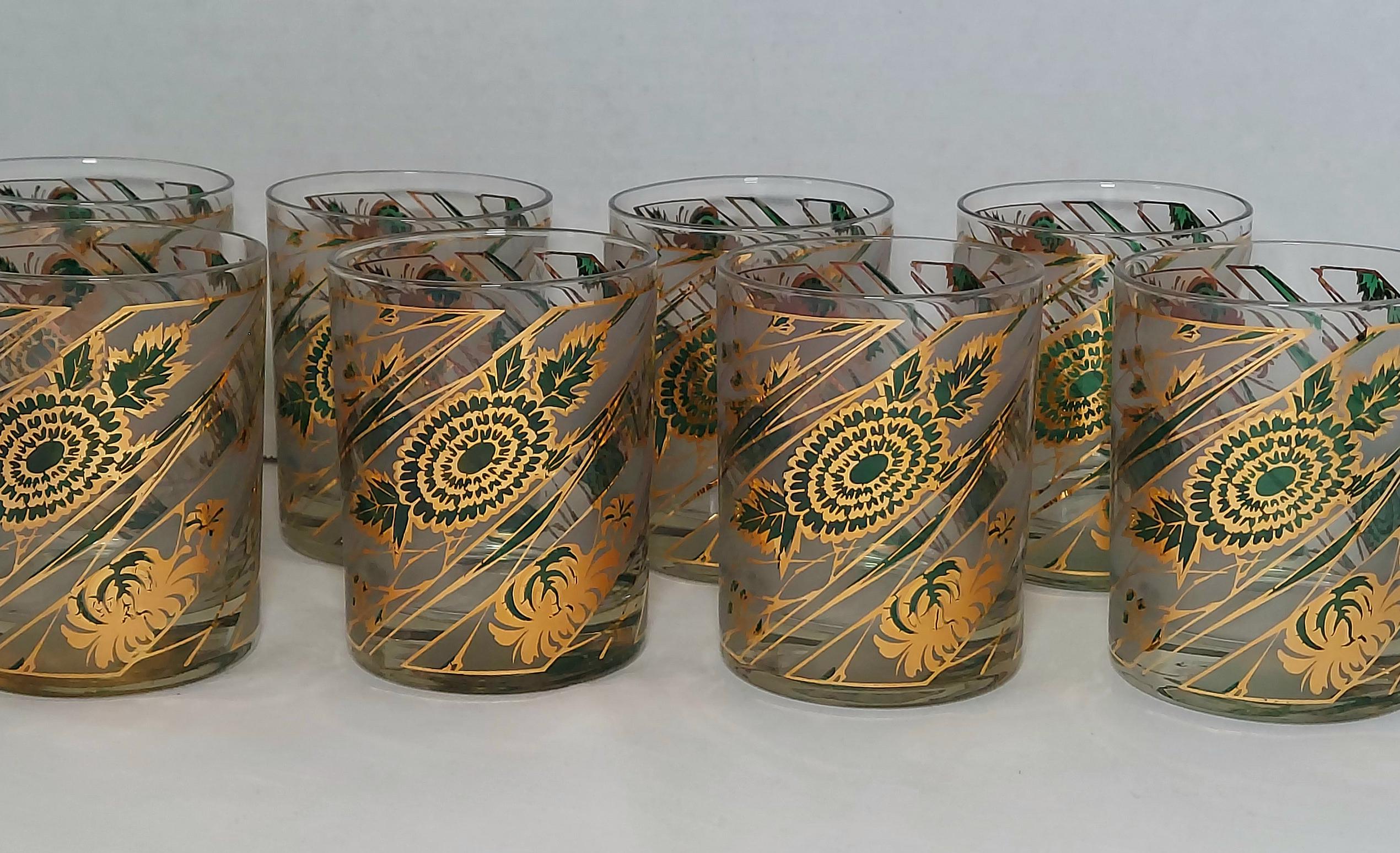 Here is a flawless set of eight Culver Ltd. midcentury double old-fashioned bar glasses. The rare pattern features green chrysanthemums outlined in gold, swirled around the glasses in frosted stripes. Elegant.