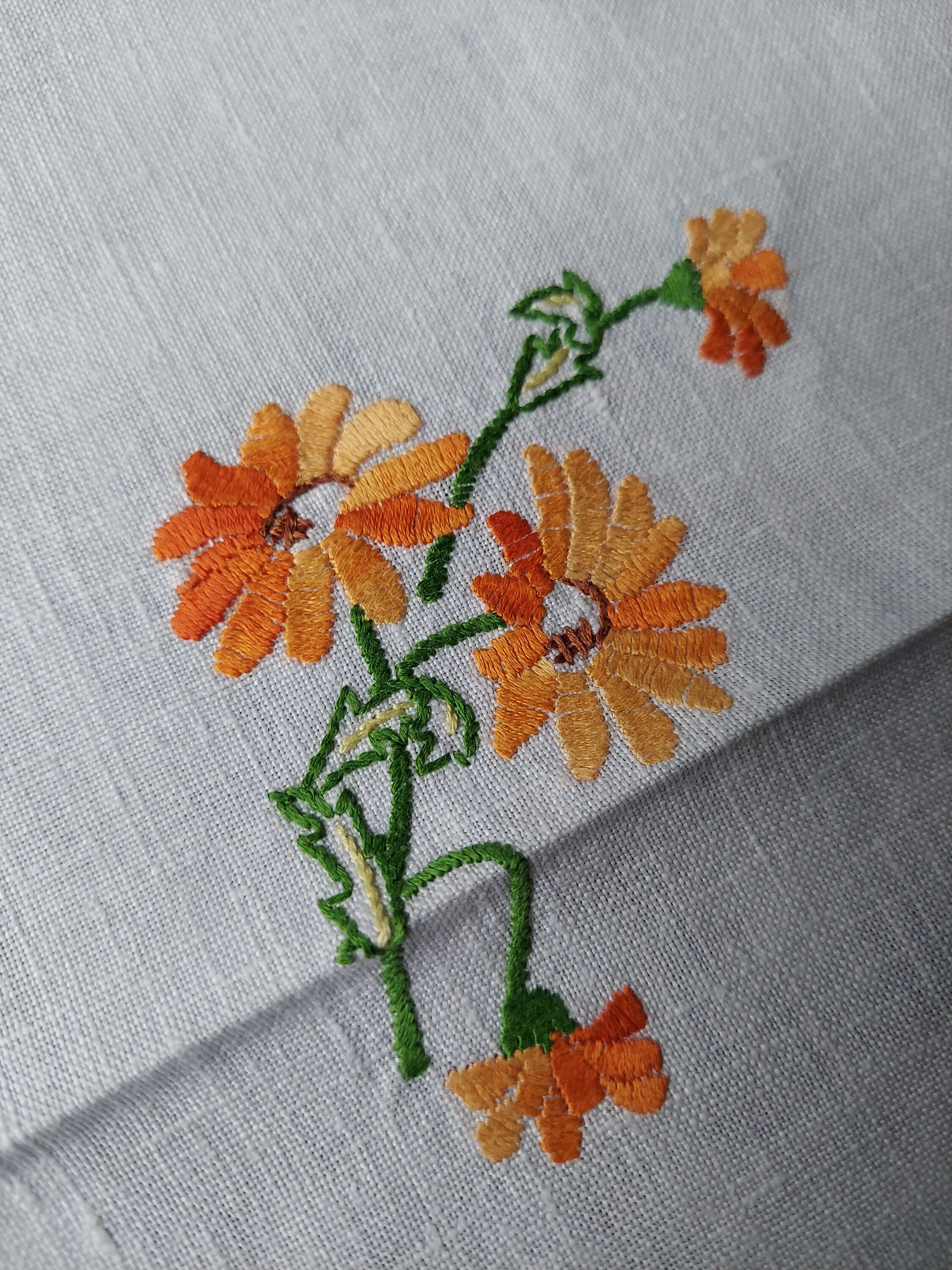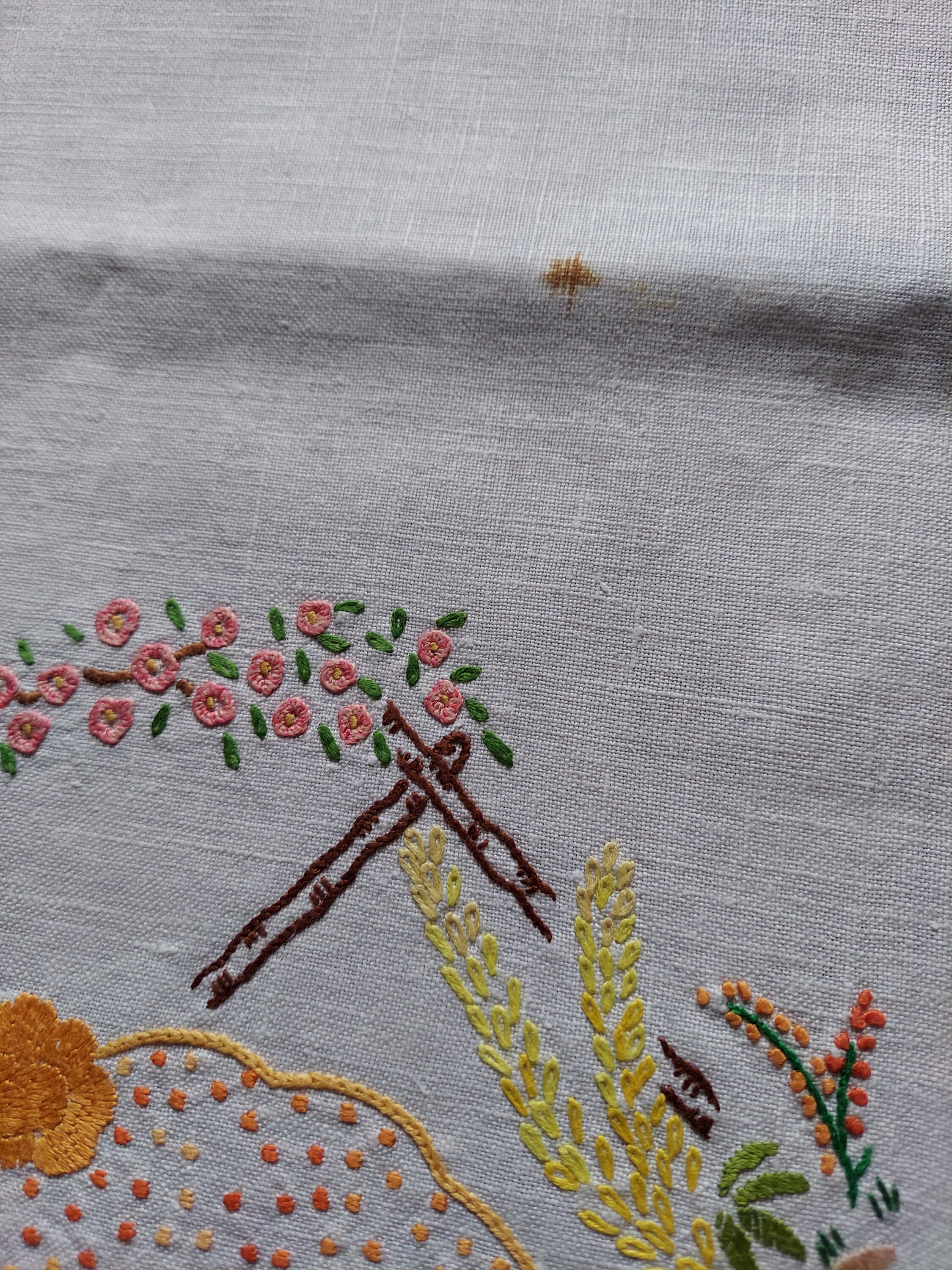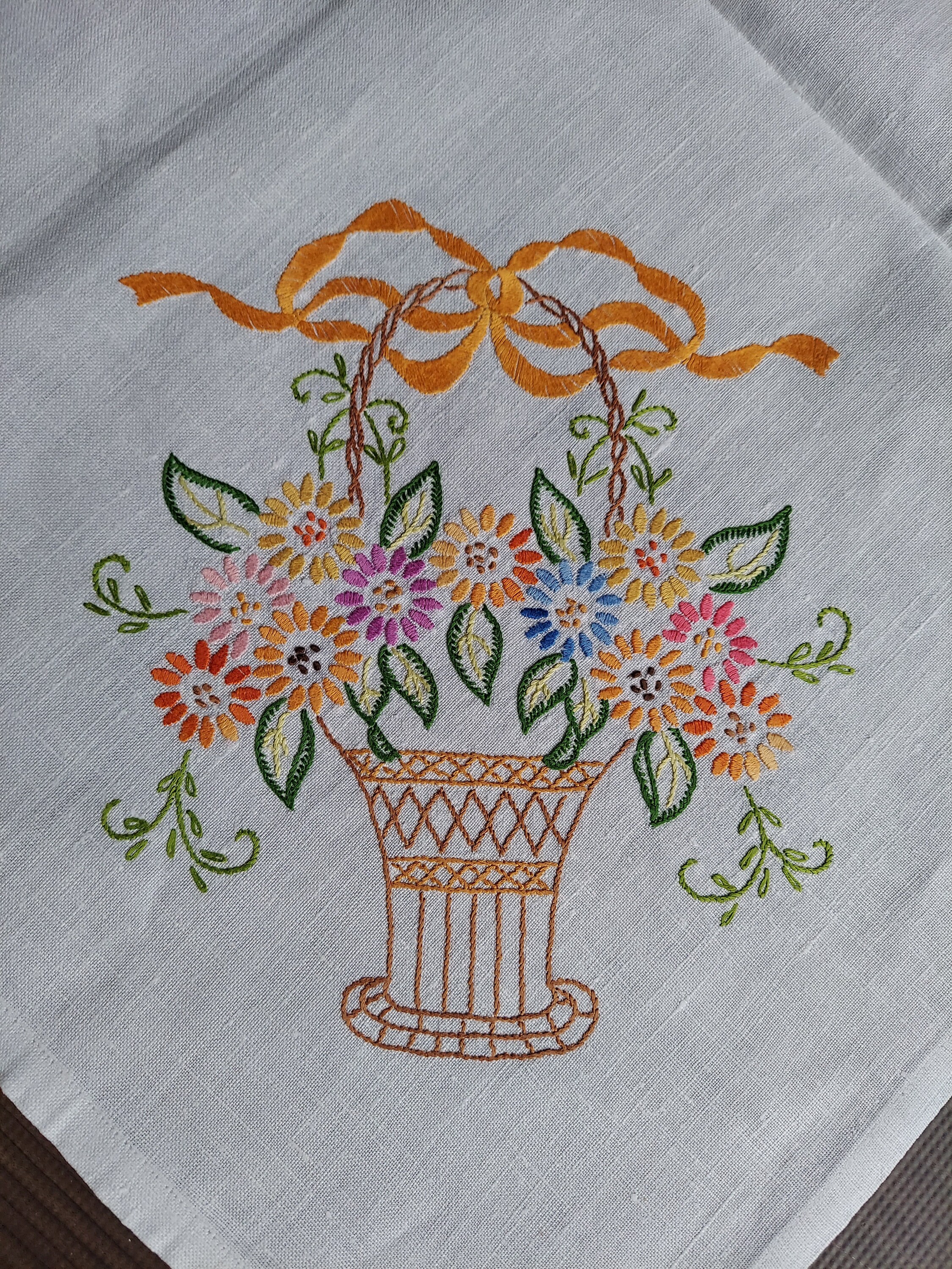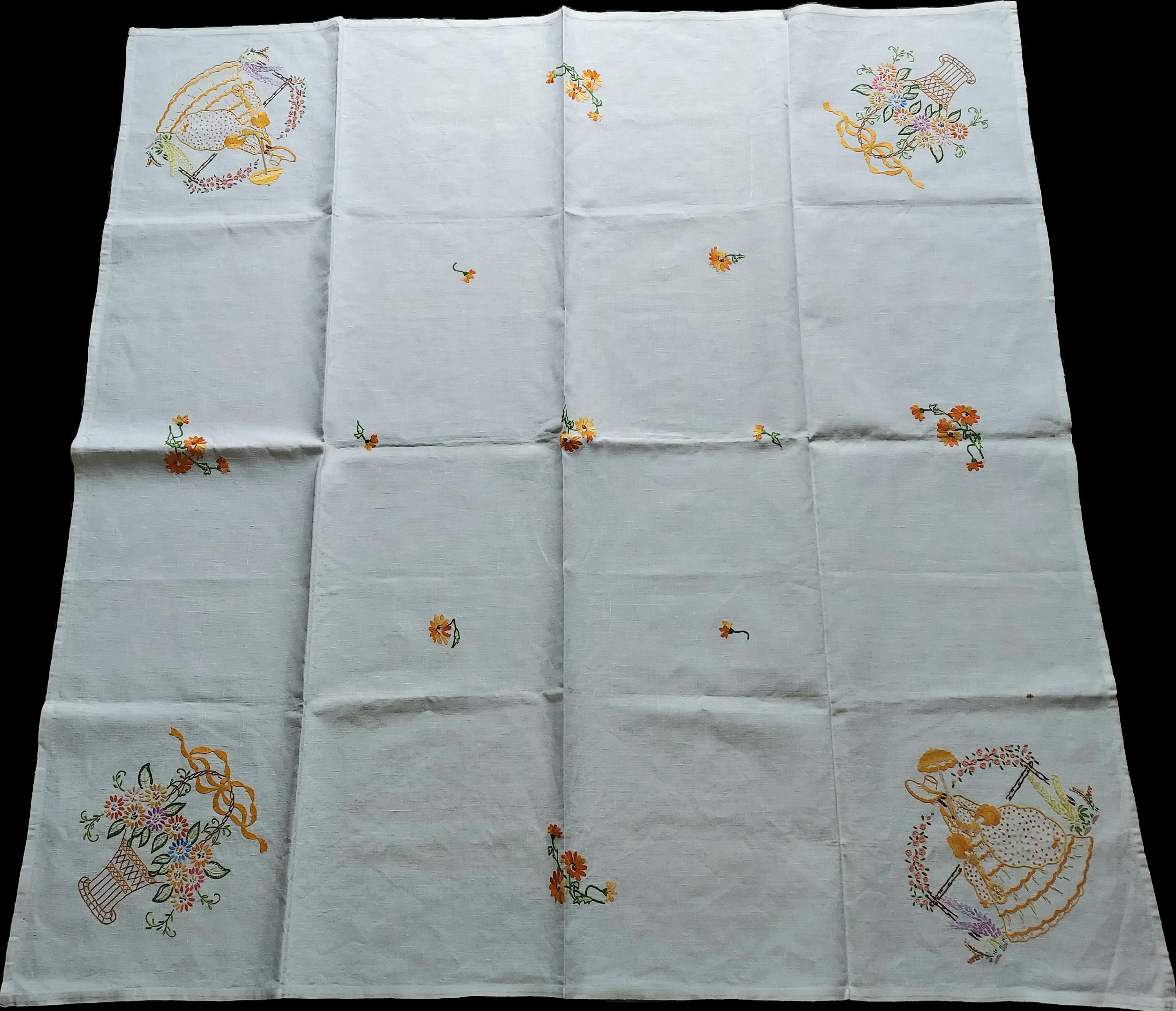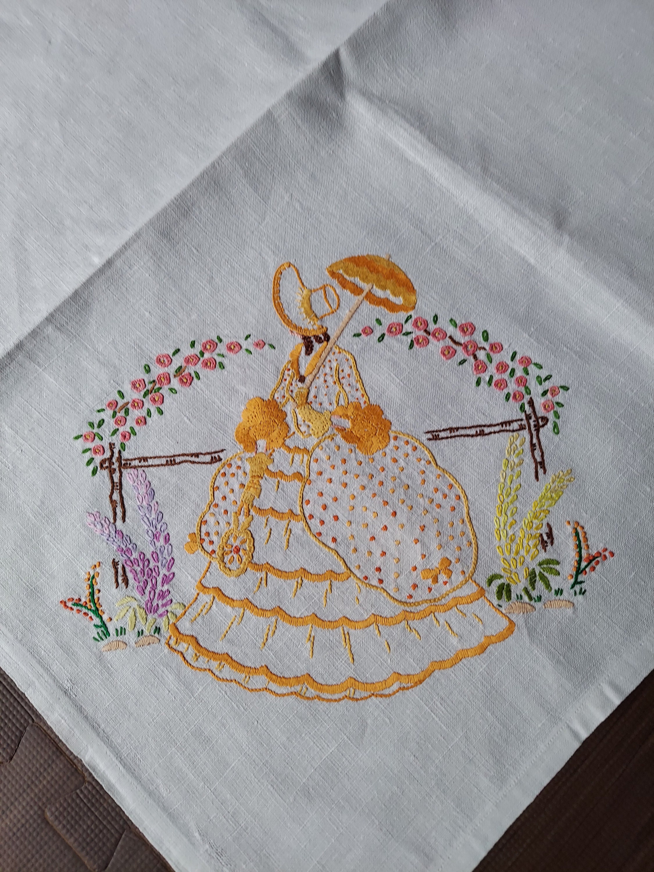 This crisp, heavy linen tablecloth is so romantic - adorned with pastel flowers in a basket with a gold ribbon, and with a hoop-skirted lady strolling in her garden. The quality of the embroidery is nothing short of spectacular!