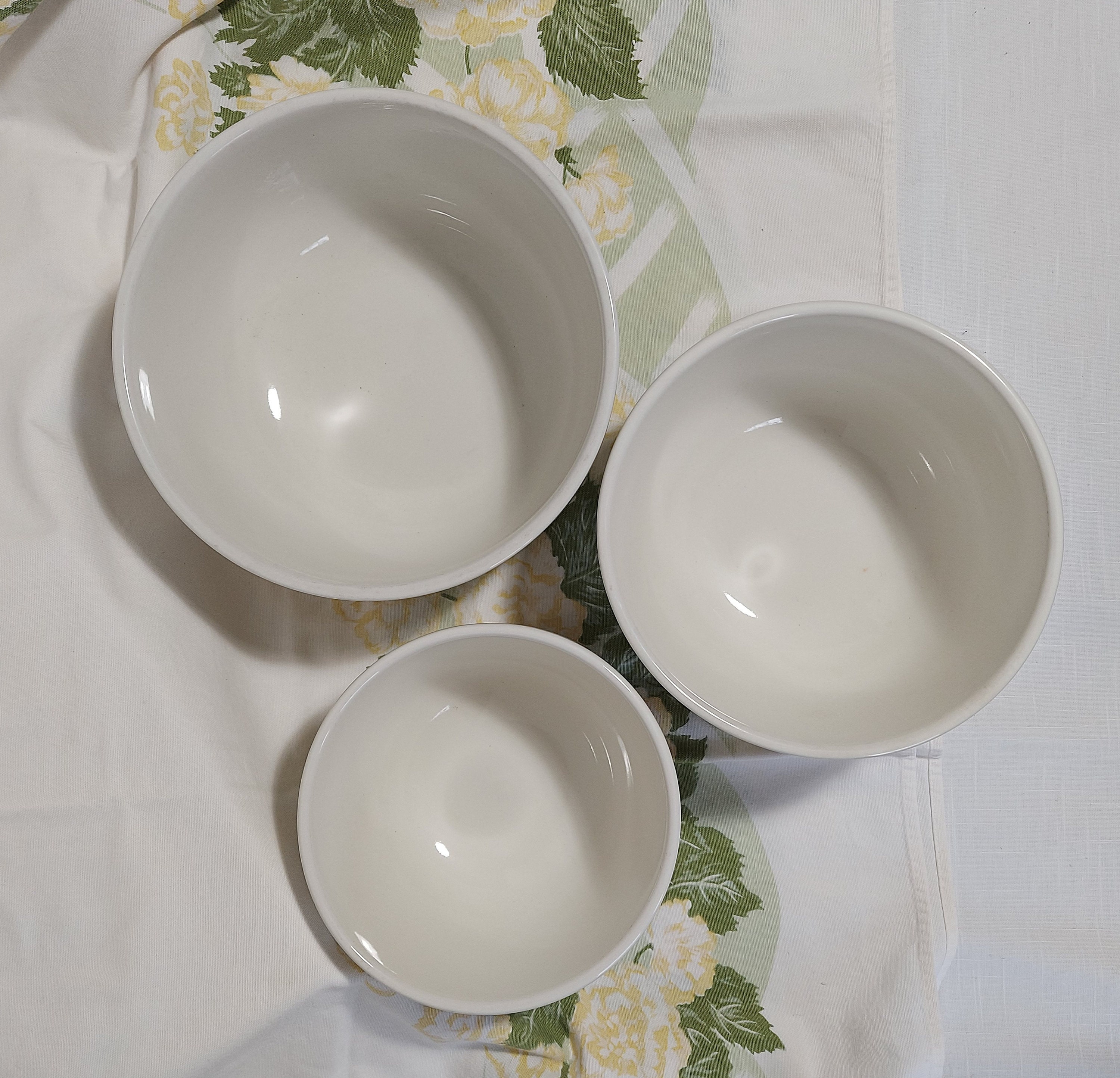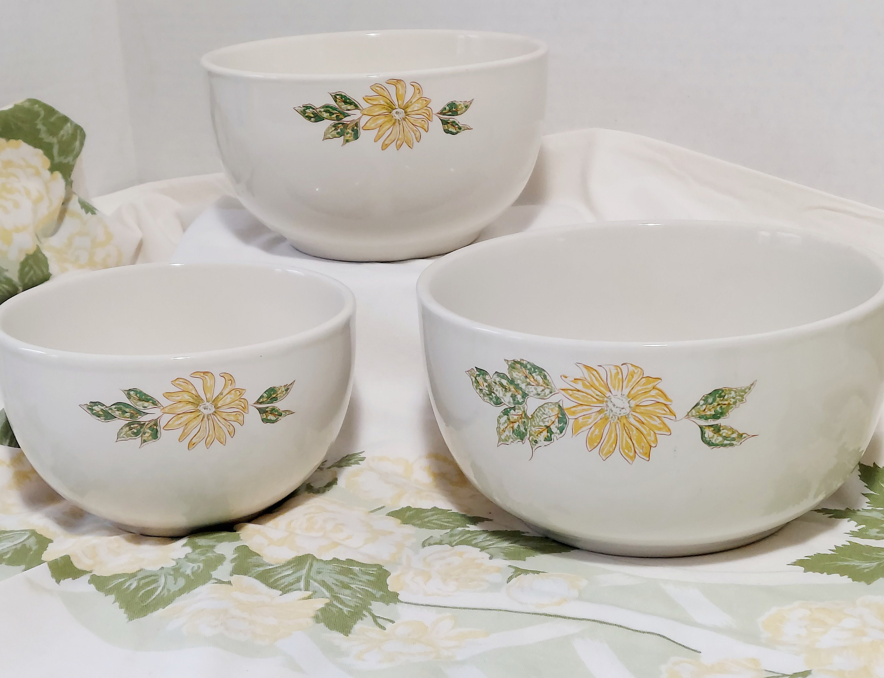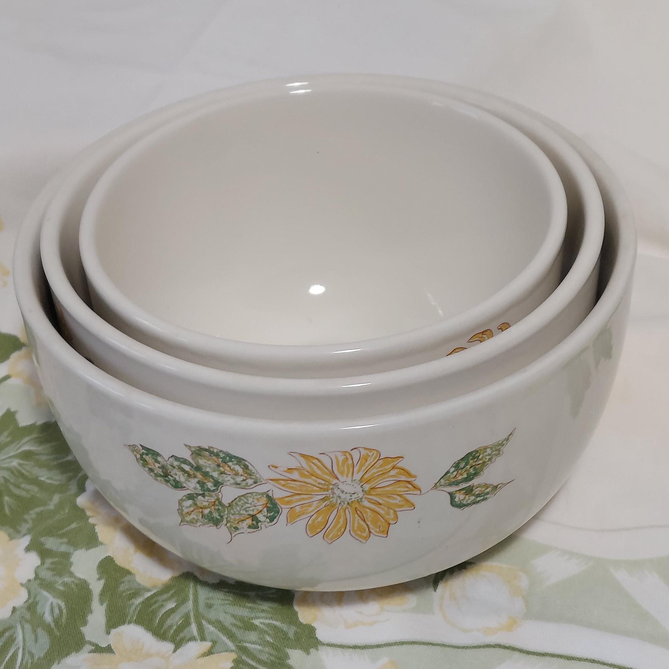 Three adorable pottery bowls in various capacities, starting with 1 quart. Cute sunflower motif. The bowls can be nested together. Vintage USA pottery.