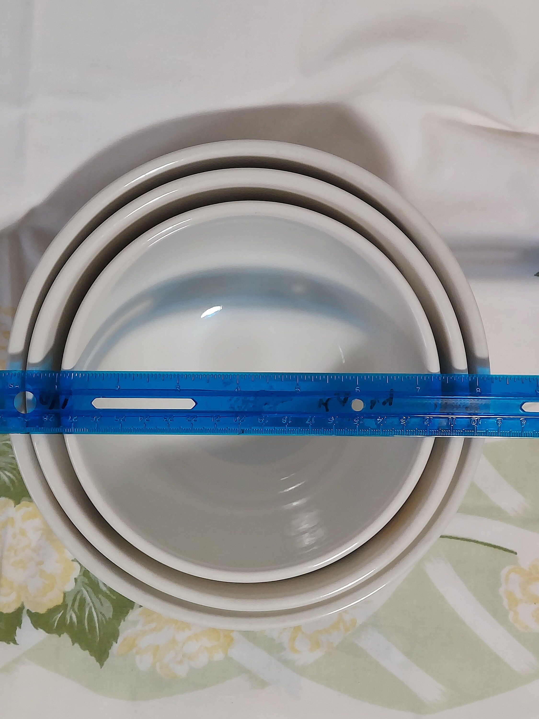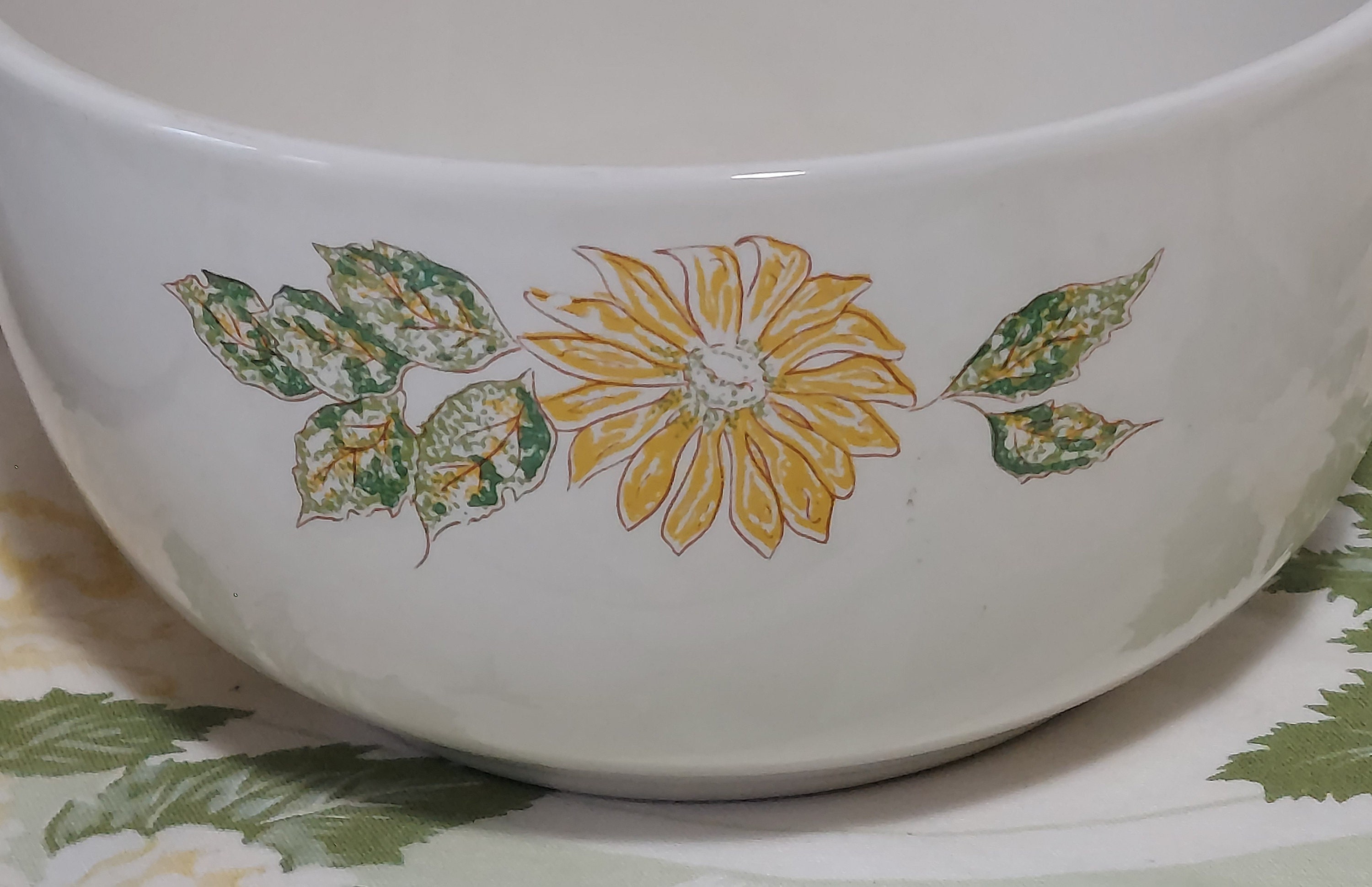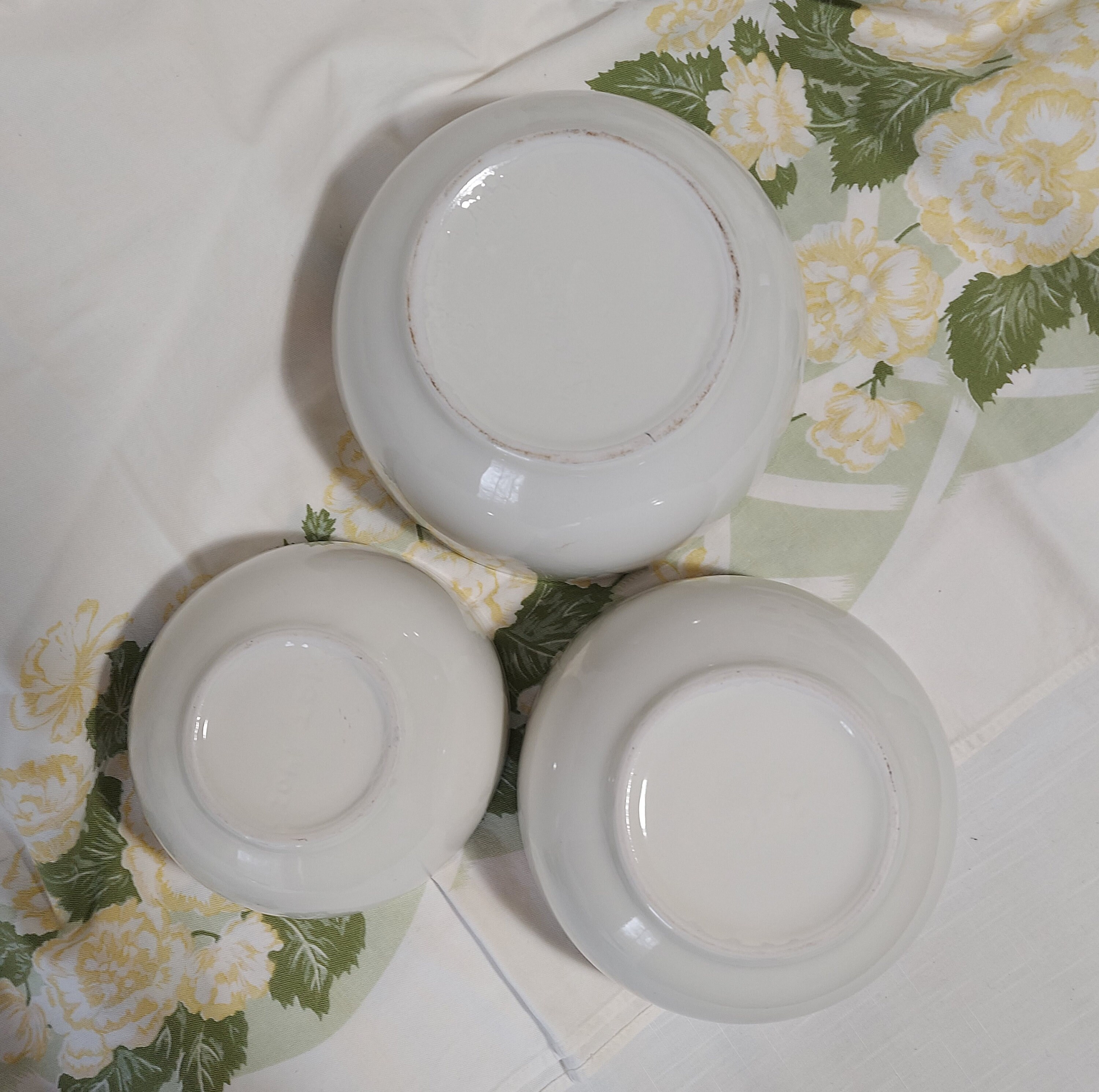 Three adorable pottery bowls in various capacities, starting with 1 quart. Cute sunflower motif. The bowls can be nested together. Vintage USA pottery.
