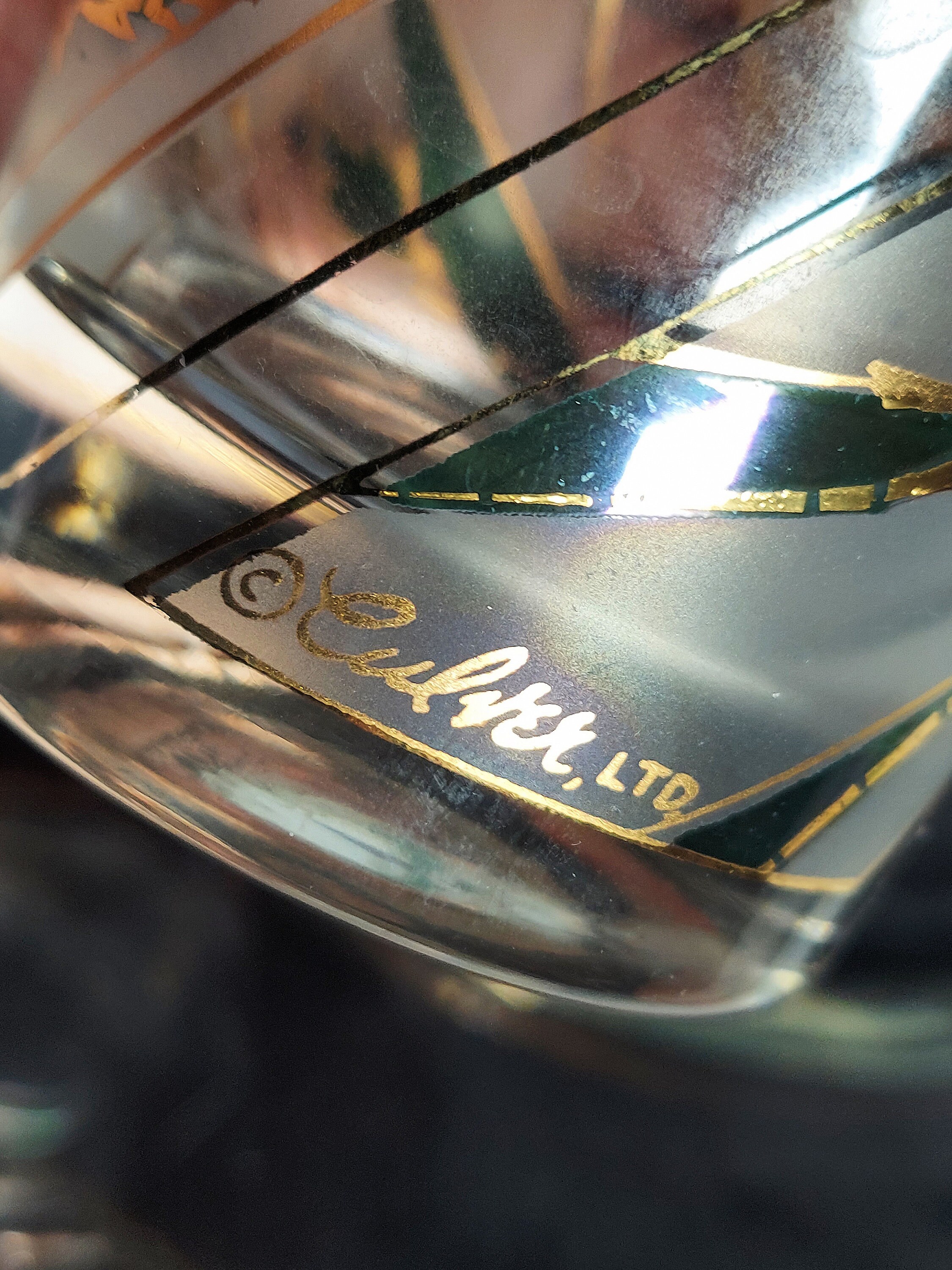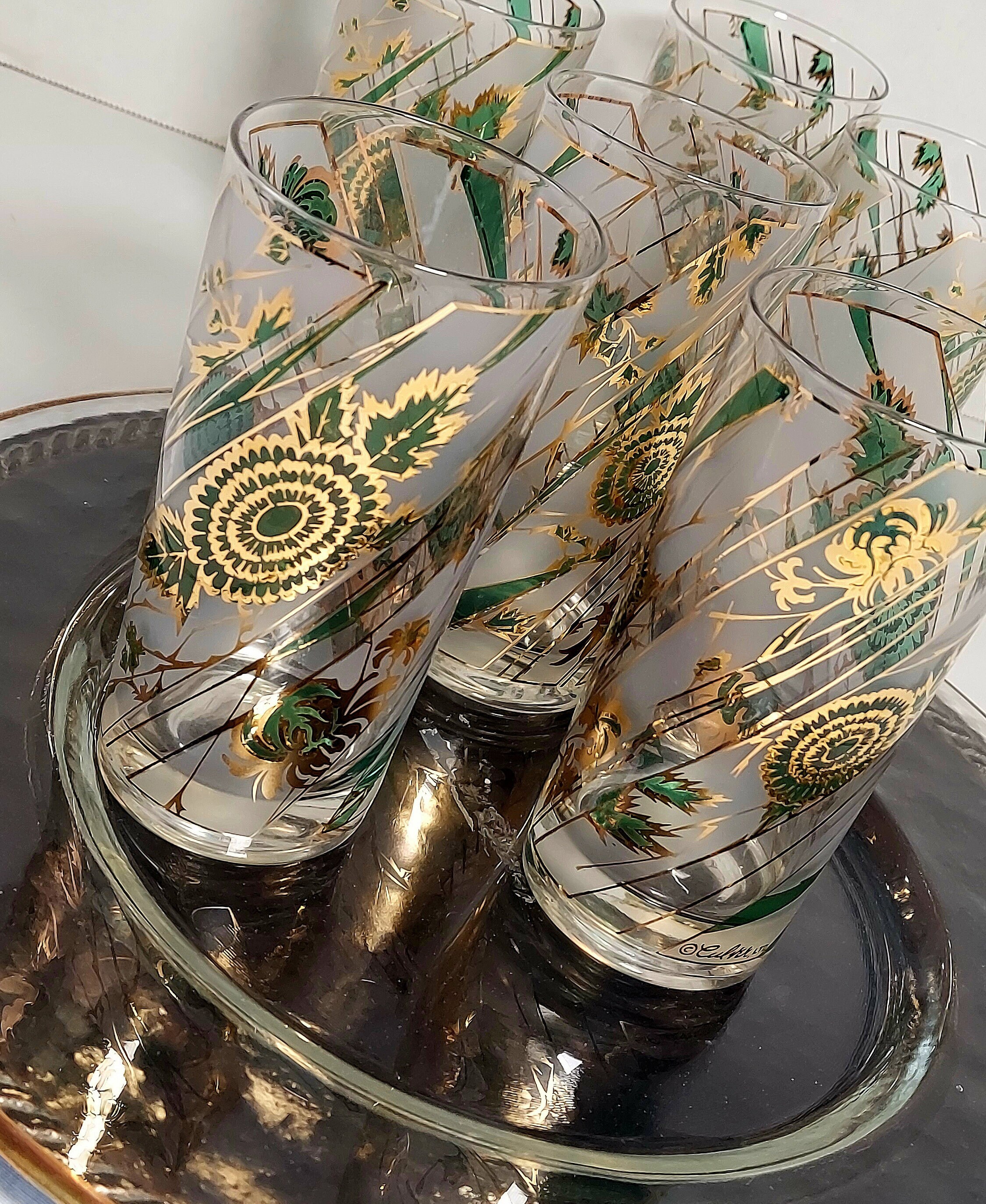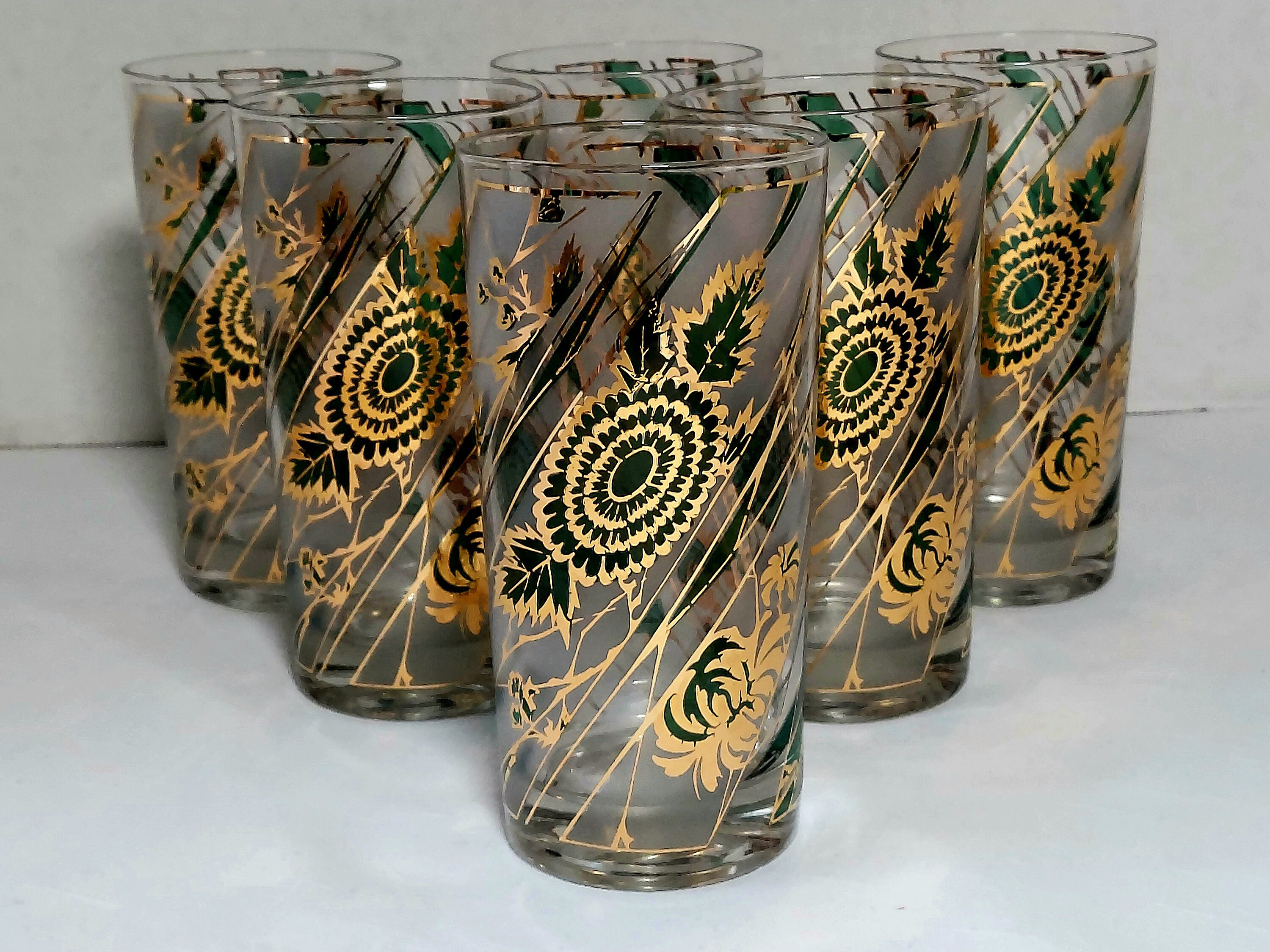 Here is a flawless set of six Culver Ltd. midcentury highball bar glasses. The rare pattern features green chrysanthemums outlined in gold, swirled around the glasses in frosted stripes. Elegant.