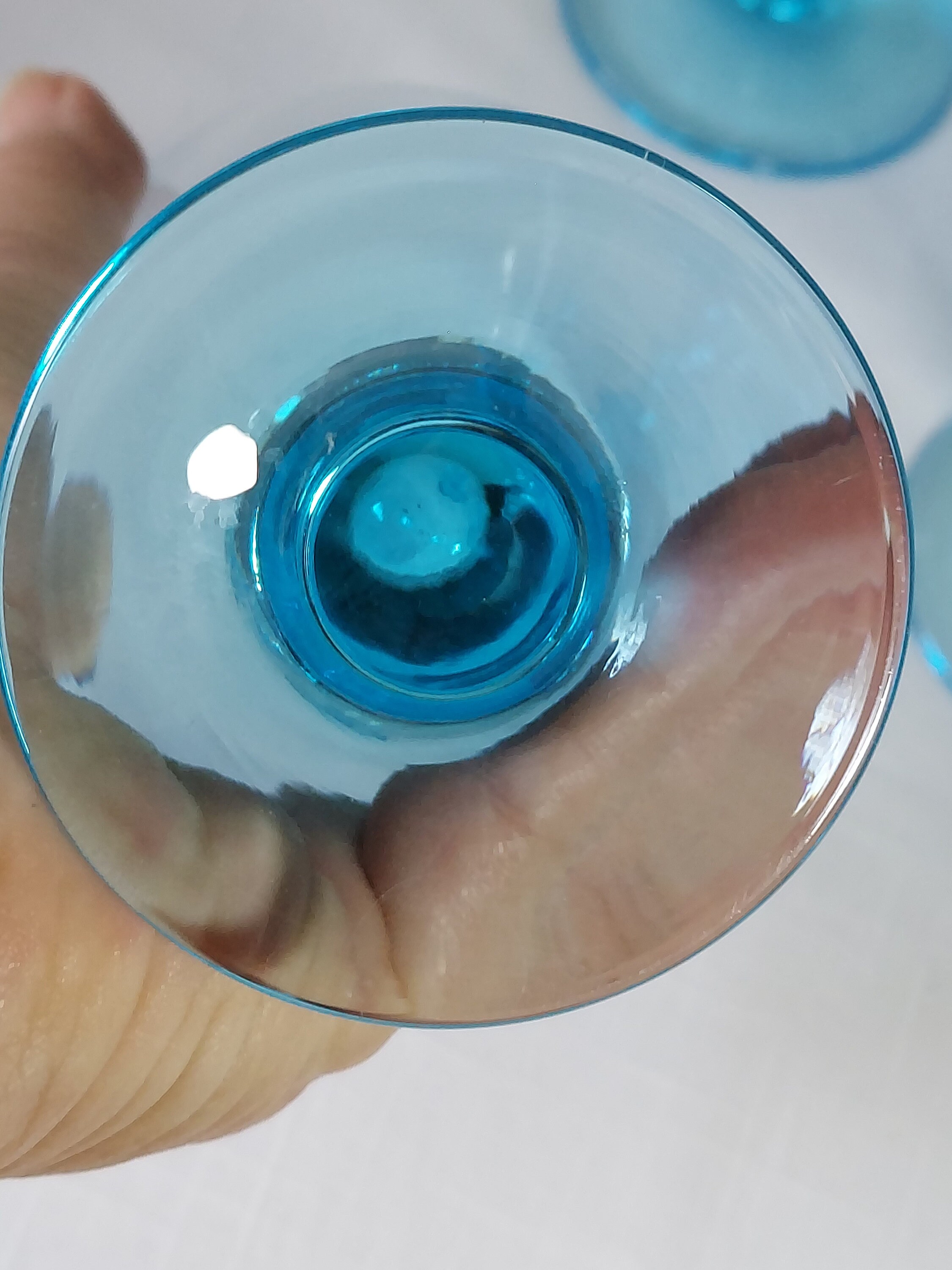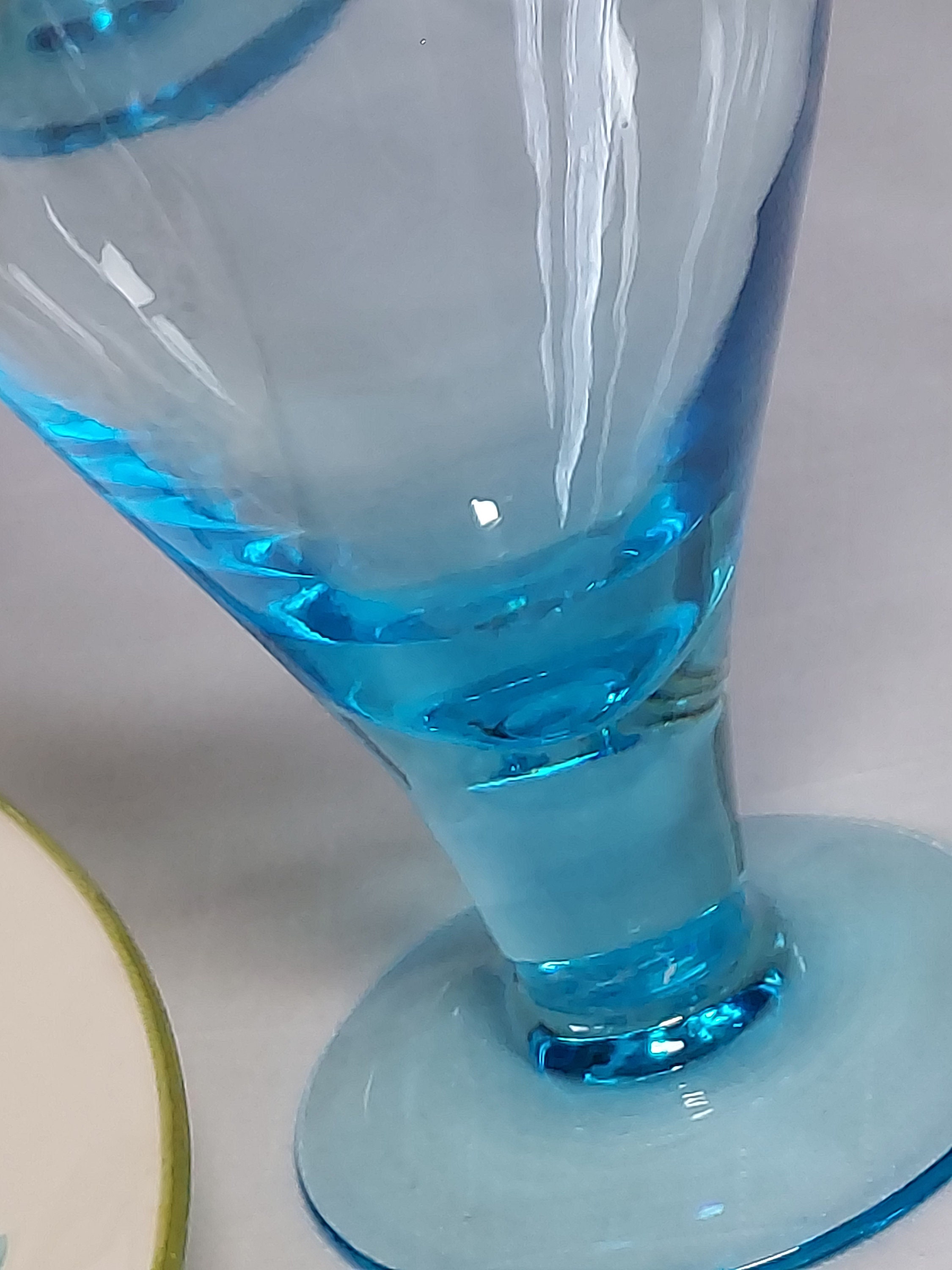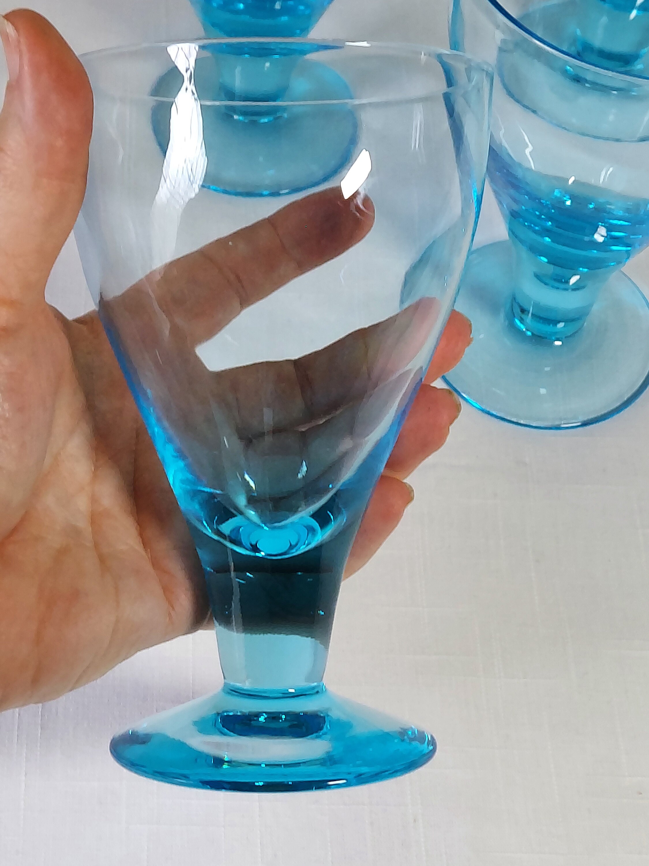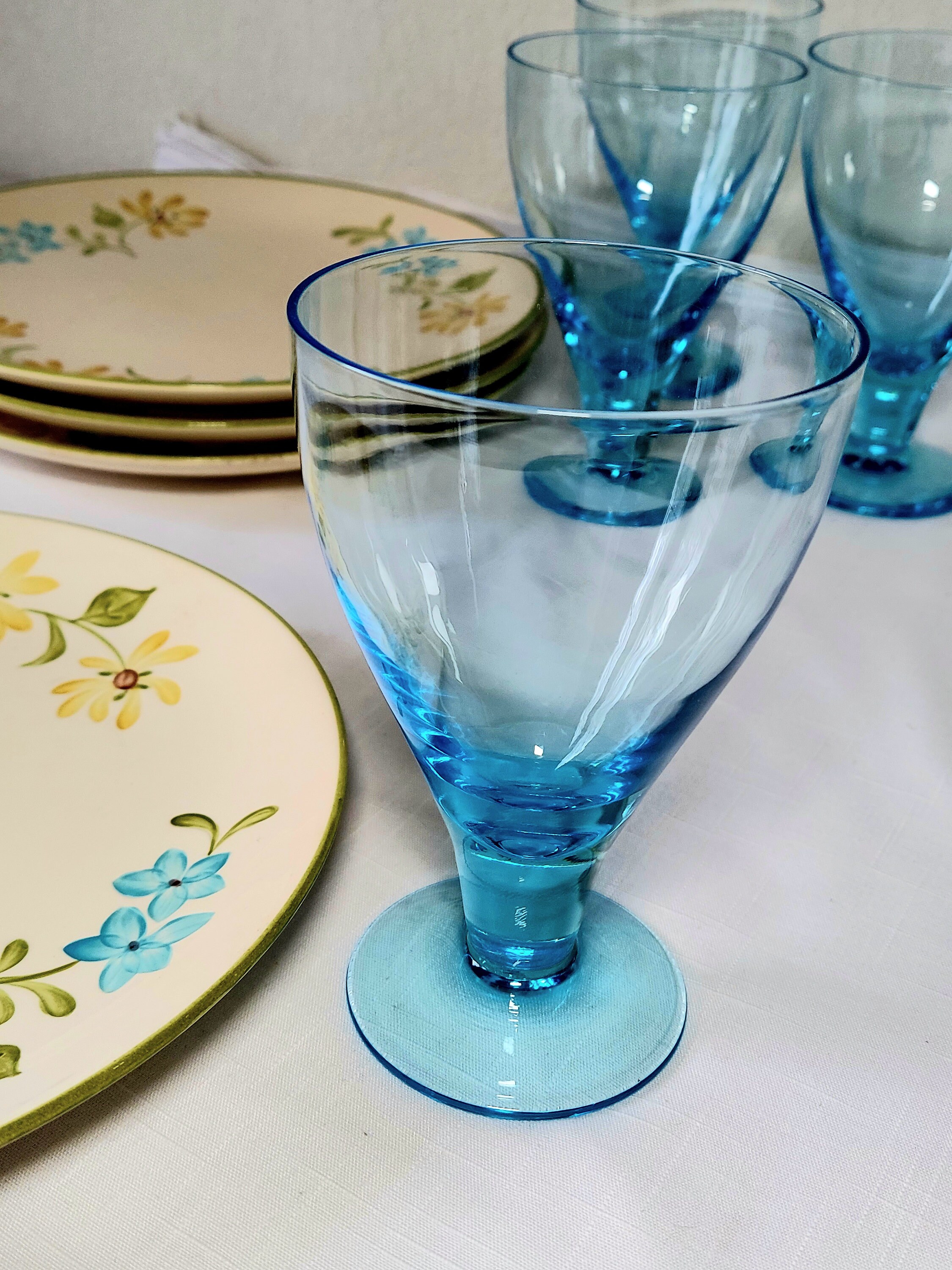 Four gorgeous blue goblets to mix and match. Six inches tall. In excellent condition - no chips, cracks or hazing. Pictured with Franciscan Earthenware "Daisy" plates (not included). Please feel free to message with any questions. Check out other glassware in this pattern and more, along with coordinating dishes. Thank you for visiting Redux Vintage Boutique.