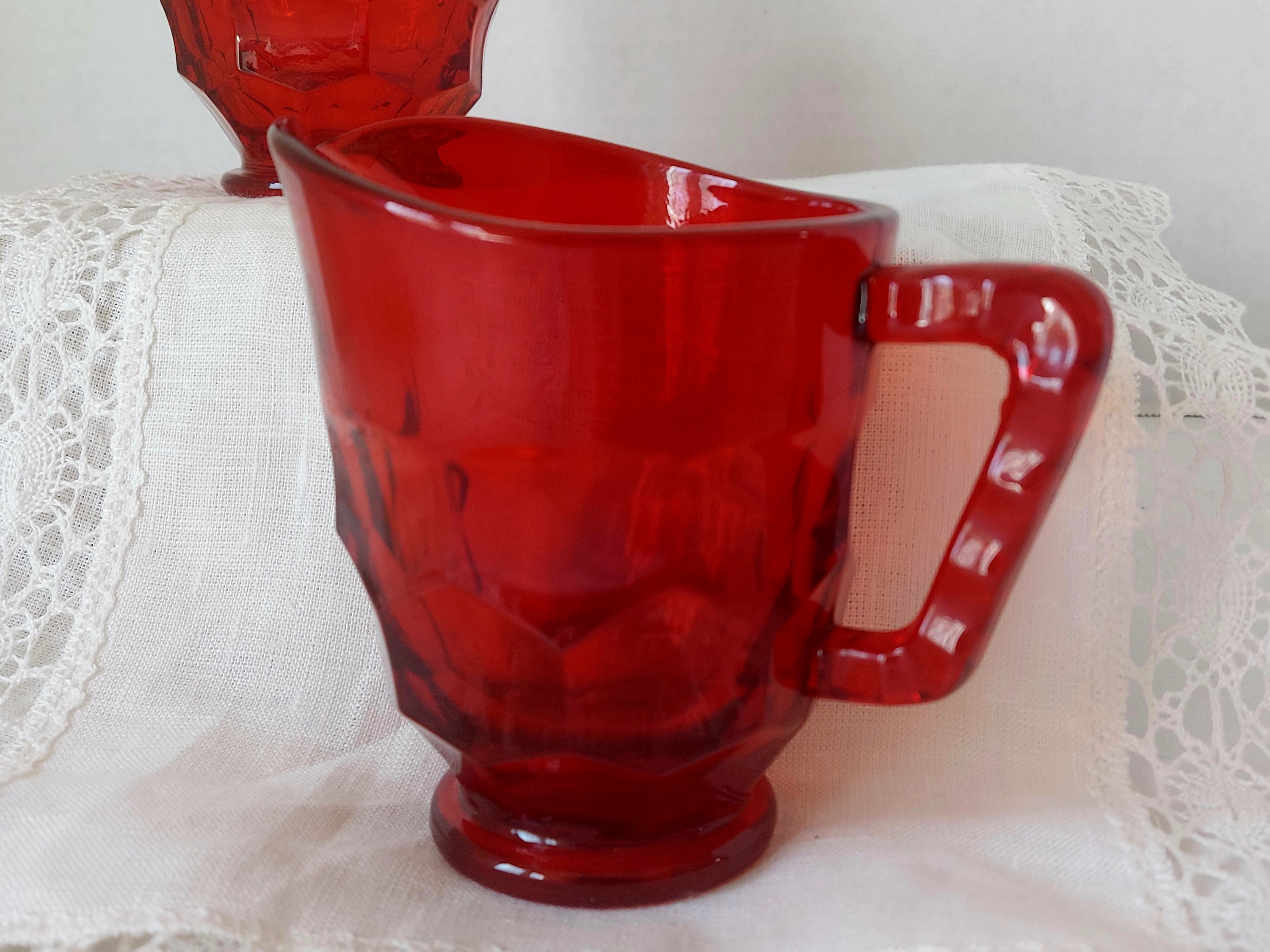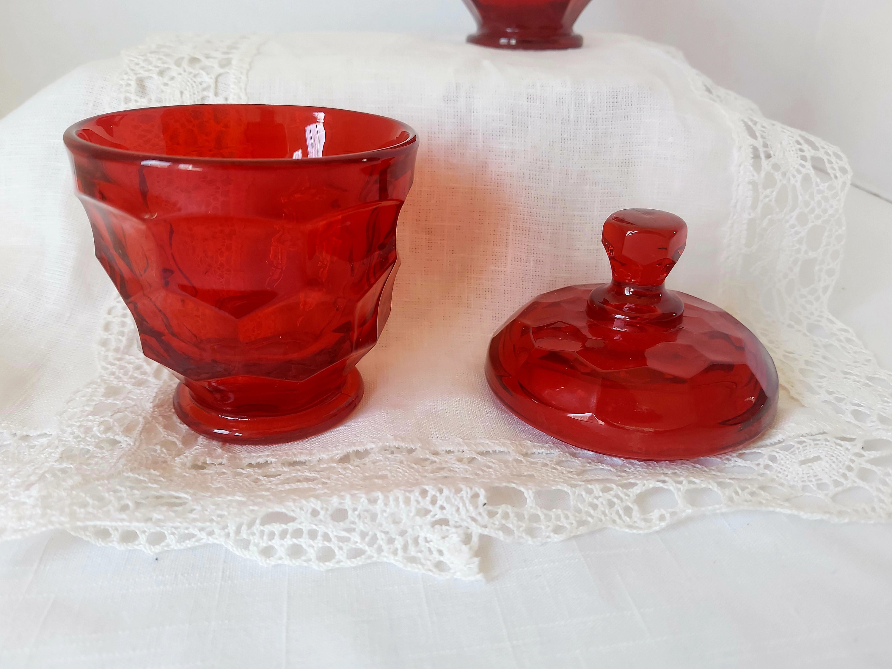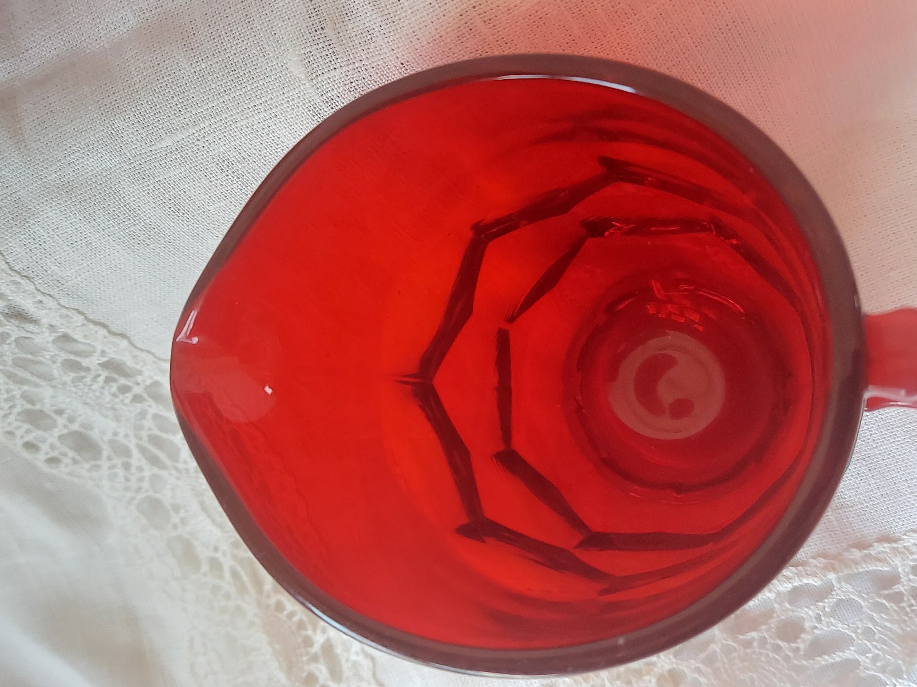 Pristine cream and covered sugar set by Viking Glass in the honeycomb pattern they called Georgian. According to Replacements Limited.com, this pattern was active between 1940 and 1996. Apparently, a very popular pattern! This is the color they call "ruby' - and you can definitely see why.