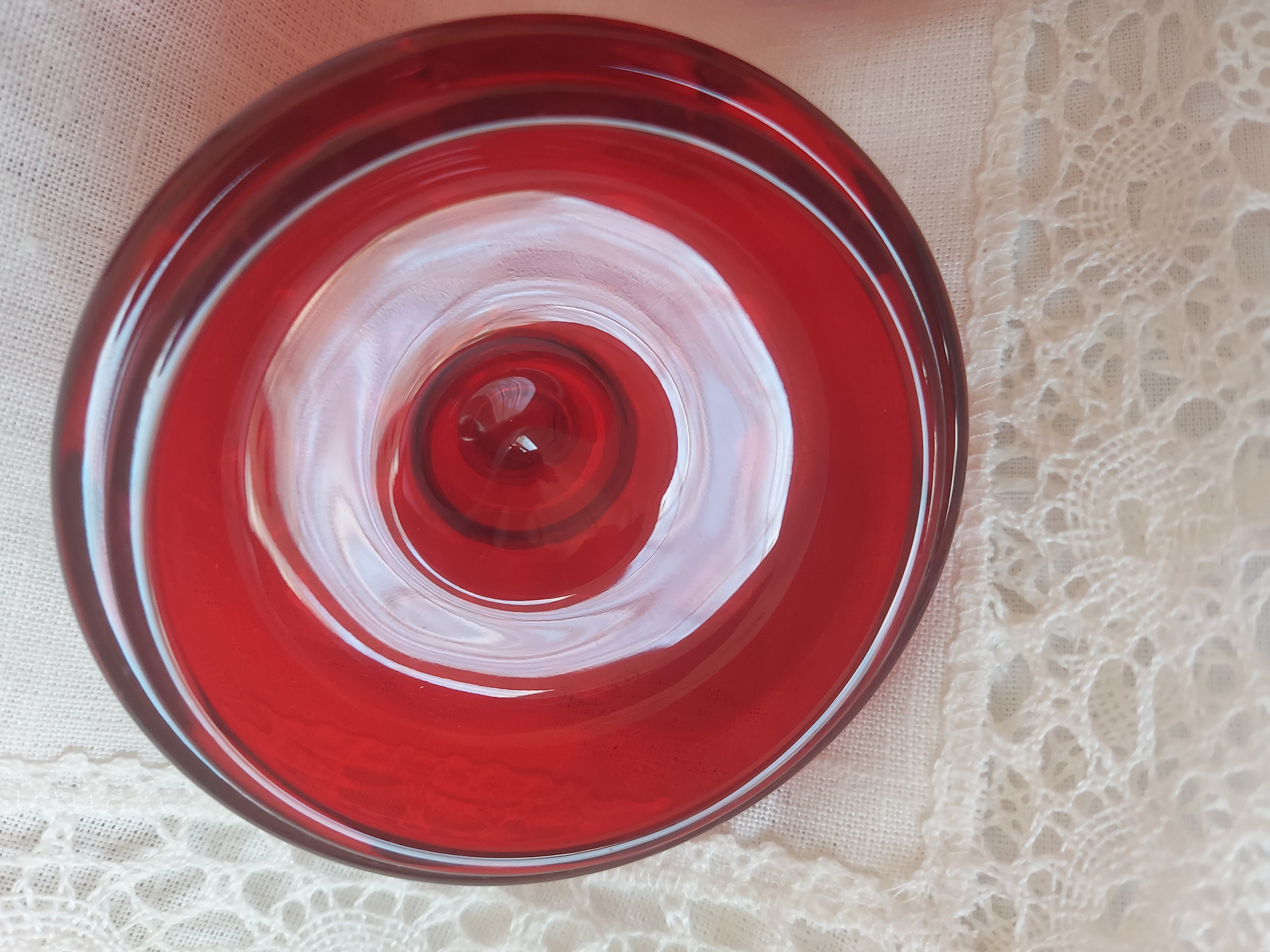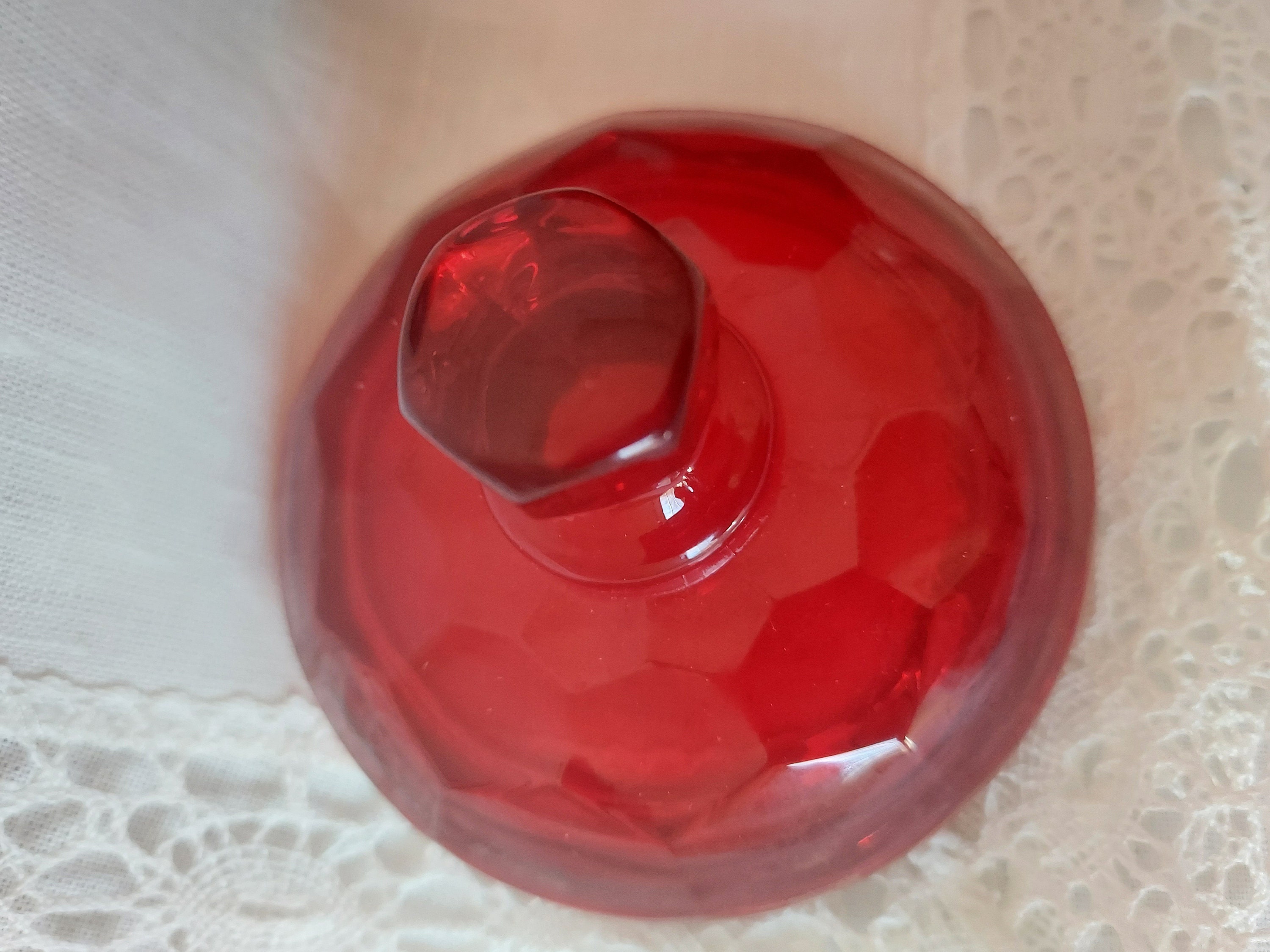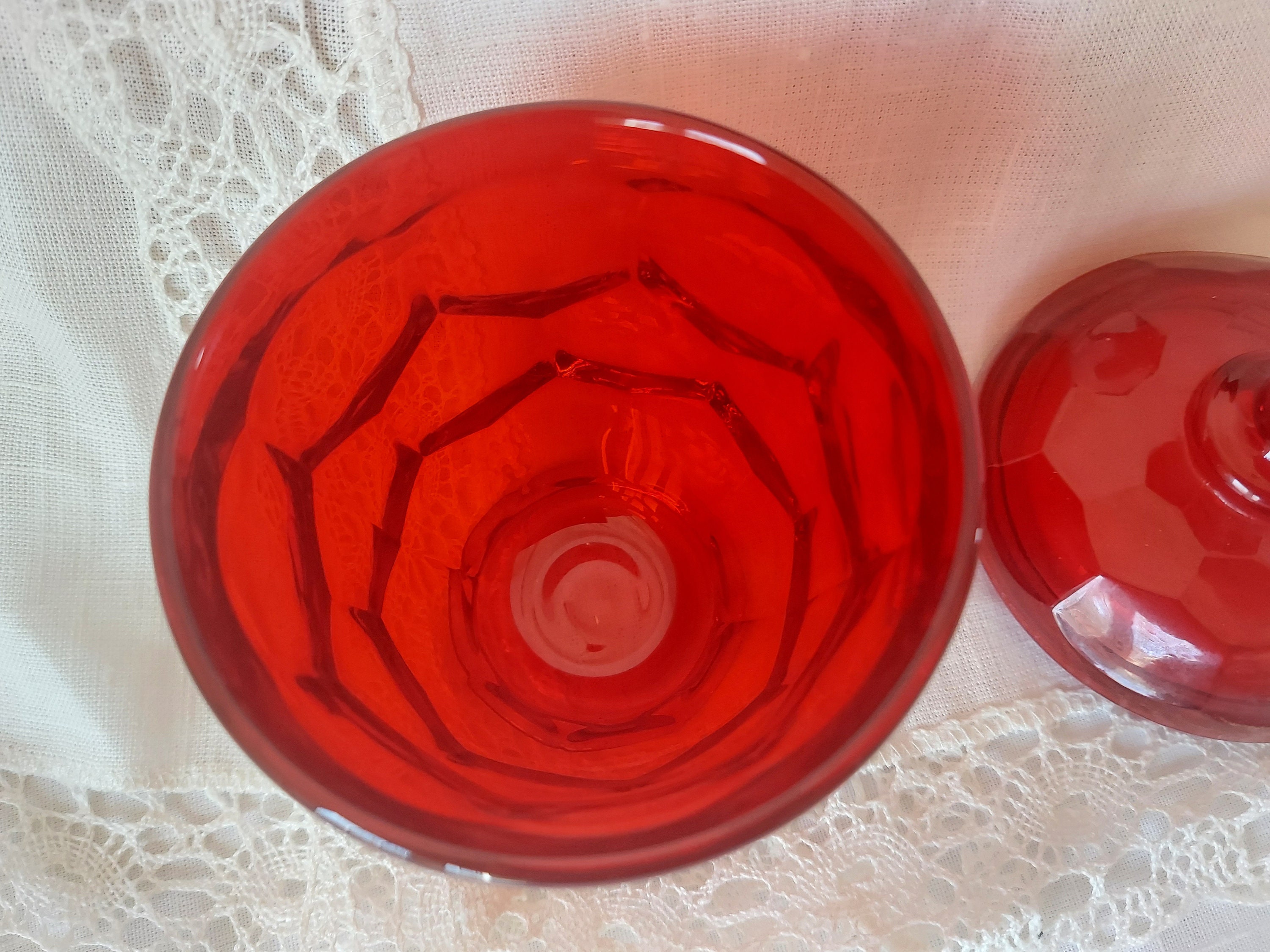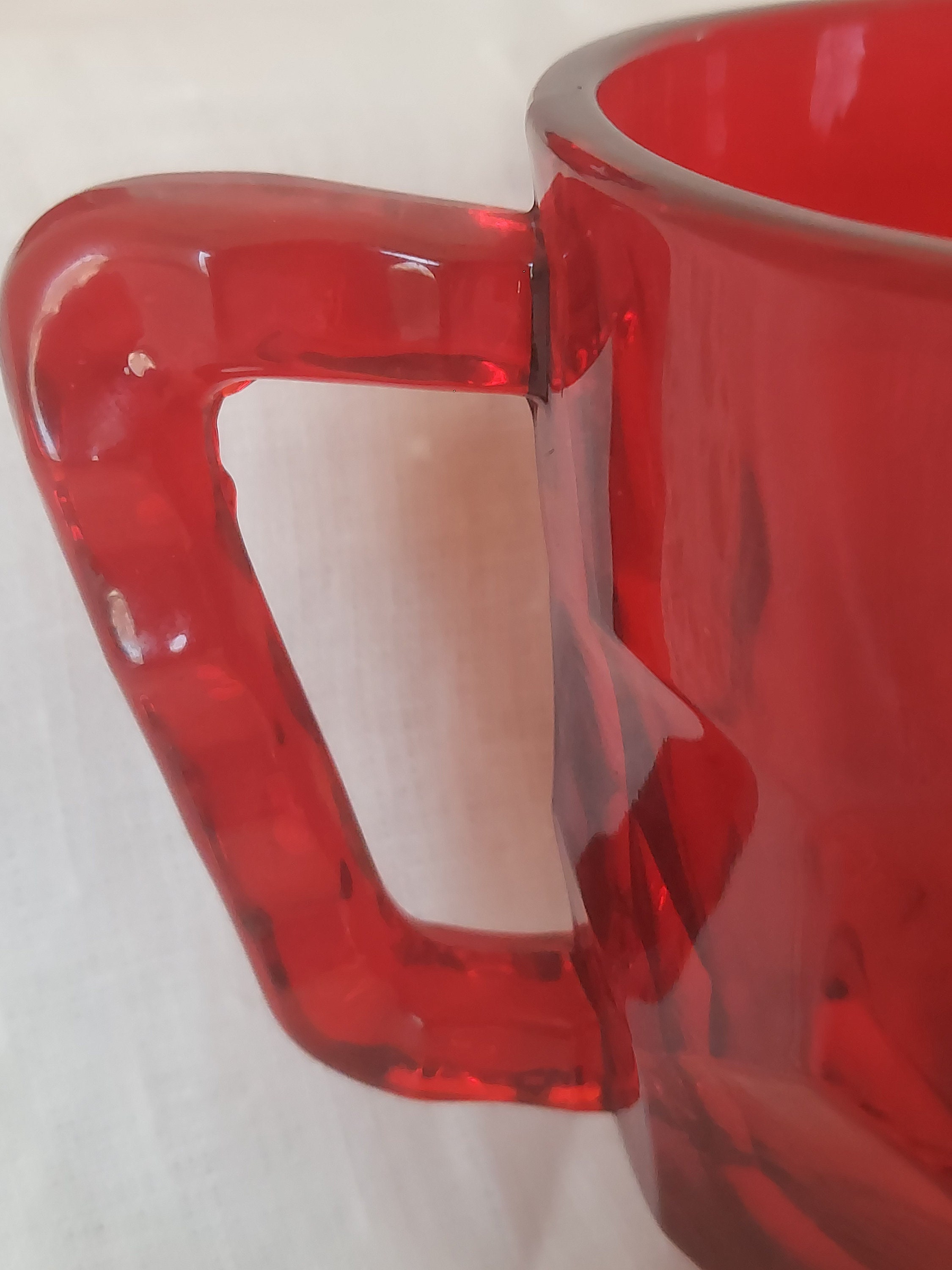 Pristine cream and covered sugar set by Viking Glass in the honeycomb pattern they called Georgian. According to Replacements Limited.com, this pattern was active between 1940 and 1996. Apparently, a very popular pattern! This is the color they call "ruby' - and you can definitely see why.