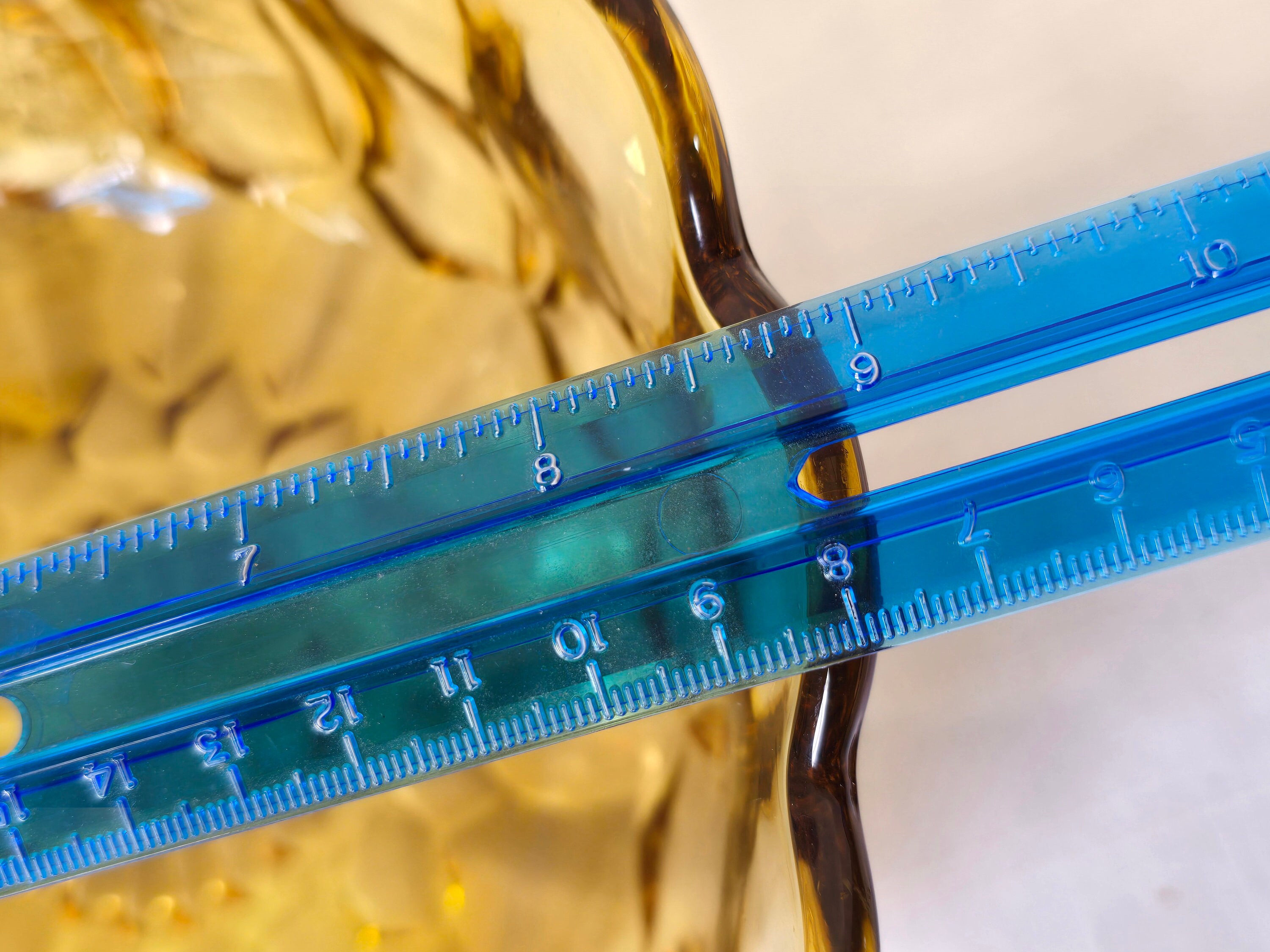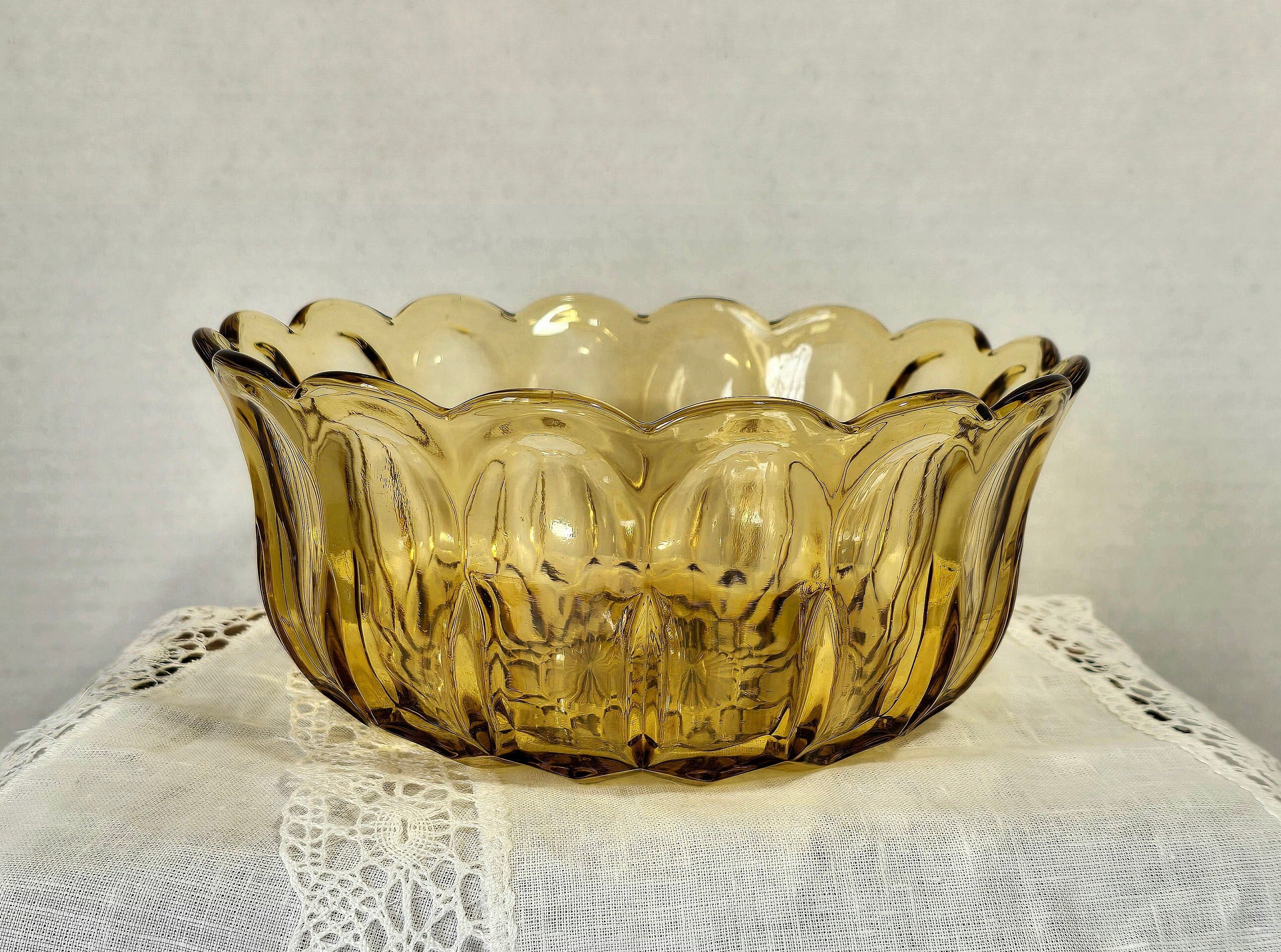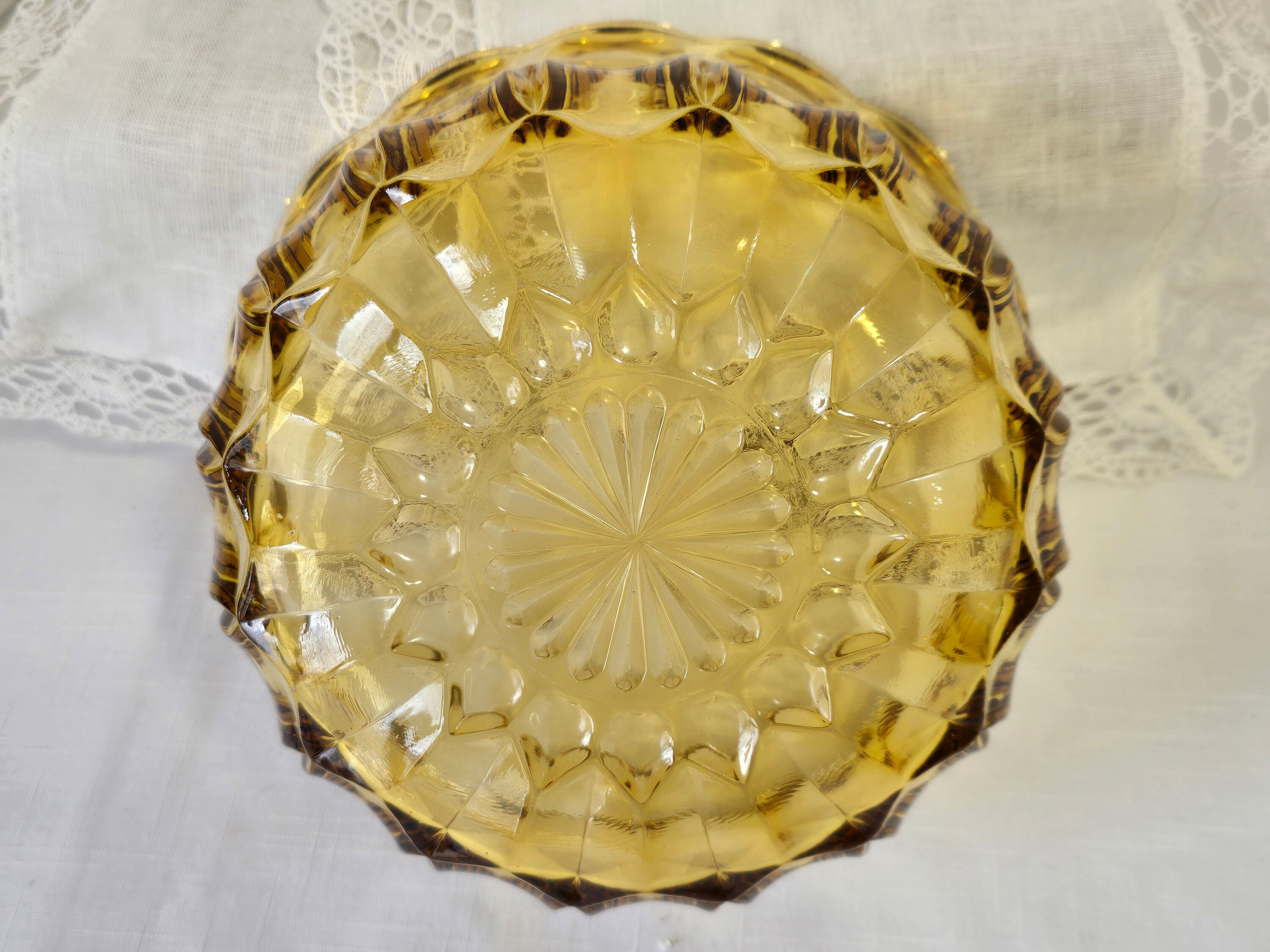 Here is a pretty salad bowl with a bright pop of amber gold in a vintage pattern by Anchor Hocking. This pattern, Fairfield, was active only in the '70s.