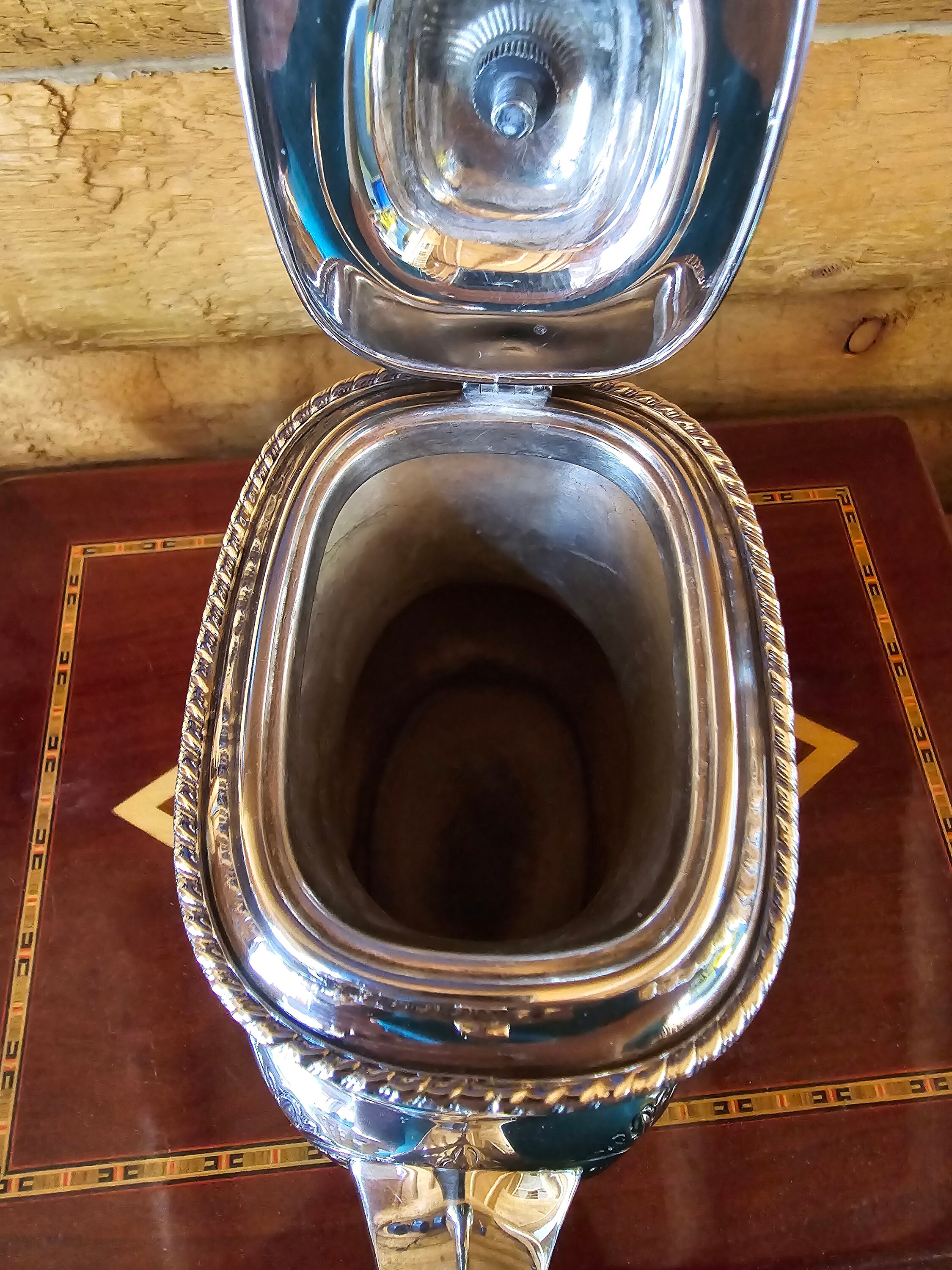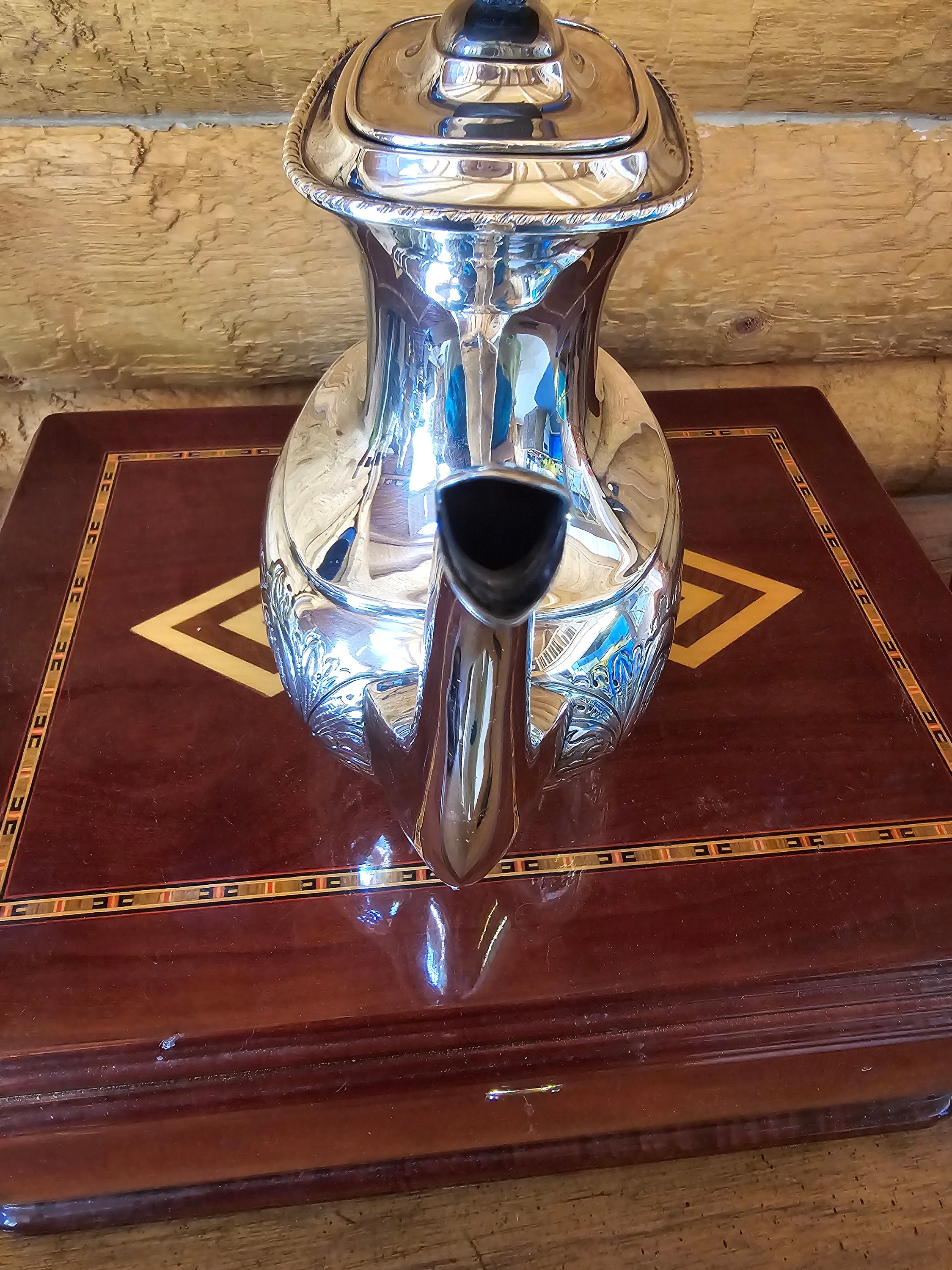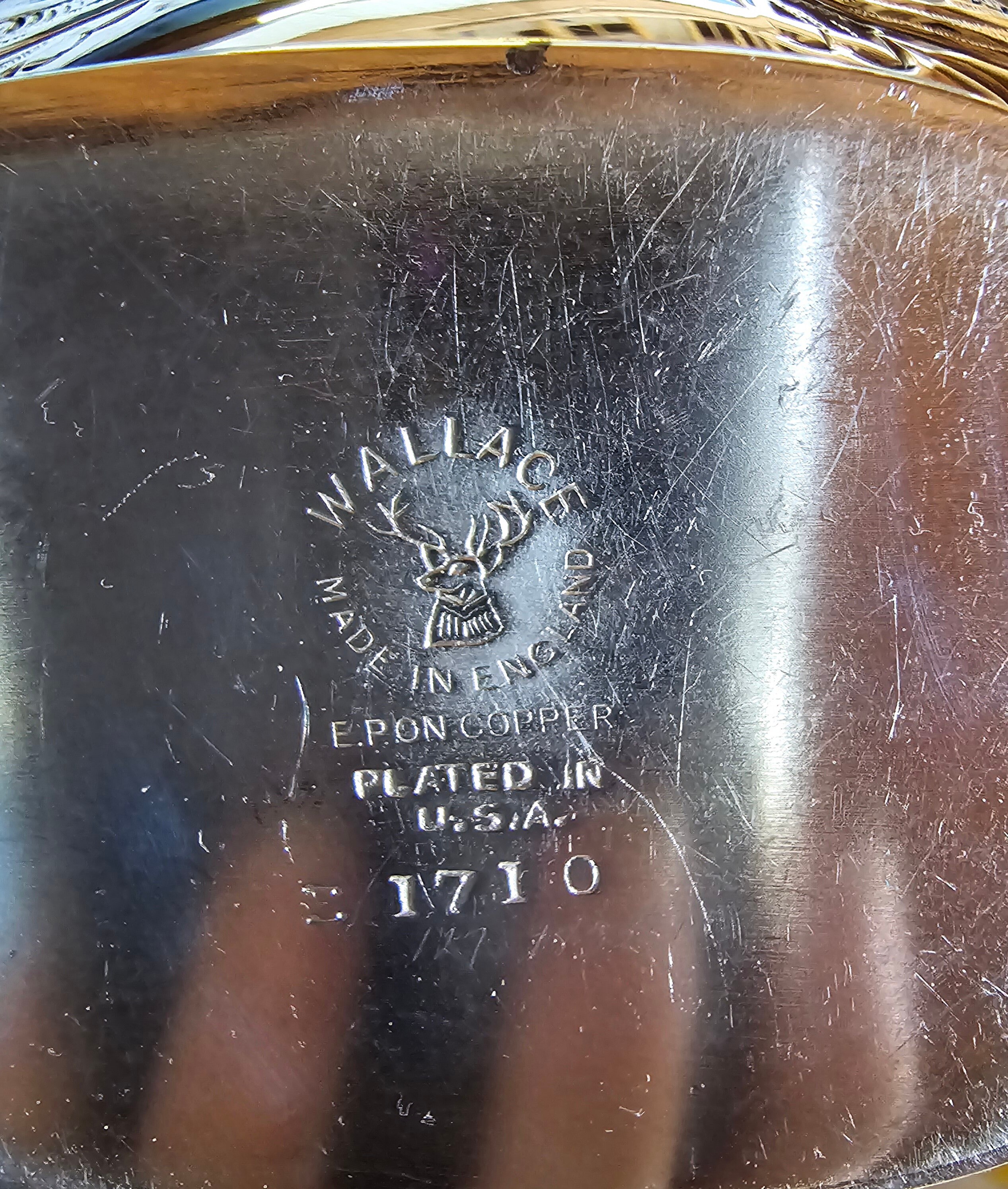 This is quite a rare piece. Beautiful repoussé and chased design accompanied by an Ebonite handle create a striking coffee pot. Stamped with a stag head emblem encircled by "WALLACE MADE IN ENGLAND" with "E.P ON COPPER" and "PLATED IN U.S.A." There is what I believe is a shape or pattern number "E 1710." In my research I found only one other piece with these markings. The metalwork is superb. It is my opinion it was done by Sheffield.