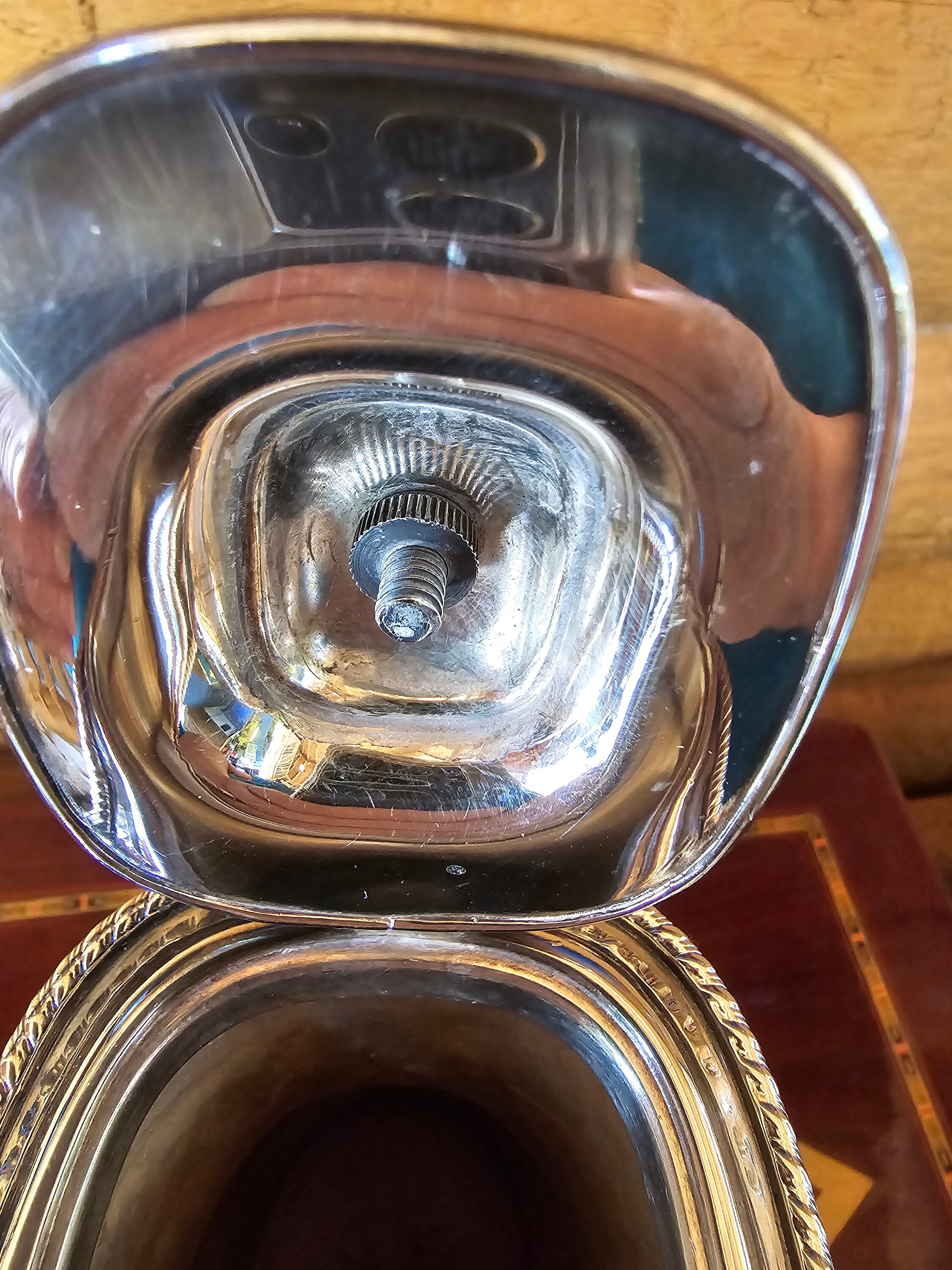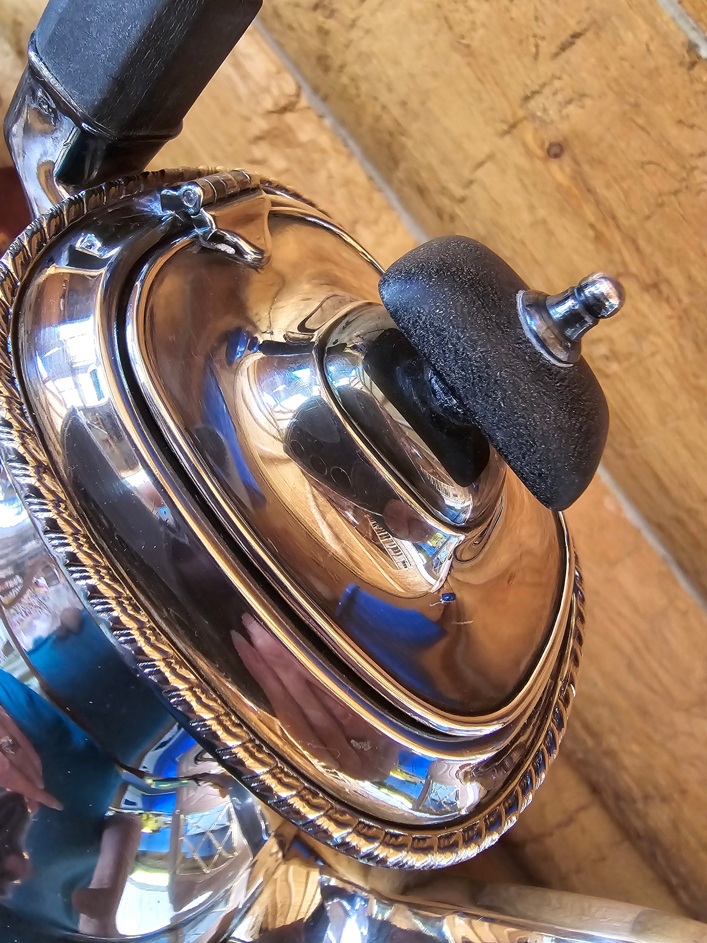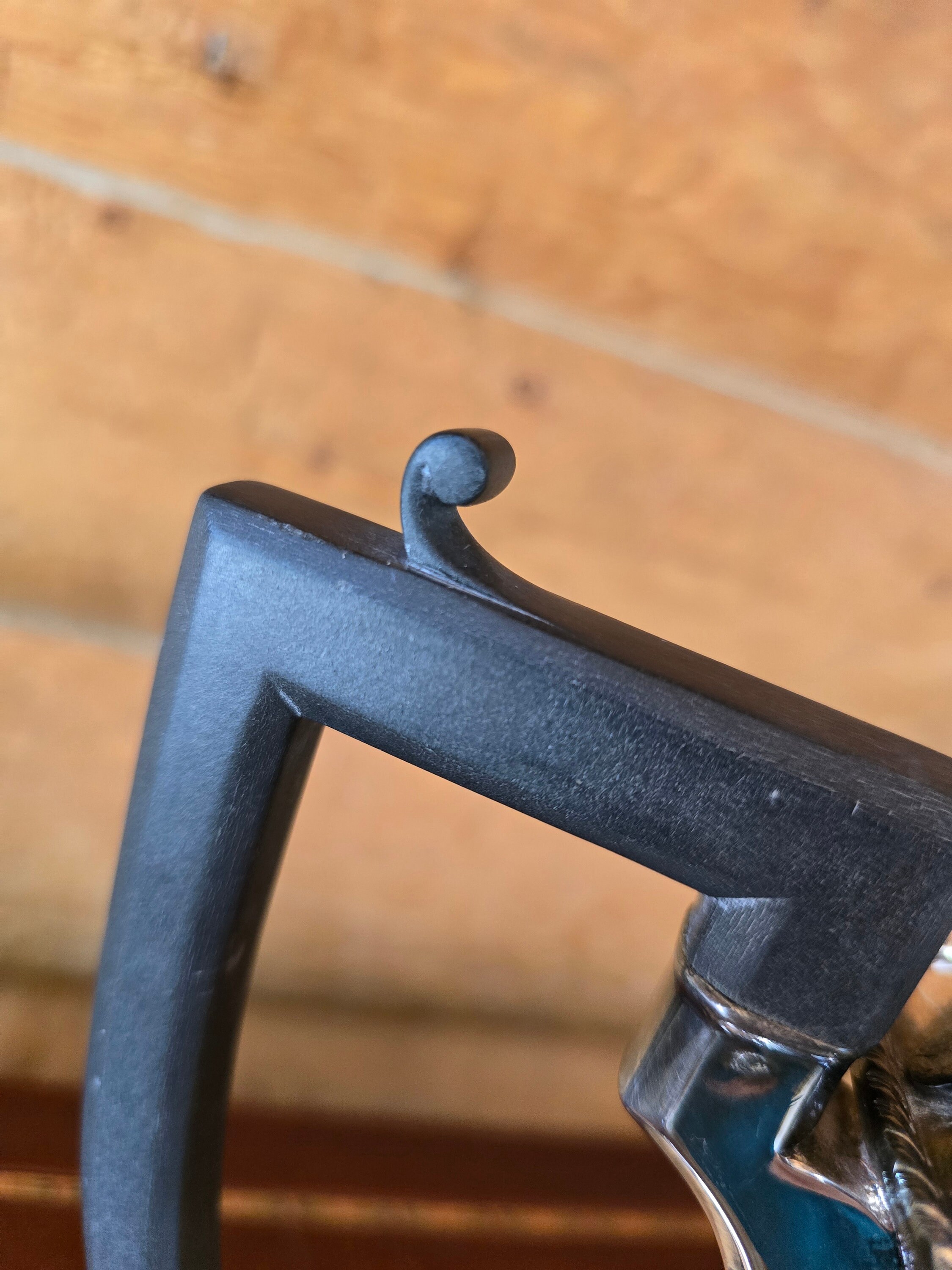 This is quite a rare piece. Beautiful repoussé and chased design accompanied by an Ebonite handle create a striking coffee pot. Stamped with a stag head emblem encircled by "WALLACE MADE IN ENGLAND" with "E.P ON COPPER" and "PLATED IN U.S.A." There is what I believe is a shape or pattern number "E 1710." In my research I found only one other piece with these markings. The metalwork is superb. It is my opinion it was done by Sheffield.