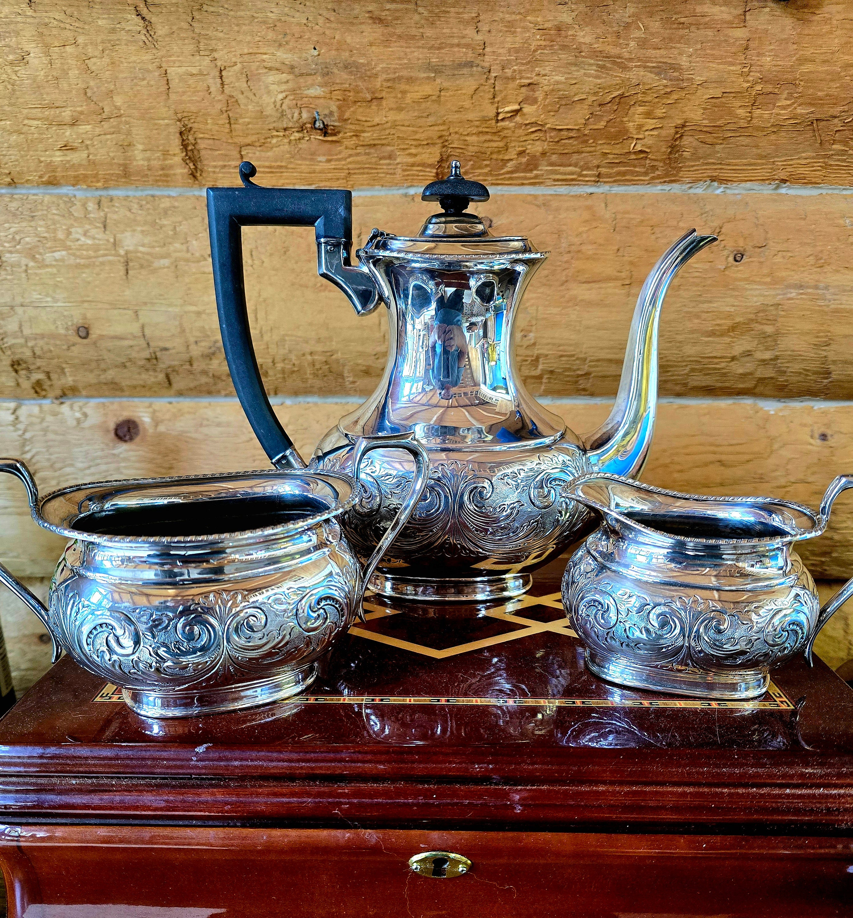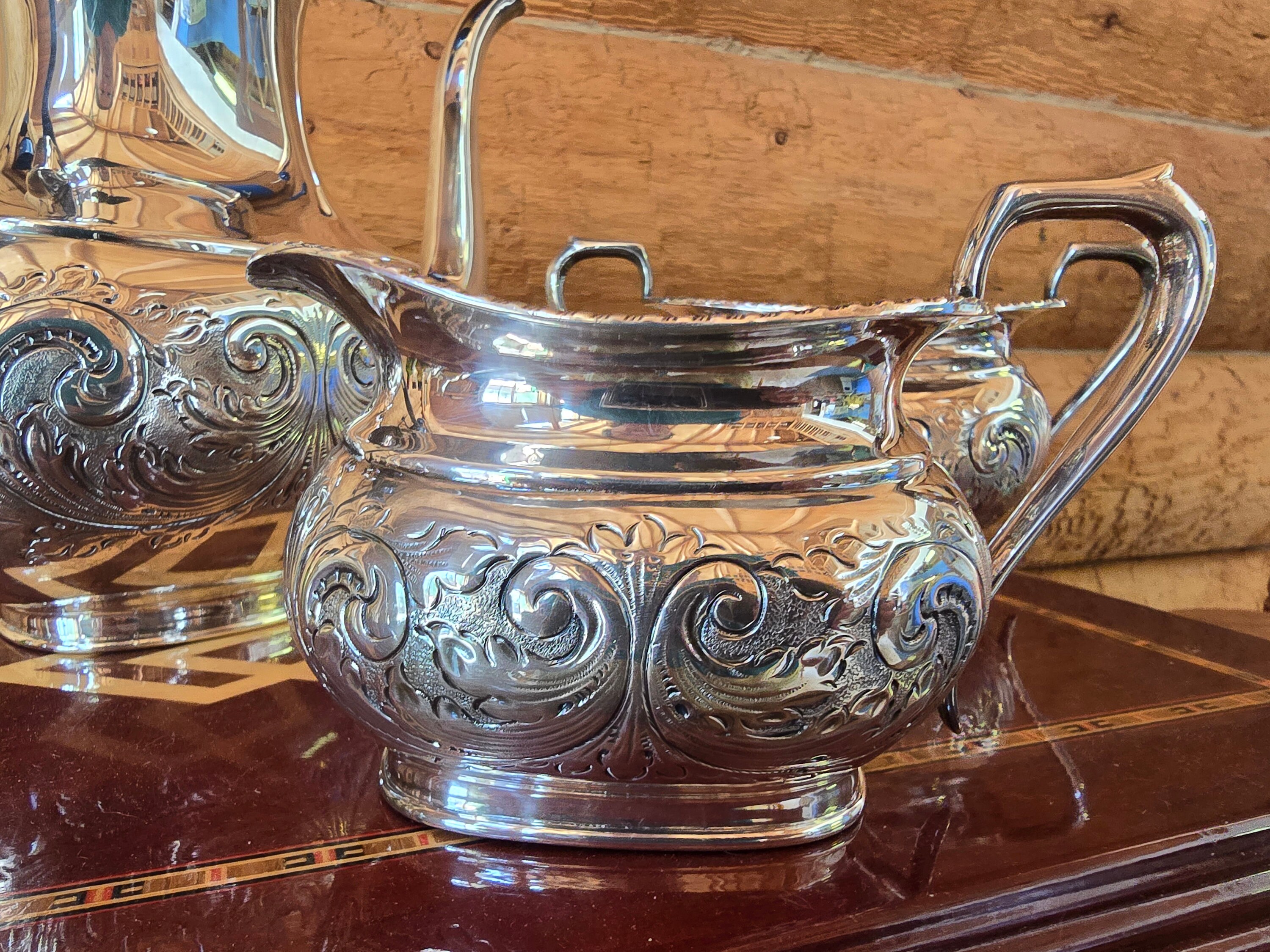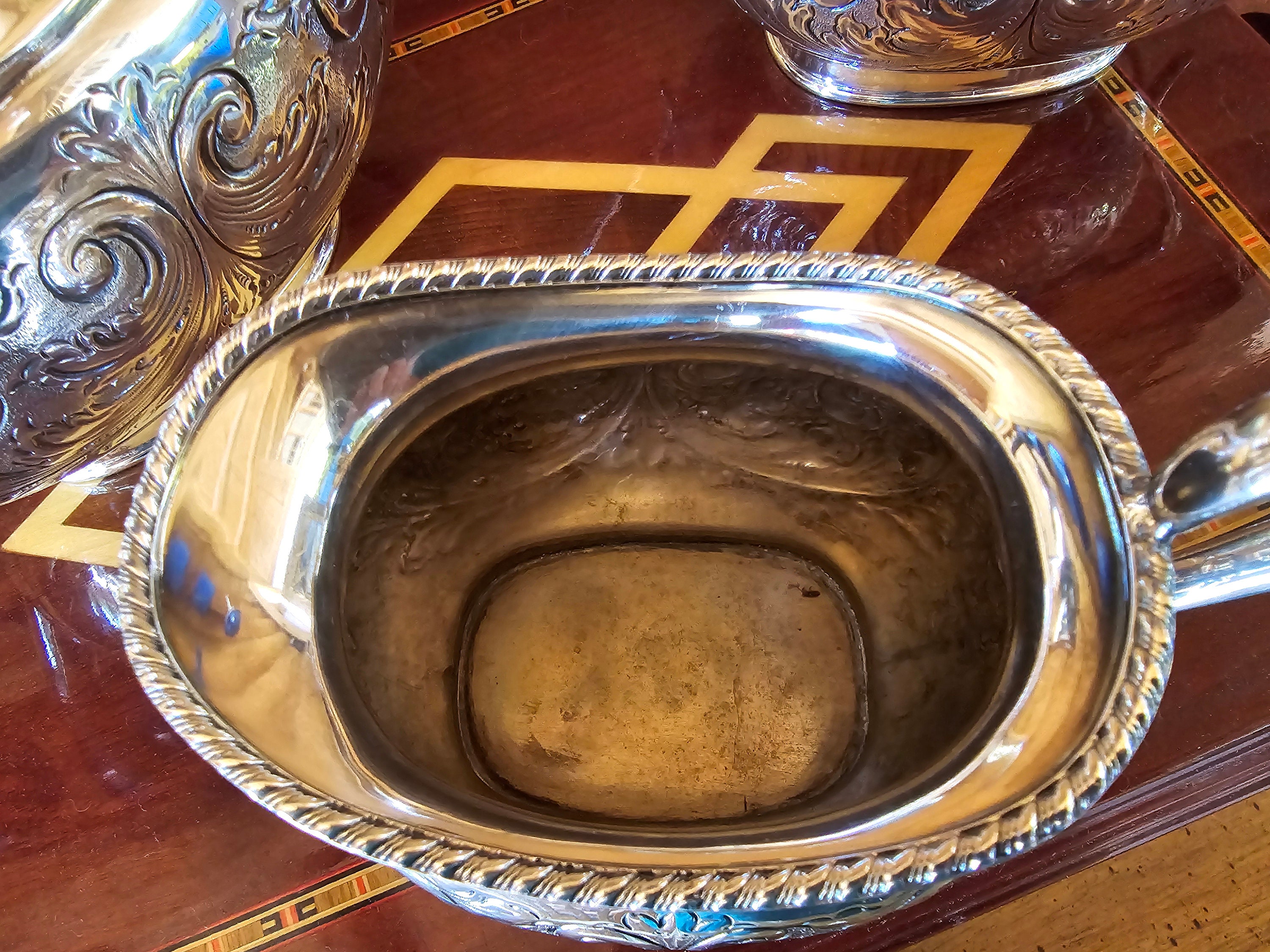 These three pieces were probably part of a 5-piece set. They are in outstanding condition. This collection is made up of the coffee pot, the cream pitcher, and the "waste bowl", which can be used in place of a sugar bowl.