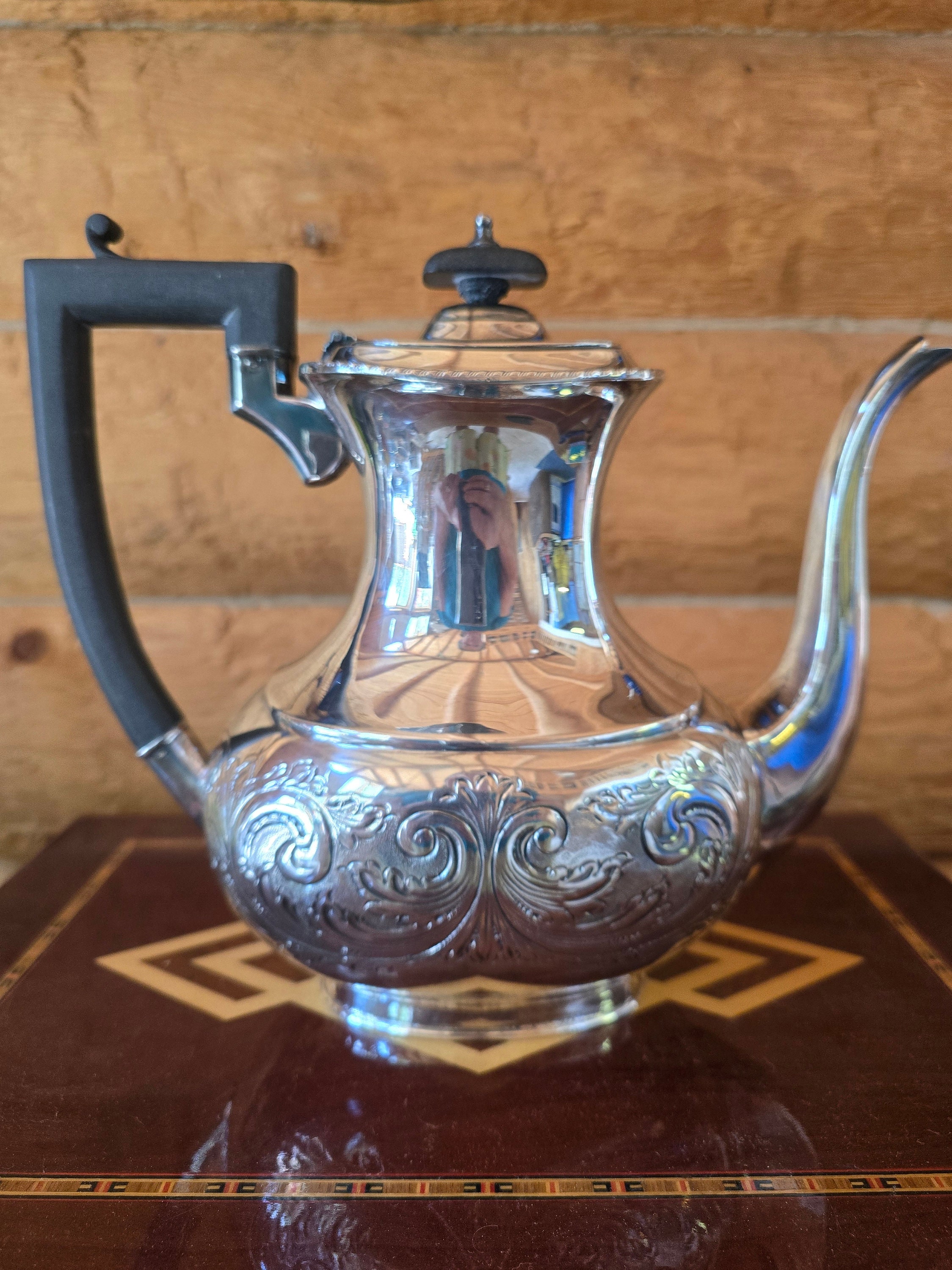 The stag head mark was used by Wallace Brothers until about 1939. The shape of the coffee pot is consistent with some Art Deco designs. Ebonite went out of favor when newer, thermo-plastics were developed prior to WWII.