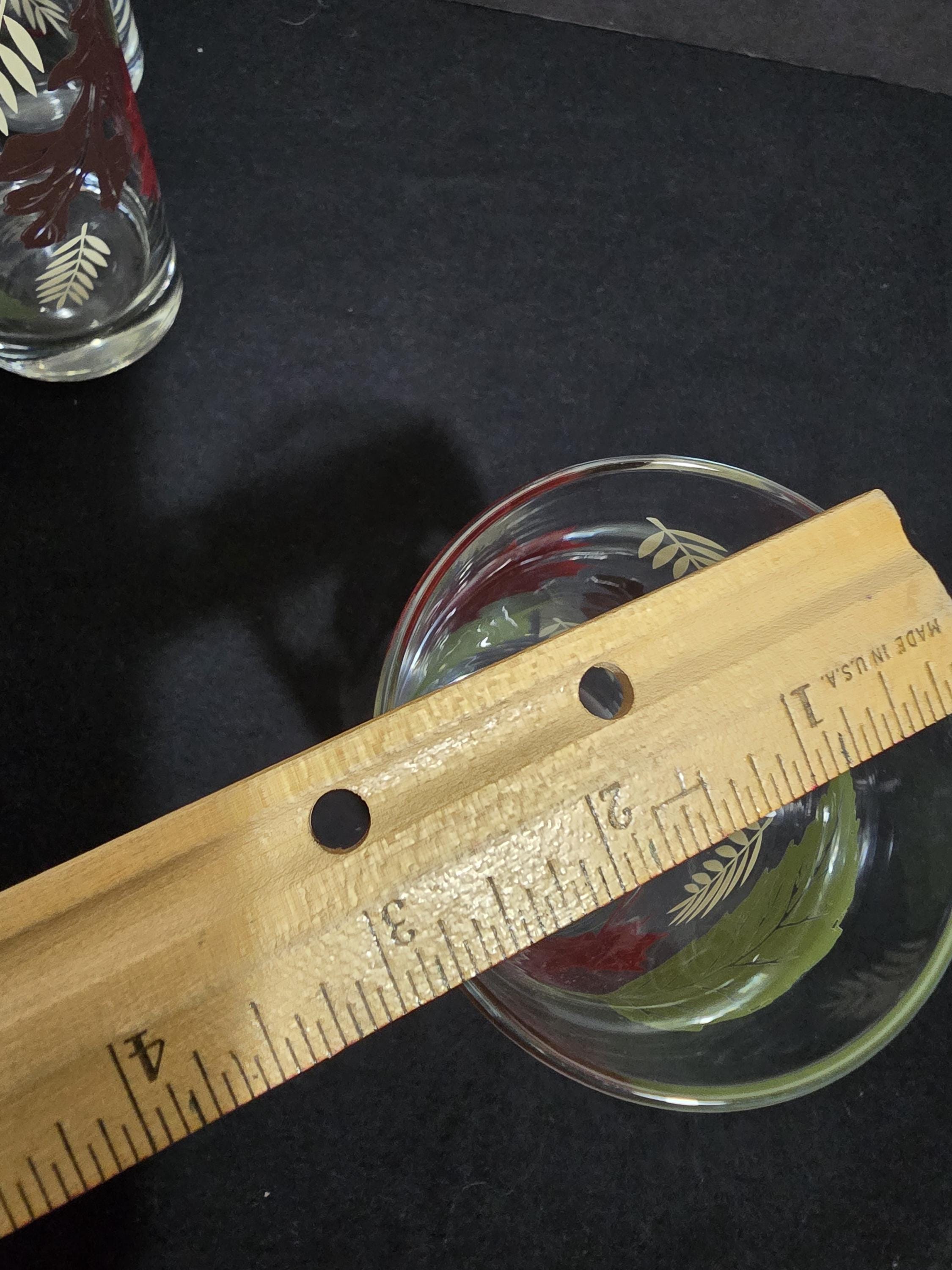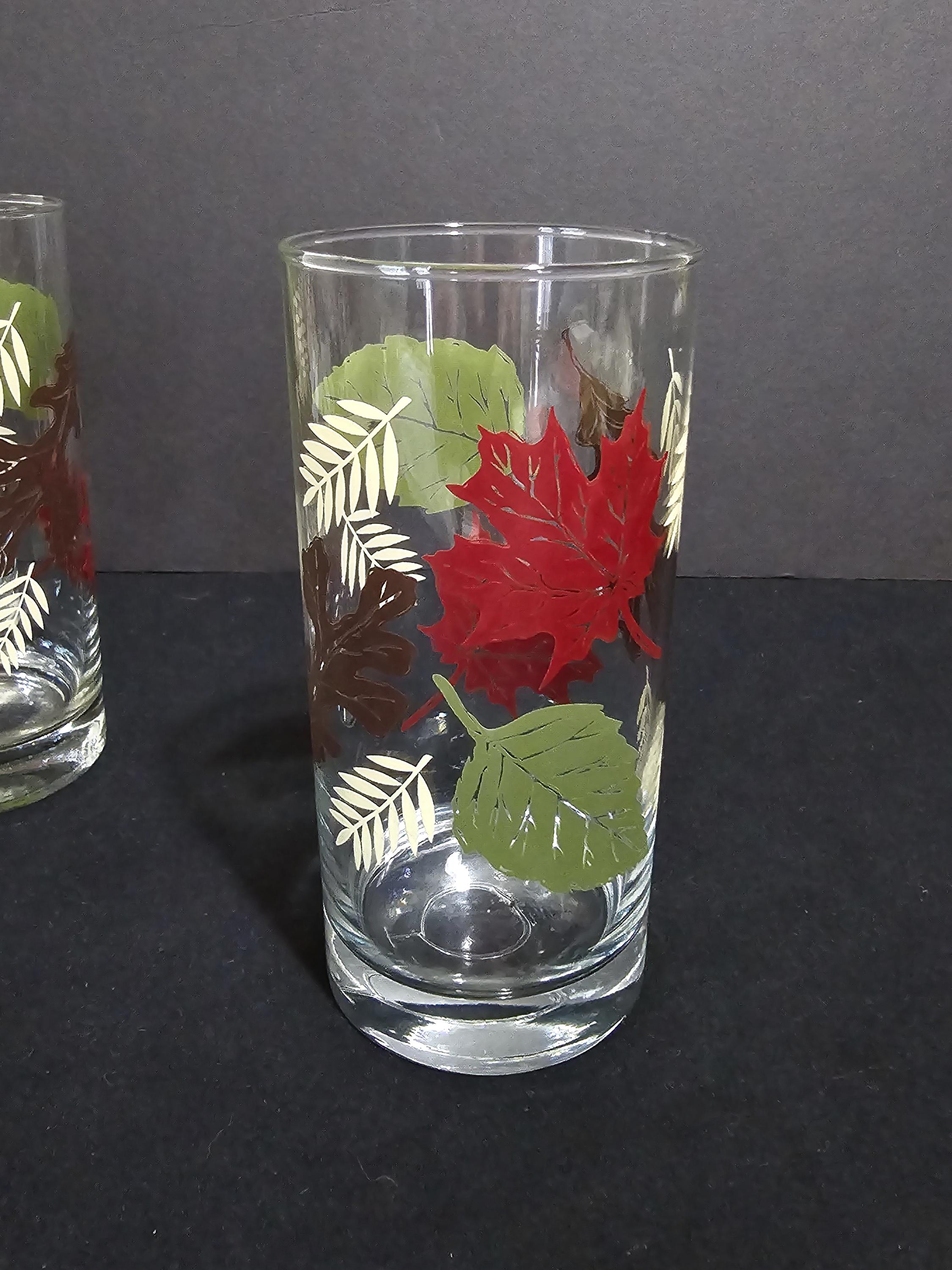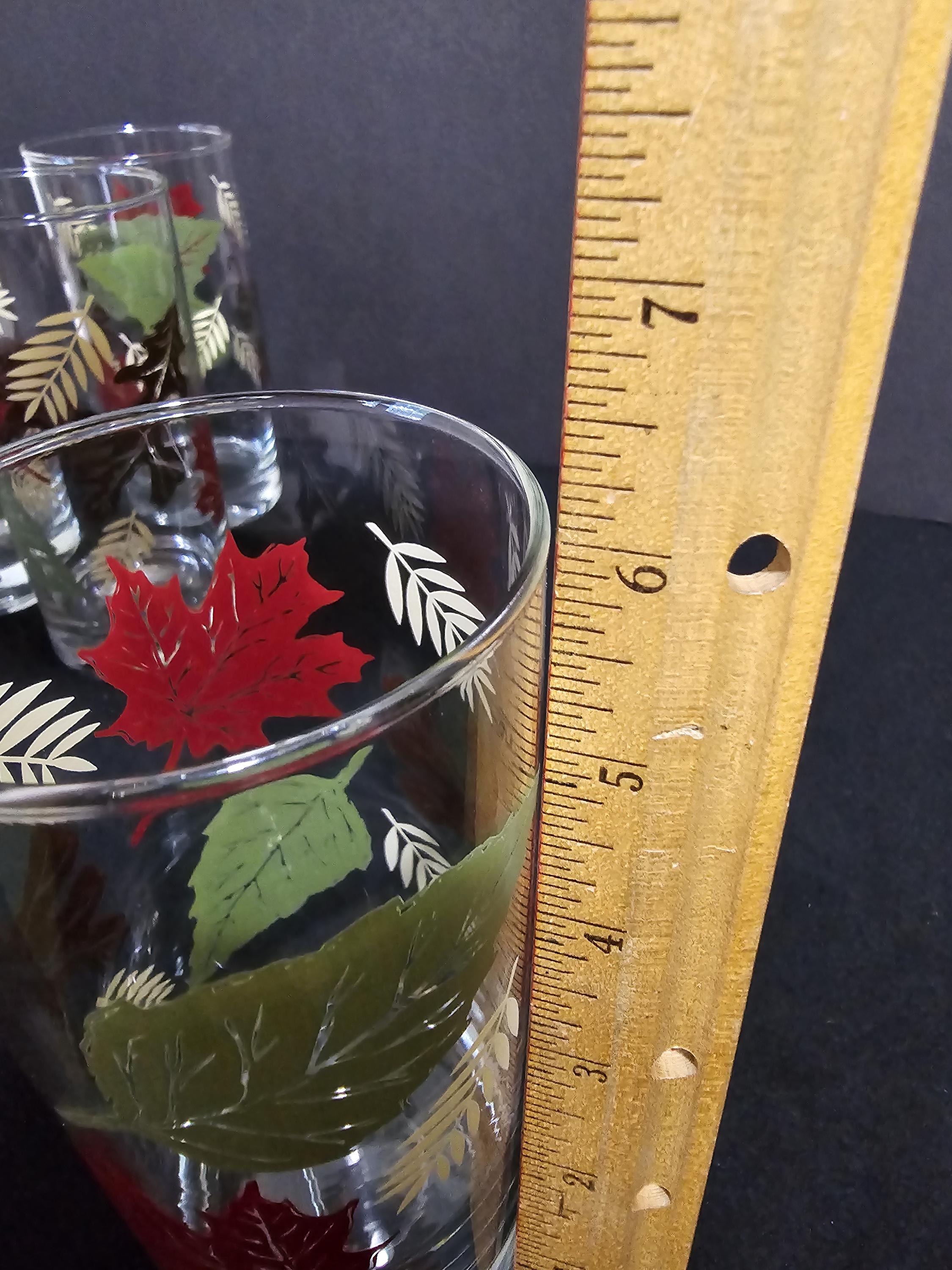 These are often attributed to Libbey Glass Company, but I could not verify that from any reliable source. Doesn't make them any less cute! The autumn leaves pattern is an applied decal on clear, mold-blown glass tumblers. They're just right for iced tea or soda. Fall is my favorite season, so they're pretty special to me!