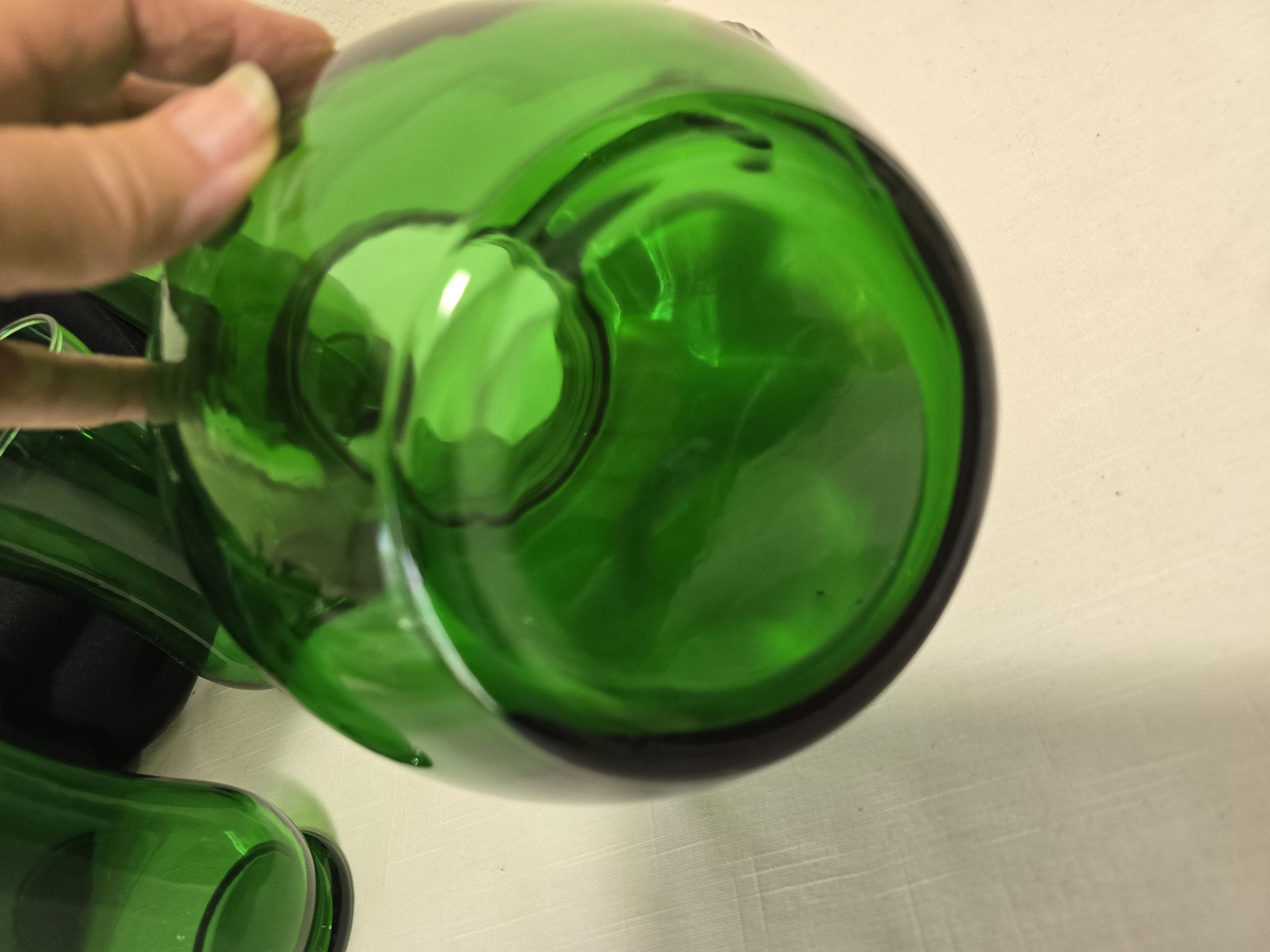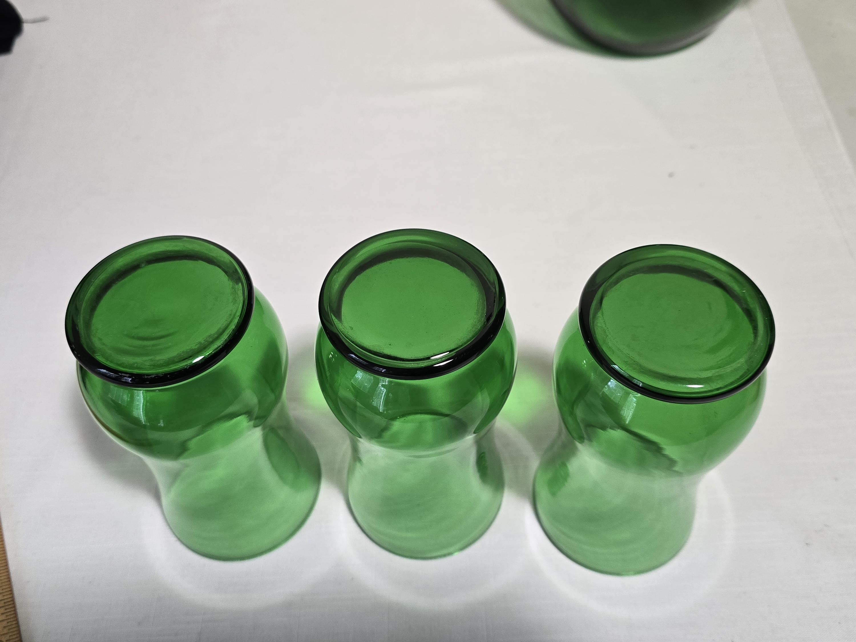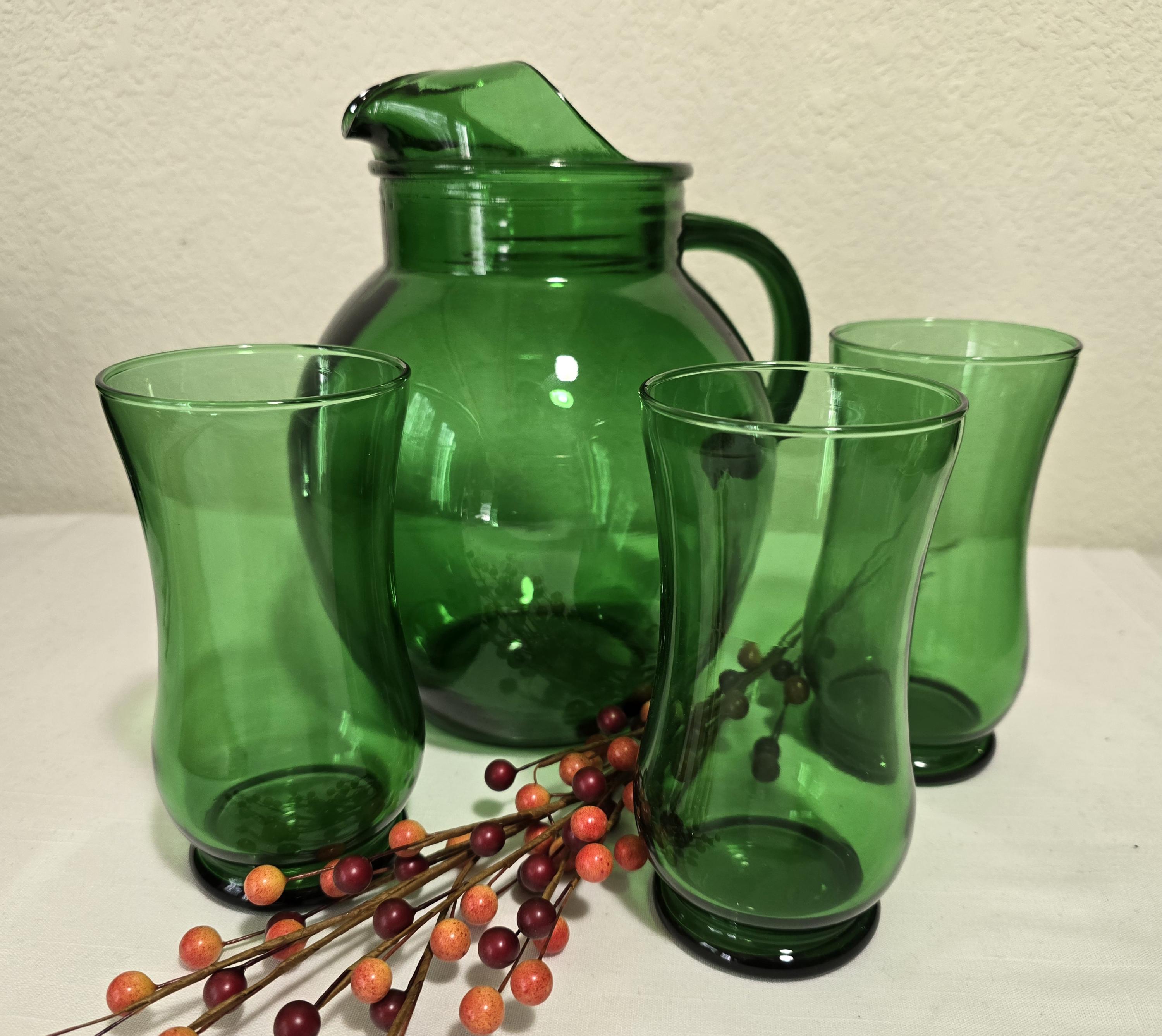 I love this pitcher! It looks like a giant, green Christmas light to me. While this pattern is identified by Replacements, Ltd., as simply "Forest Green," Anchor-Hocking calls this shape "roly-poly". There are three matching 15-ounce flat tumblers with the "bulbous" shape. The whole set is in excellent vintage condition.