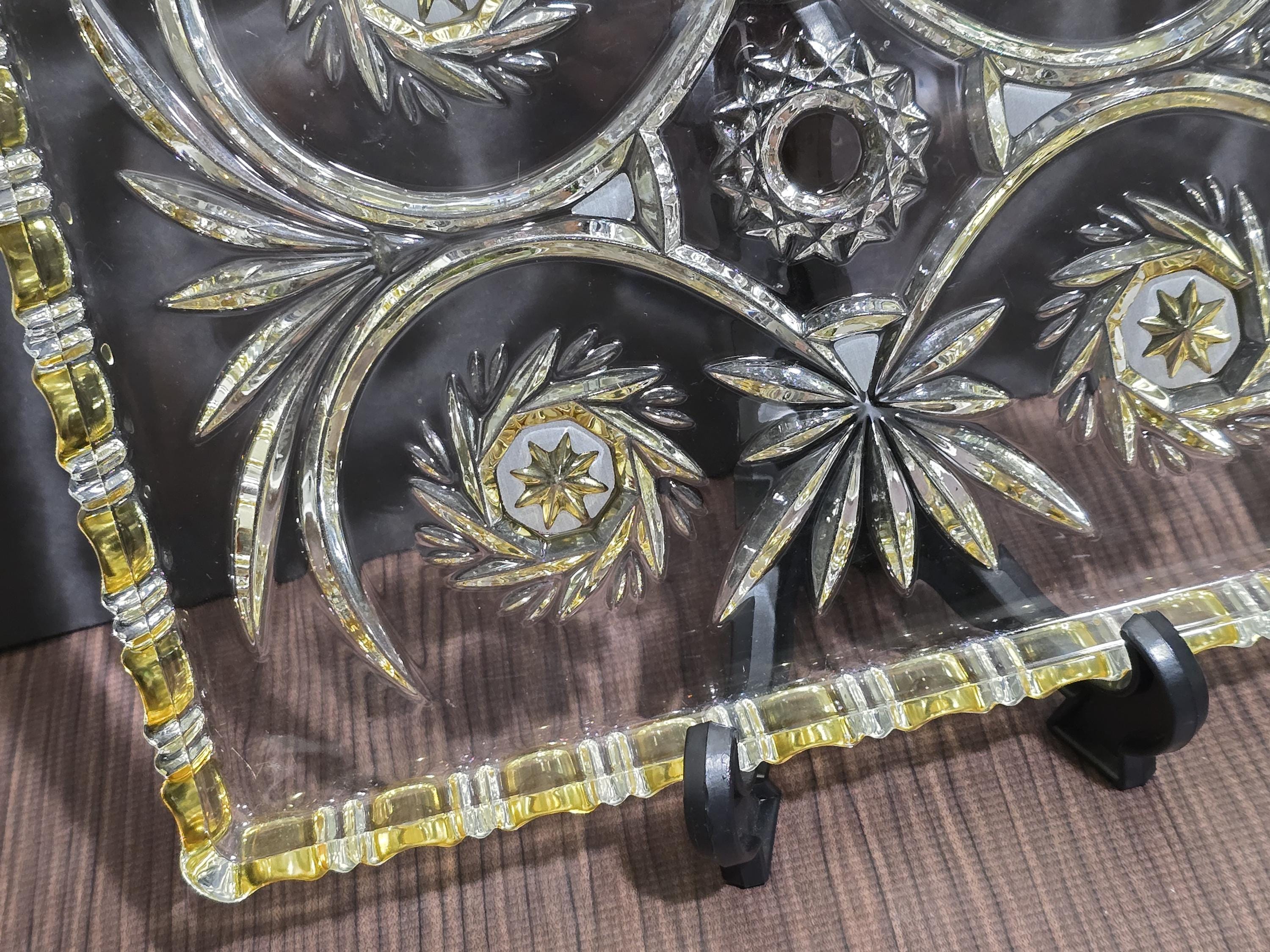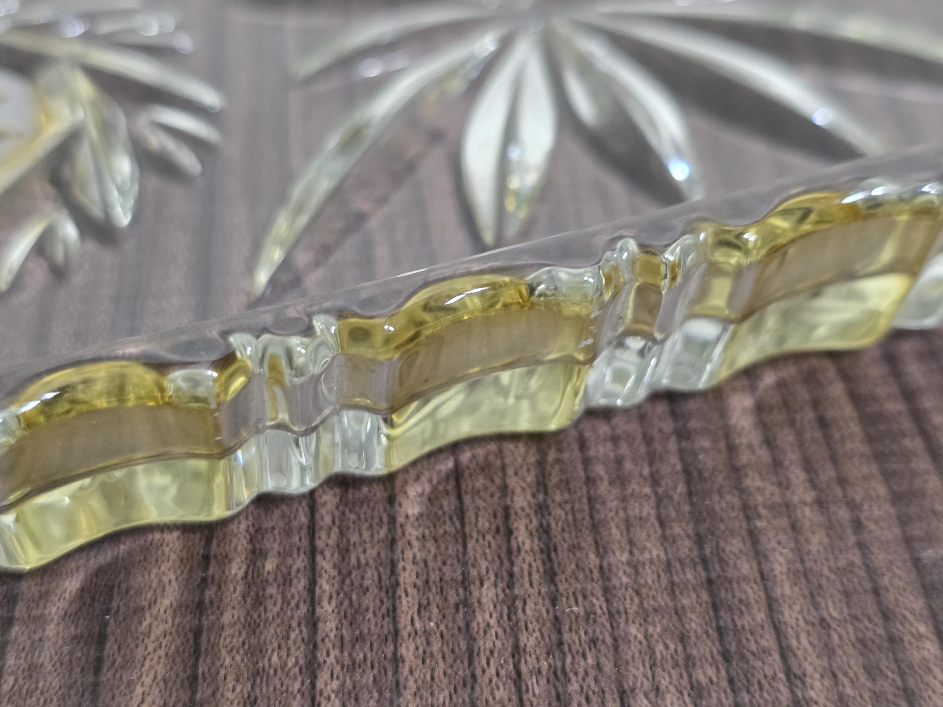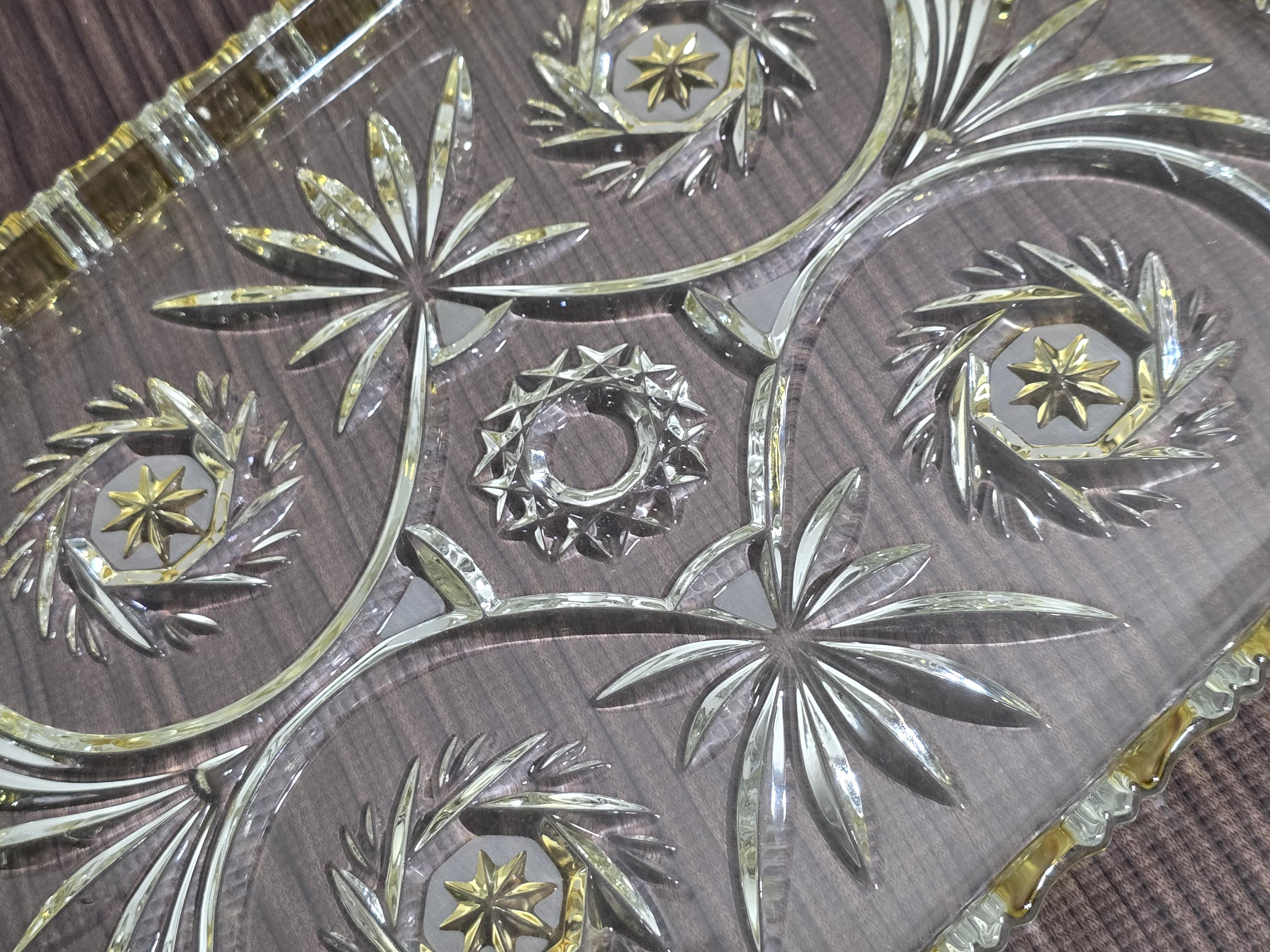 Lovely vintage glass tray by Walther Glass of Germany. The cut glass look is enhanced by small touches of color among the designs and along the edge.