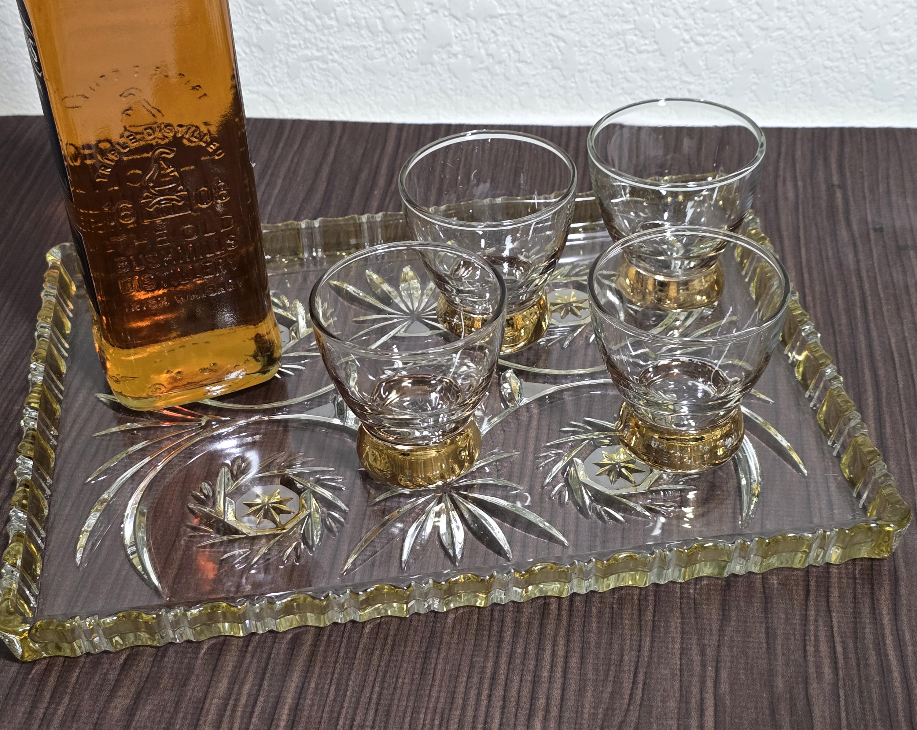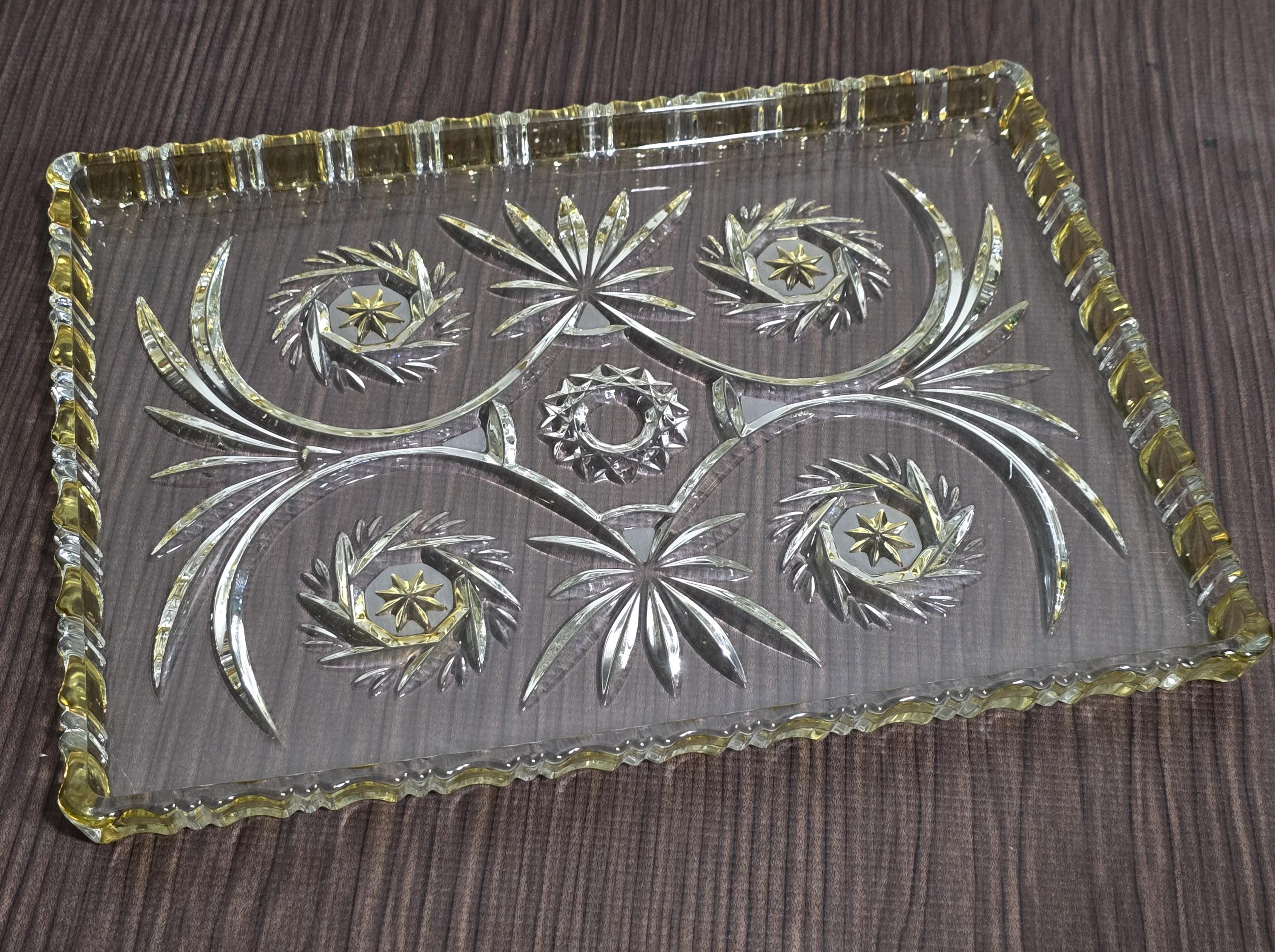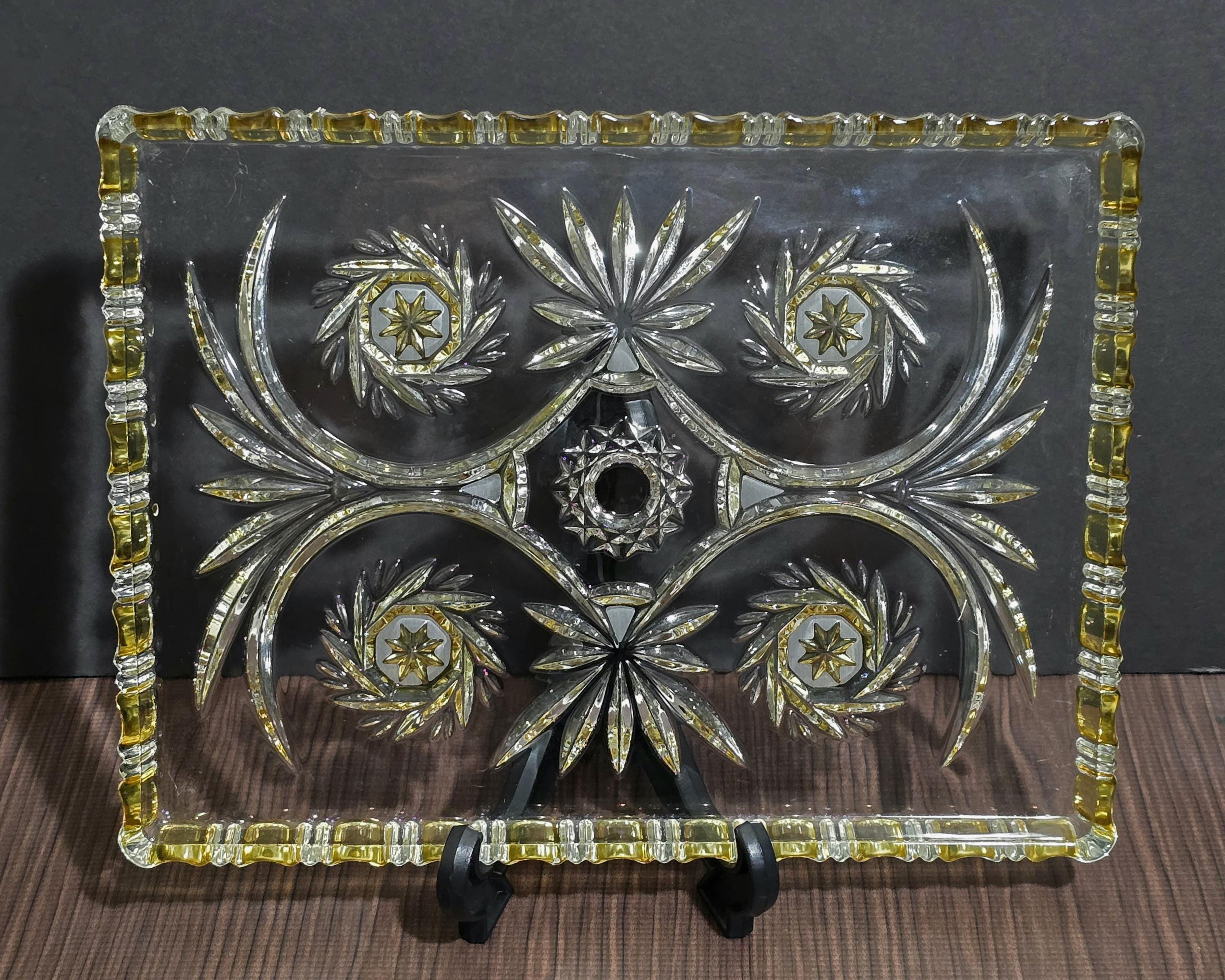 Lovely vintage glass tray by Walther Glass of Germany. The cut glass look is enhanced by small touches of color among the designs and along the edge.