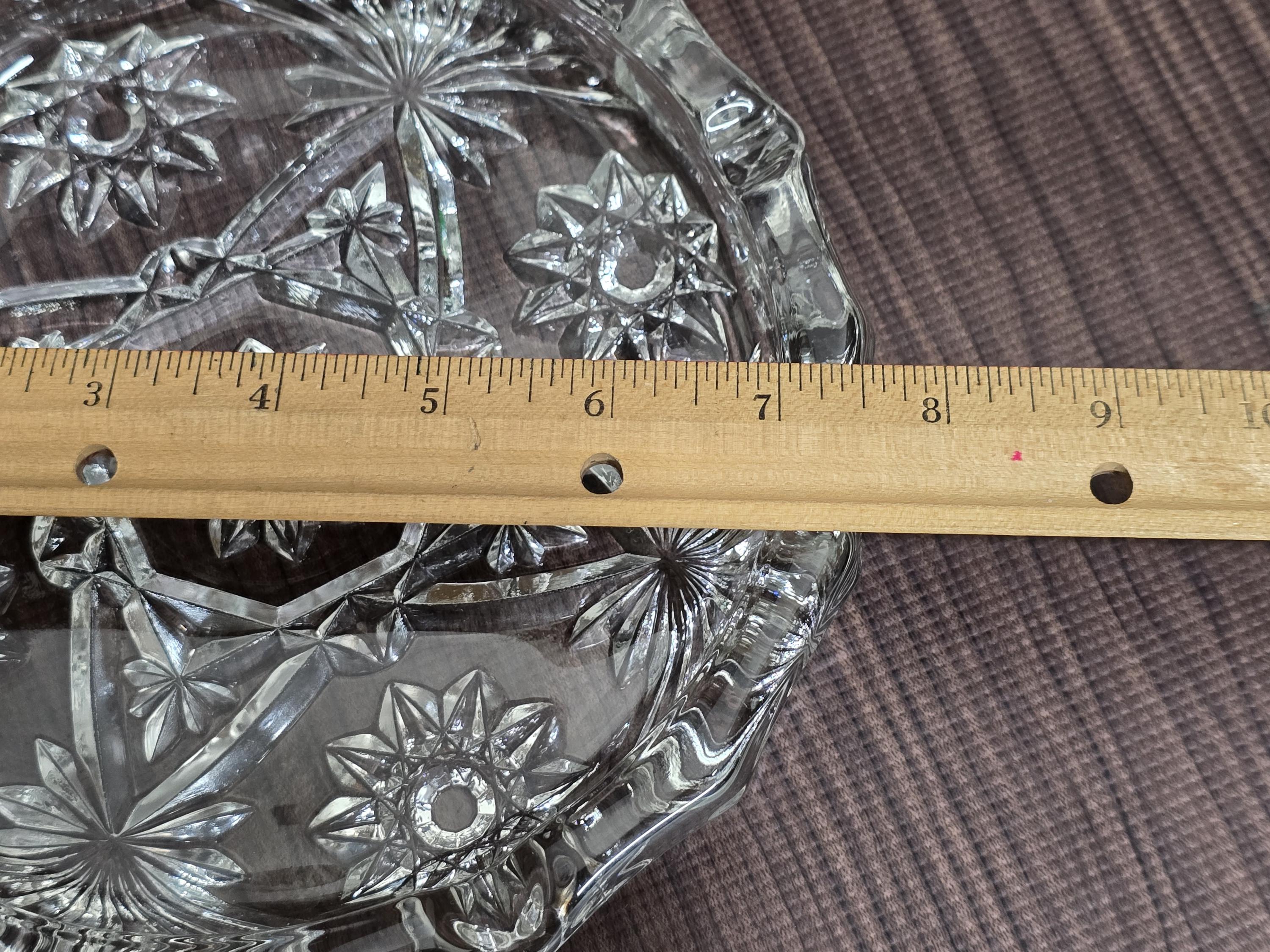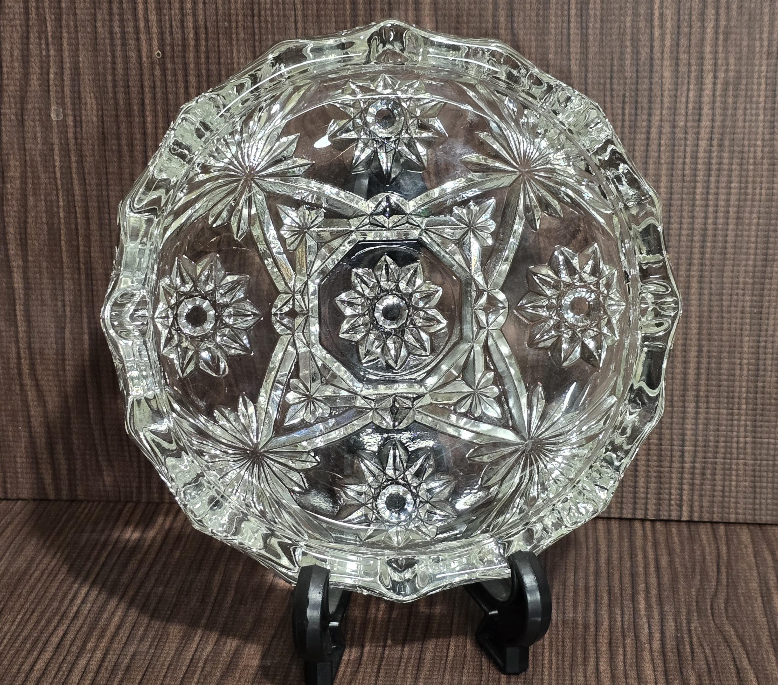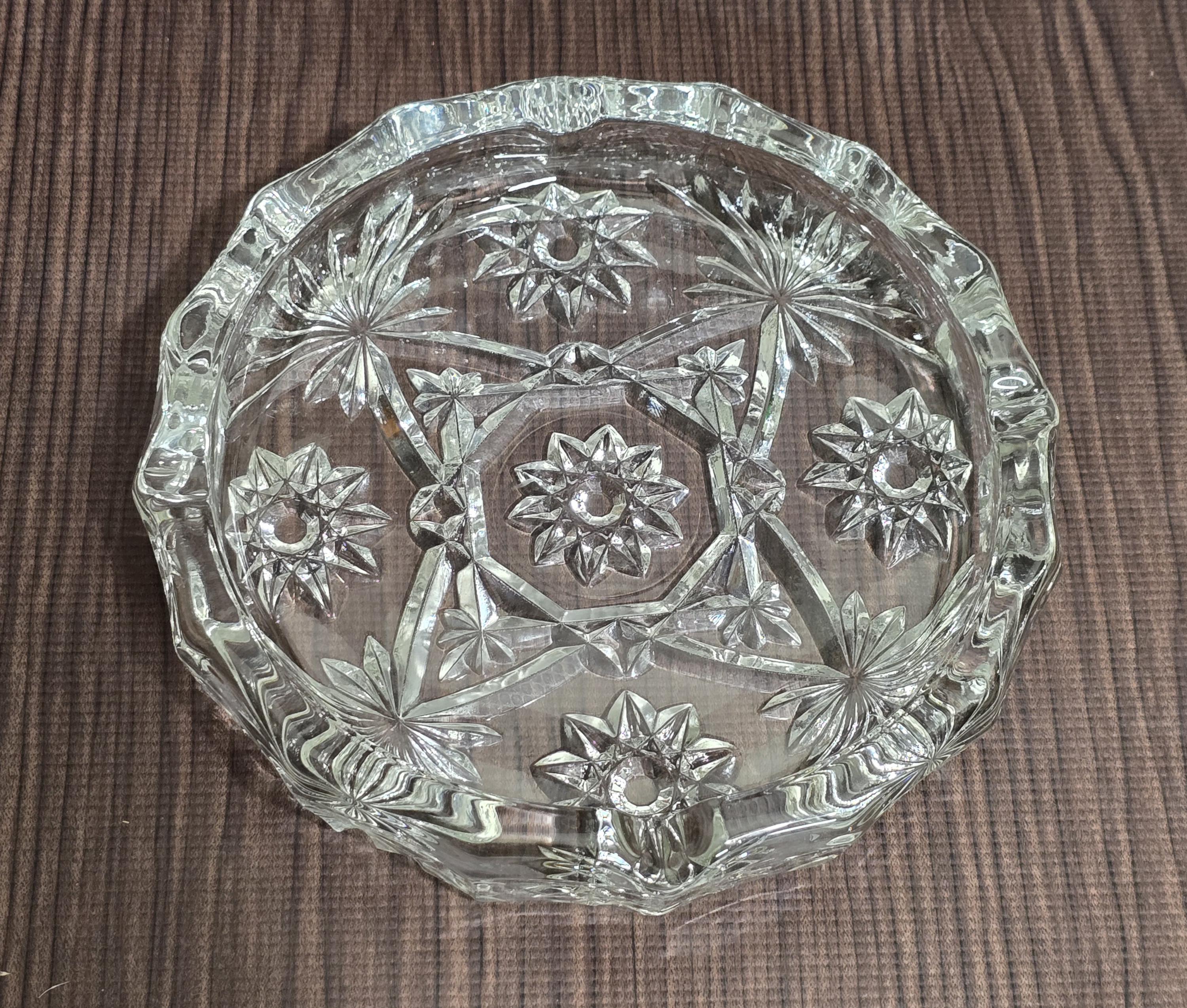 Elegant look for your smoking room. This is an unbranded piece but judging from the estate from which it was acquired, I think it is from the 1980s or '90s. There are four wide slots around the scalloped edge. It is nice and weighty. The patterns in the glass are molded in classic cut-glass styles, including reeds and starbursts.