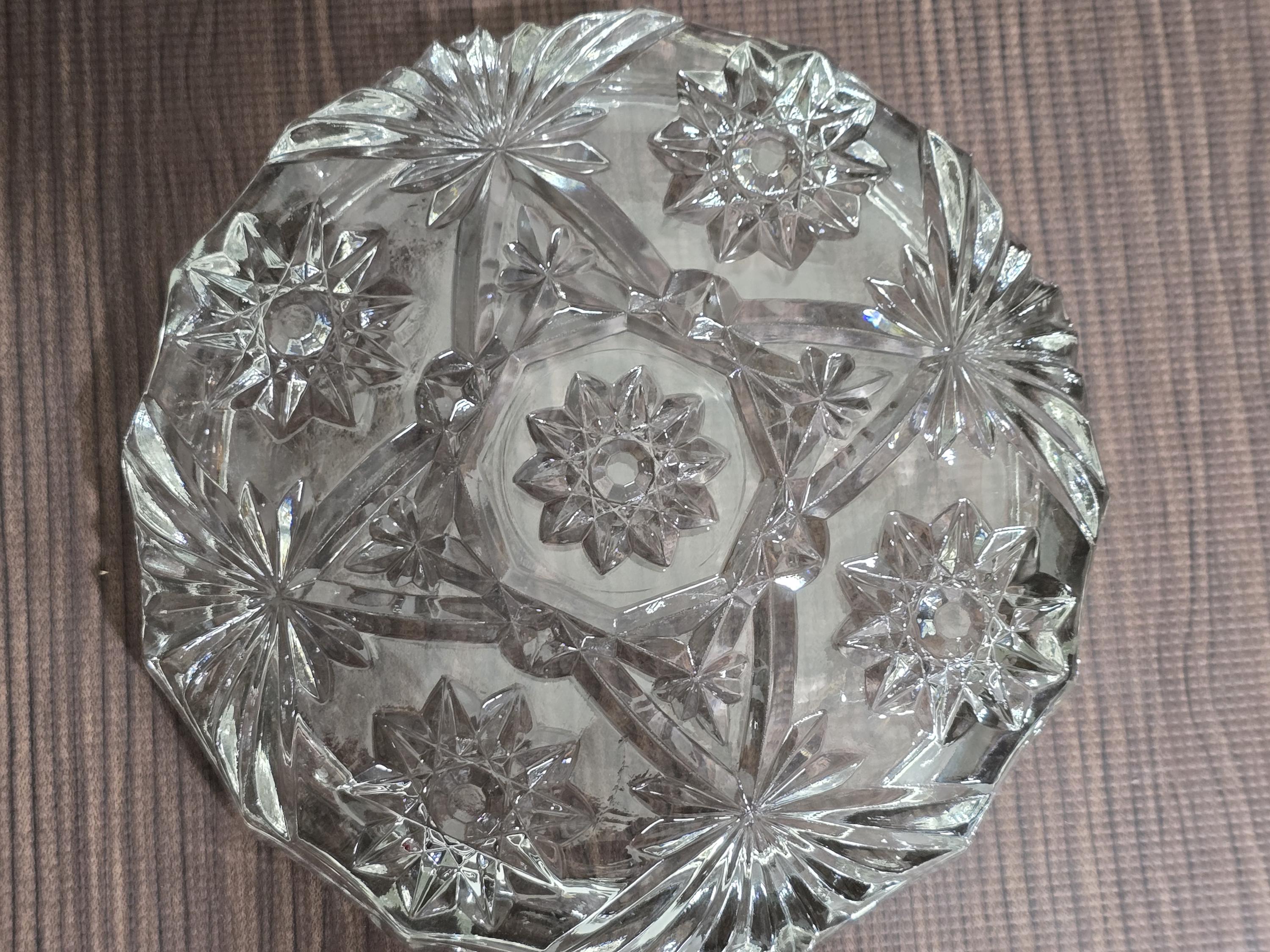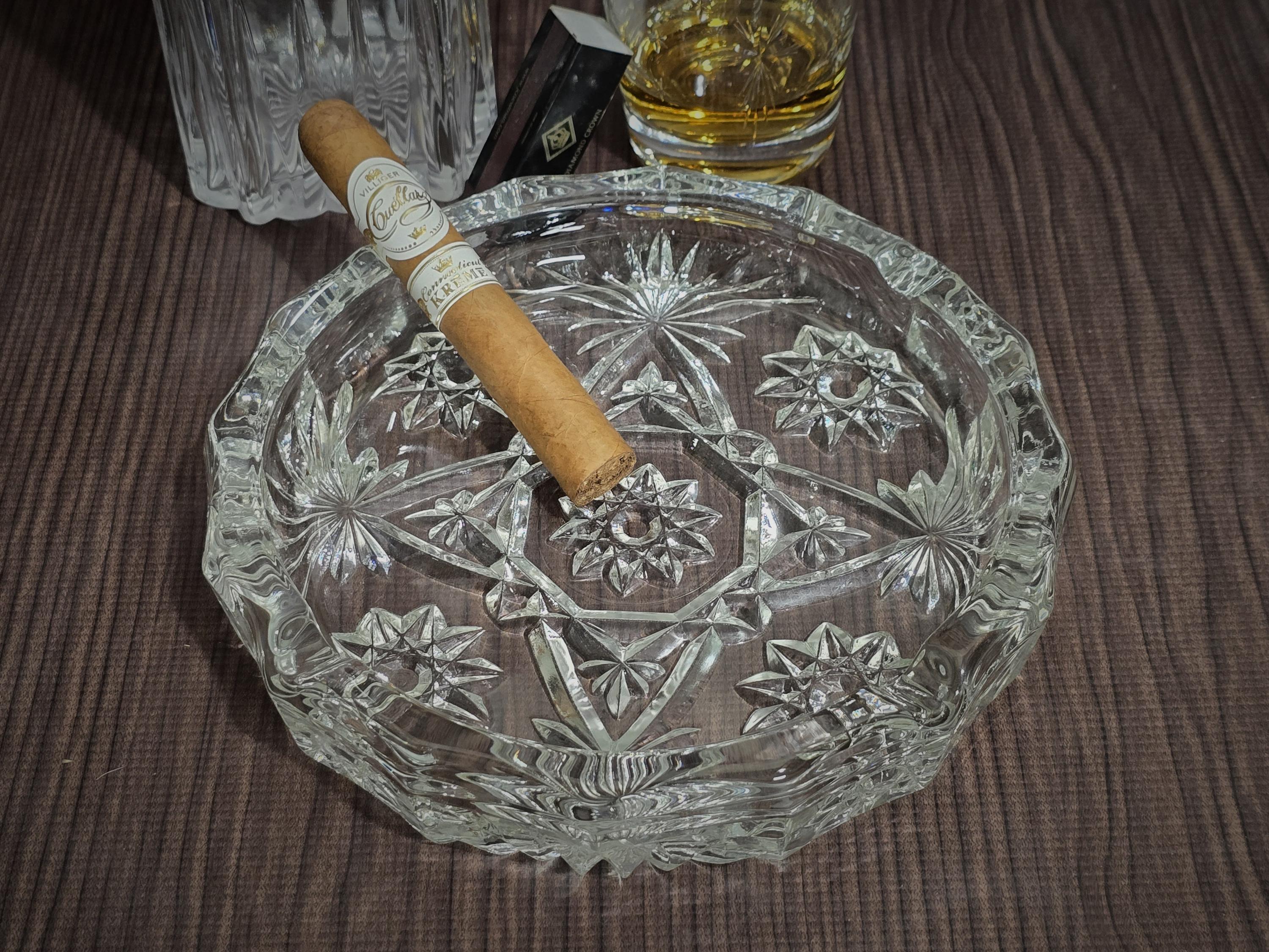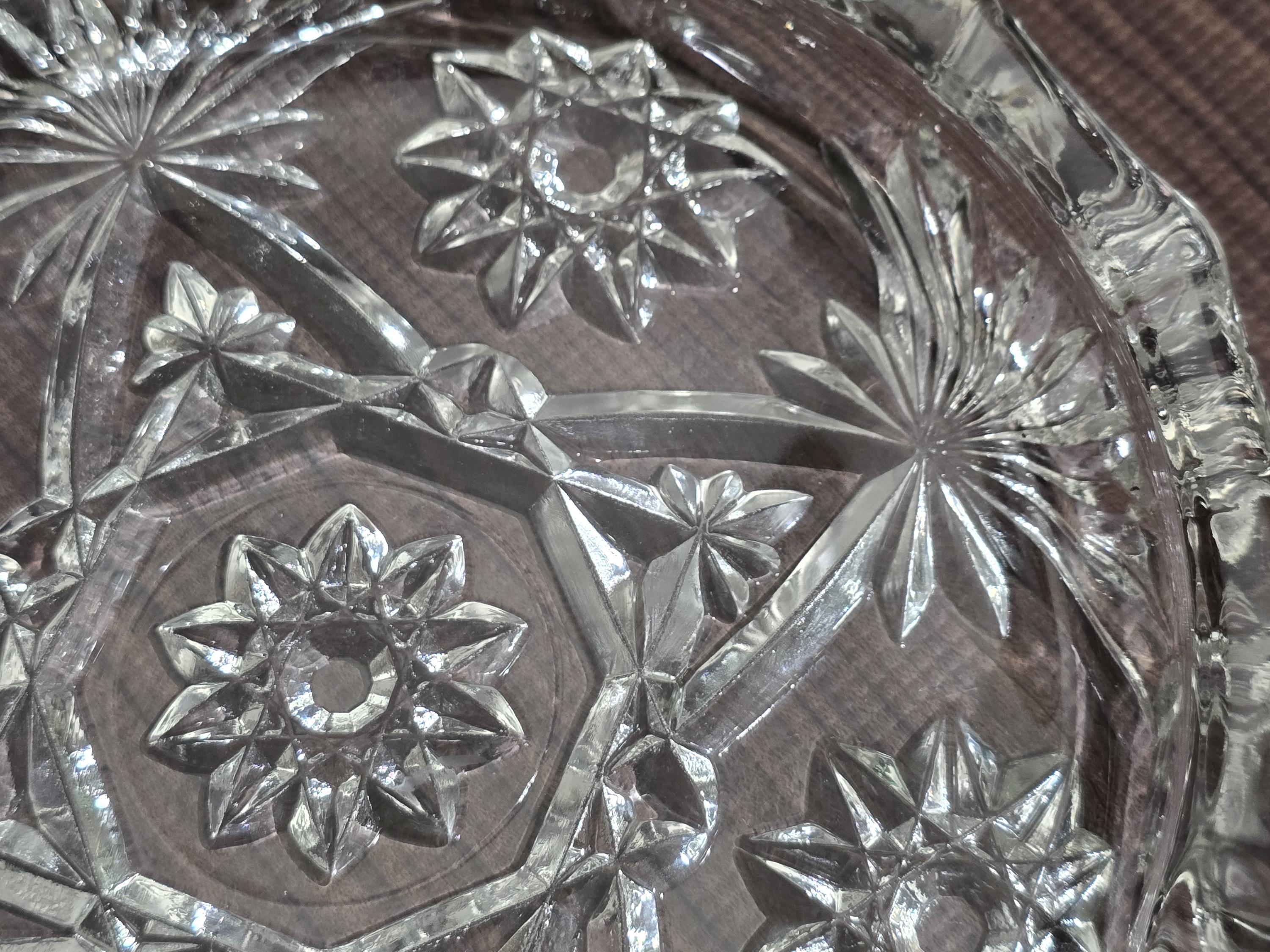 Elegant look for your smoking room. This is an unbranded piece but judging from the estate from which it was acquired, I think it is from the 1980s or '90s. There are four wide slots around the scalloped edge. It is nice and weighty. The patterns in the glass are molded in classic cut-glass styles, including reeds and starbursts.