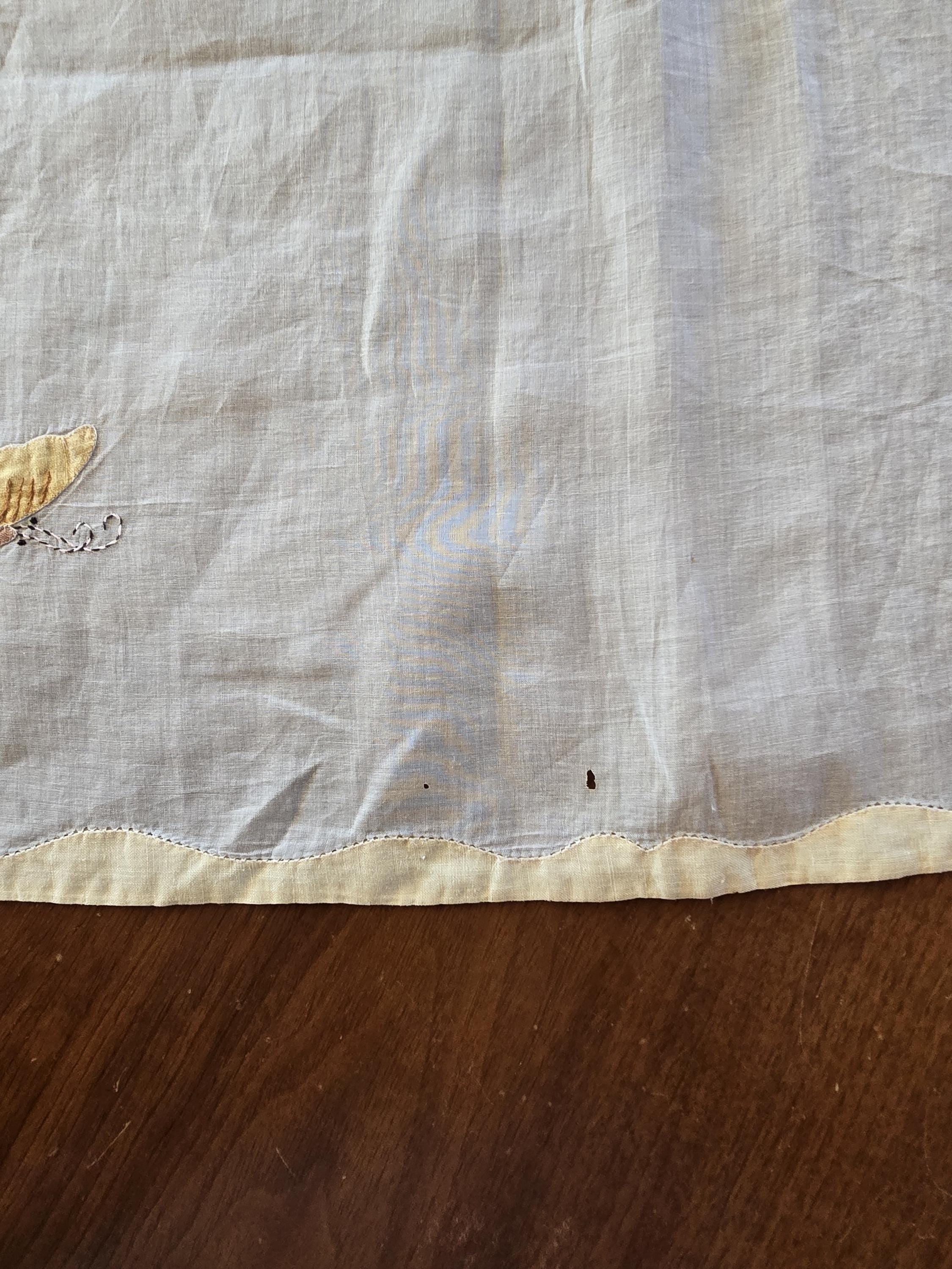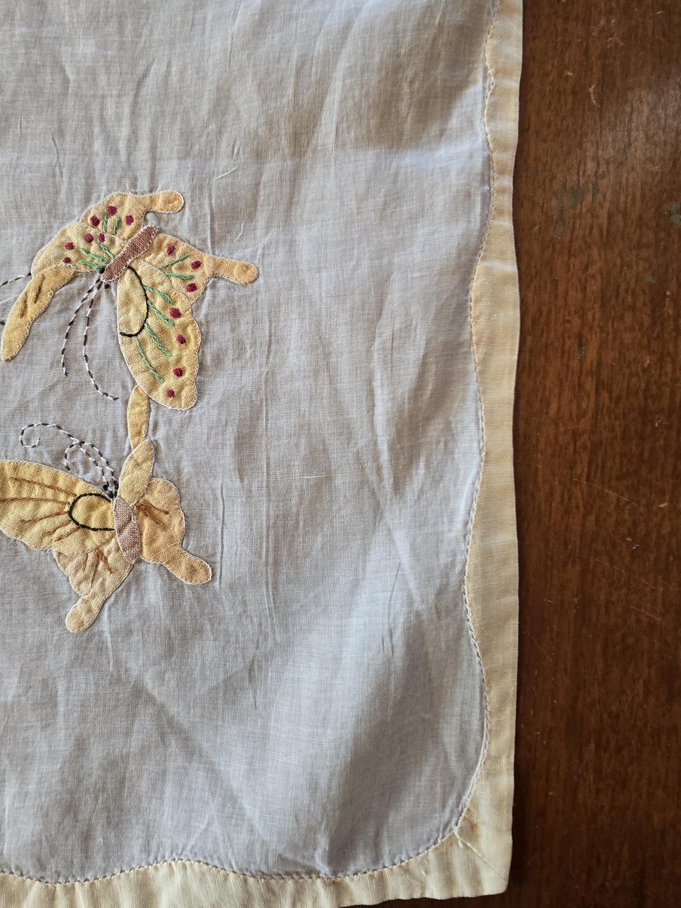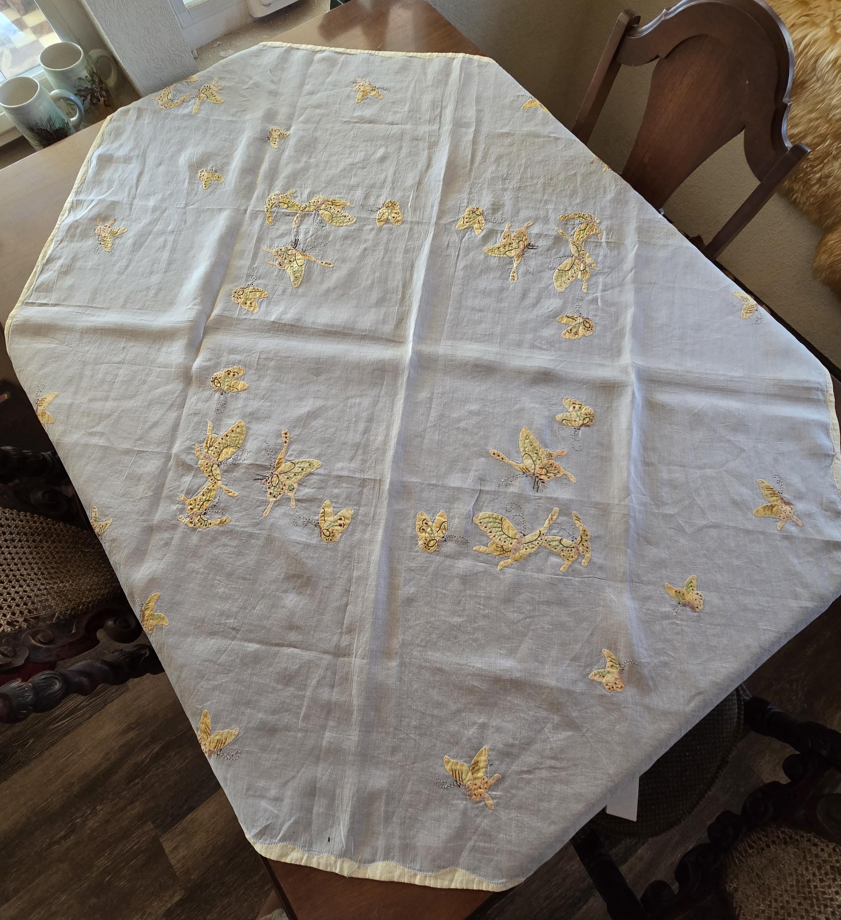 Butterfly lovers, this is the tablecloth for you! There are 48 hand-sewn butterfly appliques on this cloth! Each one is delicately embellished with antenna, eyes, and wing decorations. The skill is unmistakable. The base fabric is a soft cotton voile. The edges are finished with a scalloped strip of slightly heavier yellow cotton.