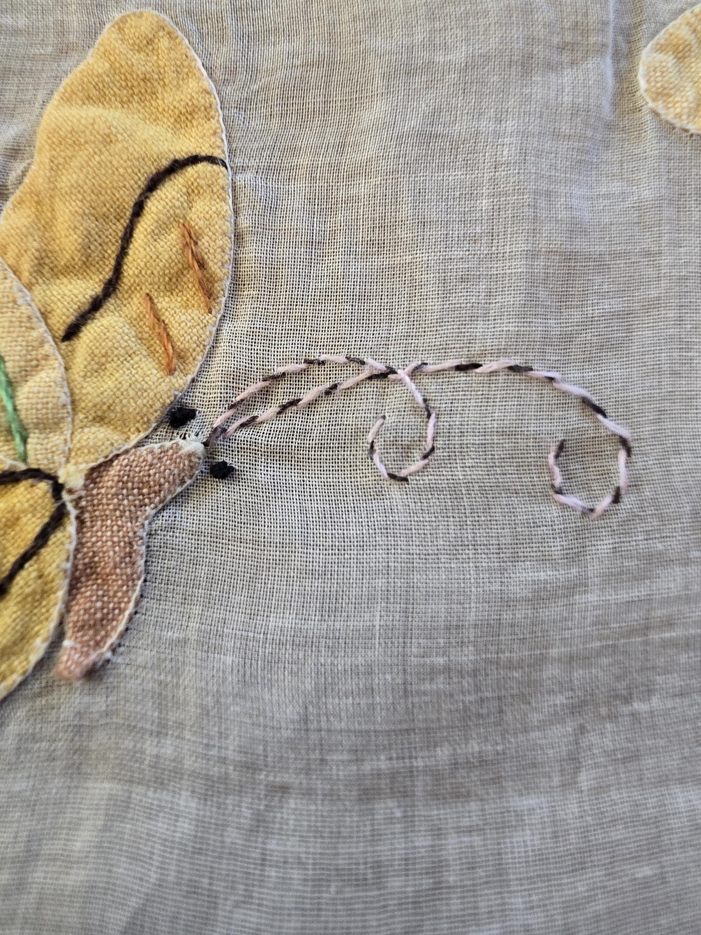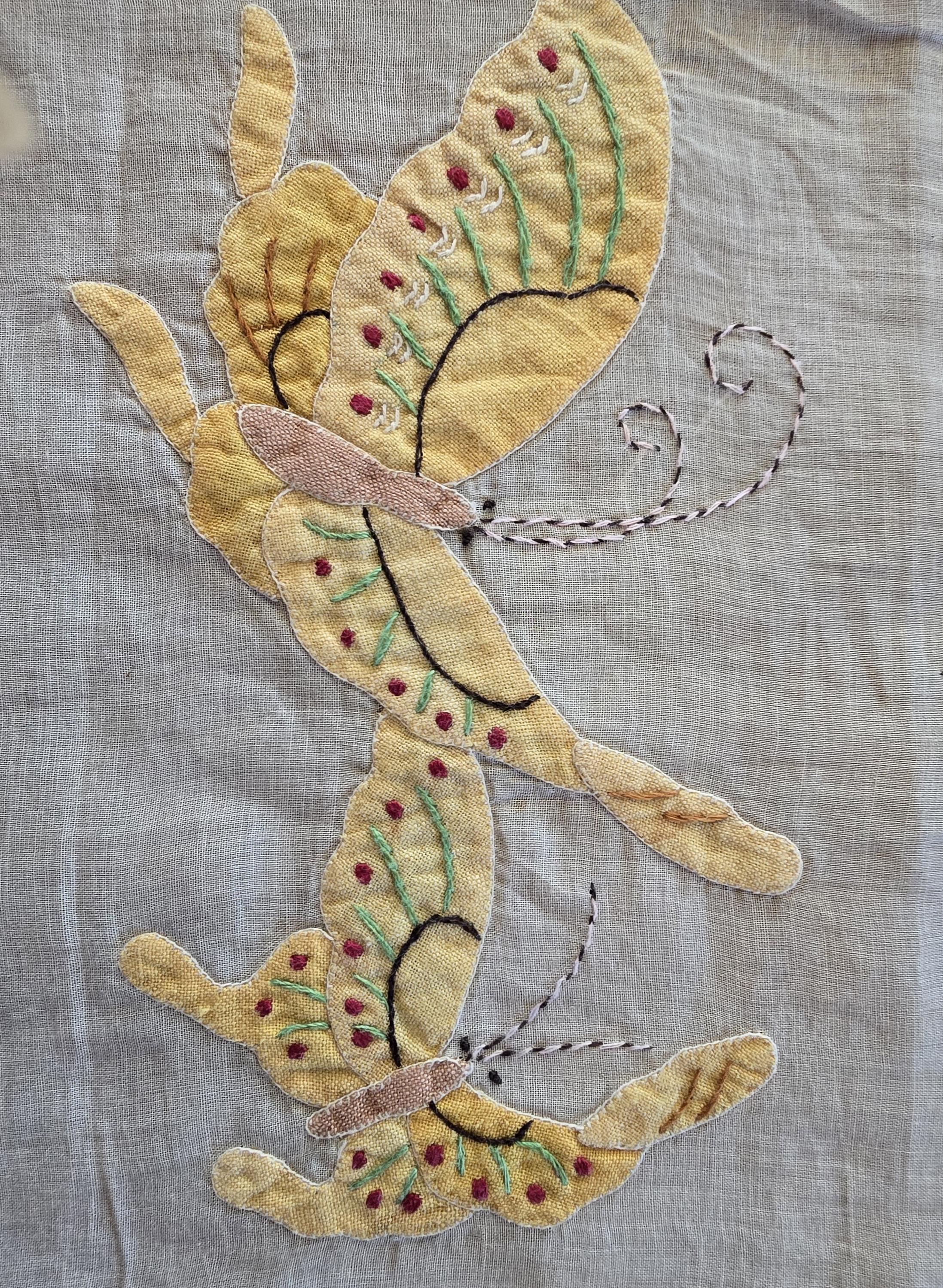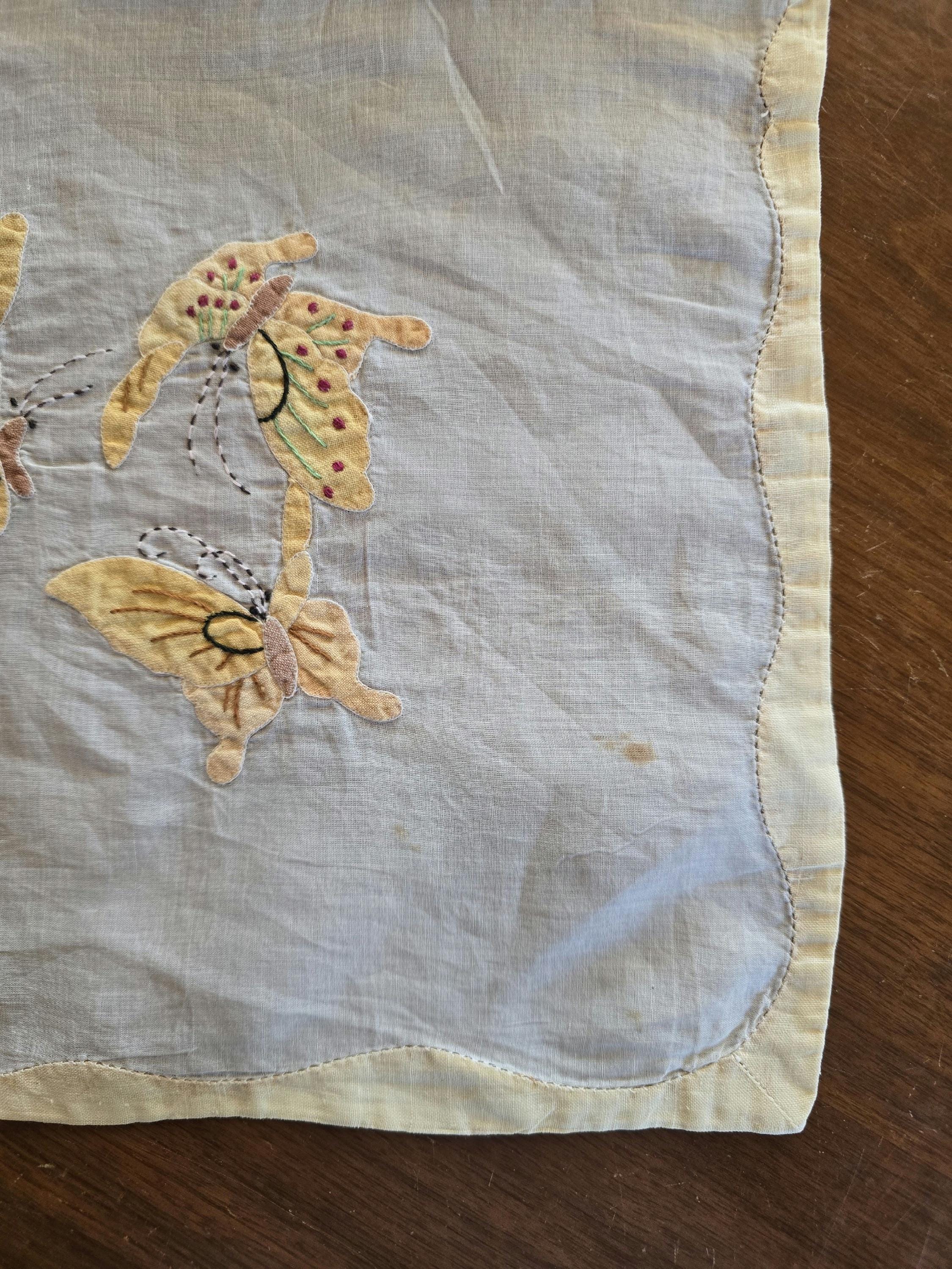 Butterfly lovers, this is the tablecloth for you! There are 48 hand-sewn butterfly appliques on this cloth! Each one is delicately embellished with antenna, eyes, and wing decorations. The skill is unmistakable. The base fabric is a soft cotton voile. The edges are finished with a scalloped strip of slightly heavier yellow cotton.