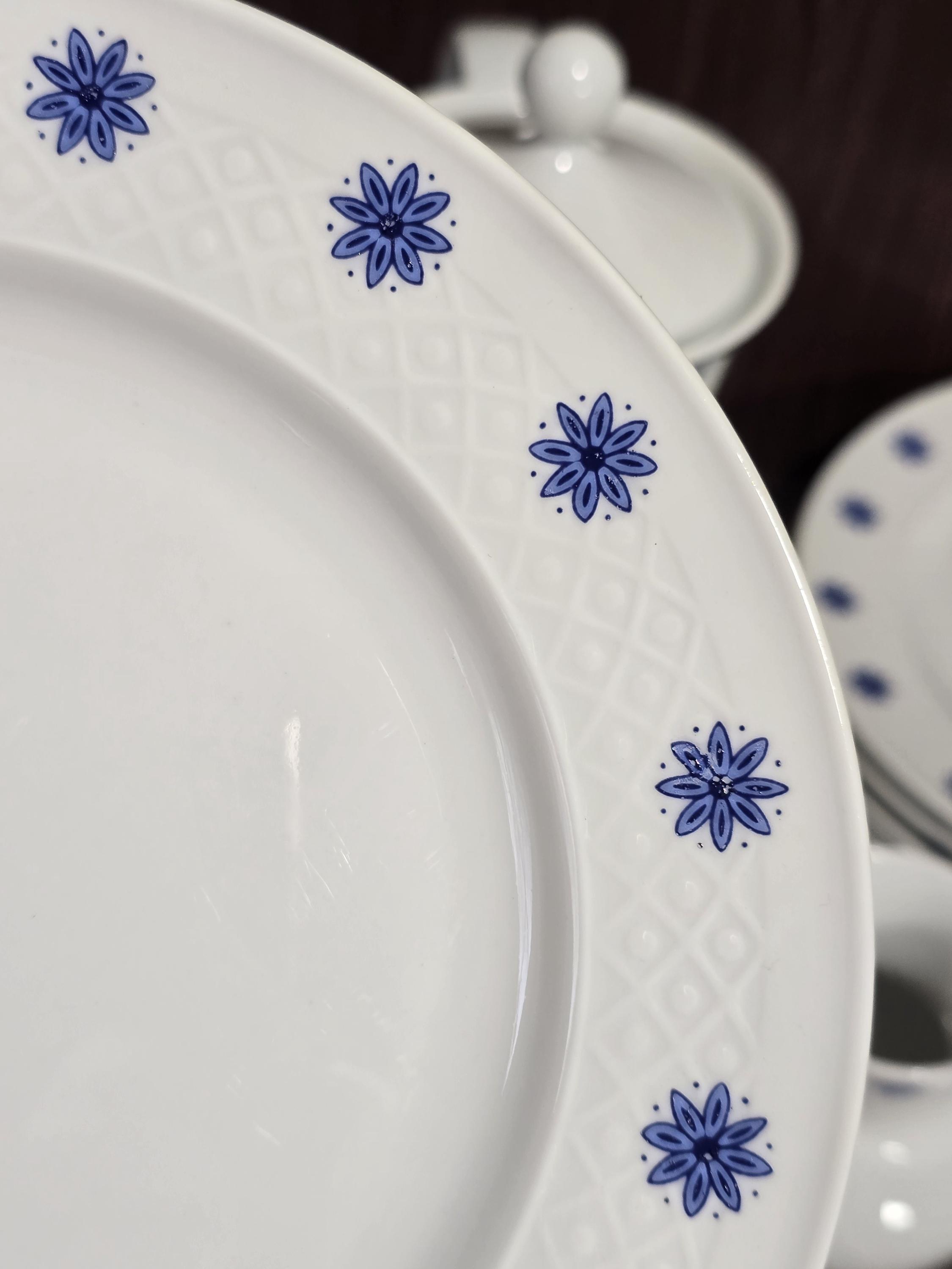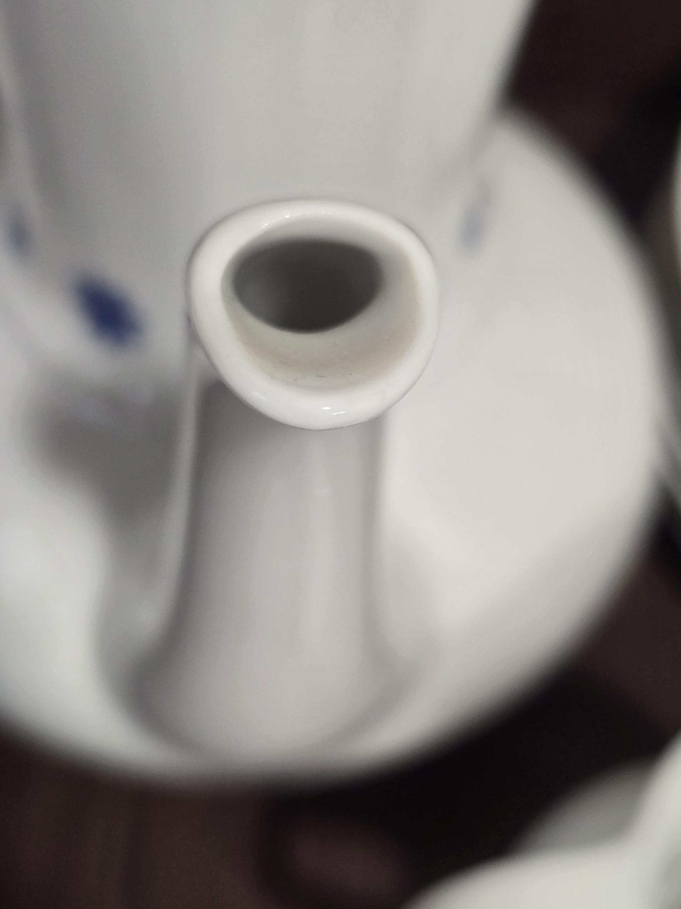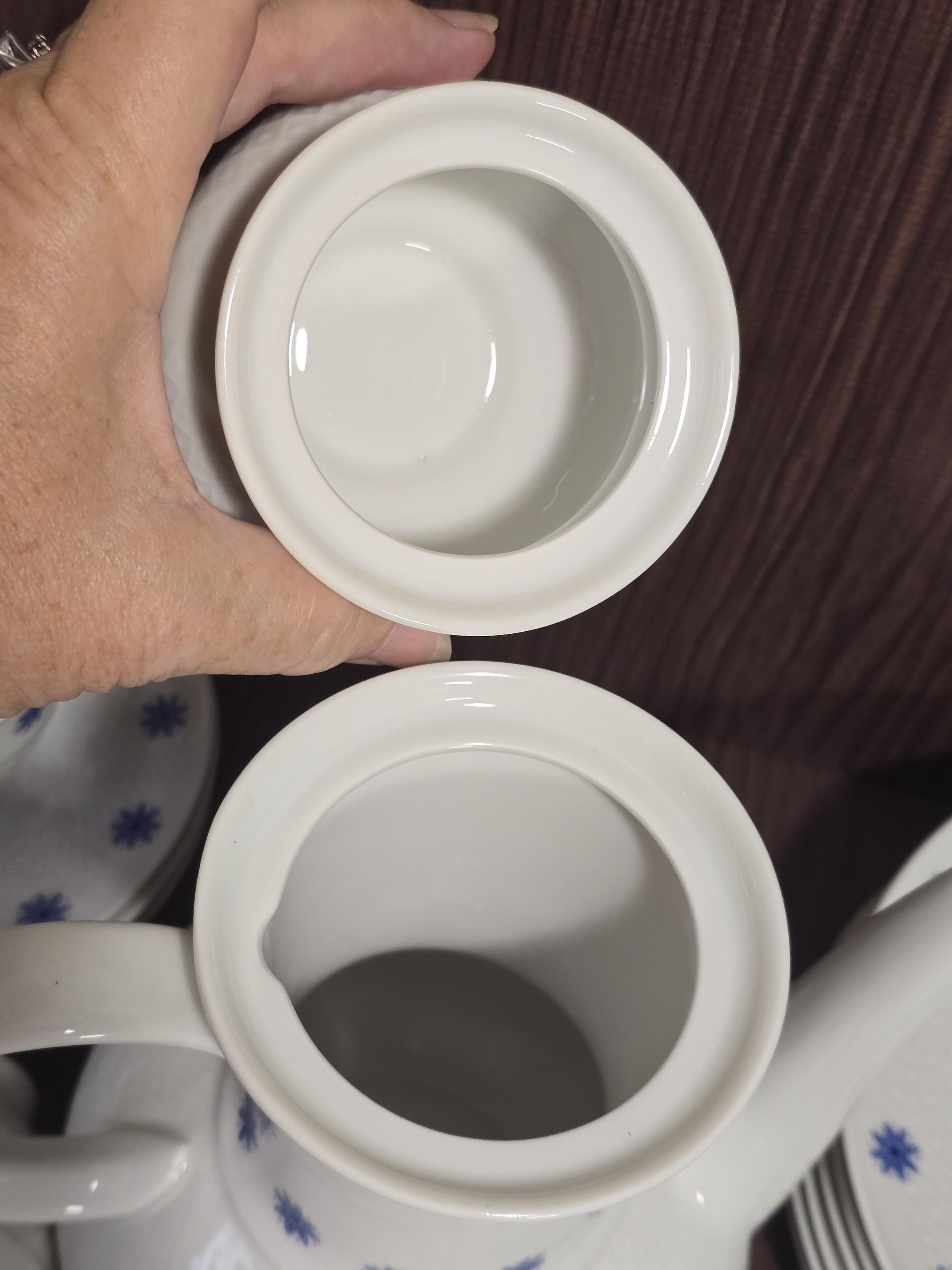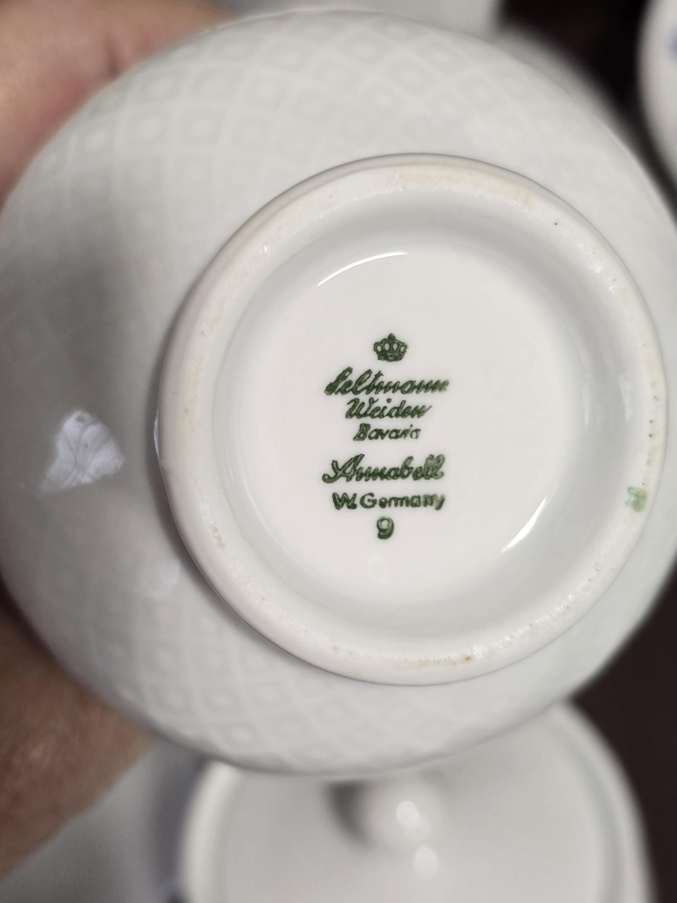 This is a beautiful coffee service for six for all you blue-and-white lovers out there. Made in the 1970s (note the "W. Germany" on the backstamp) by Seltmann Weiden of Bavaria. The pattern is Annabell.