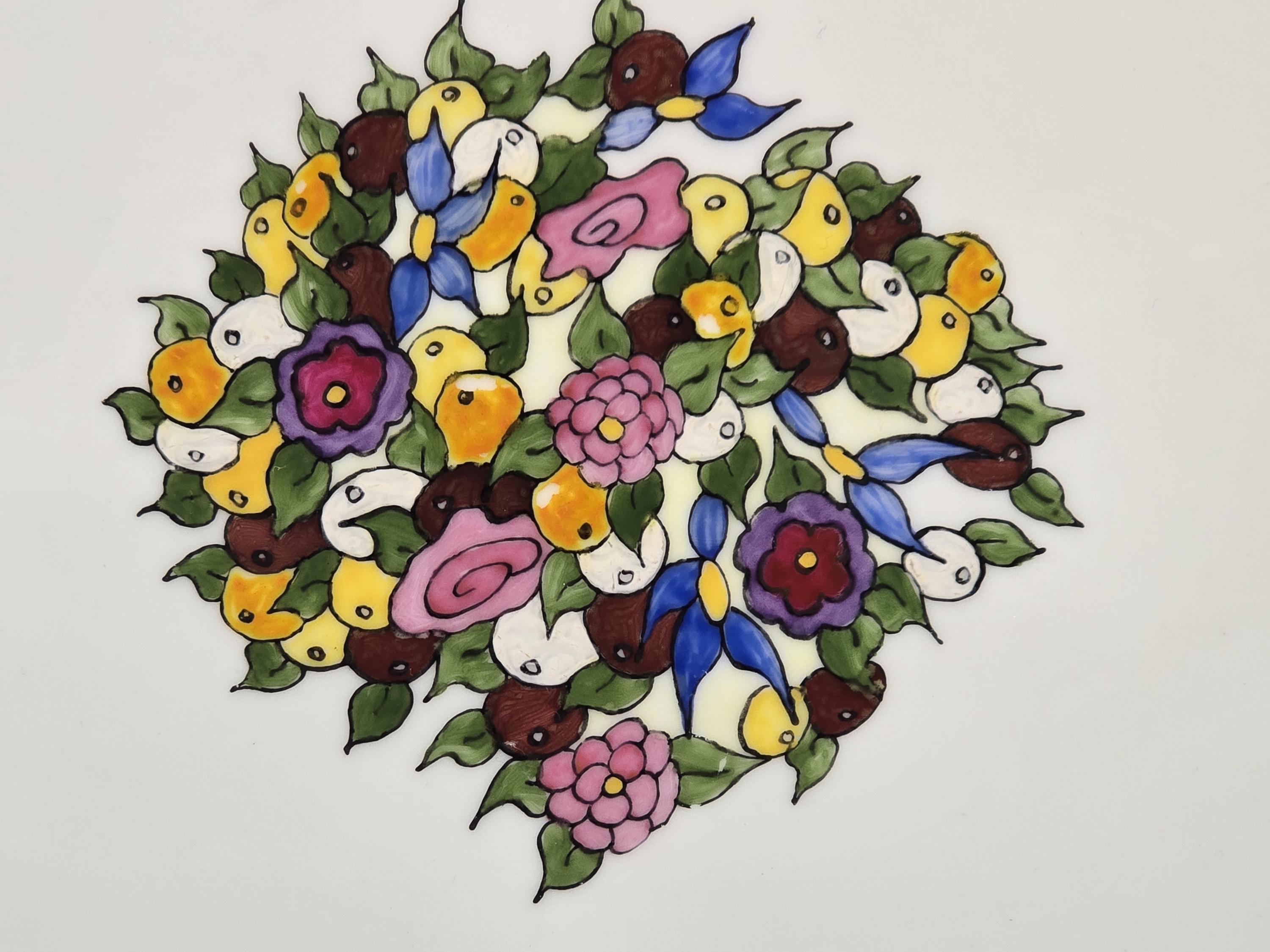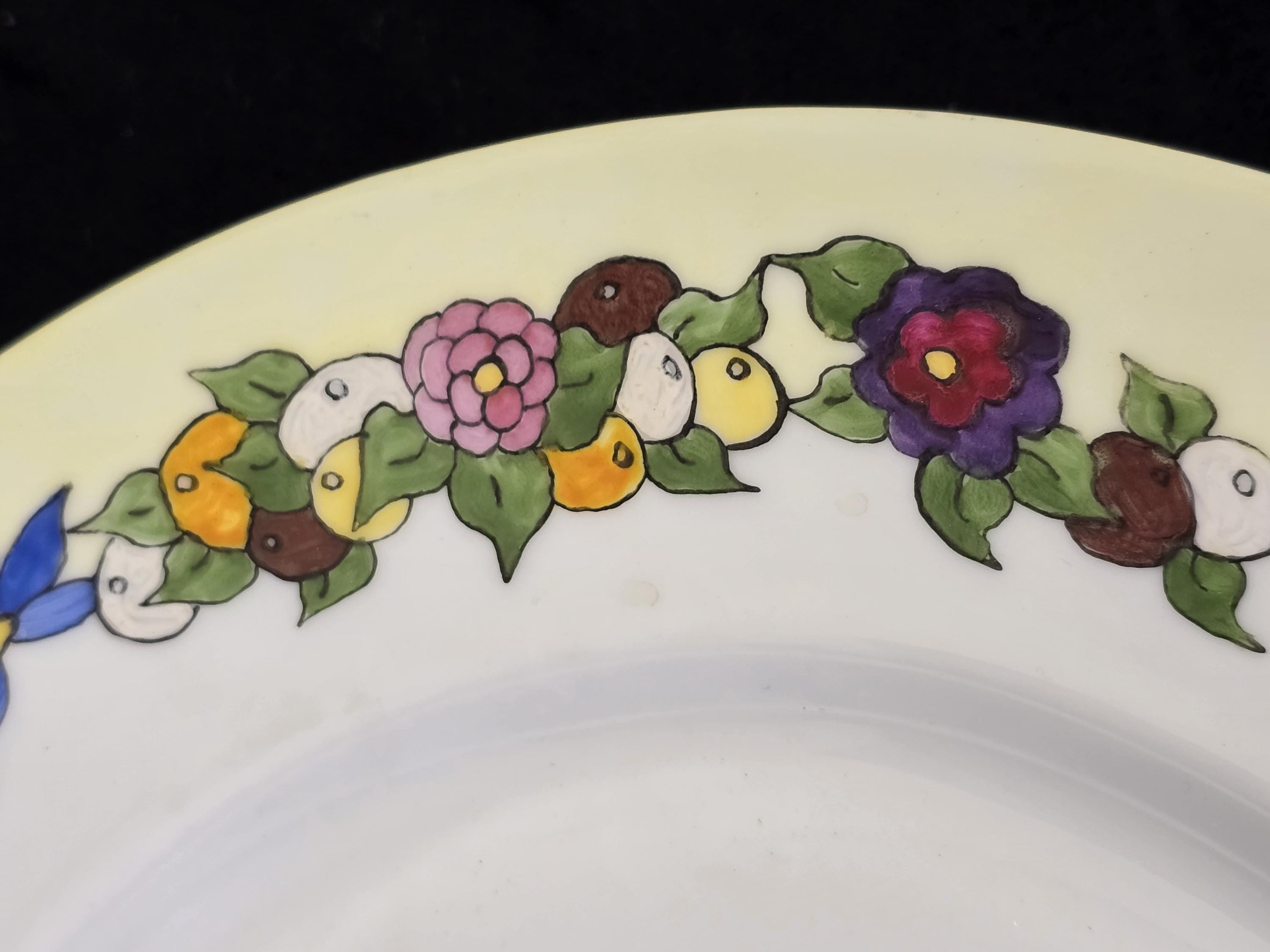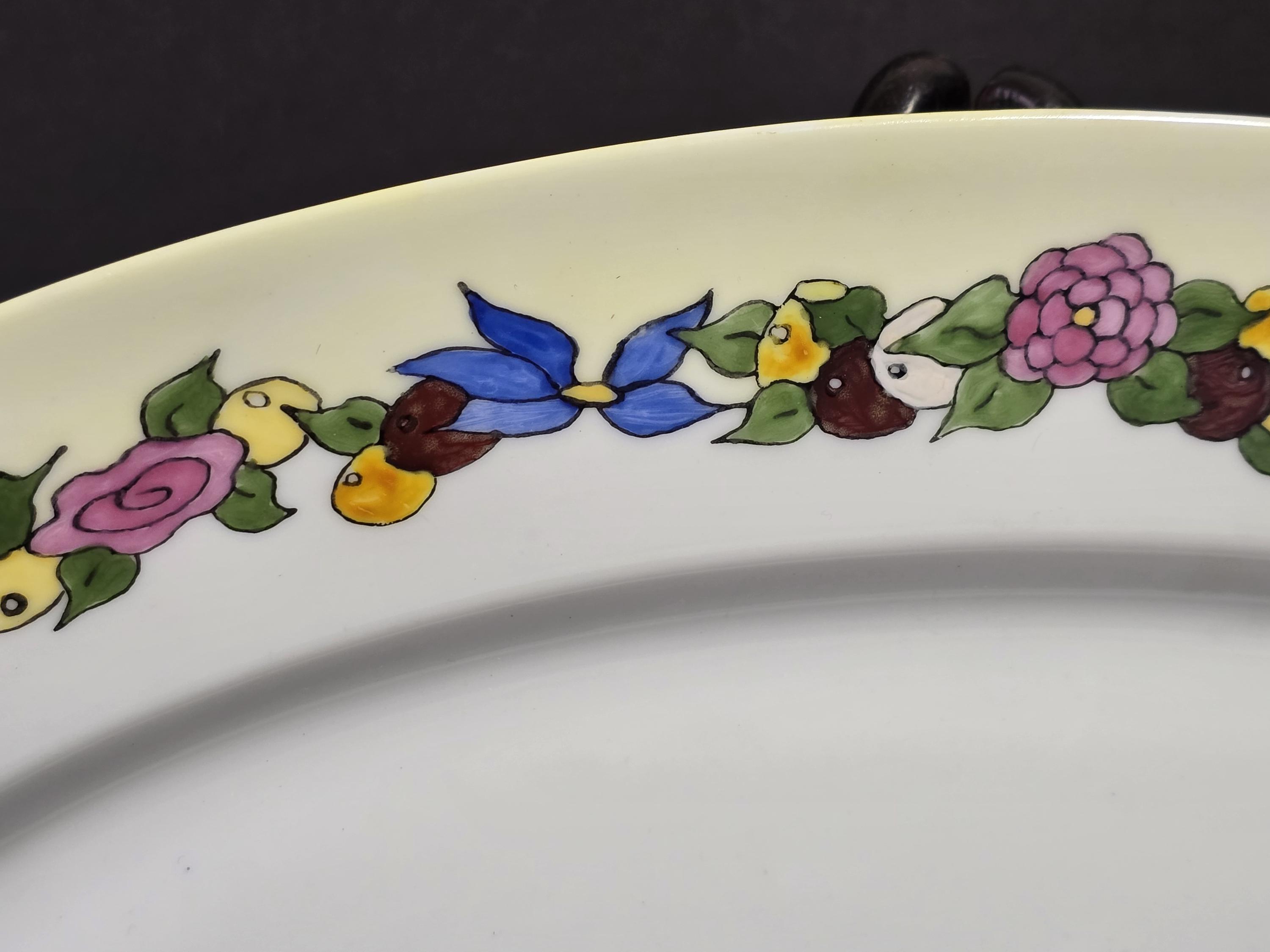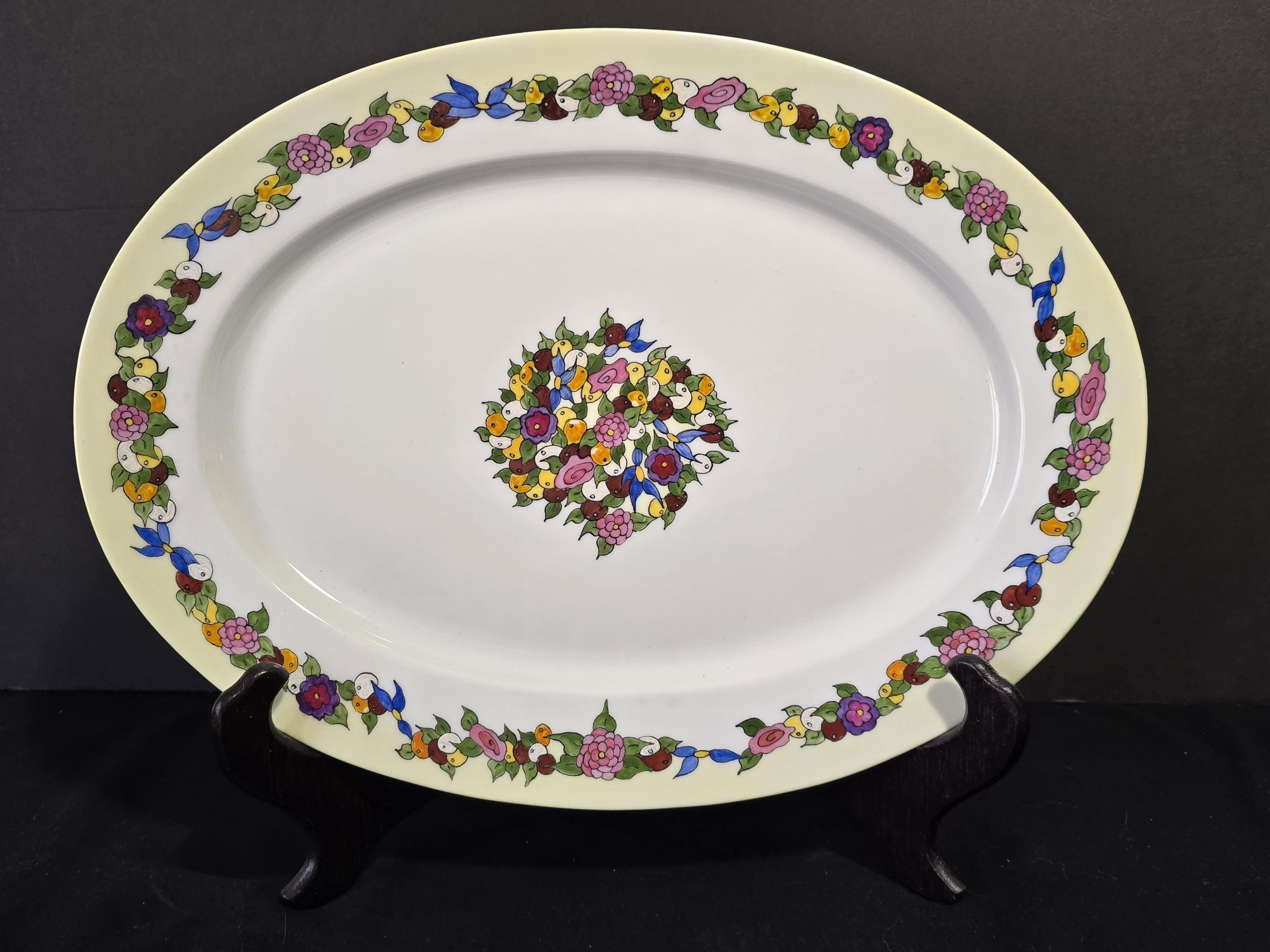 The platter blank is unmarked; however, the companion pieces were all painted on German or Limoges porcelain. It is about 17 inches long by 12 inches wide. The painting seems to be intact. The colors are lively and bright. Please feel free to message with any questions. Thank you for visiting Redux Vintage Boutique.