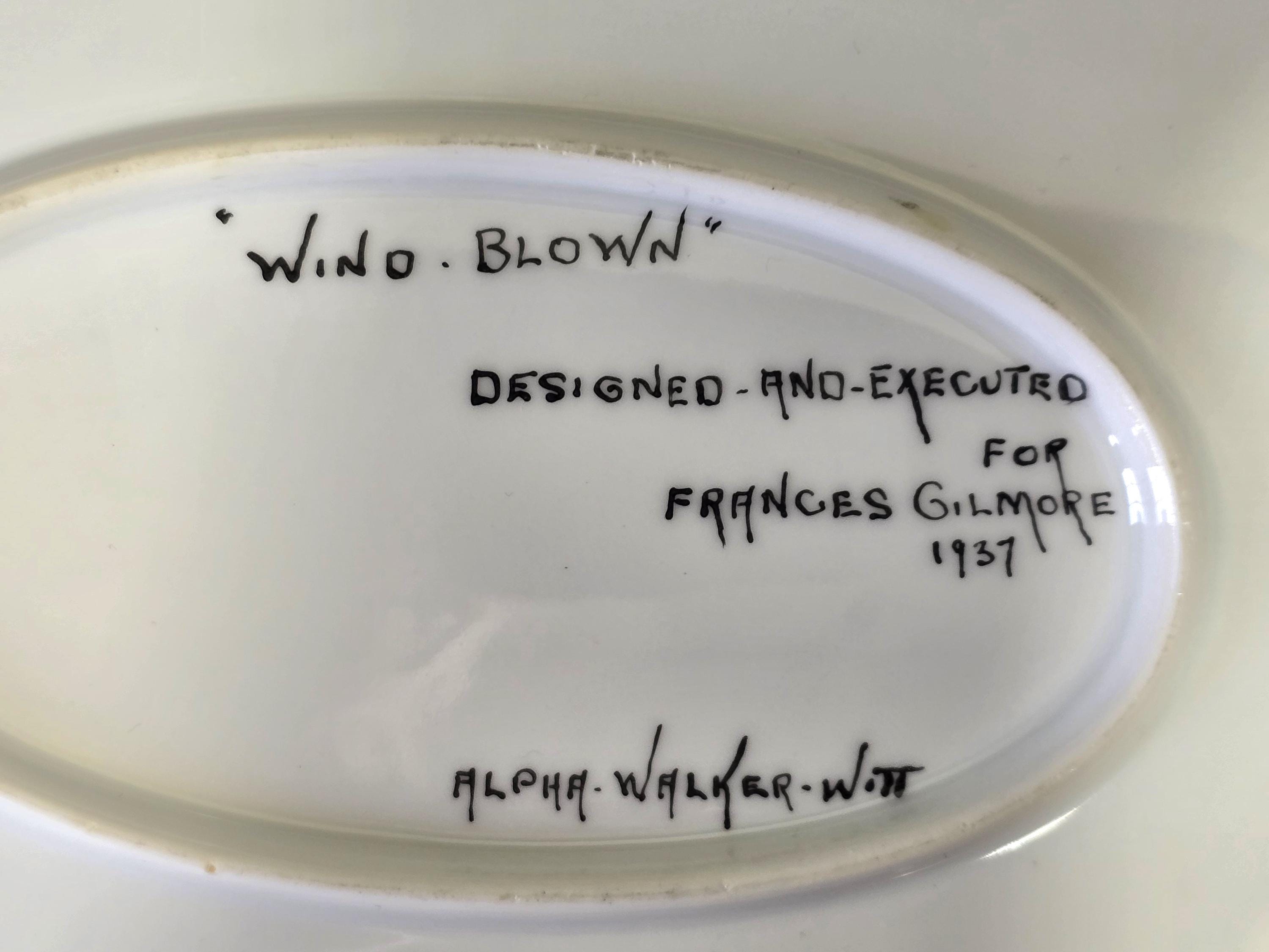 When I first acquired this, and some matching companion pieces, I wasn't sure I could part with it. It is everything that Redux Vintage is - artful objects that tell the stories of people's lives. There is an inscription on the back of this platter that gives the date, the pattern name ("Wind-Blown"), and the name of the lady for whom it was painted. It is signed by Alpha Walker-Witt. She was an artist of some note during the first half of the 20th century, and iconic of the Arts and Crafts movement.