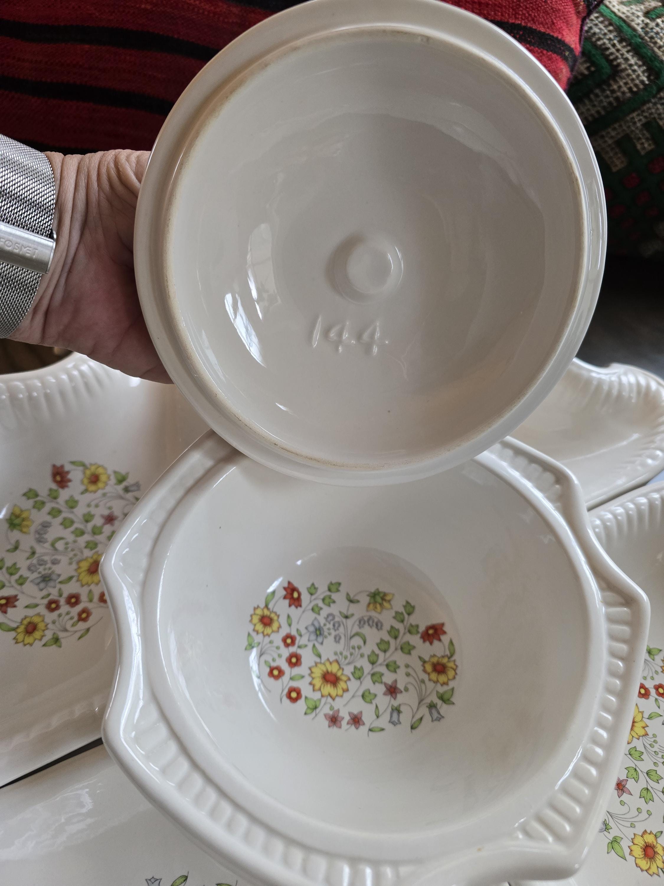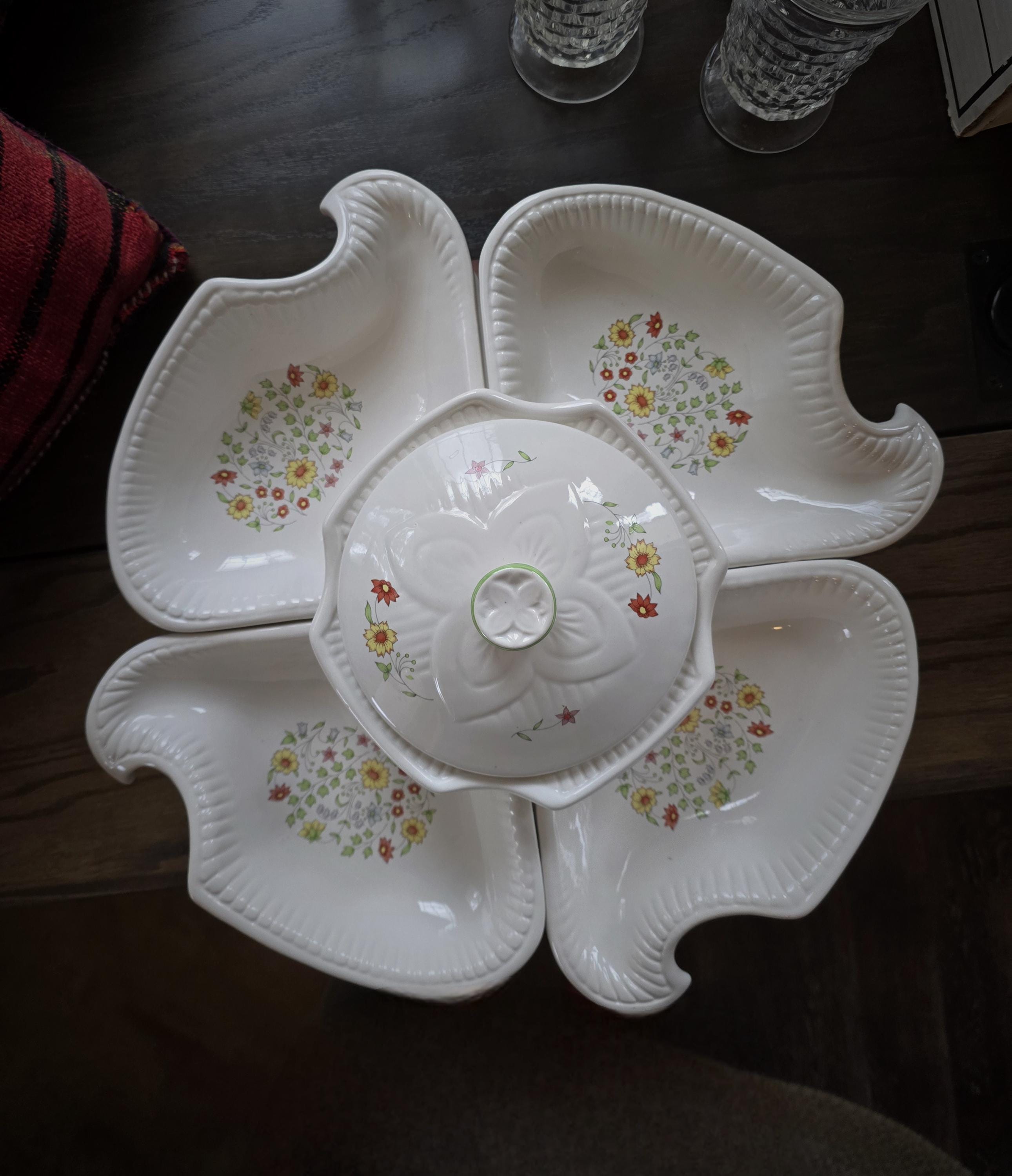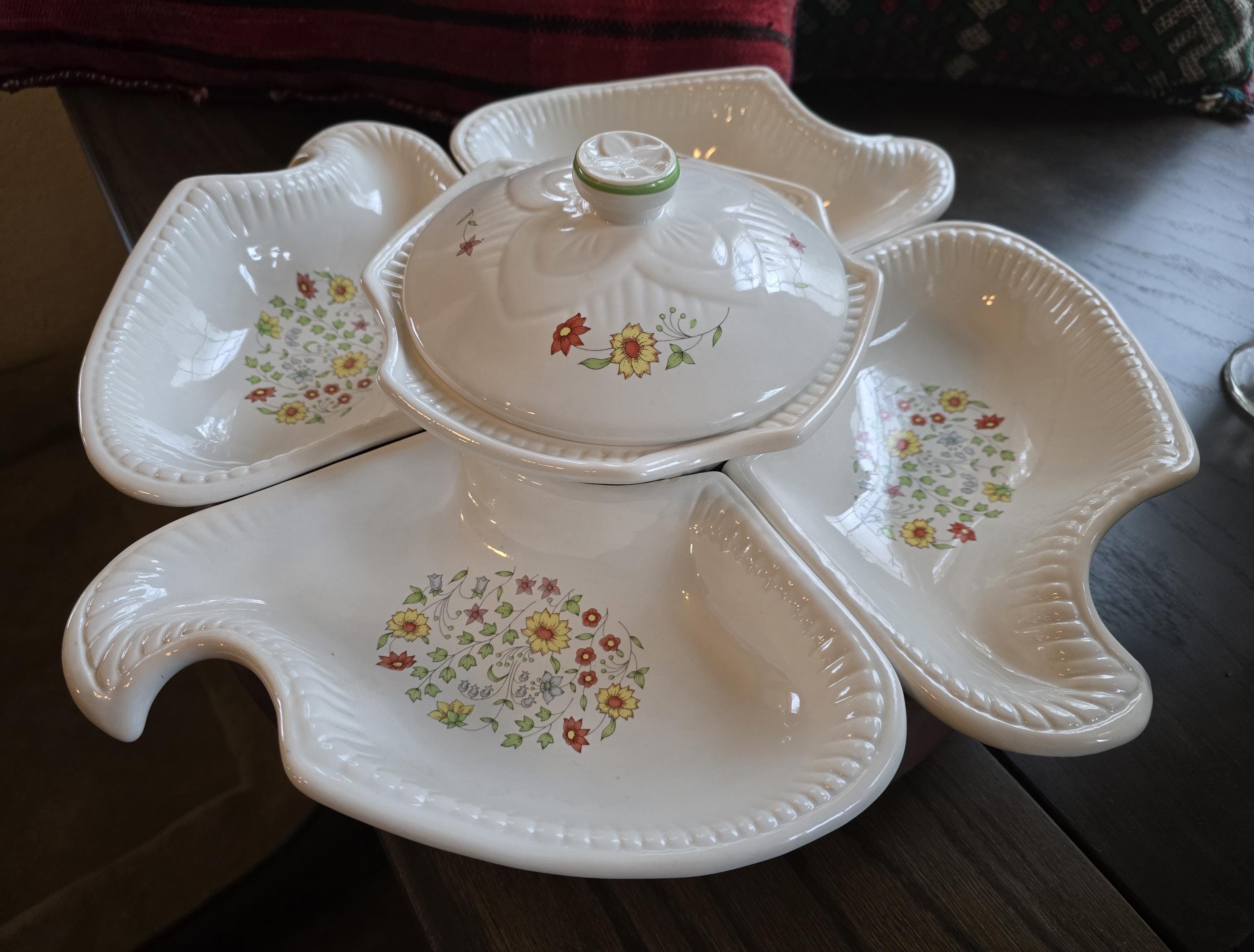 There are four side dishes, one covered center bowl, and the rotating lazy Susan pedestal. The set measures about 15 inches across when assembled. There is a nick on the edge of one side dish, which is hidden by the rim of the center bowl.