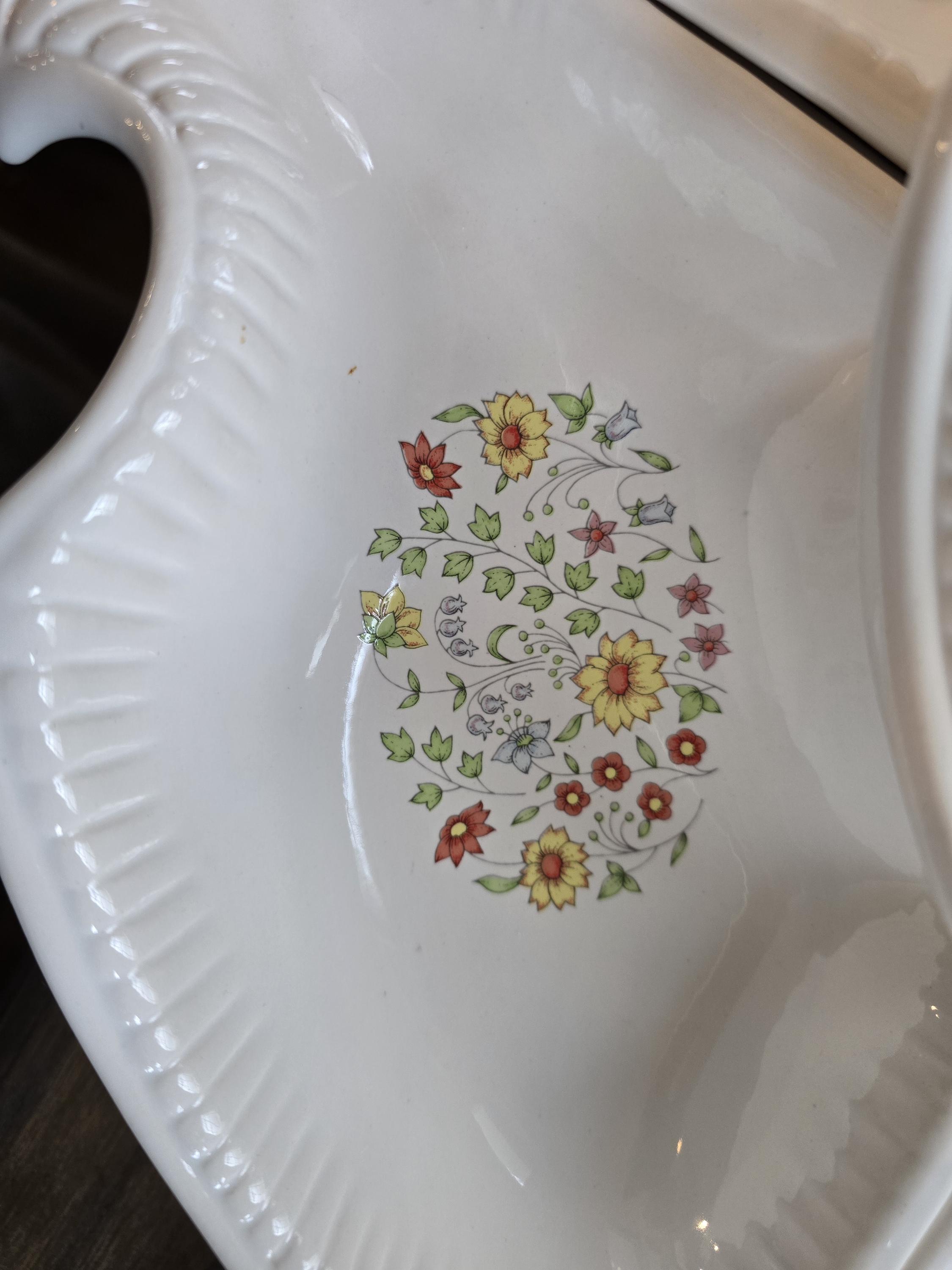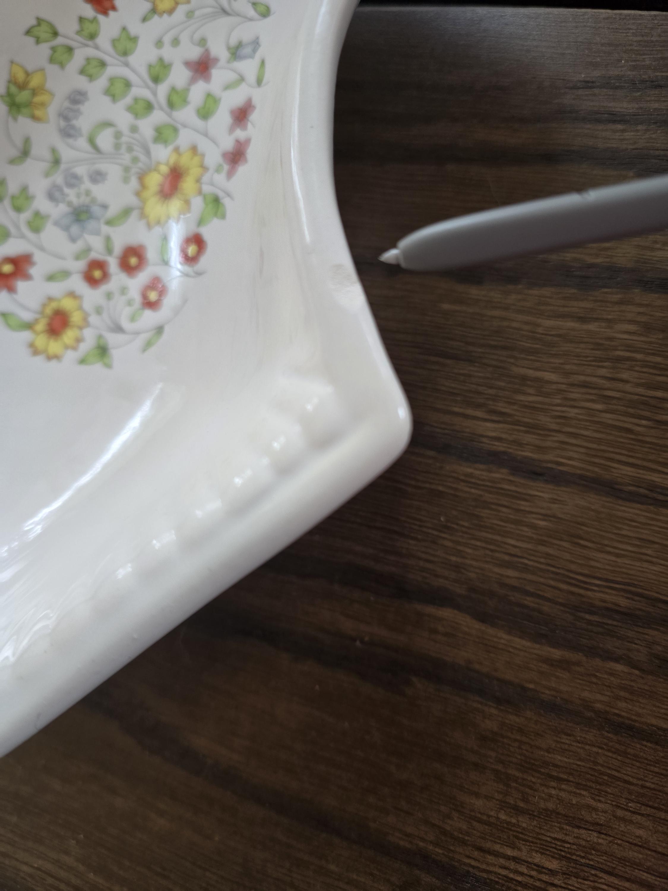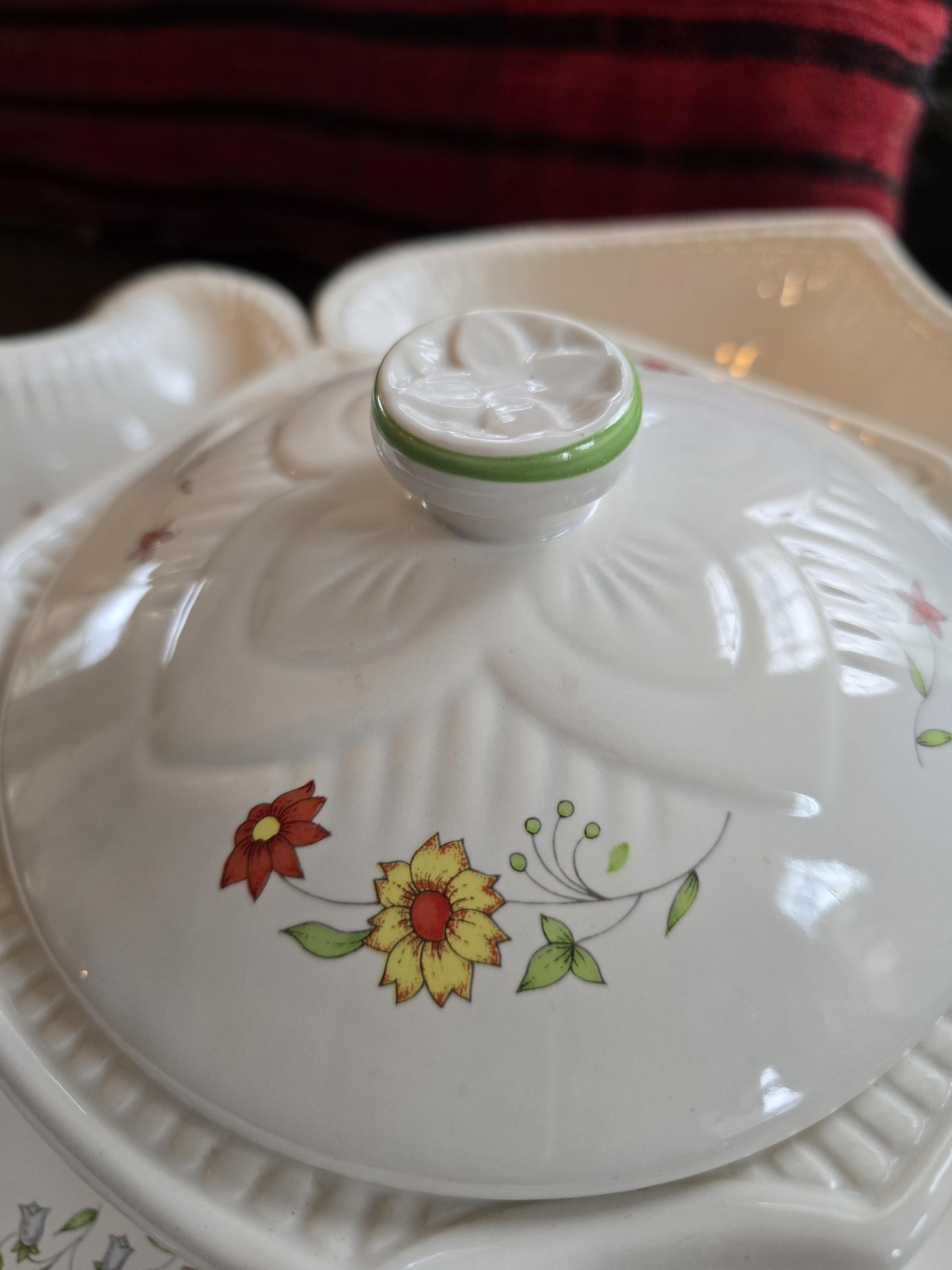 There are four side dishes, one covered center bowl, and the rotating lazy Susan pedestal. The set measures about 15 inches across when assembled. There is a nick on the edge of one side dish, which is hidden by the rim of the center bowl.