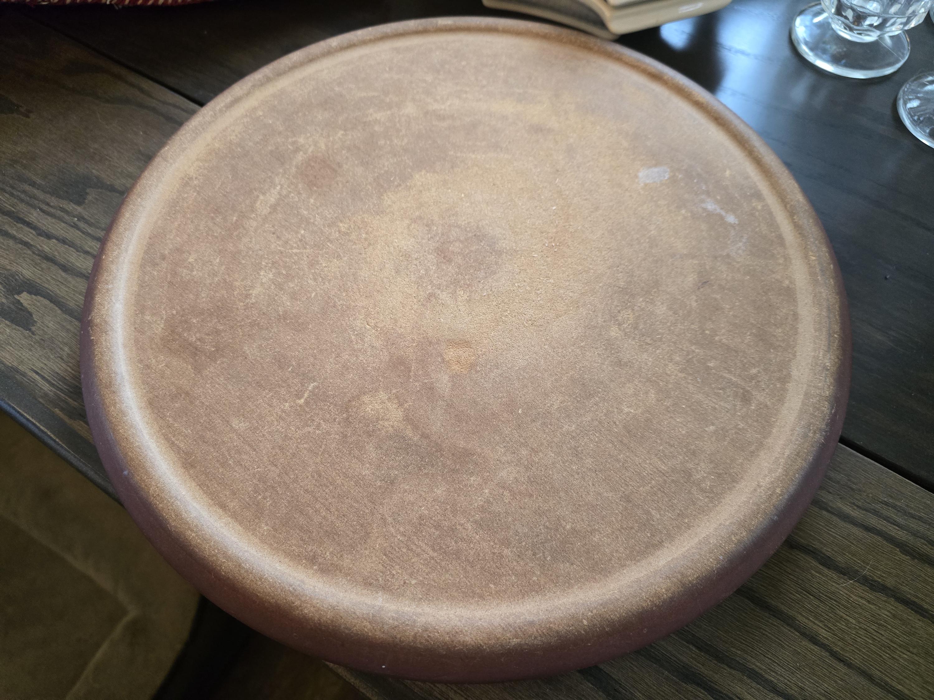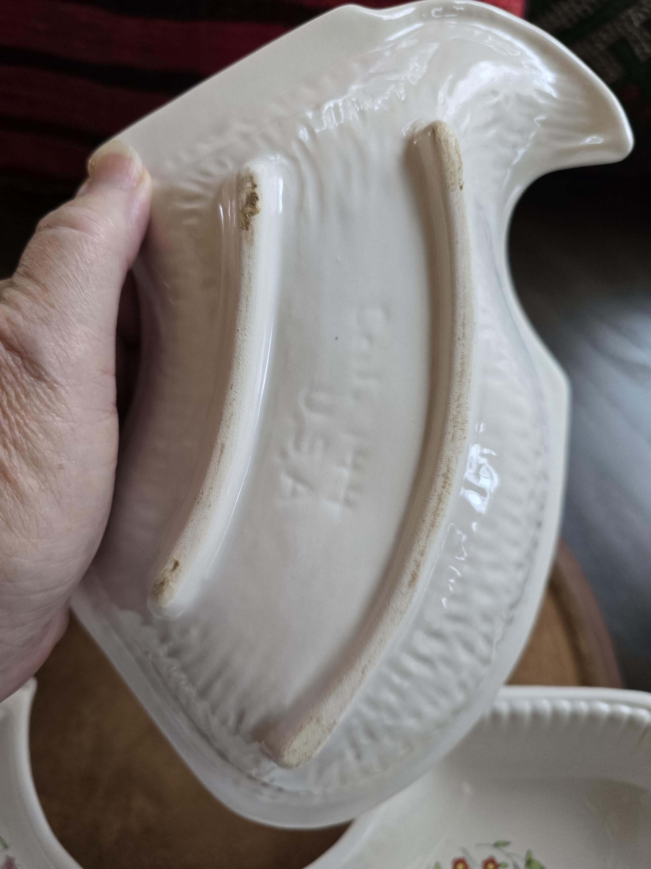 Here is a beautiful, bright centerpiece lazy Susan for your next casual gathering. I just love the curvy flourishes at the corners of the side pieces. It is marked "Cal. Orig. FA-144 U.S.A." and has the rotating pedestal with it.