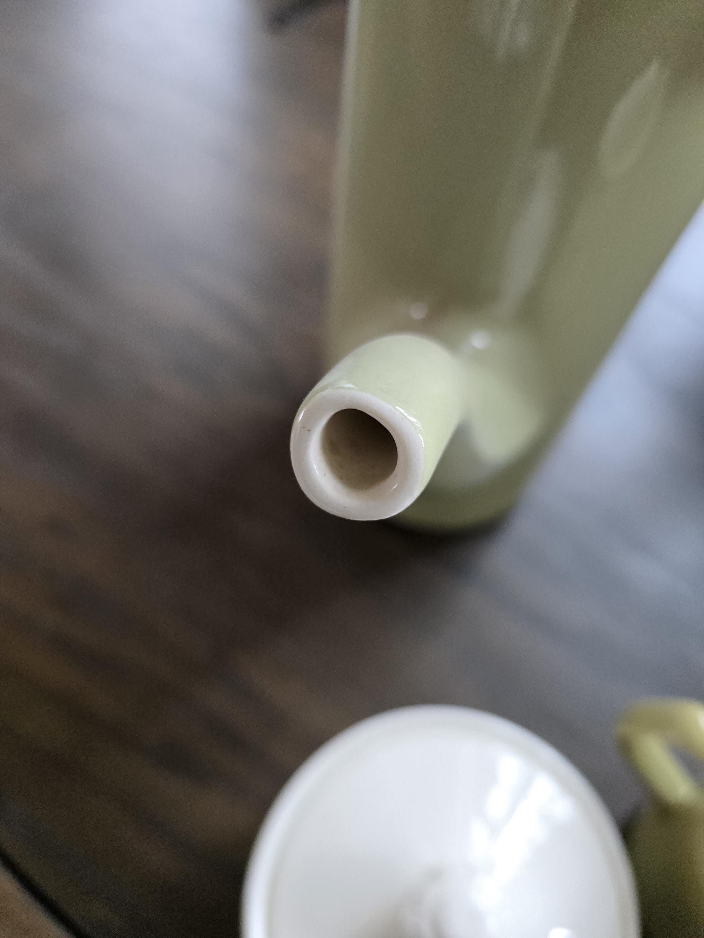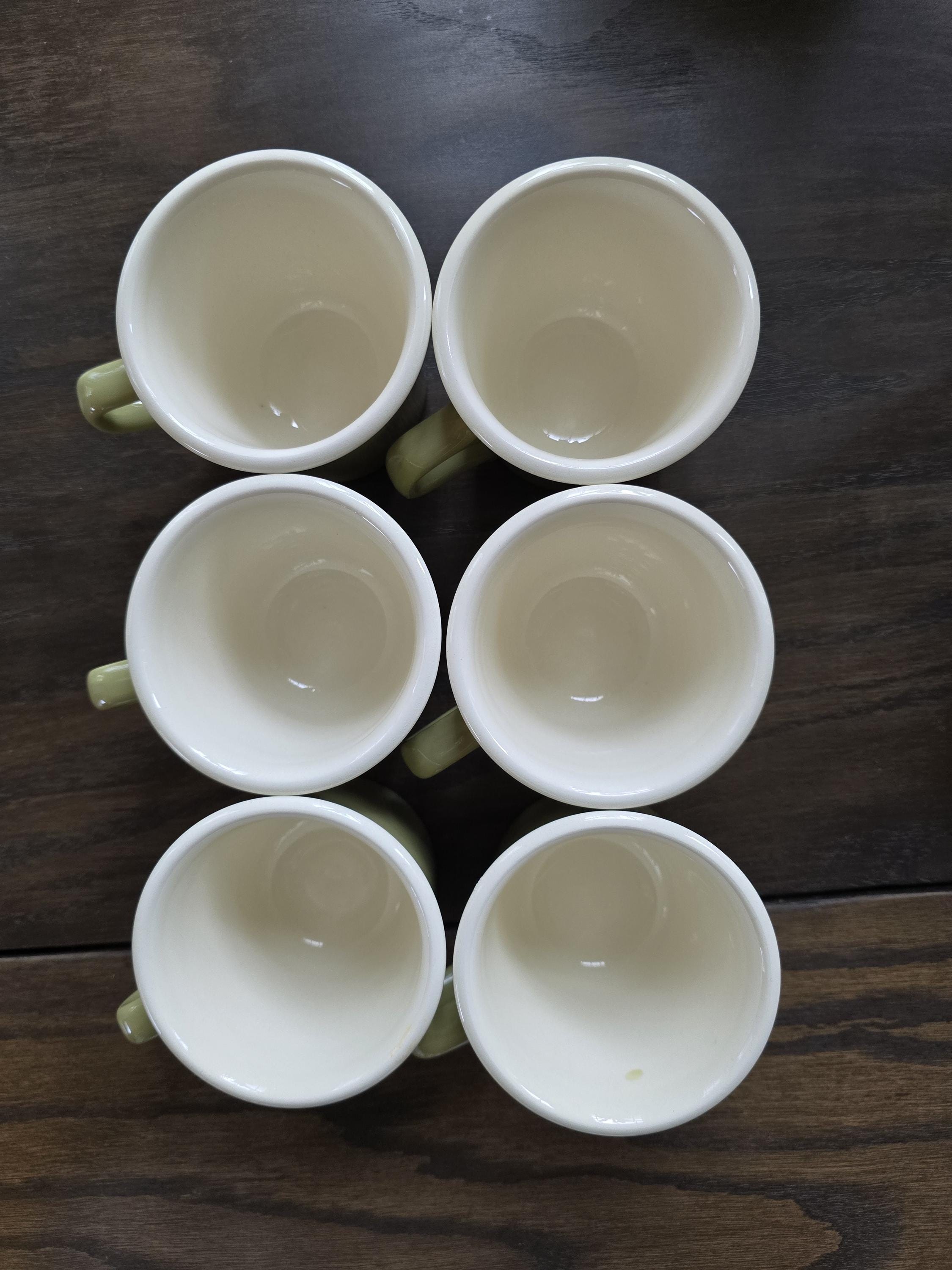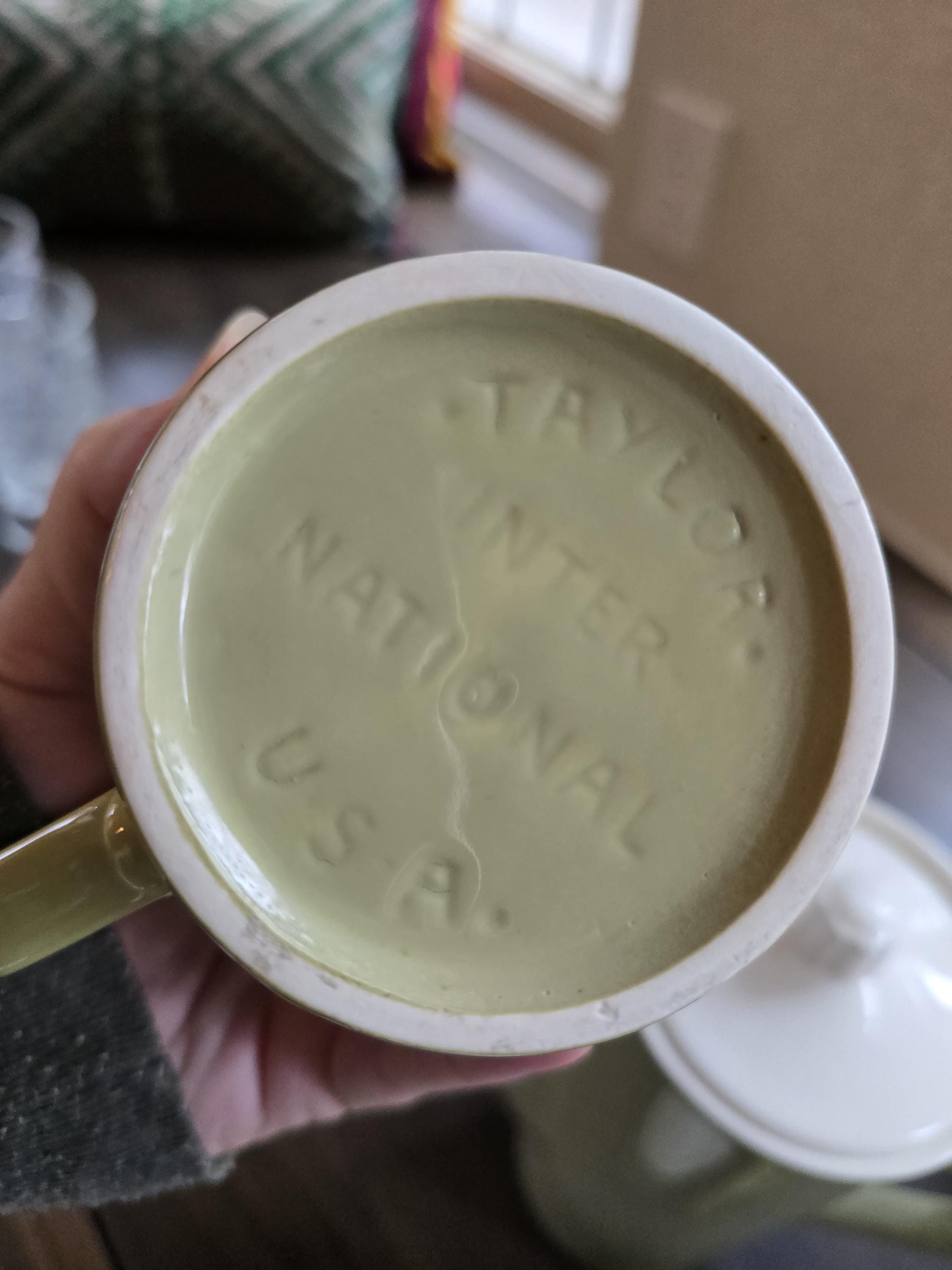 This is a mixed lot, in truth. The cups are Taylor International/USA, while the other pieces are either unmarked or simply say USA. The greens are ever-so-slightly different, too. Altogether, they make a nice set for casual hosting.