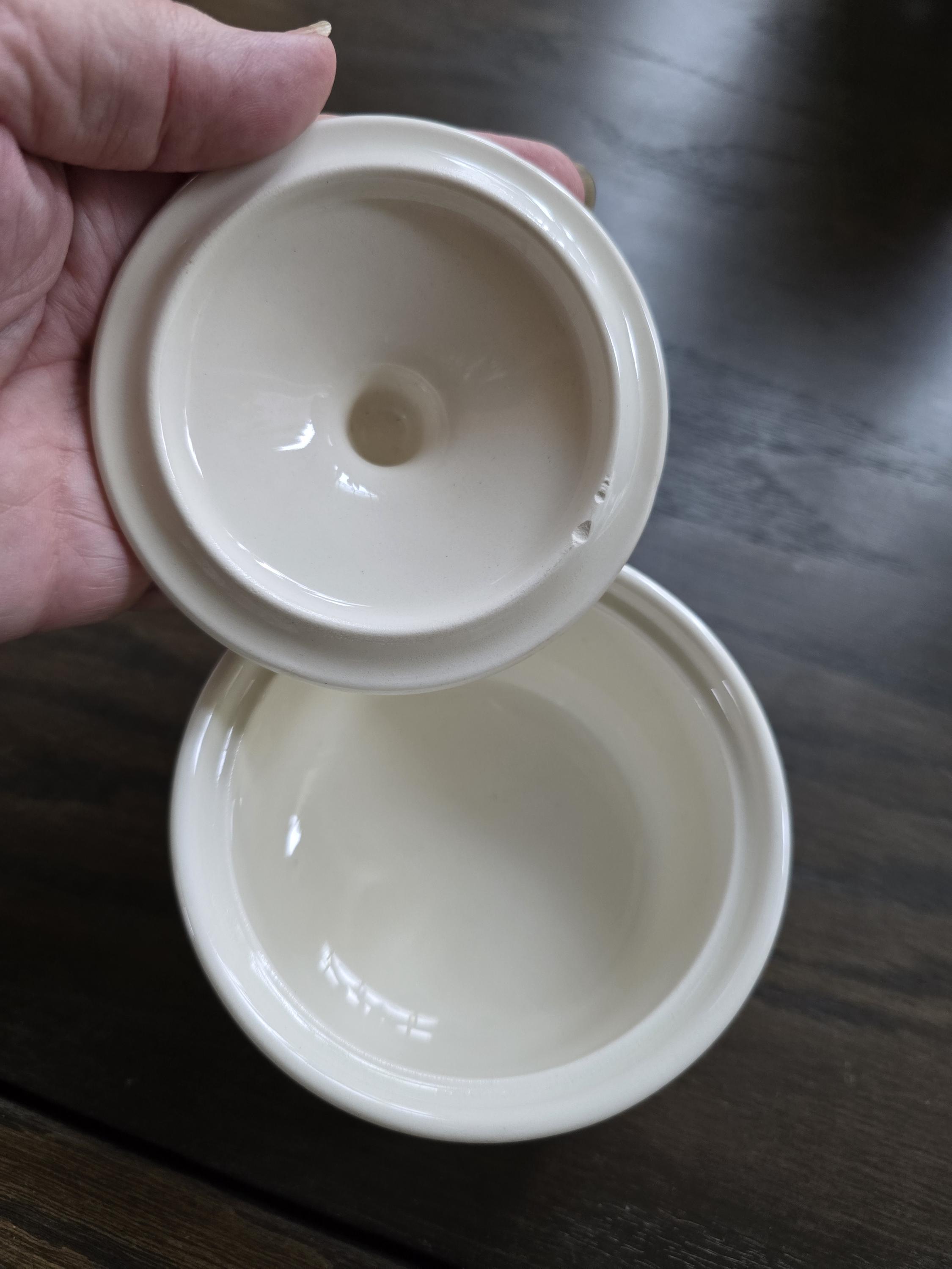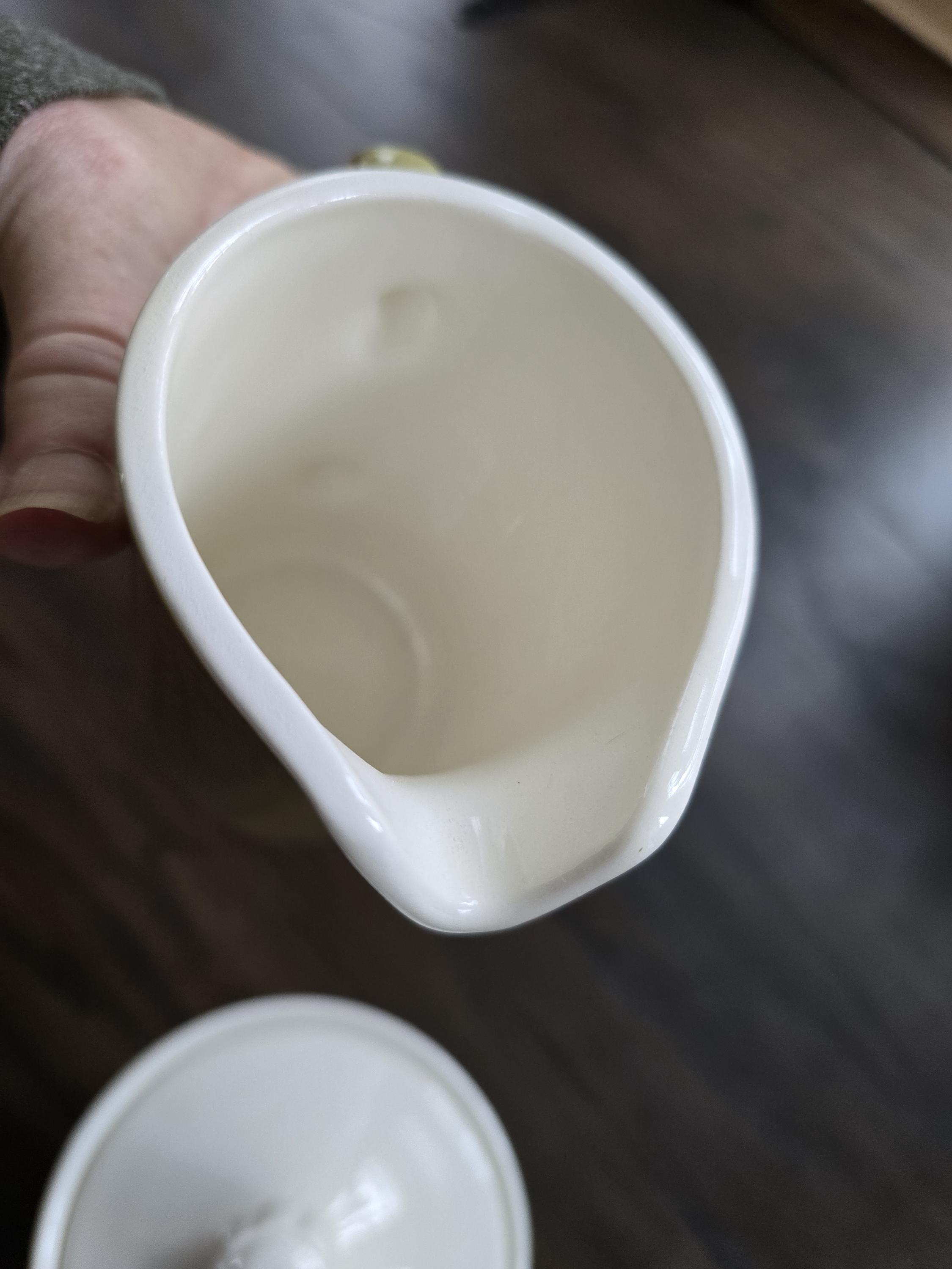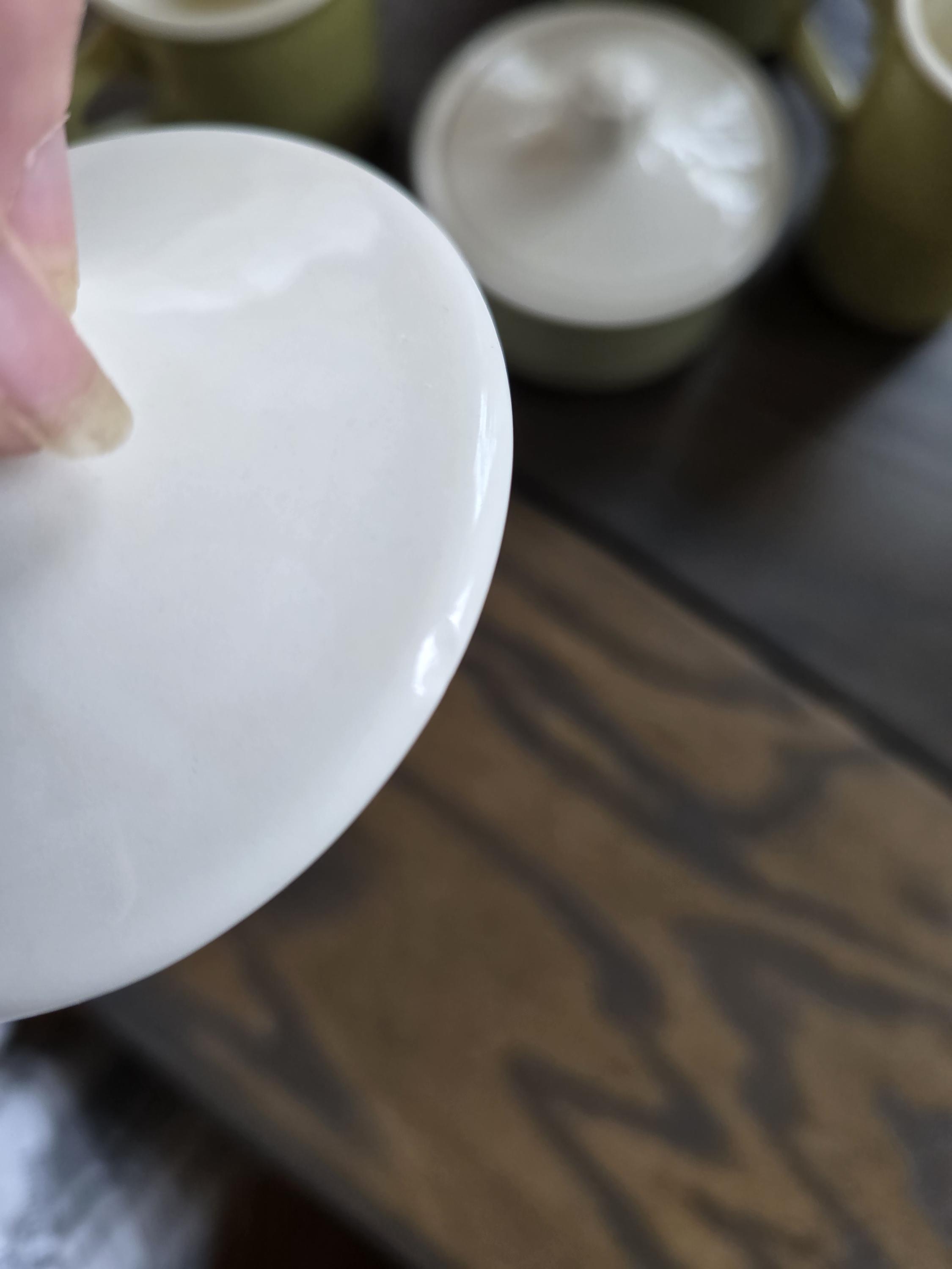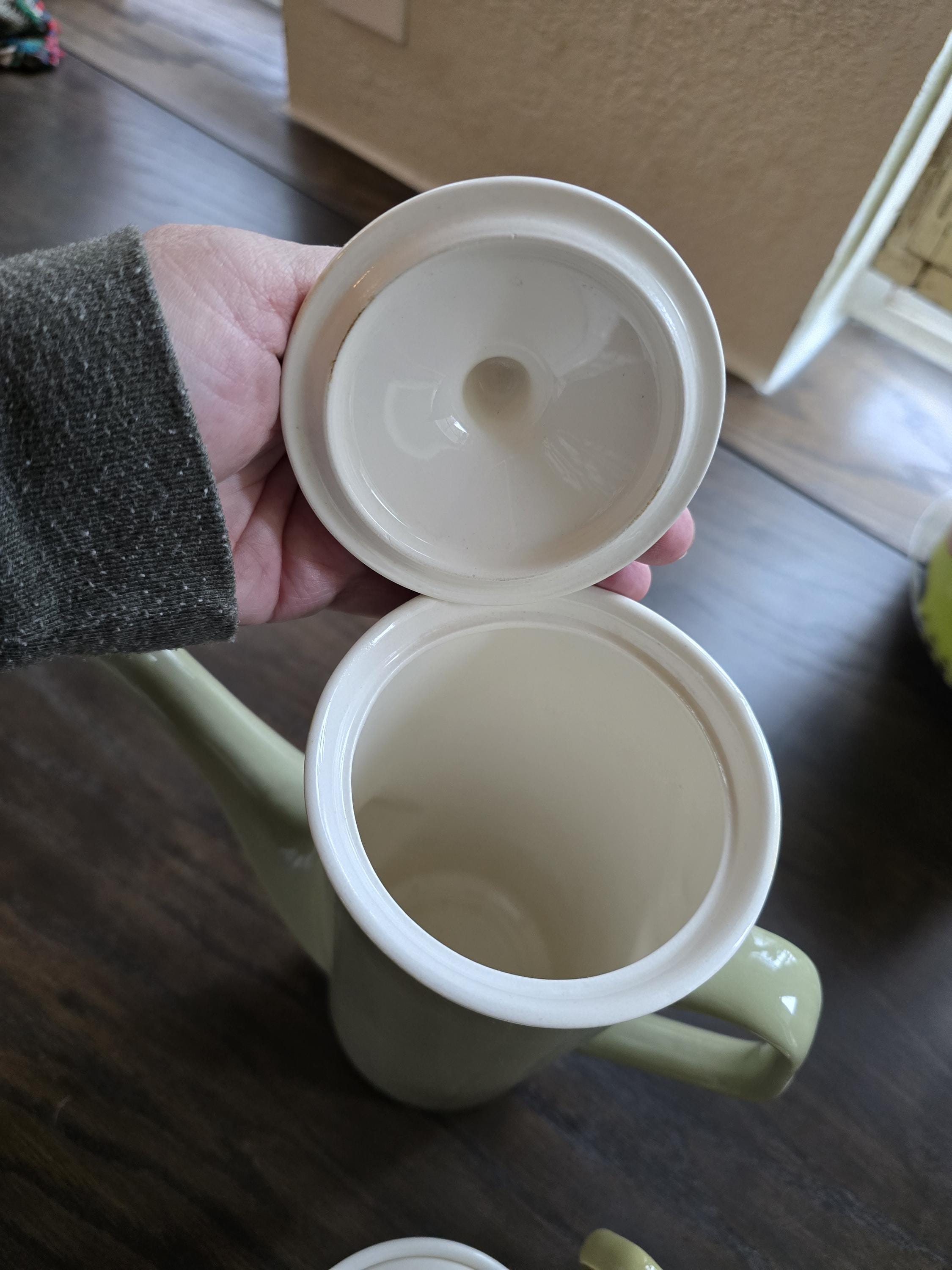 The coffee pot is 10.25 inches tall, including the lid. The pieces are in great vintage condition - just a couple of little nicks, which might actually be manufacturing flaws. They are somewhat smooth. Still... commensurate with age and use. All the cups are without stains. There is a glaze drip in one cup.