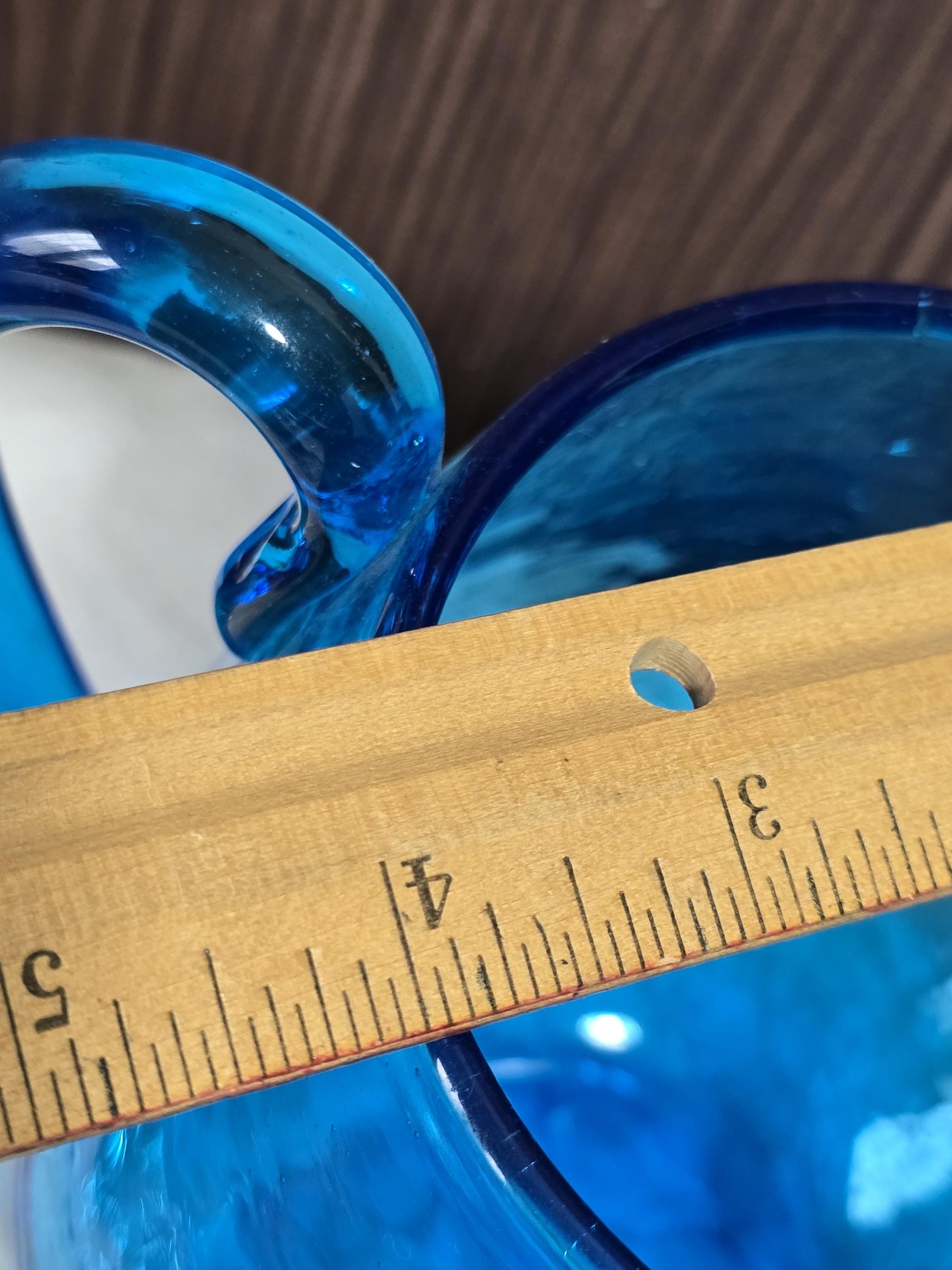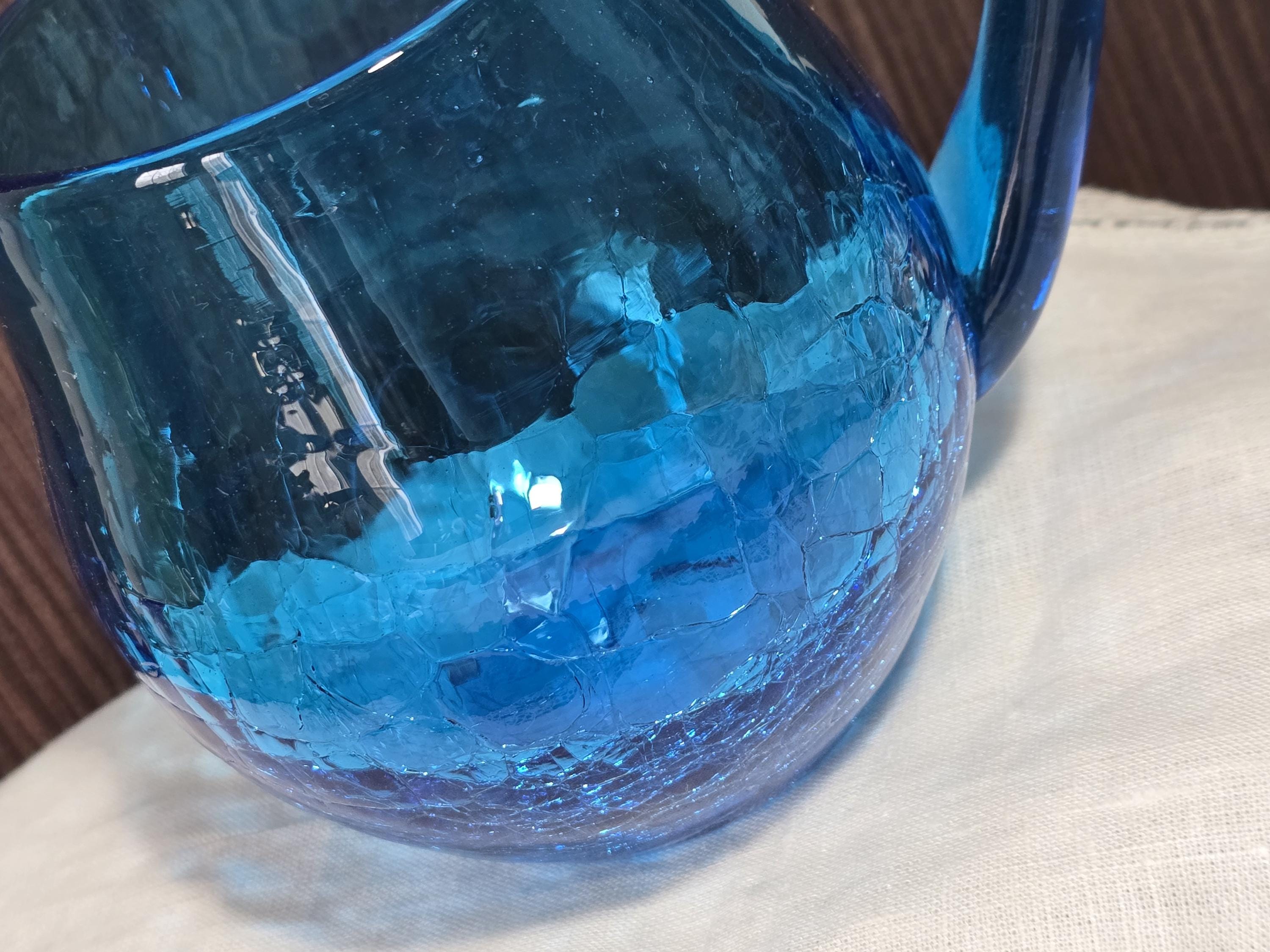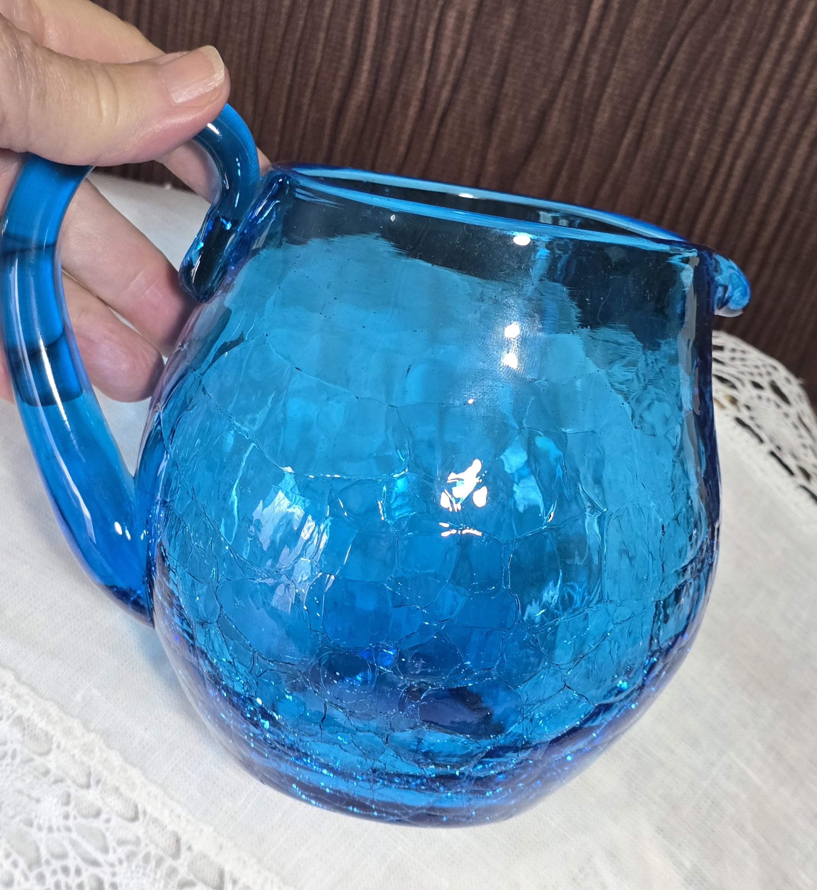 No chips or hazing. It is crackle glass. The handle is securely attached. It stands 5.25 inches tall and about 4 inches across the mouth. Please feel free to message with any questions. Thank you for visiting Redux Vintage Boutique.