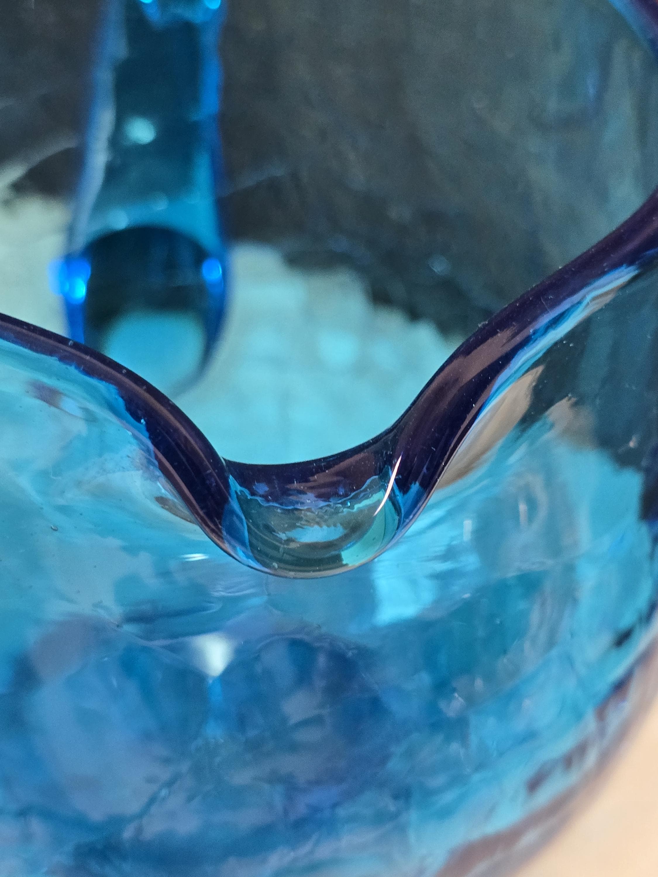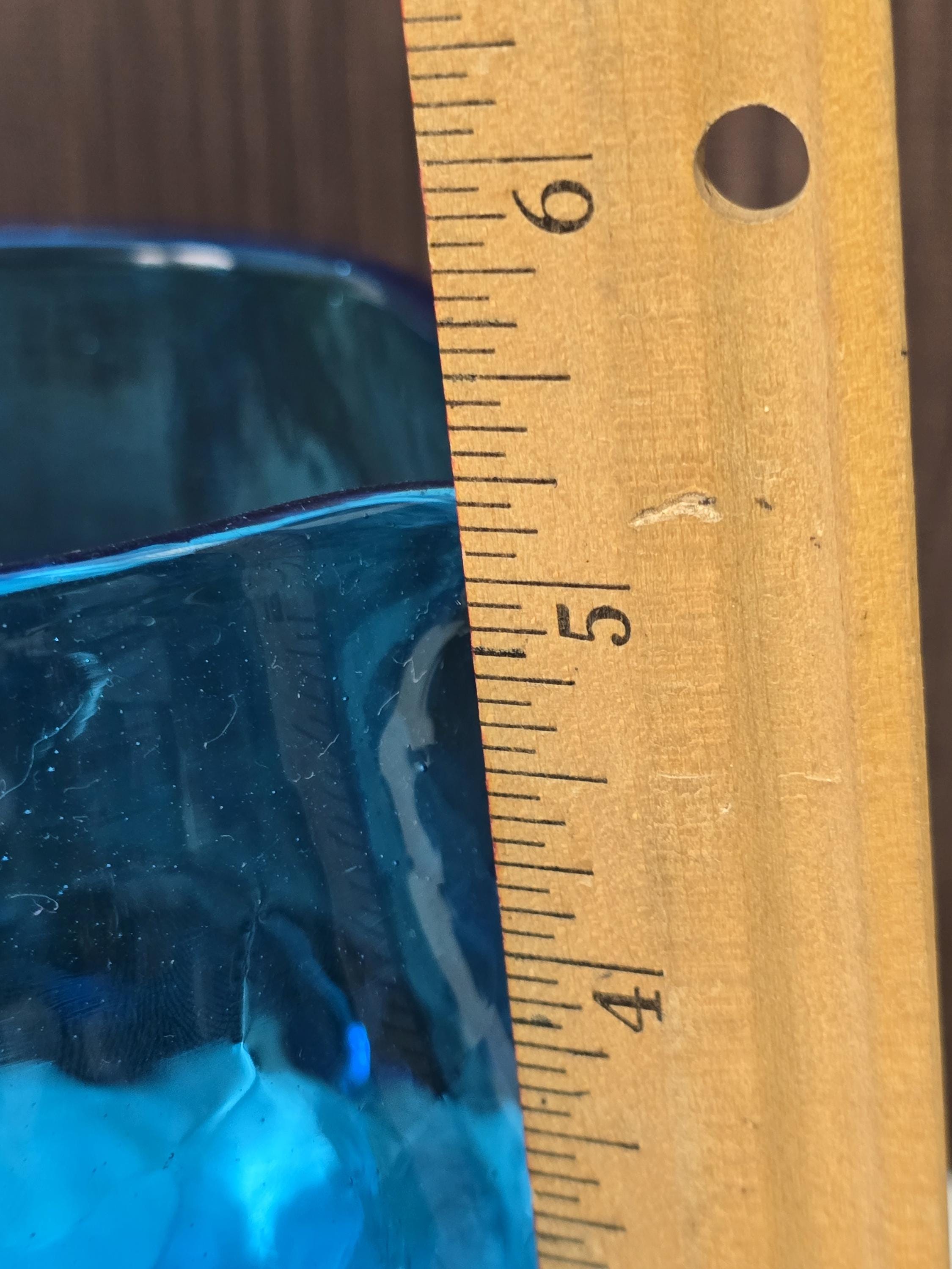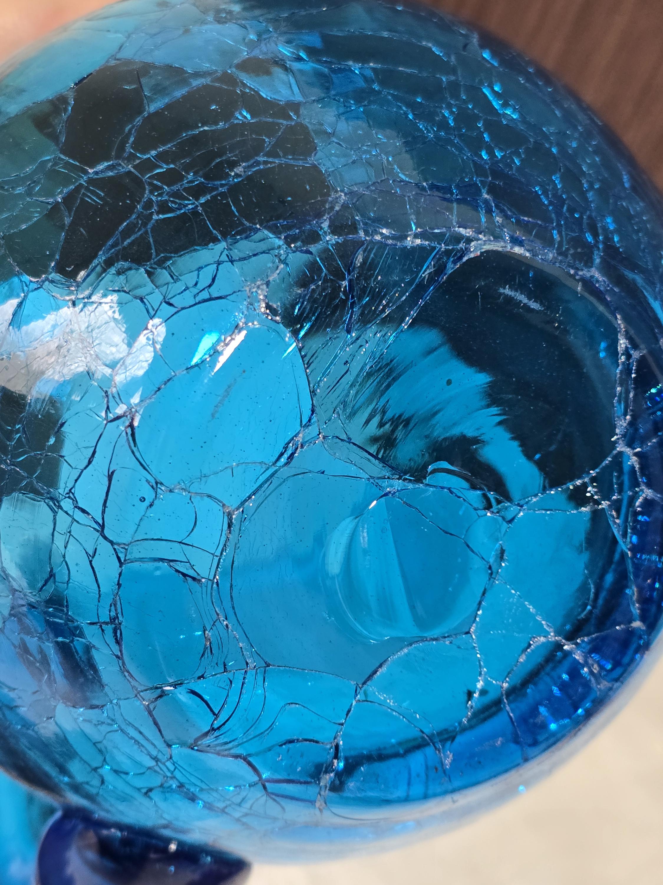 No chips or hazing. It is crackle glass. The handle is securely attached. It stands 5.25 inches tall and about 4 inches across the mouth. Please feel free to message with any questions. Thank you for visiting Redux Vintage Boutique.
