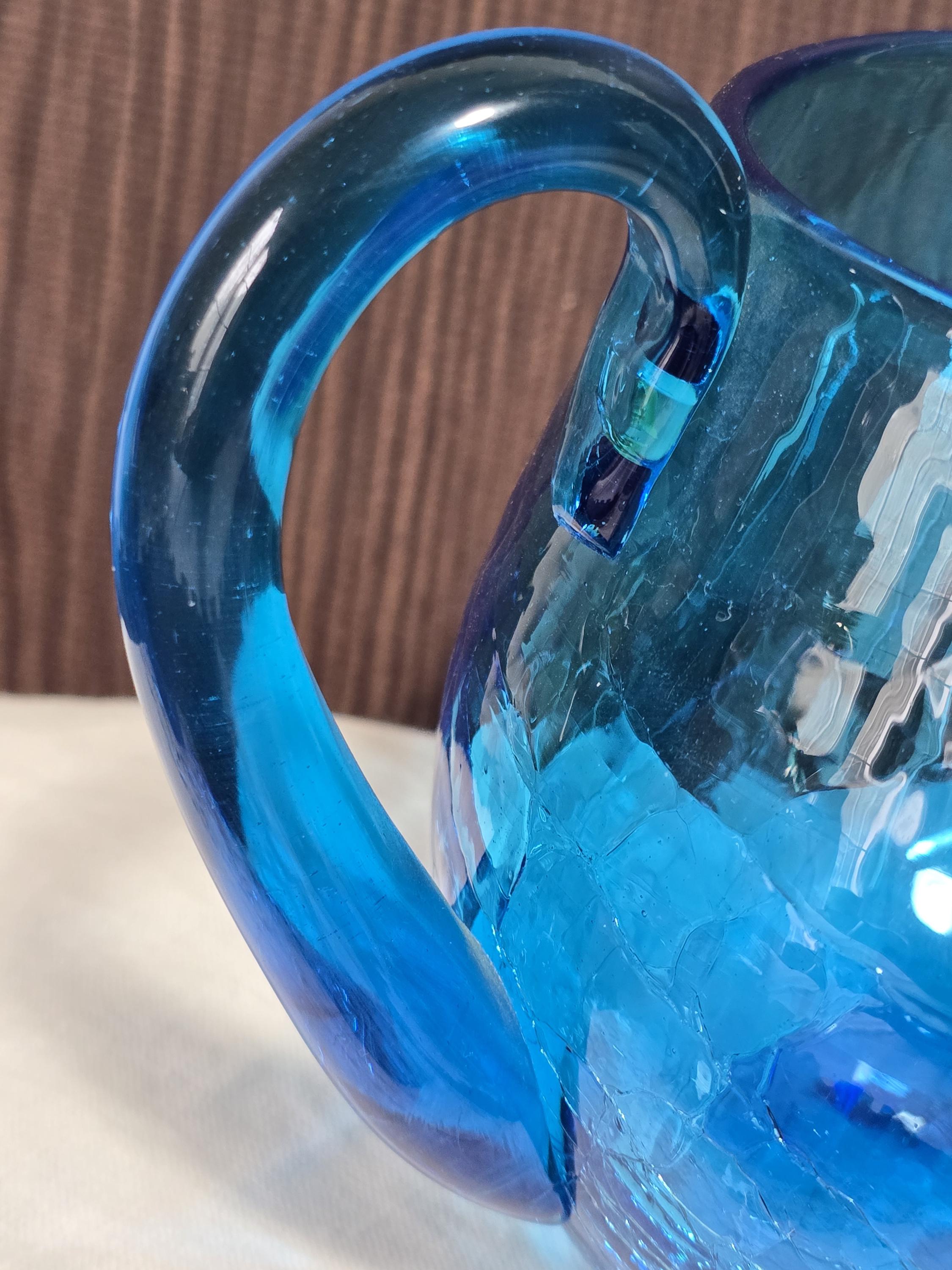 Here's a cute, classic Blenko crackle glass pitcher. It is in great shape and holds 40 ounces.
