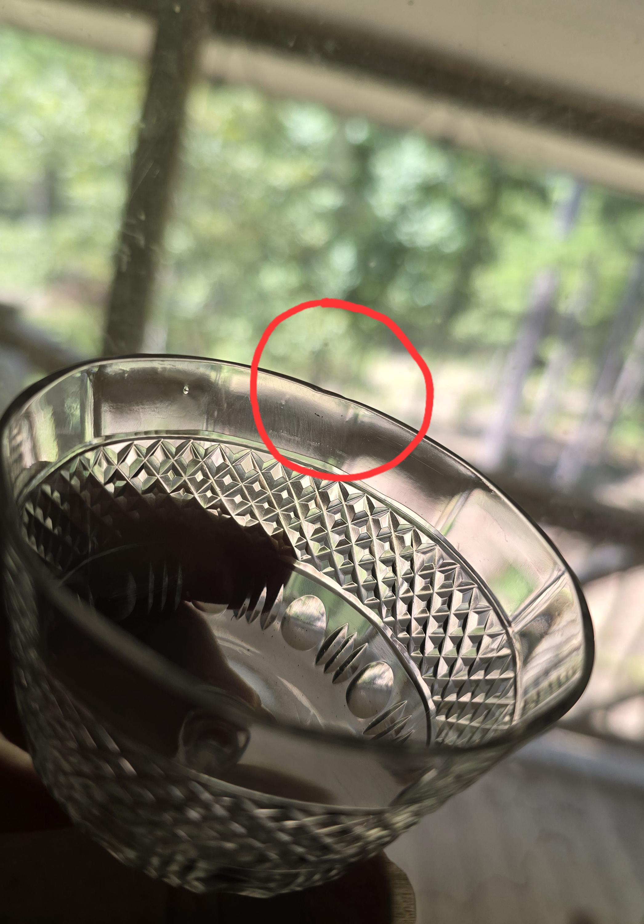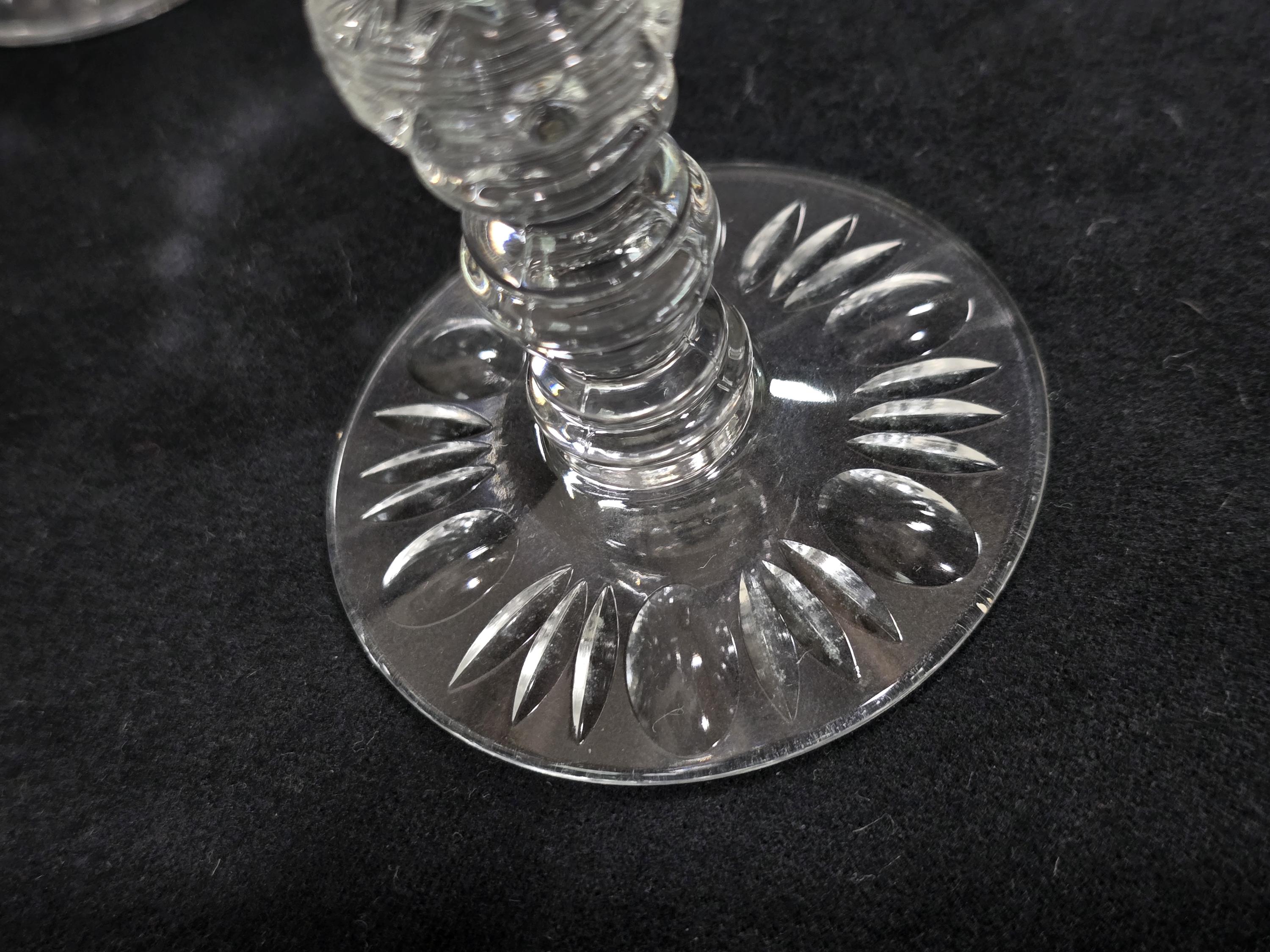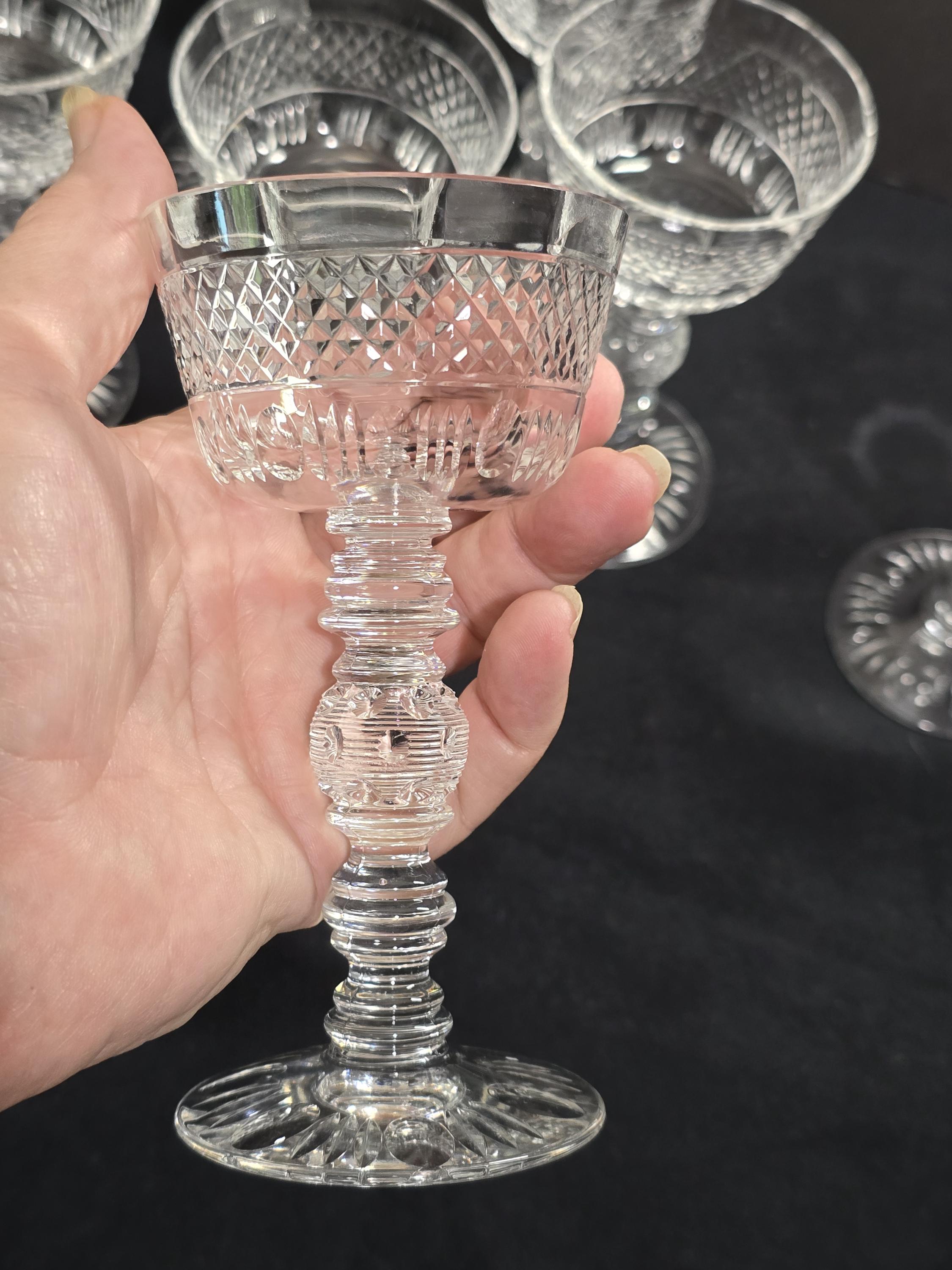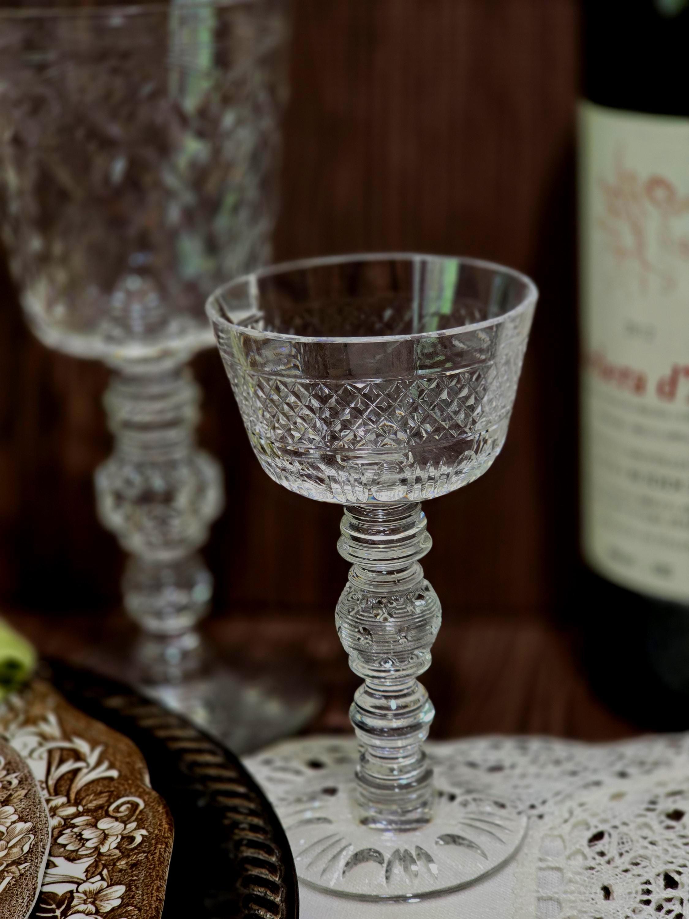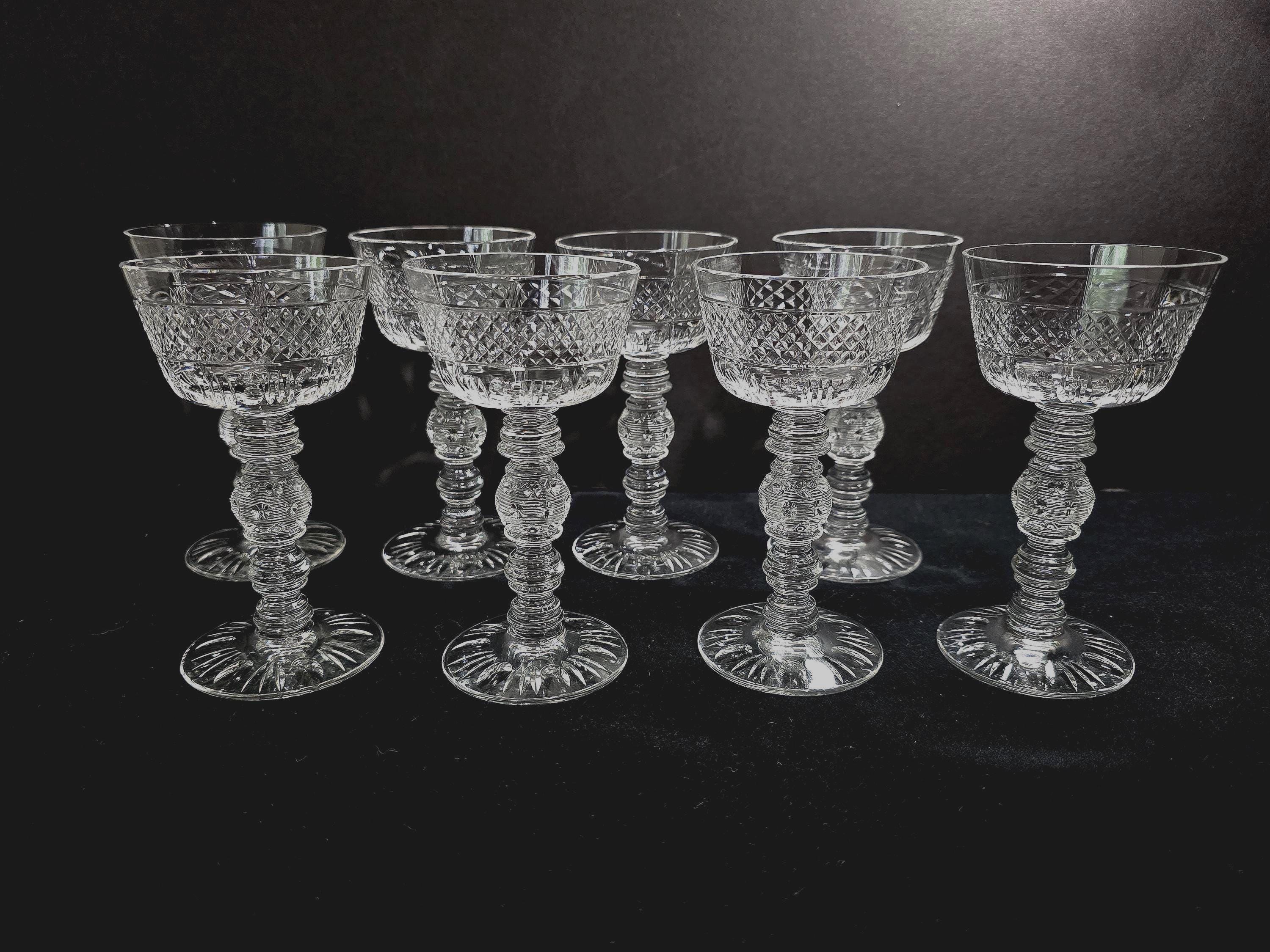 Made by Heisey Glass. No pattern name that I could find. The pattern consists of cross-hatching and cut ovals. The stem is #3404 and is molded glass. The bowl is blown, optic, cut glass. Capacity is 2 fluid ounces. They stand 5-1/4 inches high. One of the glasses had a very small nick, which has been polished with sanding sponges and diamond grit. PLEASE SEE THE PHOTOS and feel free to message with any questions. Thank you for visiting Redux Vintage Boutique.