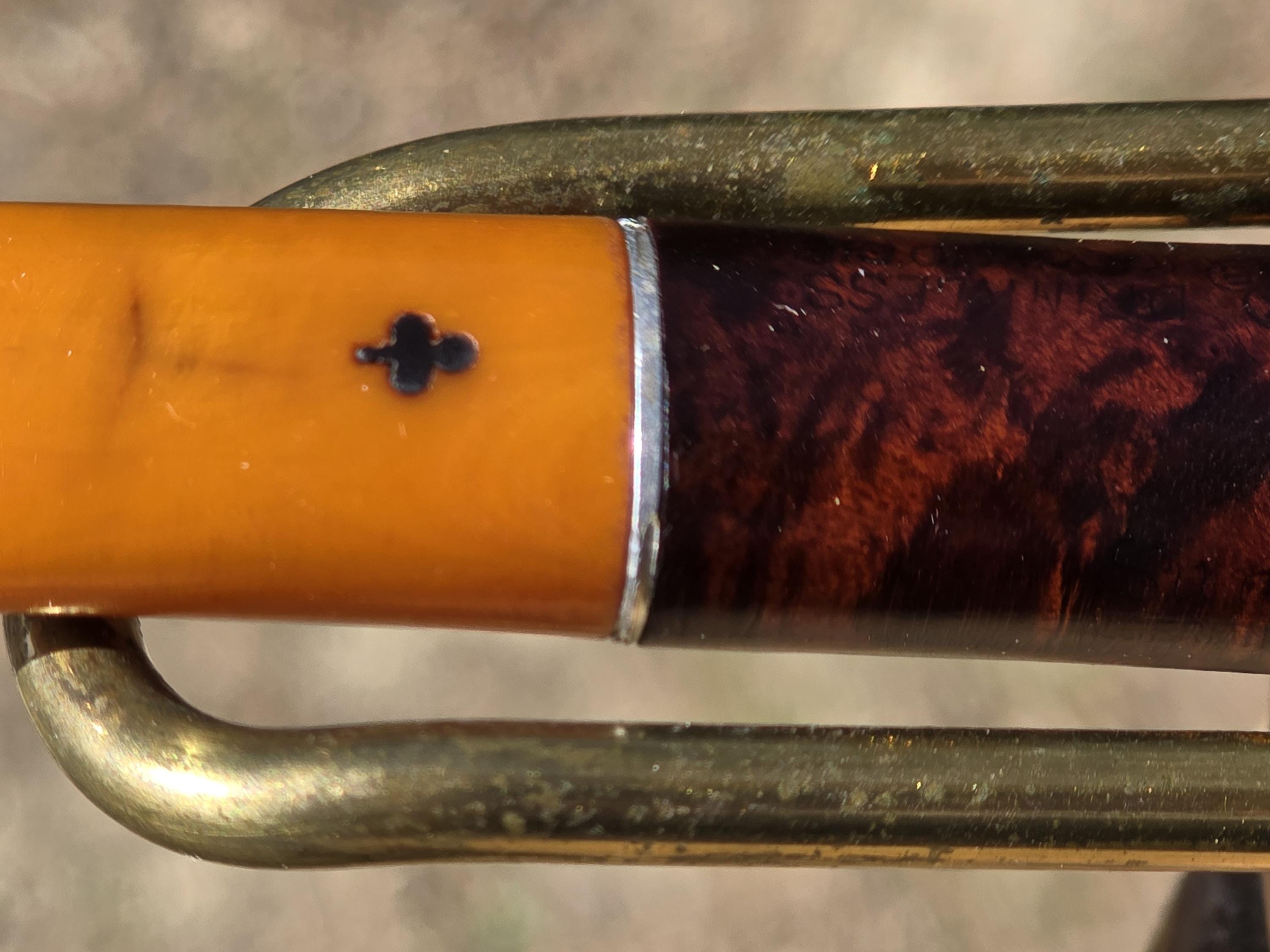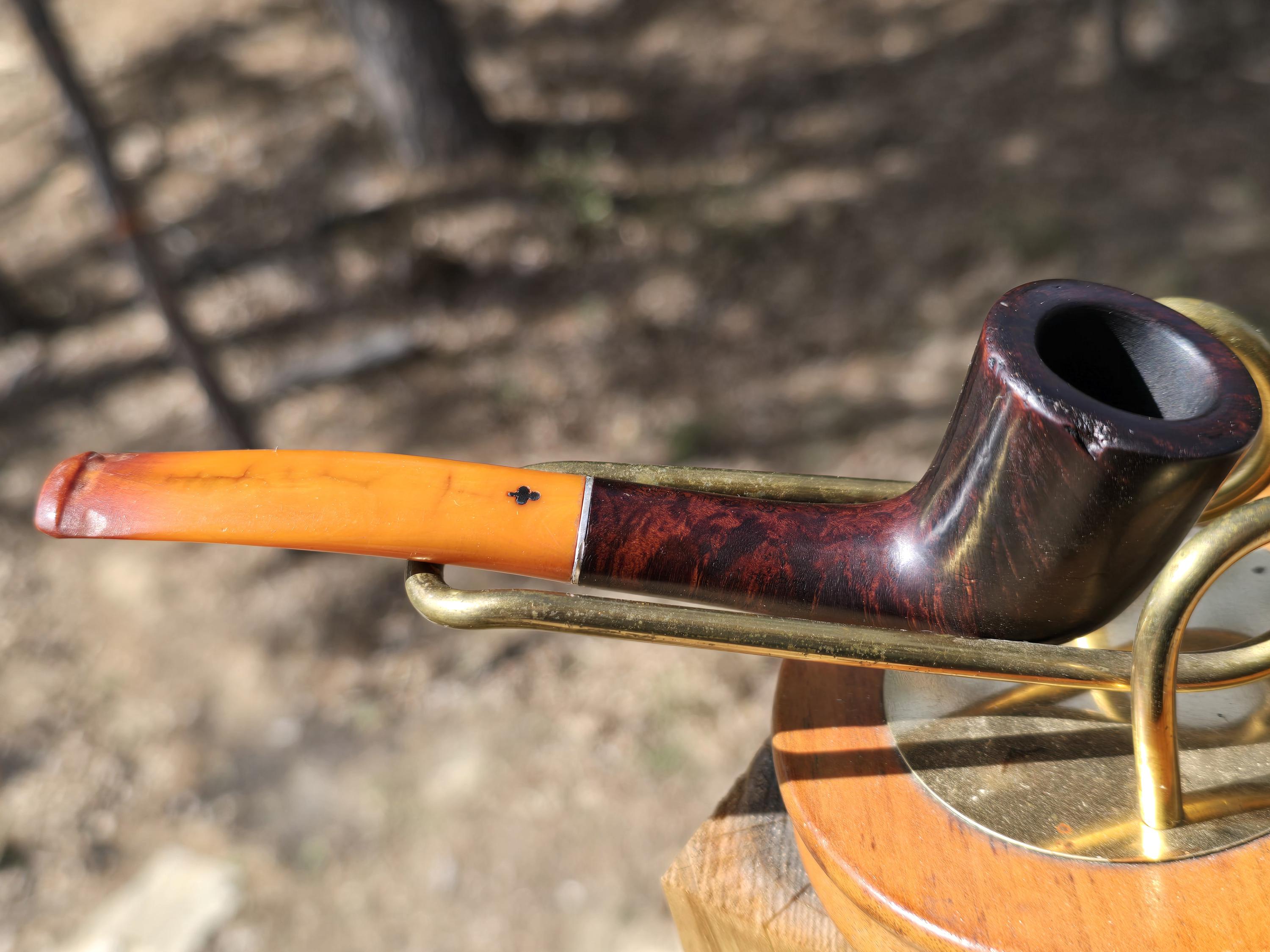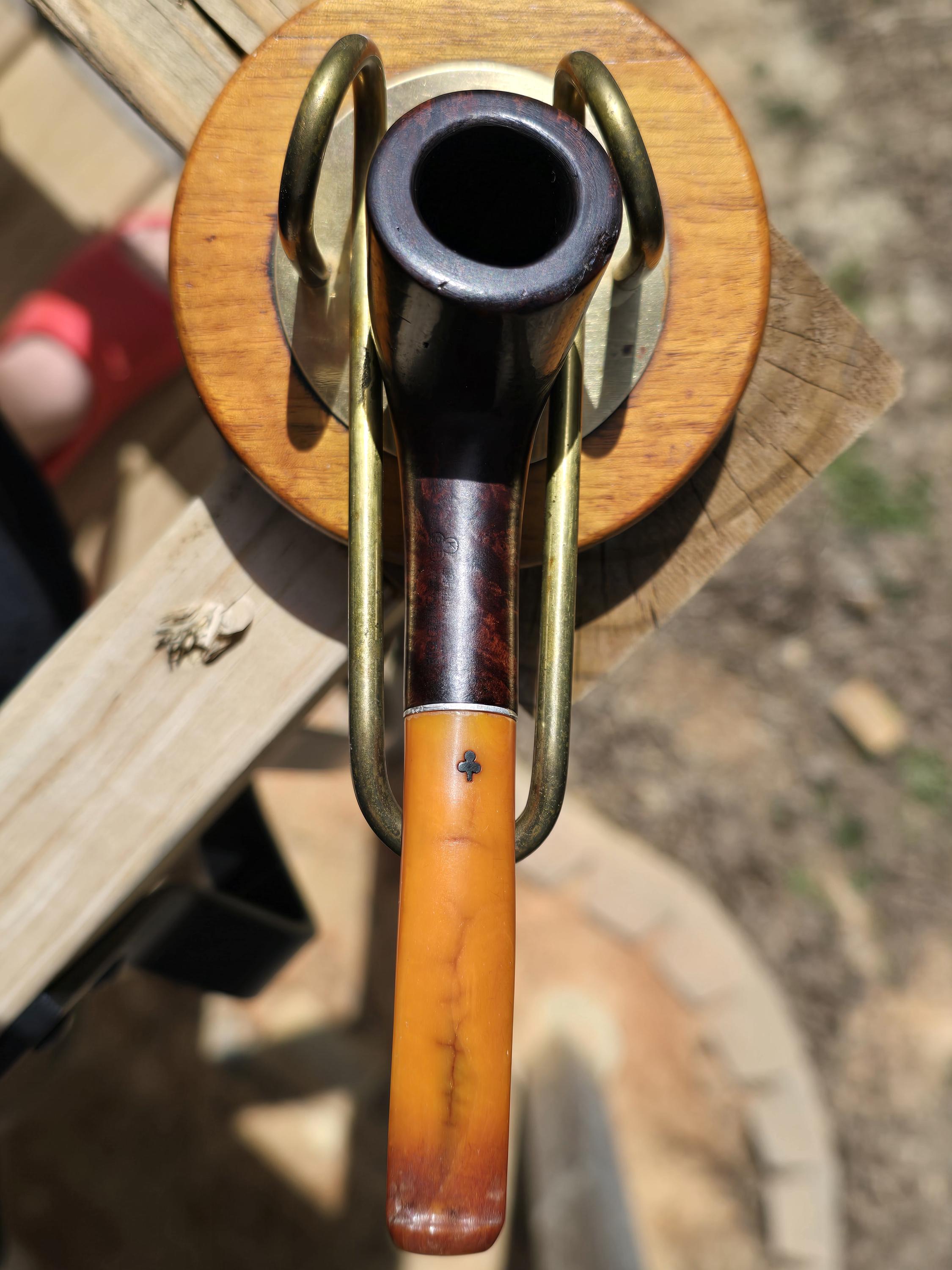 This one has all the essentials to a classic, collectible piece of American pipe making history! The clover leaf logo, the "Drinkless" stinger, the Synchrostem patented threaded tenon, the Bakelite "amber" stem, even the black inlaid emblem. It's all there.