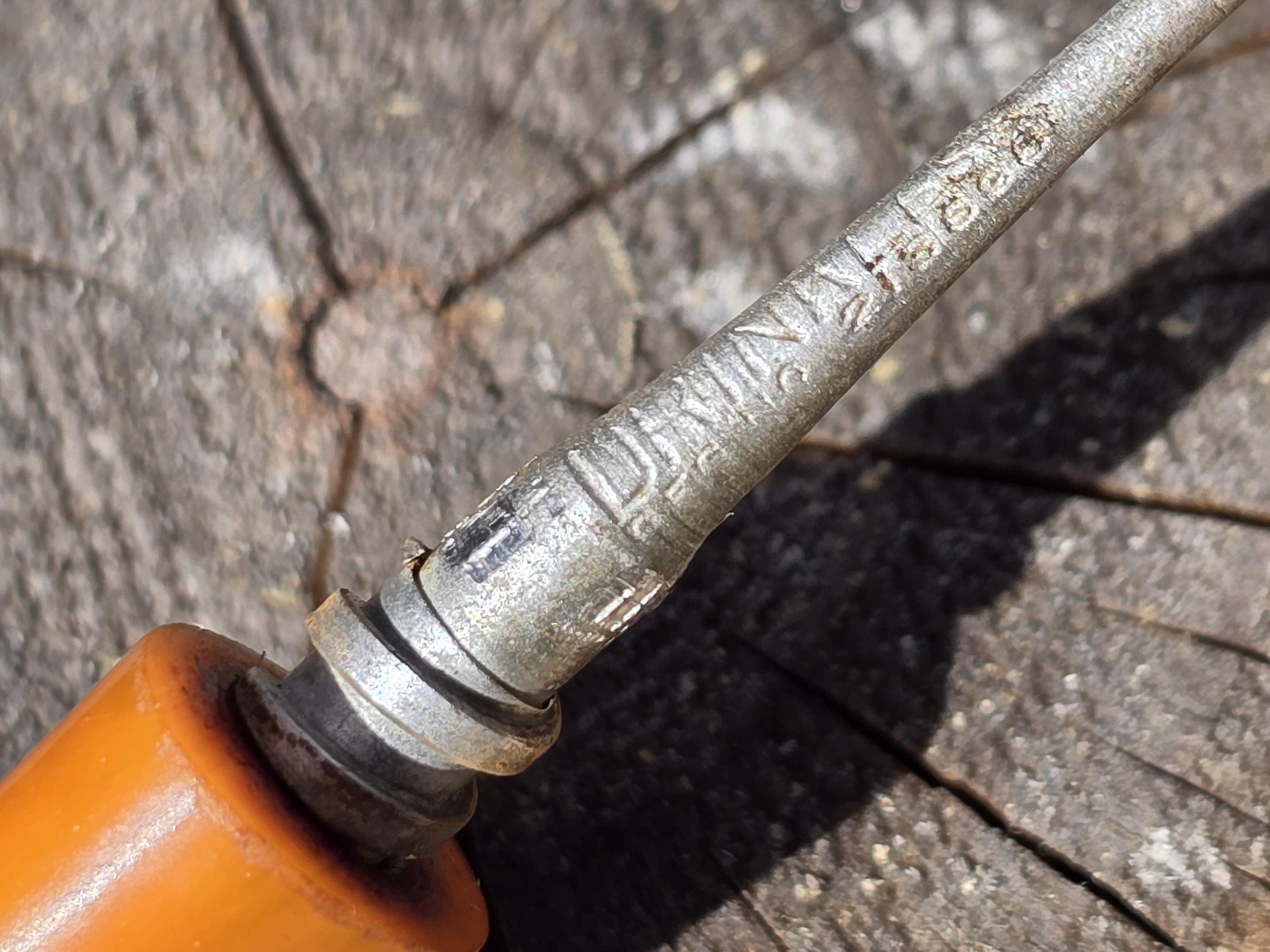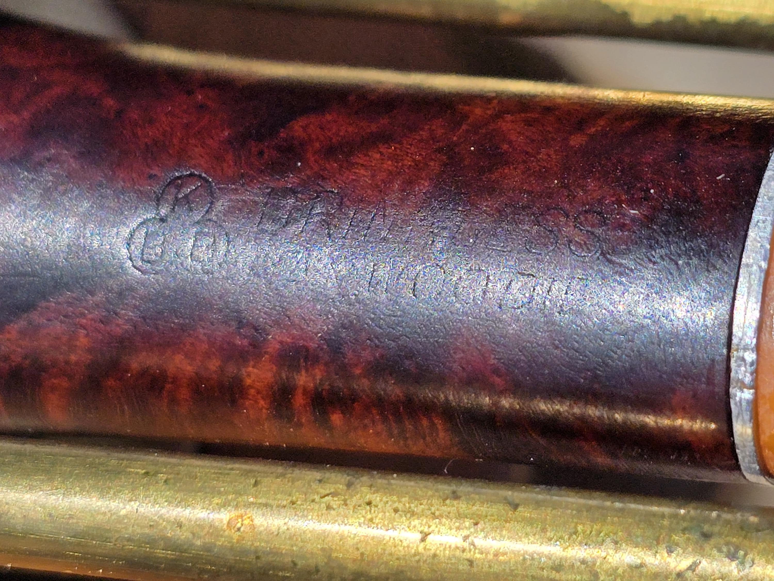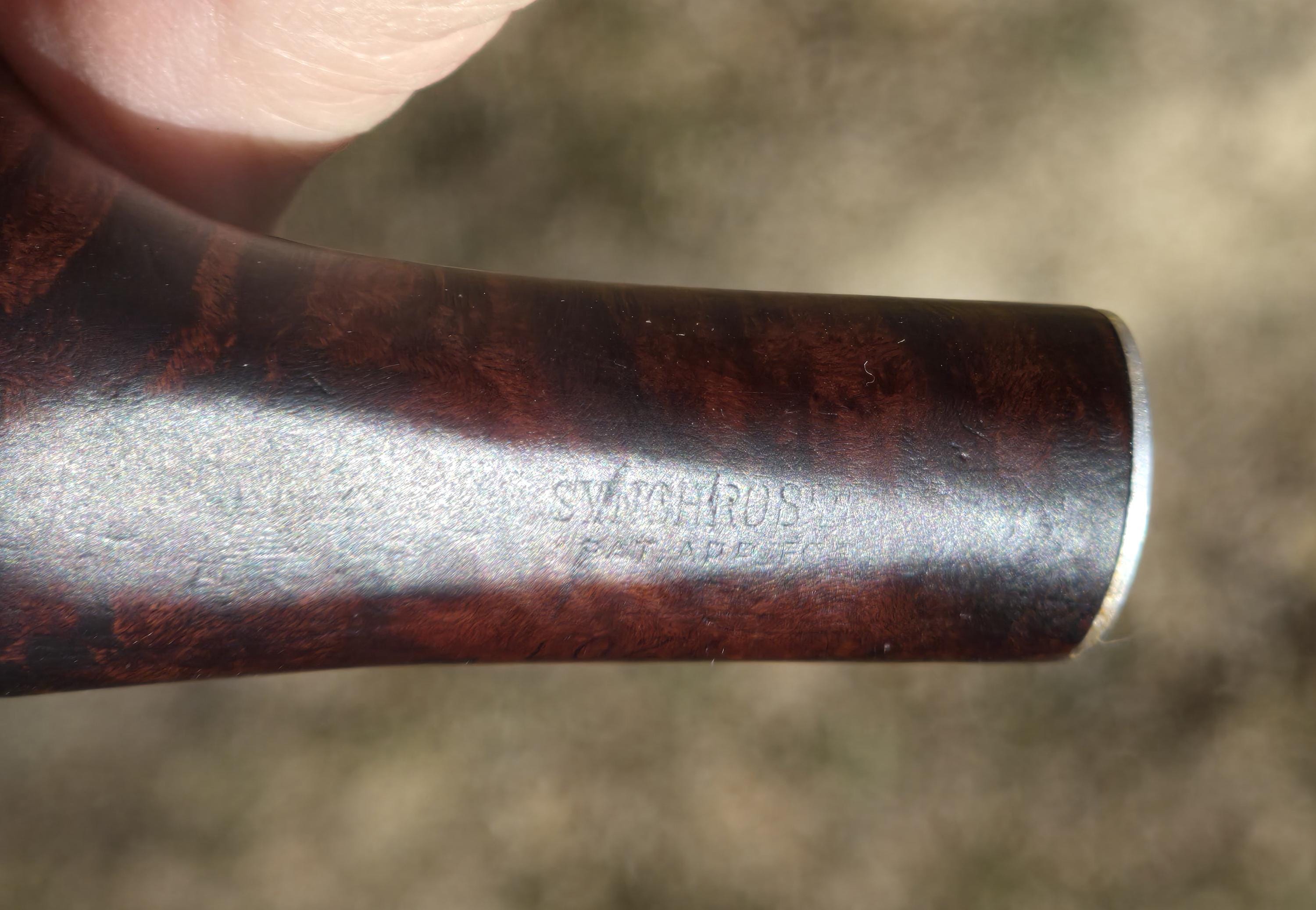 This one has all the essentials to a classic, collectible piece of American pipe making history! The clover leaf logo, the "Drinkless" stinger, the Synchrostem patented threaded tenon, the Bakelite "amber" stem, even the black inlaid emblem. It's all there.