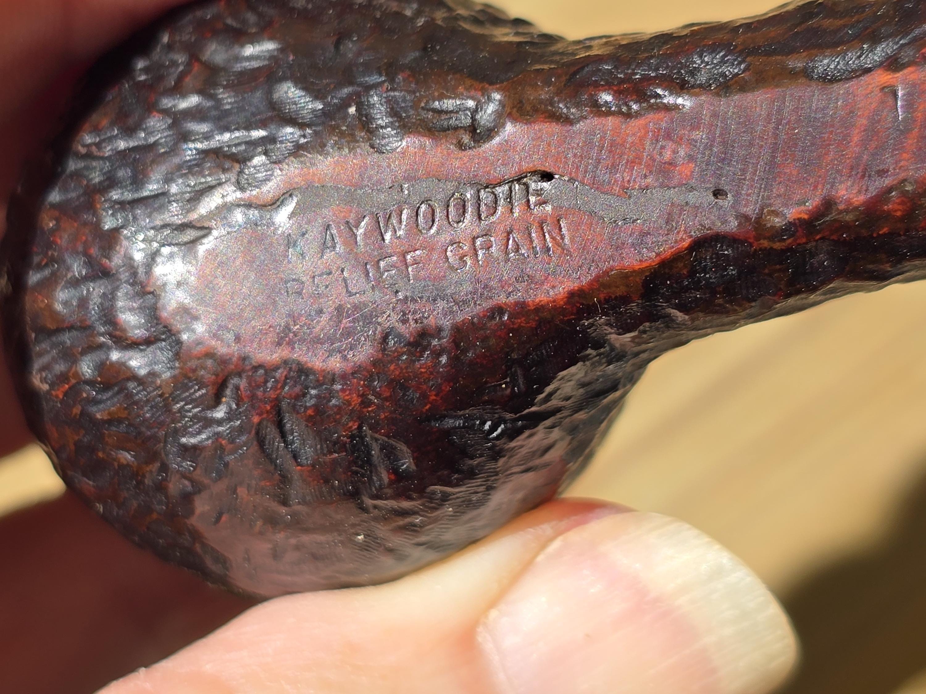 Another classic, collectible Kaywoodie with all the details that matter. This is a great pipe in the apple shape (115) that features the intact, 4-hole stinger, threaded tenon, inlaid black-on-white emblem on the original stem, and Kaywoodie markings on the underside. Circa late 1940s.