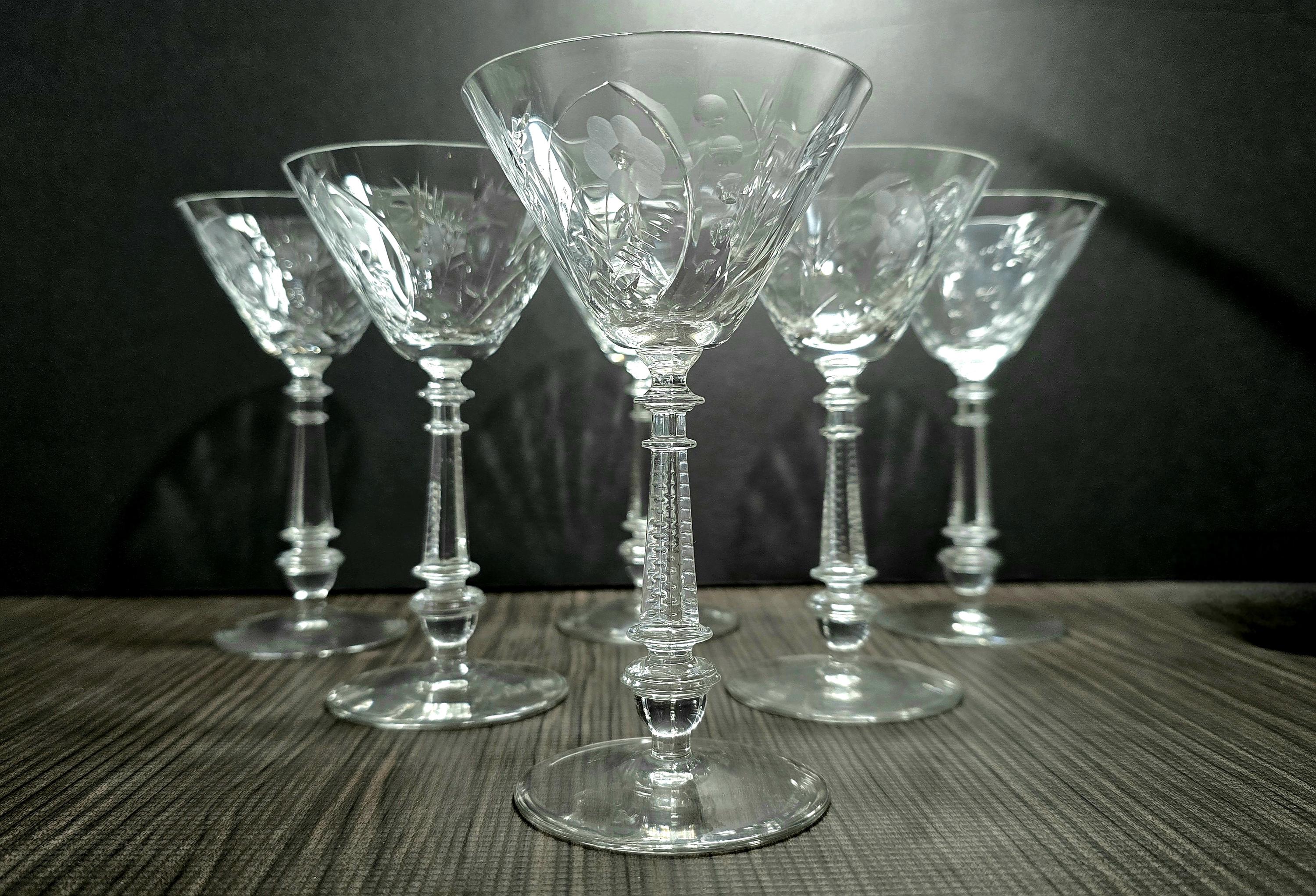 Each glass stands 5-3/8 inches tall and holds about 3.5 fluid ounces. The are in very good vintage condition, no hazing, no scratches. One glass had a small chip in the rim, which has been polished out with sanding sponges and diamond grit. PLEASE SEE THE PHOTOS. While the area that was chipped is now smooth and harmless, there is no way to replace the material lost in the repair. This results in a dip in the rim of the glass. That said, the dip is comparable to the tip of a ballpoint pin. Please, if you have questions, do not hesitate to message. These glasses are just too beautiful not to enjoy. Thank you for visiting Redux Vintage Boutique.
