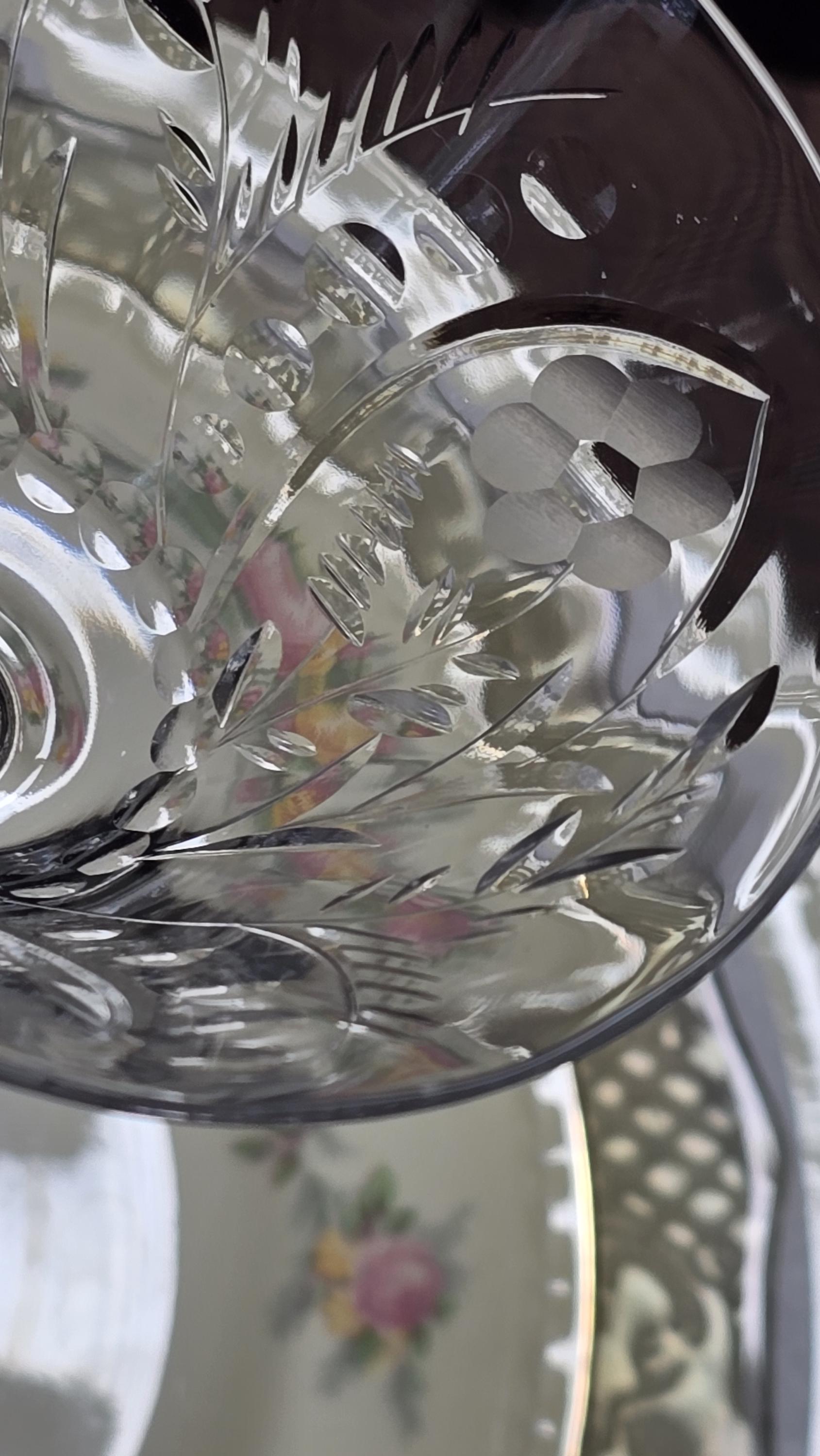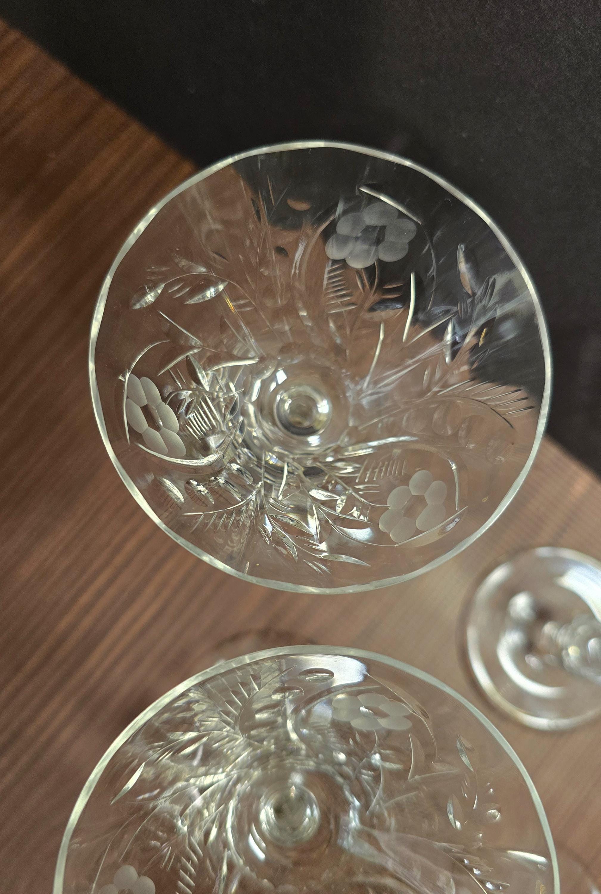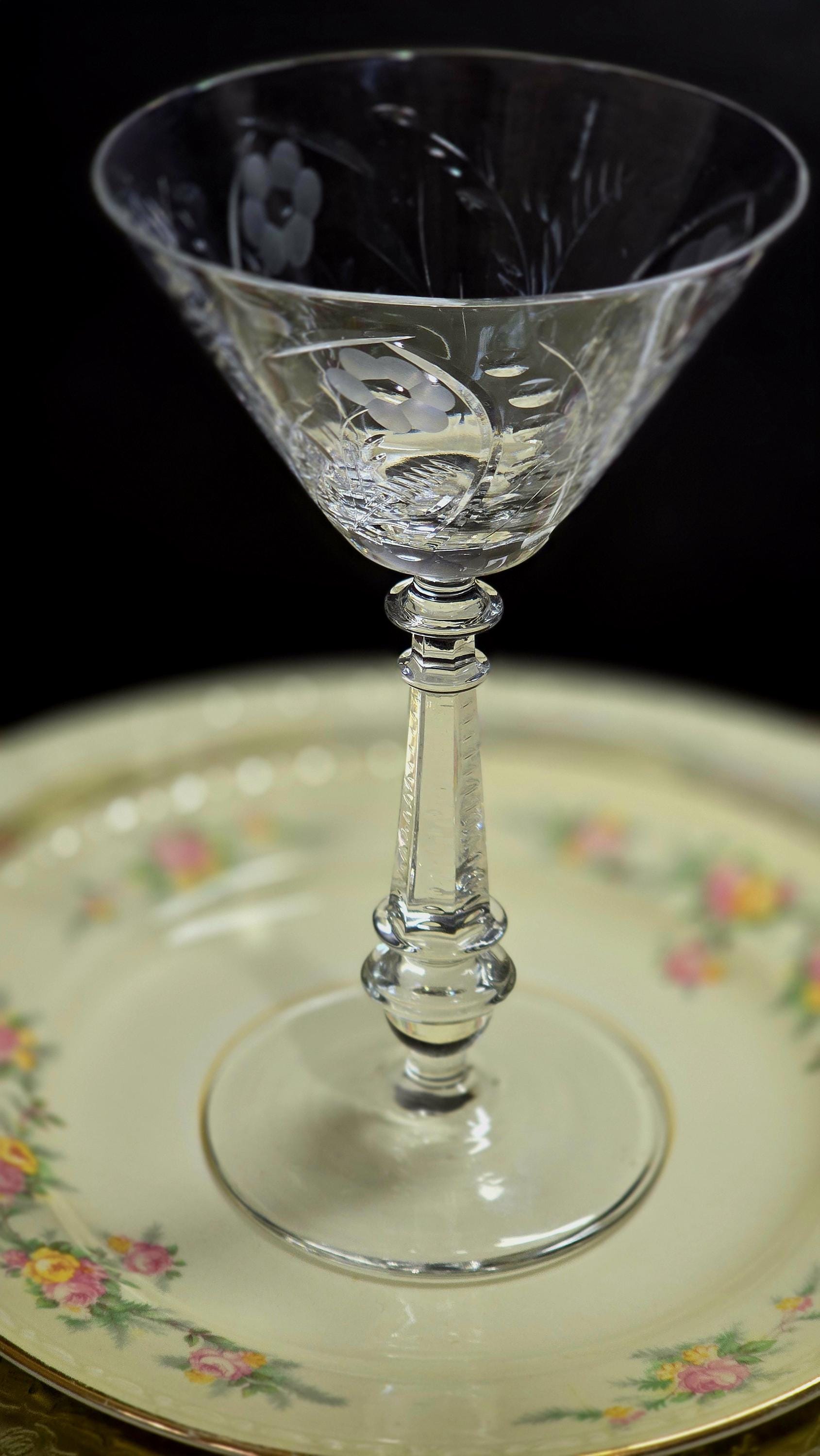 These are simply exquisite liquor glasses for your bar or table. Sparkly, optic mold glass is adorned with both clear and gray-cut designs in a floral motif. The stems are cut with sawtooth edges, providing a tactile element to your sipping experience. Use for aperitif or dessert liquors, or small cocktails like a Cosmopolitan or Sazerac, served "up" as a taste of good things to come.