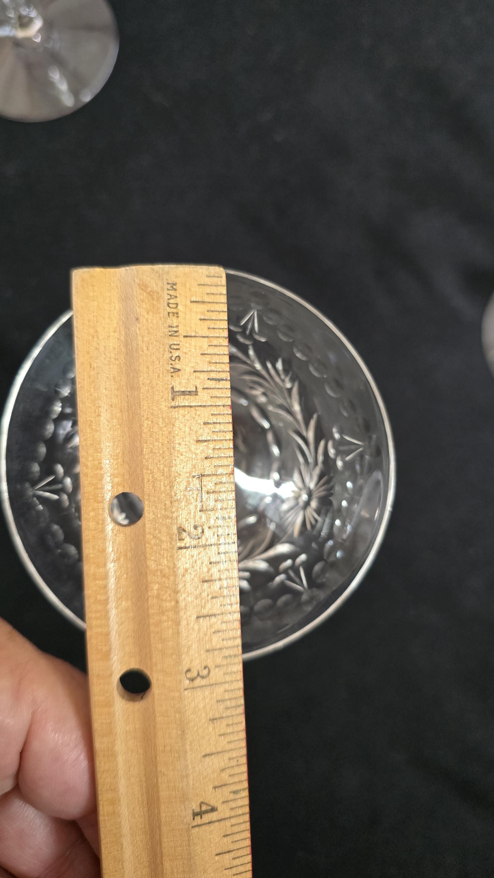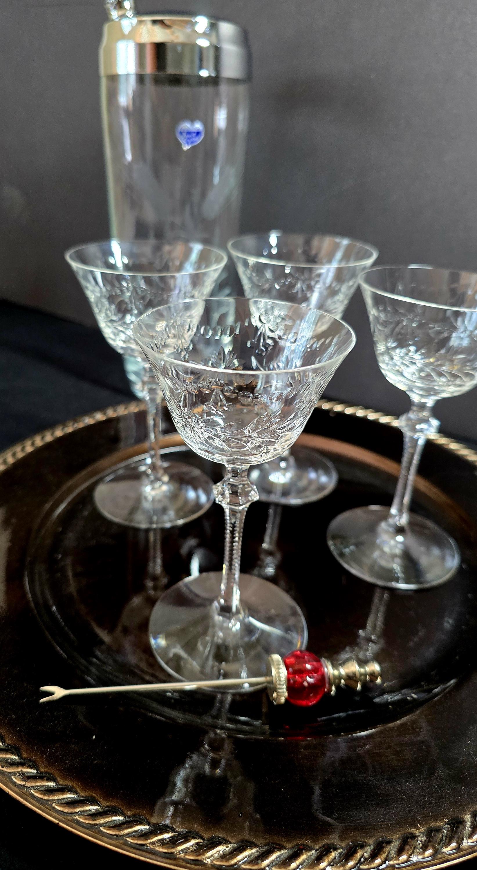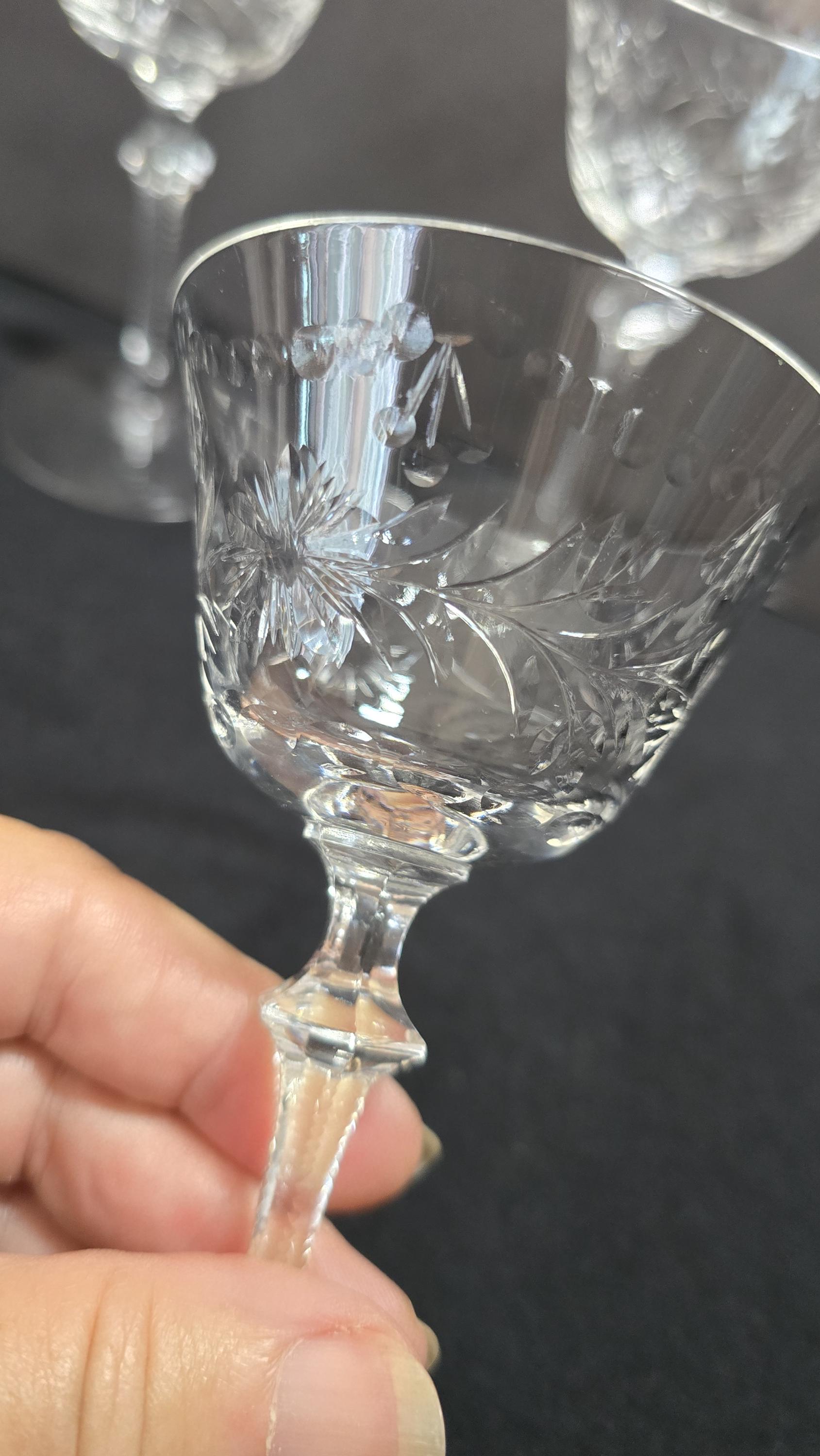 Is it the sparkle? Is it the clear-cut dotted swags in the design? Is it the tactile feel of the sawtooth cuts on the stem? Whatever "it" is, these gorgeous liquor glasses are a delightful experience. The pattern is not named (at least not anywhere that I could find). The style of the design and the particular stem cut would put them among other patterns from the late 1930s to 1940s. They are the perfect gift for that mixologist in your life. Maybe that person is you!