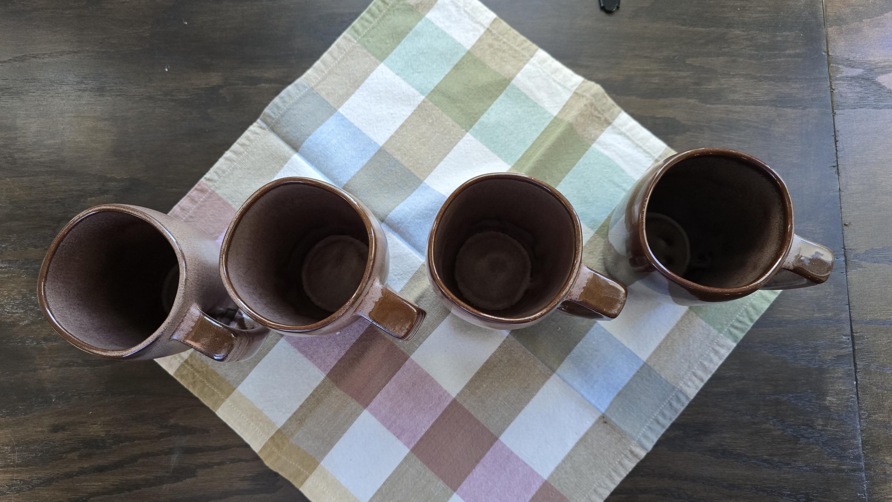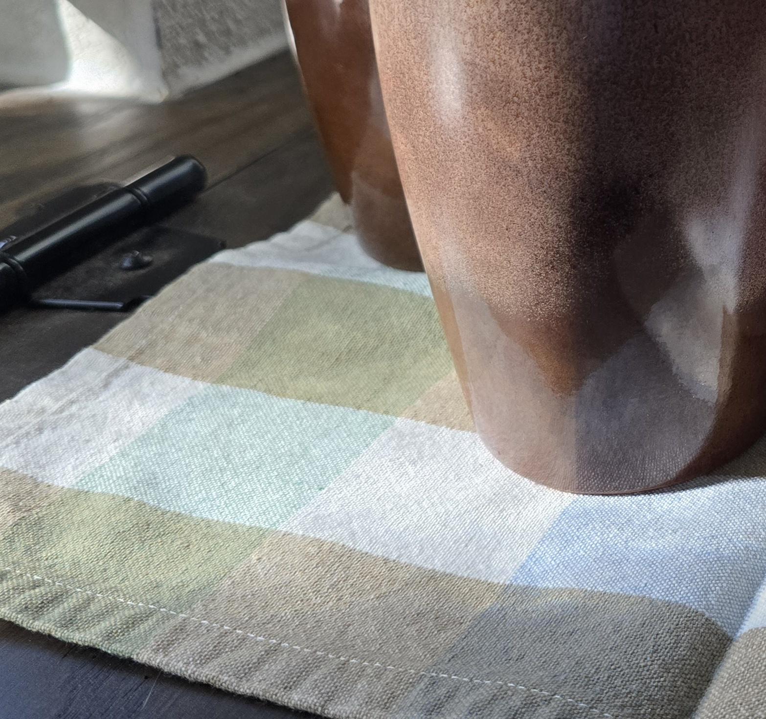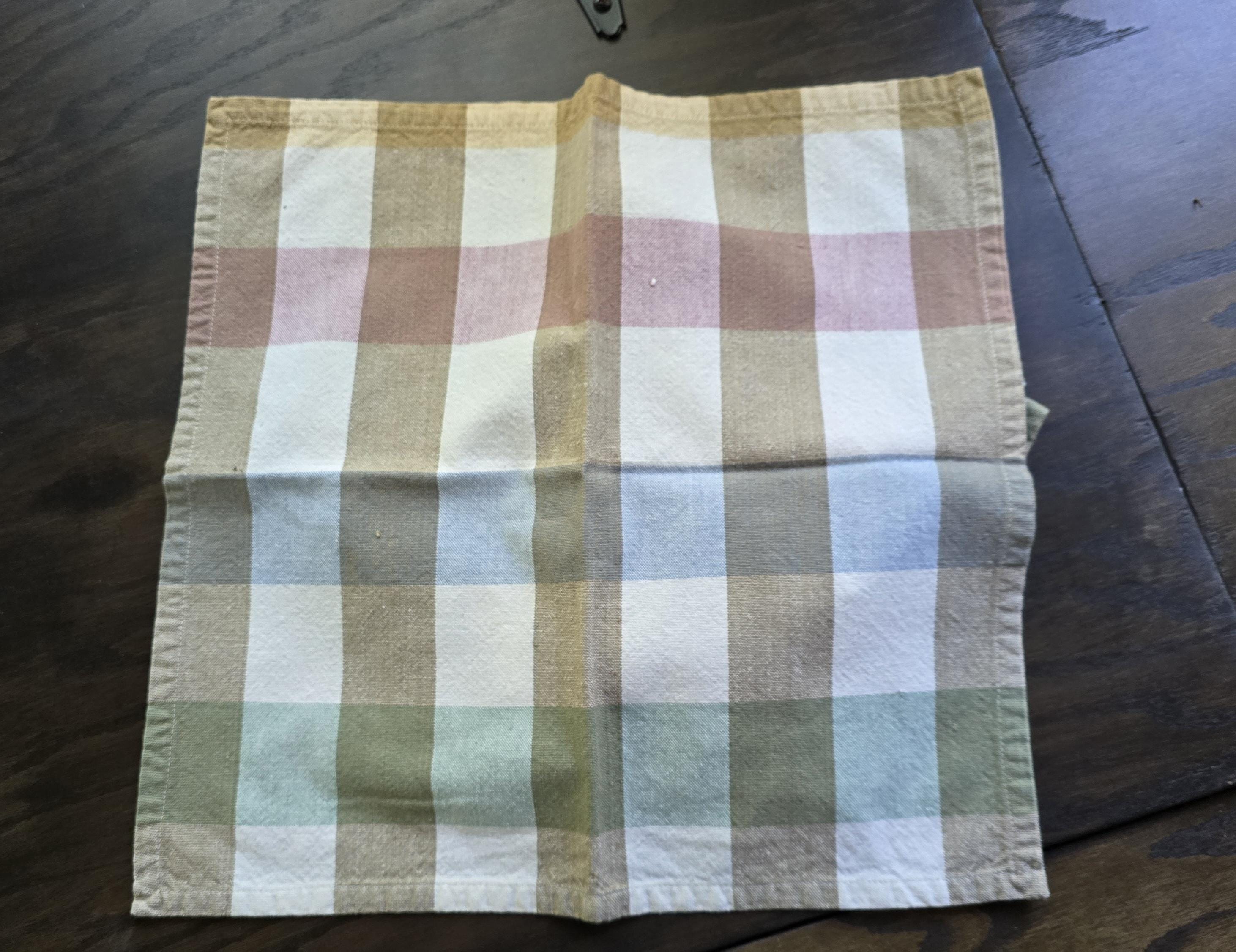 Large square farmhouse napkins; clean as a whistle! Super-cute pastel check pattern in soft, absorbent cotton will compliment your cozy mug of a favorite warm beverage. These are so inviting - just makes you want to curl up on a couch with a good book. Shown here with a set of Frankoma "Grand Mugs" in Satin Brown (not included).