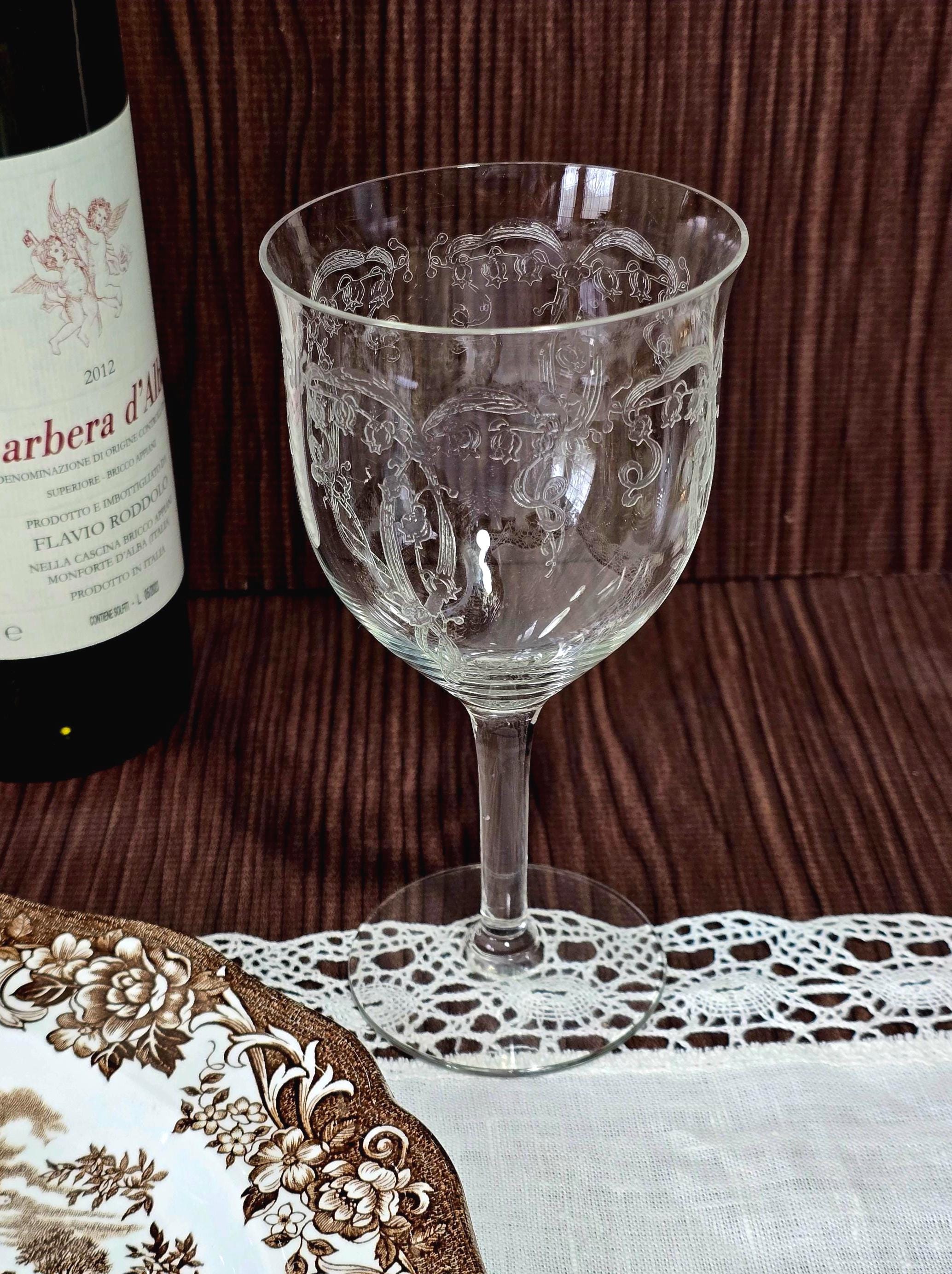 From the venerated glass company, Fostoria, these enchanting goblets are a prime example of needle etched glass in American glass-making history. Needle etching did not use acid, but rather a steel "needle" was used to scratch in the design. According to Replacements Ltd., Fostoria introduced the Lily of the Valley pattern in 1915, making these goblets true antiques.
