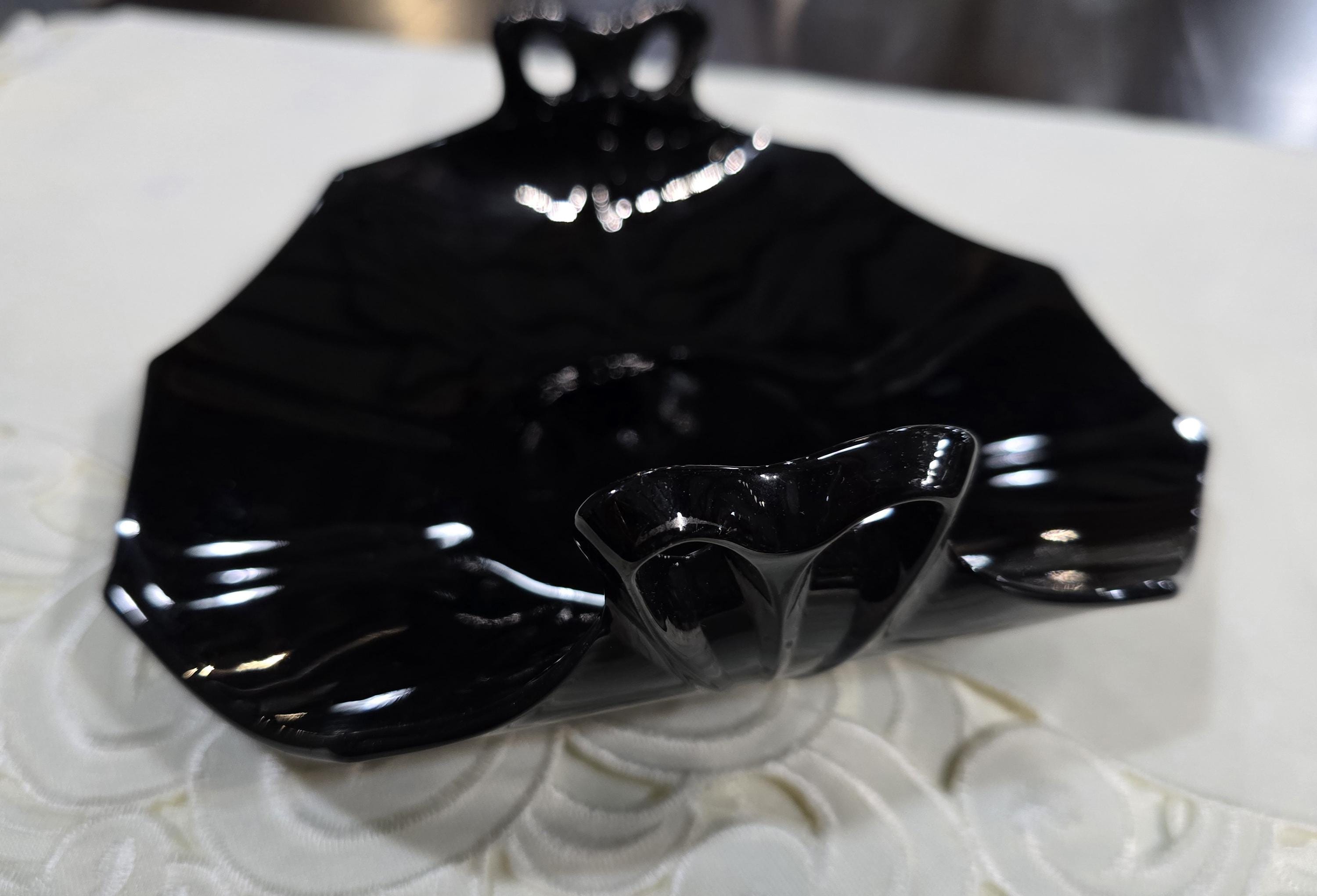 L.E. Smith bonbon bowl, with curved sides; 7 inches long. No chips or cracks. Some scratching, commensurate with age and use.