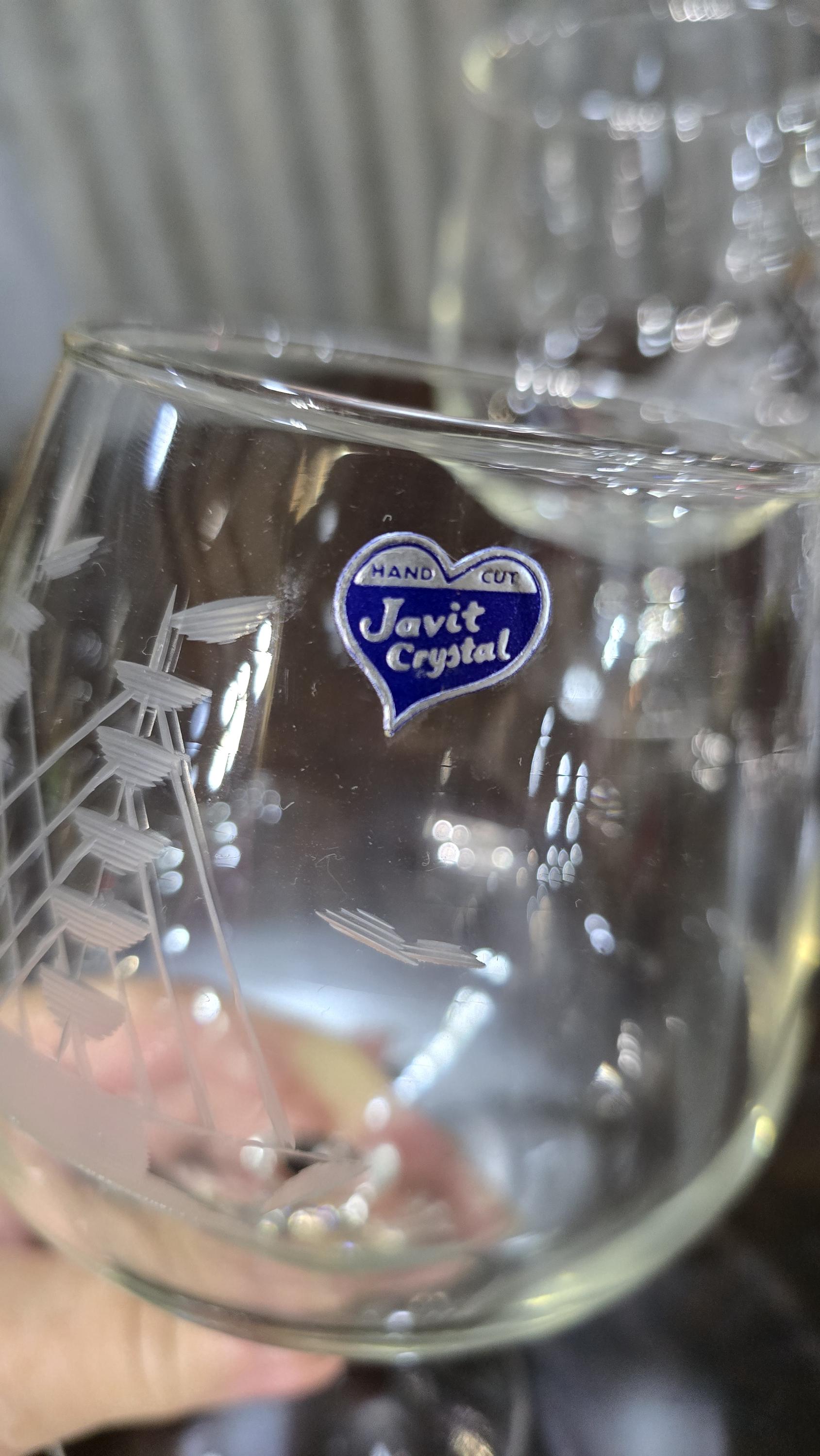 These extra-large brandy snifters are hand cut from crystal blanks. The size is good for more than just brandy. Throw an ocean themed party and fill these with your favorite frozen drink - with or without the rum! Javit crystal was sold in fine department stores across the U.S. until about the mid-1980s.